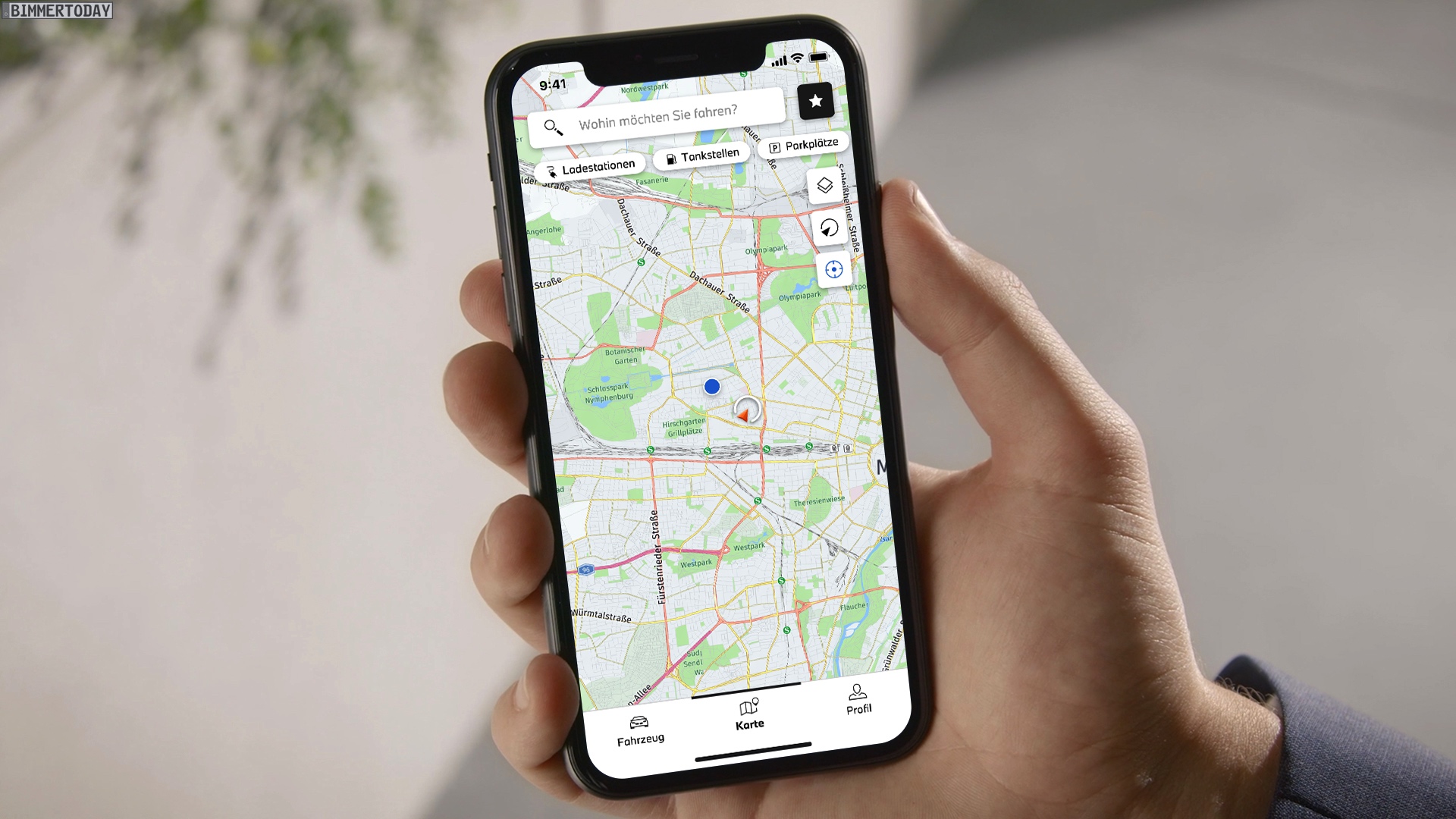 Ebenso nützlich wie der digitale Schlüssel ist die Möglichkeit, auf dem Smartphone herausgesuchte Ziele oder Routen direkt an das Navigationssystem des Autos zu schicken. Hierfür steht auch innerhalb der My BMW App eine Karte samt Anzeige von Tankstellen, Lademöglichkeiten, Parkplätzen und aktueller Verkehrslage zur Verfügung.