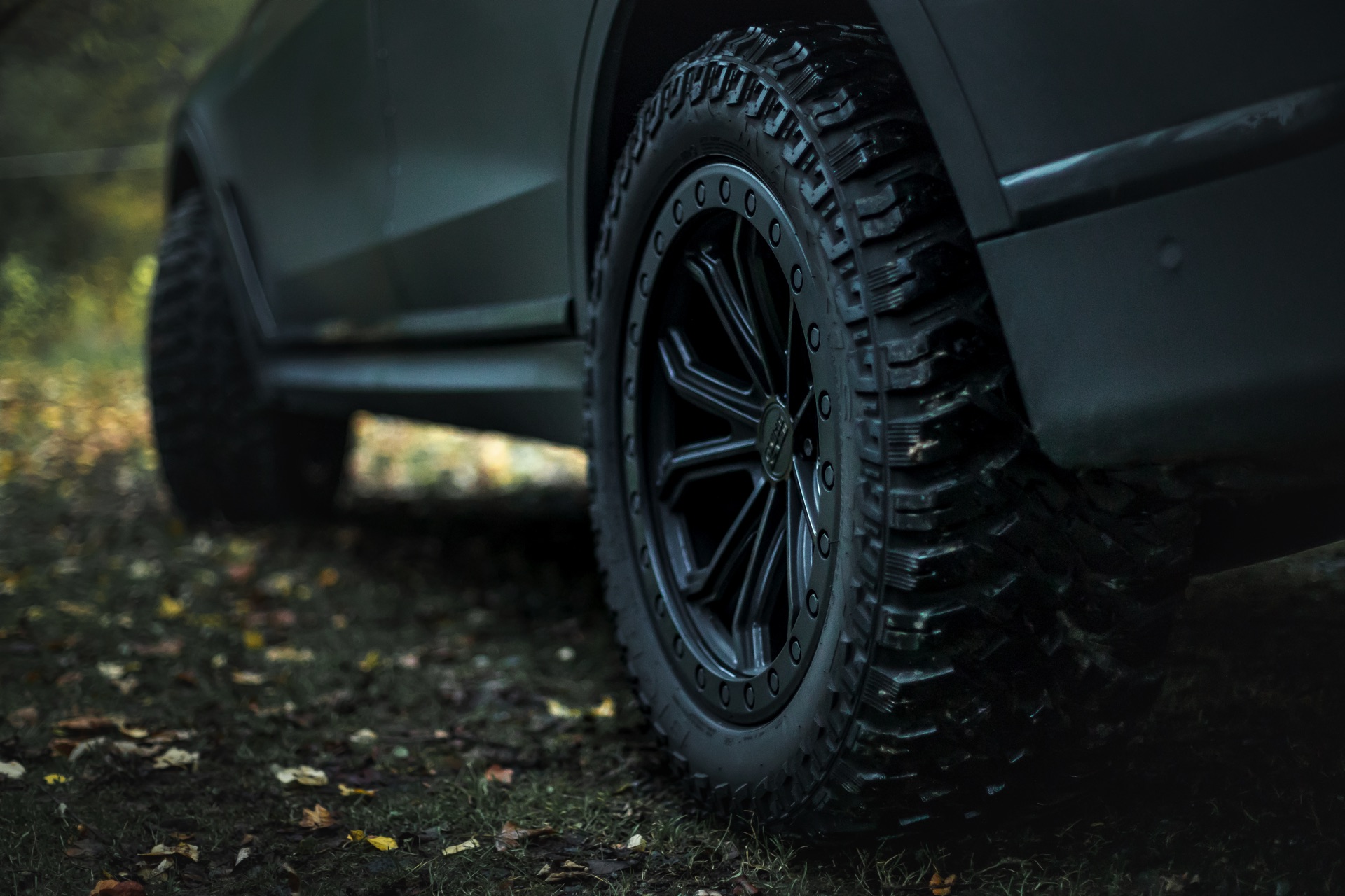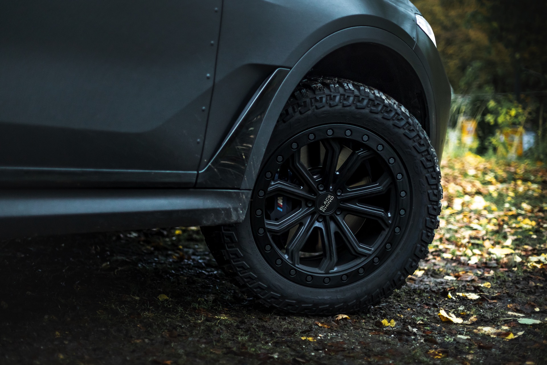 Genau wie bei einem Sportwagen ist die Bereifung auch bei einem Geländewagen von entscheidender Bedeutung für die tatsächliche Performance, deshalb kamen für die Manhart MHX7 Dirt Edition nichts anderes als schwere Gelände-Reifen in Frage. Die 305 Millimeter breiten Stollenreifen vom Typ Maxxis Bighorn MT-764 versprechen maximale Traktion auf schwierigem Untergrund und tragen wesentlich zum martialischen Erscheinungsbild desies BMW X7 bei. Passend zum Military- und Offroad-Look sind auch die mattschwarz gehaltenen 20-Zoll-Felgen im Beadlock-Design.