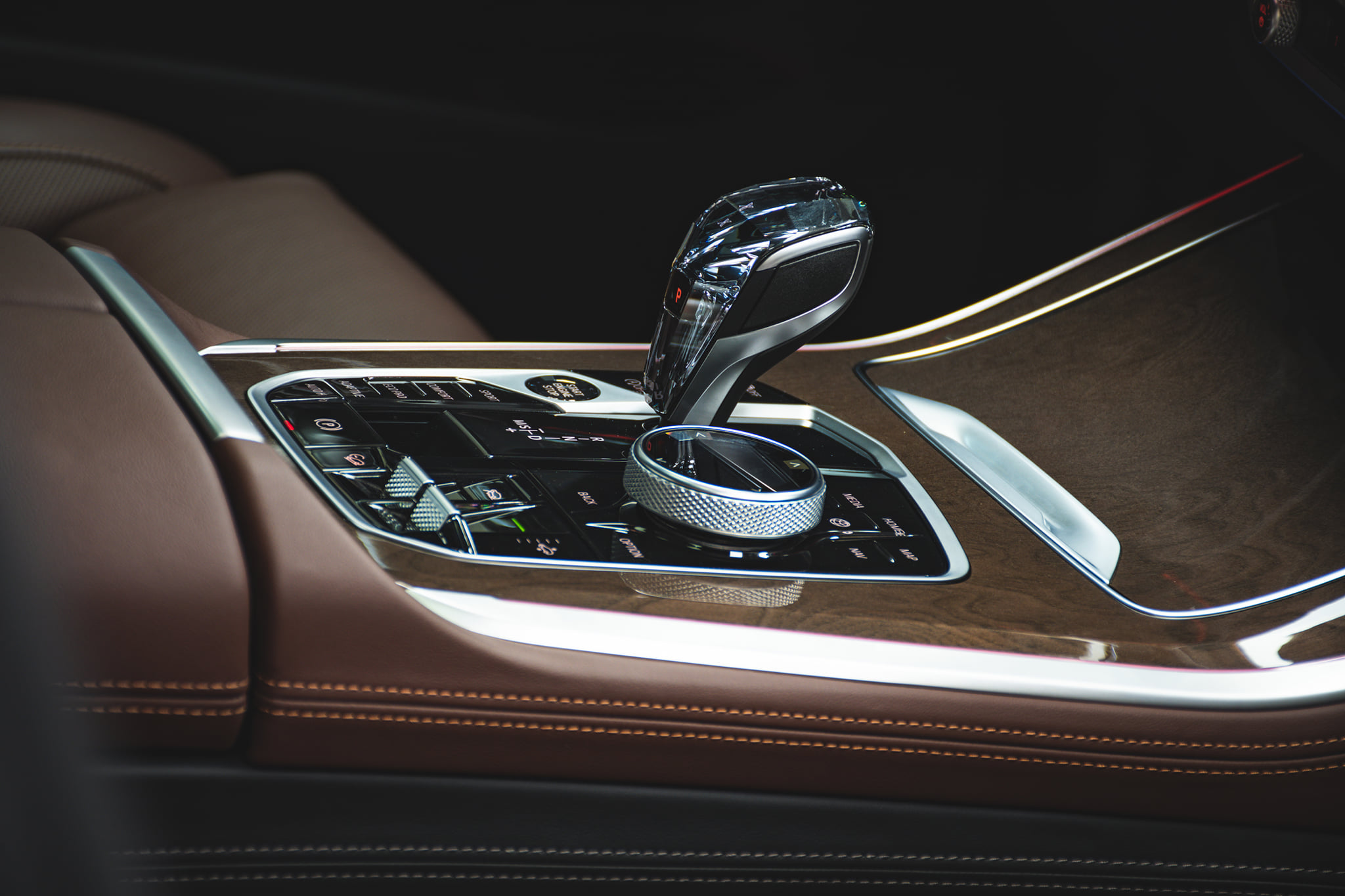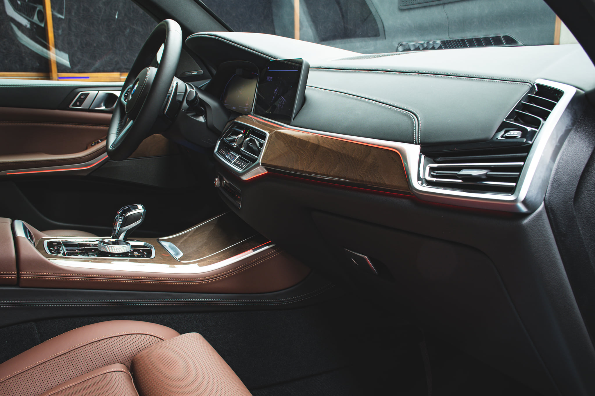 Im Innenraum des geräumigen Luxus-SUV sehen wir die Lederausstattung im Farbton Coffee und die Edelholzausführung Esche Maser braun-metallic hochglänzend: