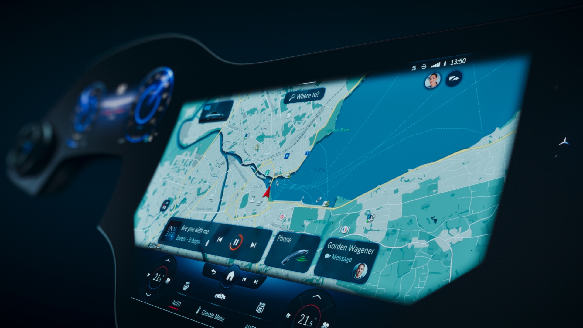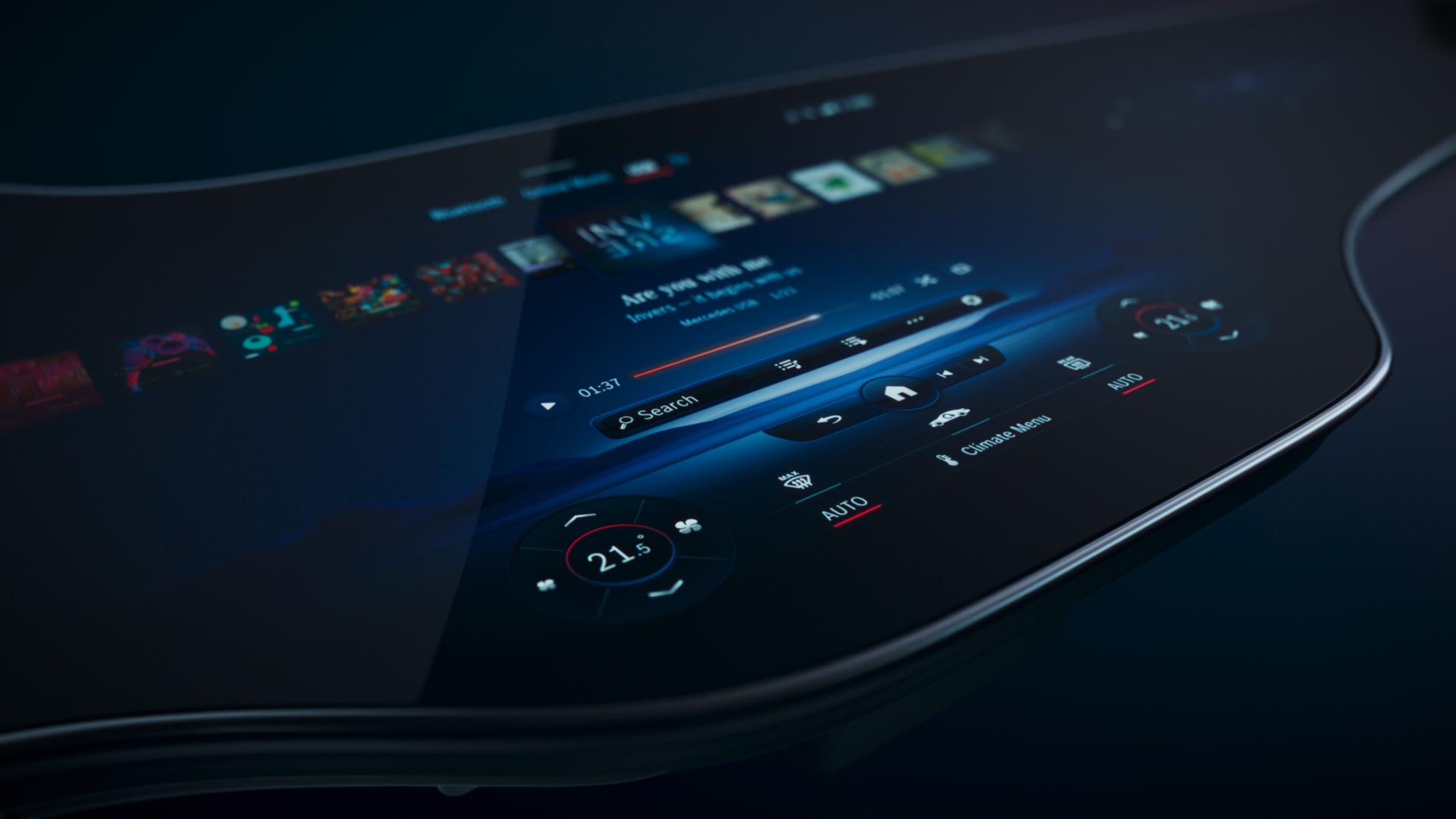 Um das Mega-Display flüssig mit Inhalten bespielen zu können, kommt ein Computer-System mit 8 CPU-Kernen und 24 Gigabyte RAM zum Einsatz. Auf der riesigen Fläche ergeben sich ganz neue Möglichkeiten für die digitale Gestaltung des Infotainment-Systems, denn auf eine unnter Umständen als verschachtelt wahrgenommene Menü-Struktur kann im Mercedes EQS komplett verzichtet werden: Die Stuttgarter sprechen von einem Zero-Layer-Konzept und meinen damit, dass alle wichtigen und in der entsprechenden Situation gebrauchten Funktionen immer direkt aufzufinden sind. Wie gut das in der Praxis funktioniert, wird von der Leistungsfähigkeit der Software abhängen, aber Mercedes hat diese bereits selbstlernend gestaltet und will sie so ständig an die tatsächlichen Bedürfnisse des Fahrers anpassen können.