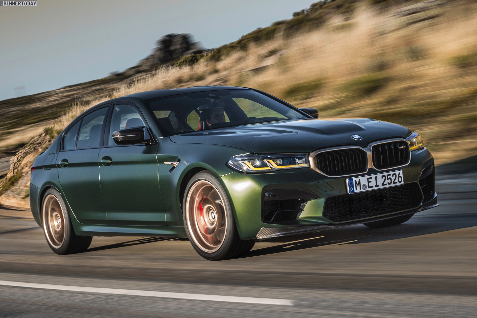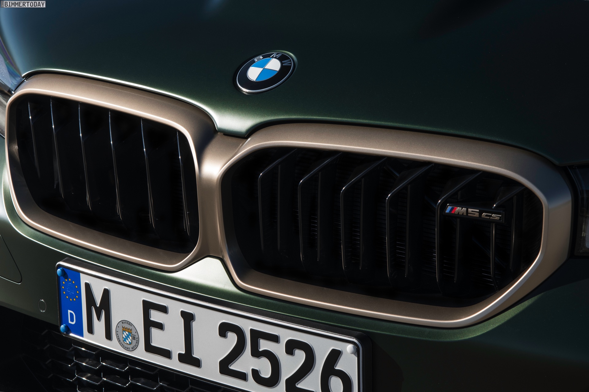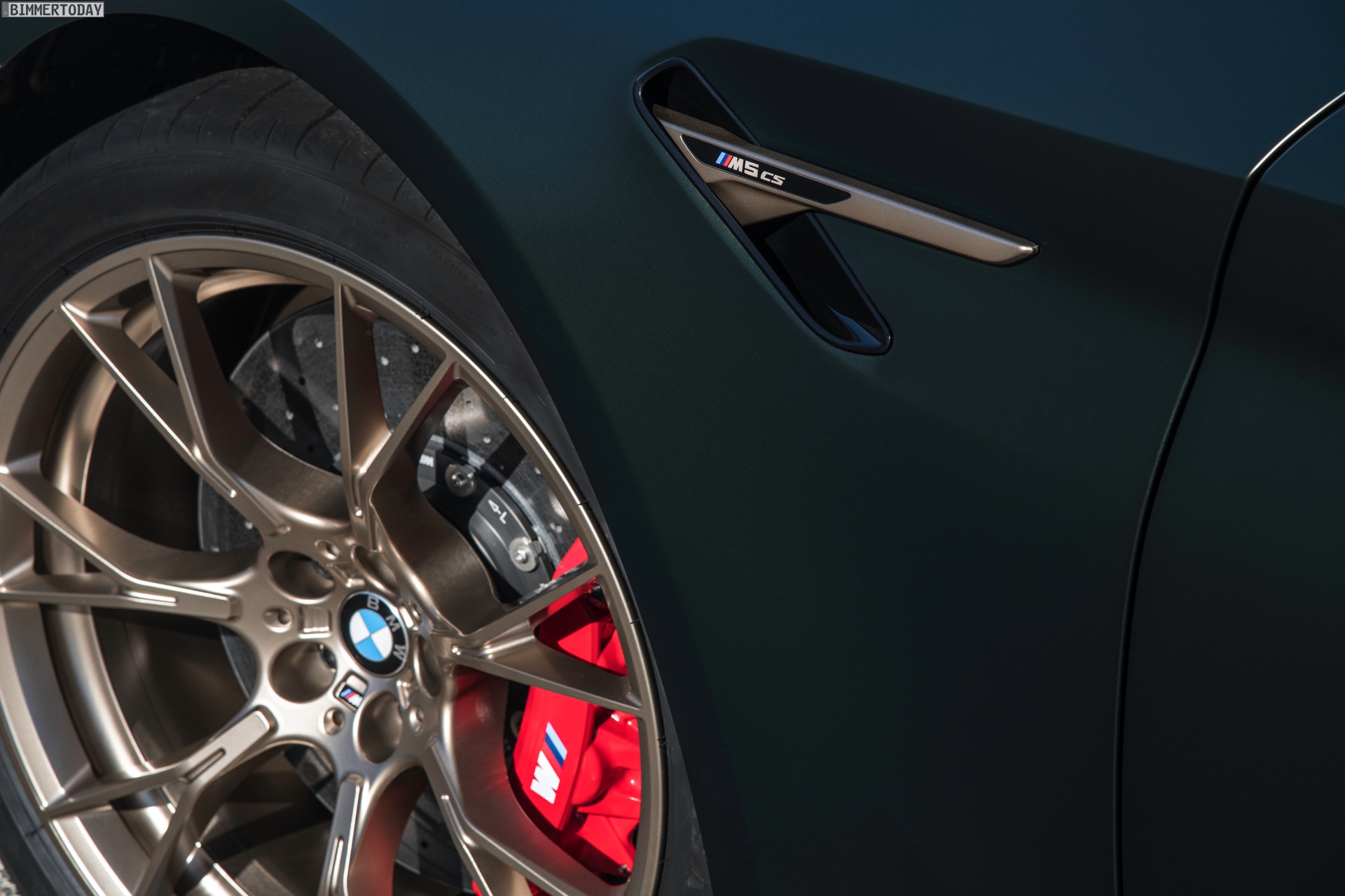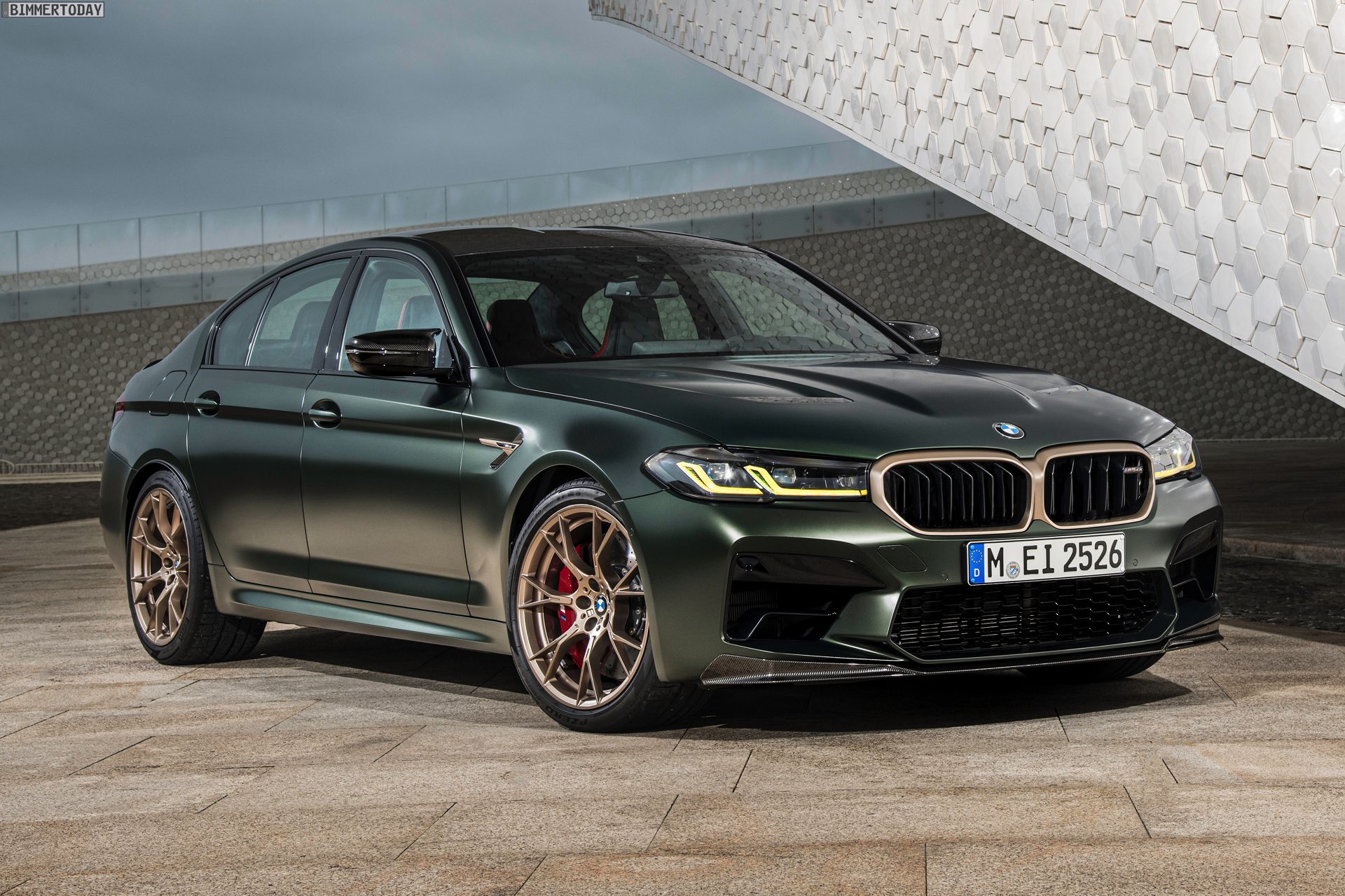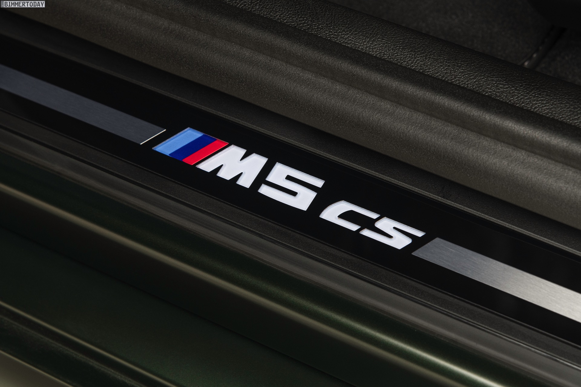 Nur der Optik dienen die zahlreichen Akzente in Goldbronze, wobei selbst die 20 Zoll großen Schmiederäder den exklusiven Farbton tragen dürfen. Ein besonderer Hingucker sind die gelben Lichtelemente in den Laser-Scheinwerfern an der Front: Während das Tagfahrlicht unverändert weiß leuchtet, wechseln die L-förmigen Elemente bei aktiviertem Abblend- oder Fernlicht sowie beim Welcome Light in ein kräftiges Gelb. Exklusiv ist auch die Farbpalette für den BMW M5 CS, denn nur das Topmodell der Generation F90 kann in Frozen Brands Hatch Grau oder dem auf den ersten Fotos abgebildeten Frozen Deep Green bestellt werden: