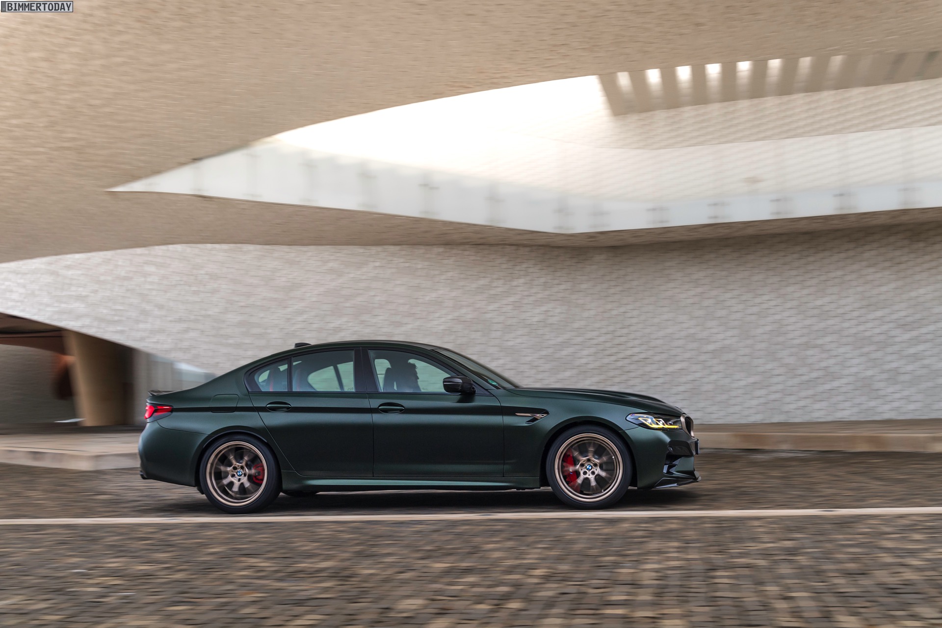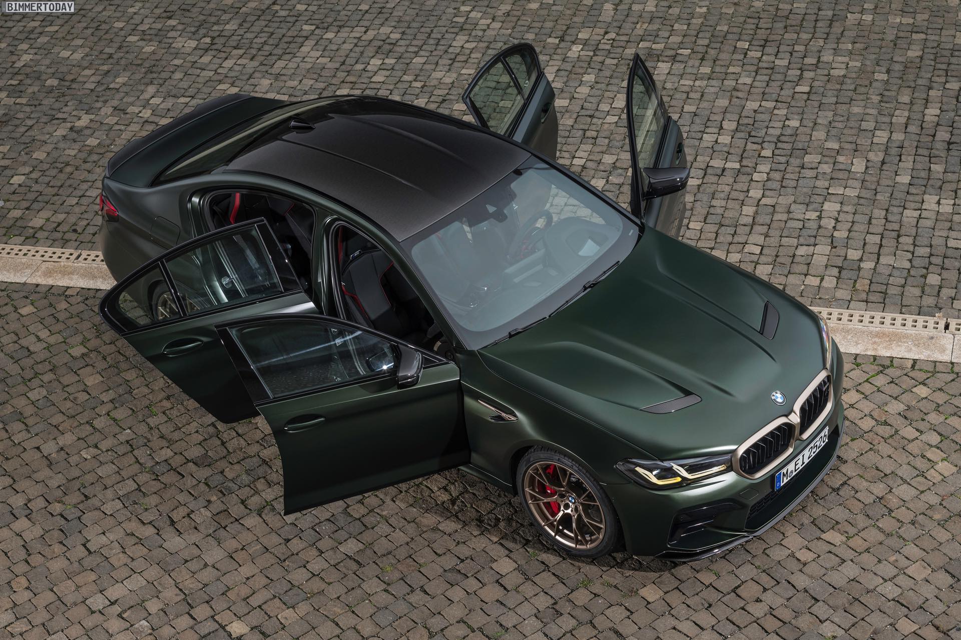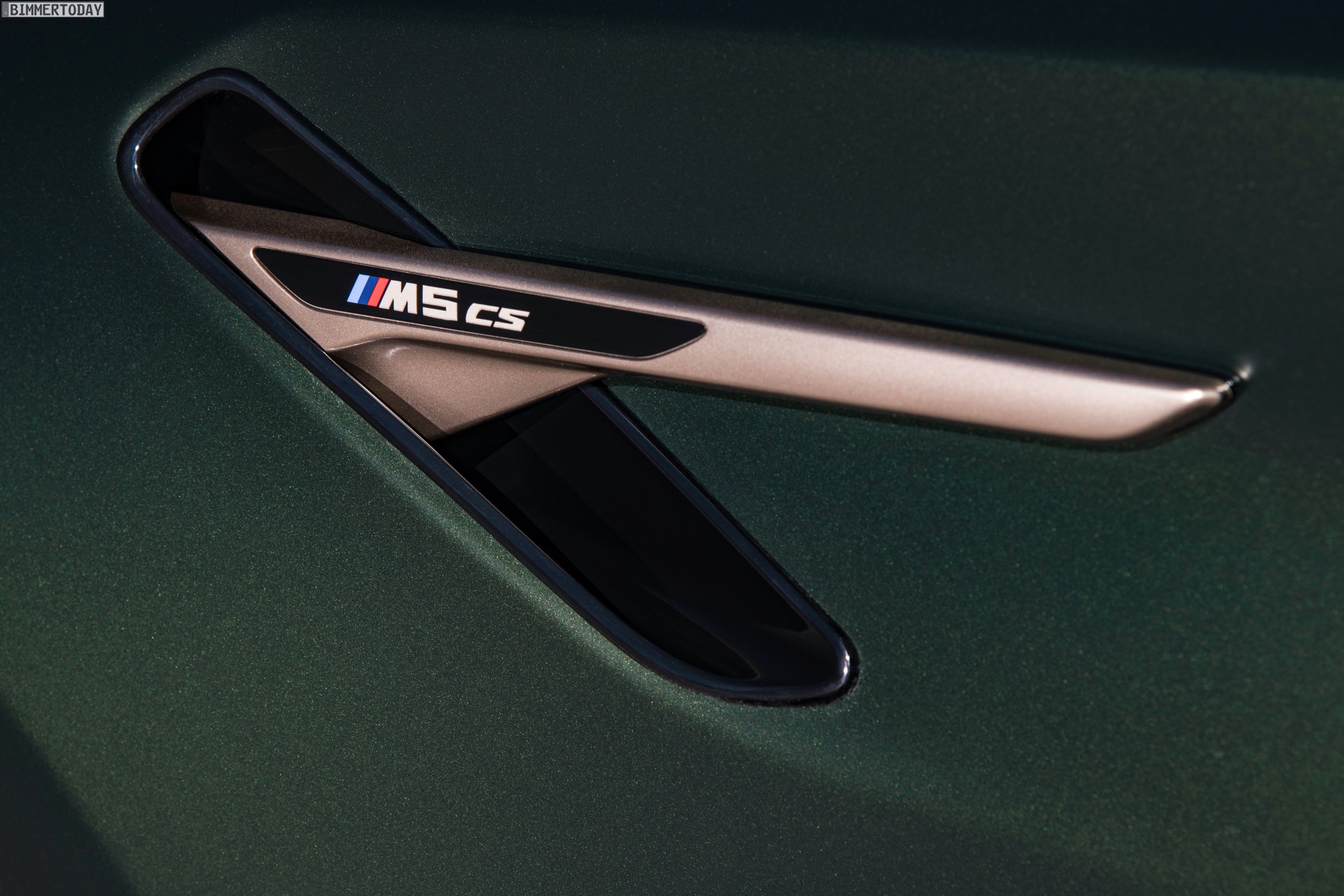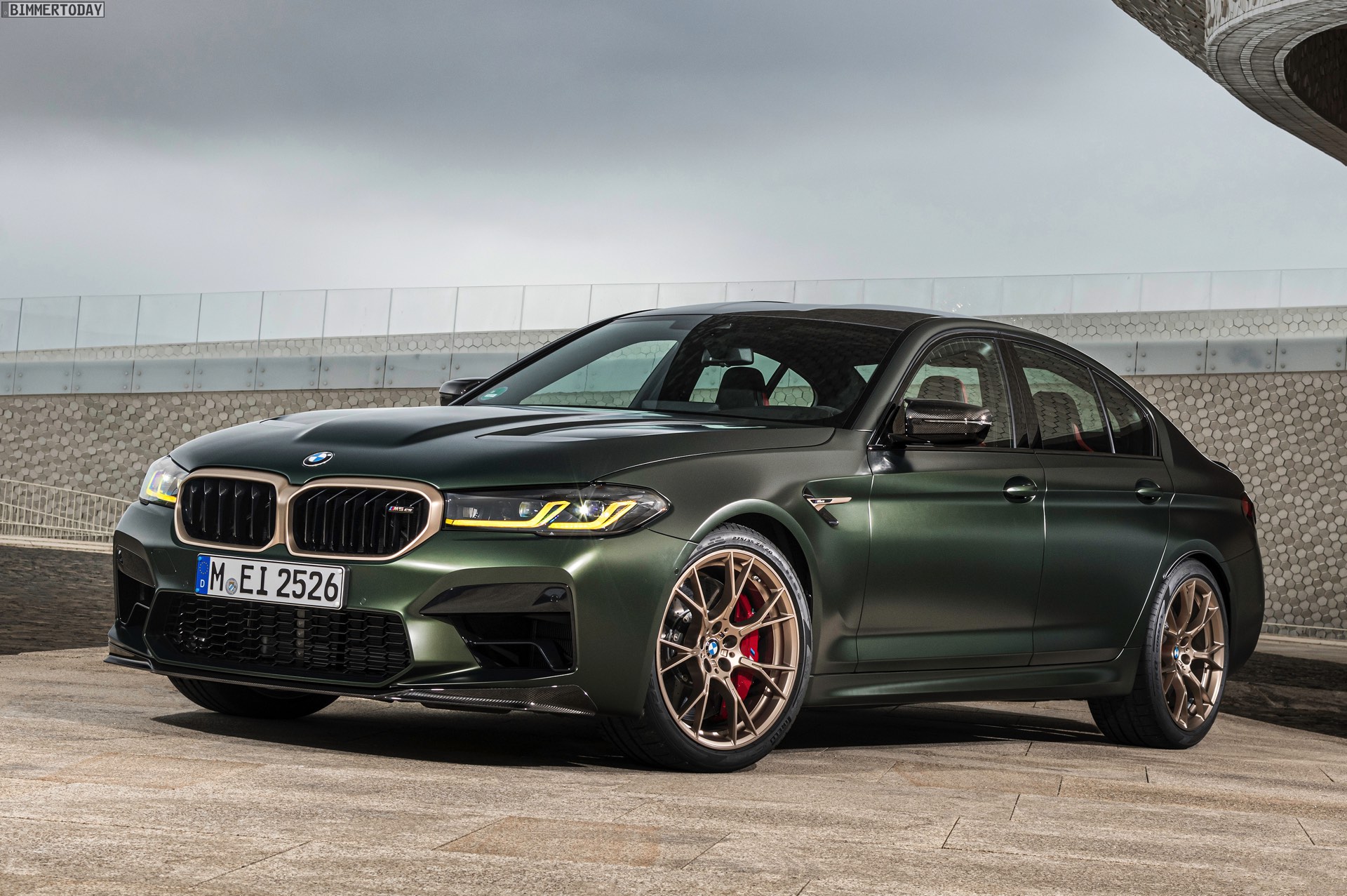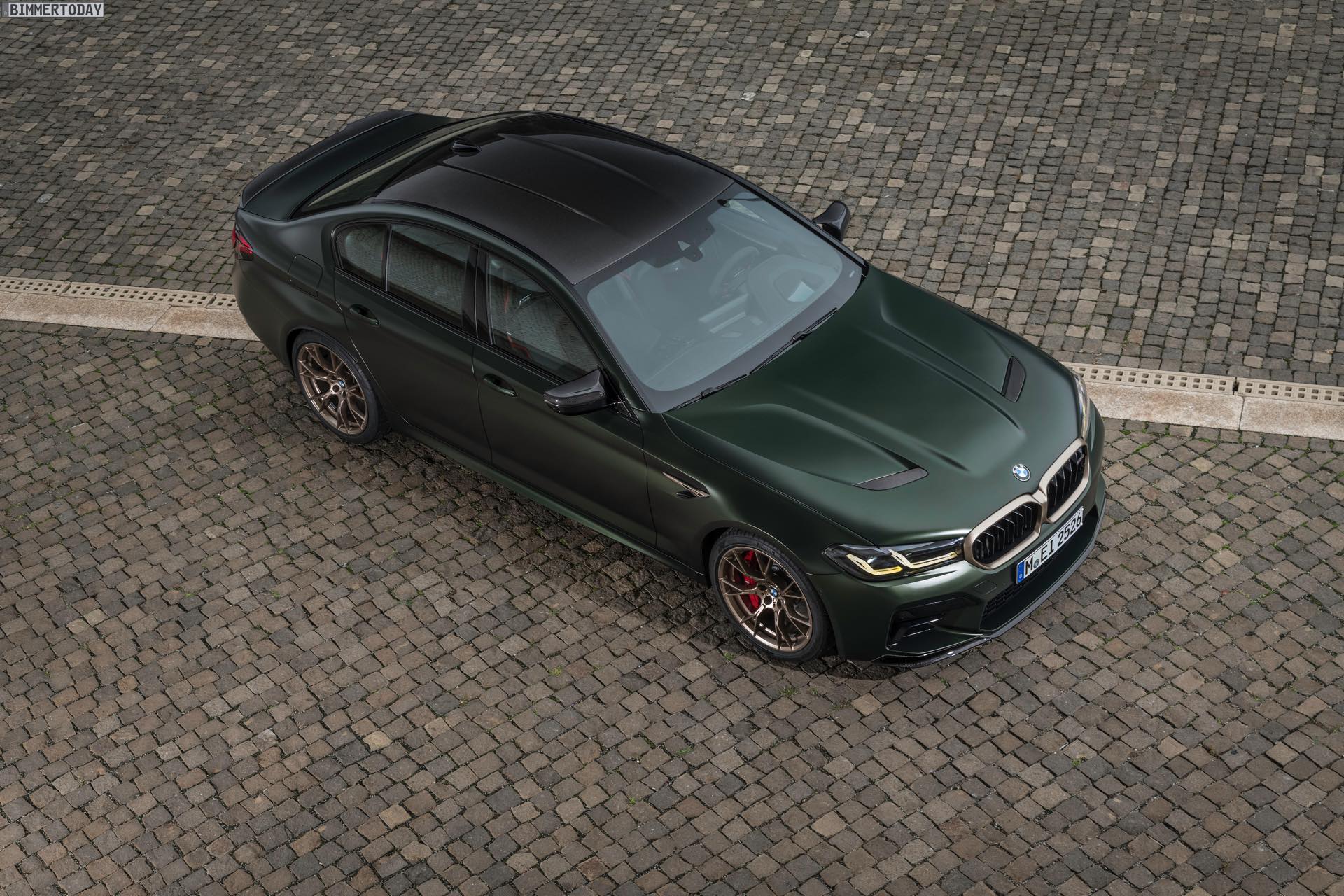 Nur der Optik dienen die zahlreichen Akzente in Goldbronze, wobei selbst die 20 Zoll großen Schmiederäder den exklusiven Farbton tragen dürfen. Ein besonderer Hingucker sind die gelben Lichtelemente in den Laser-Scheinwerfern an der Front: Während das Tagfahrlicht unverändert weiß leuchtet, wechseln die L-förmigen Elemente bei aktiviertem Abblend- oder Fernlicht sowie beim Welcome Light in ein kräftiges Gelb. Exklusiv ist auch die Farbpalette für den BMW M5 CS, denn nur das Topmodell der Generation F90 kann in Frozen Brands Hatch Grau oder dem auf den ersten Fotos abgebildeten Frozen Deep Green bestellt werden: