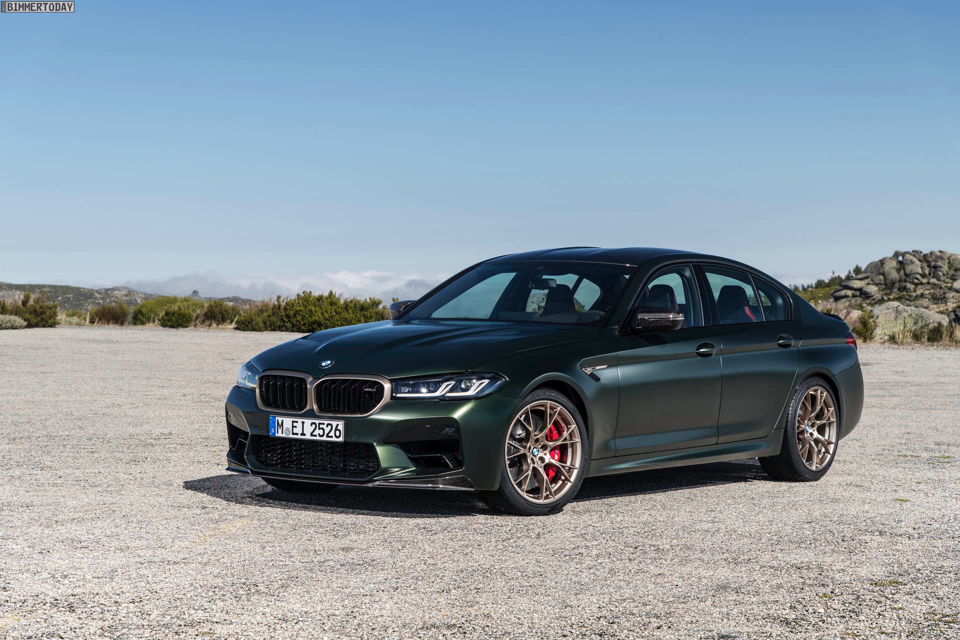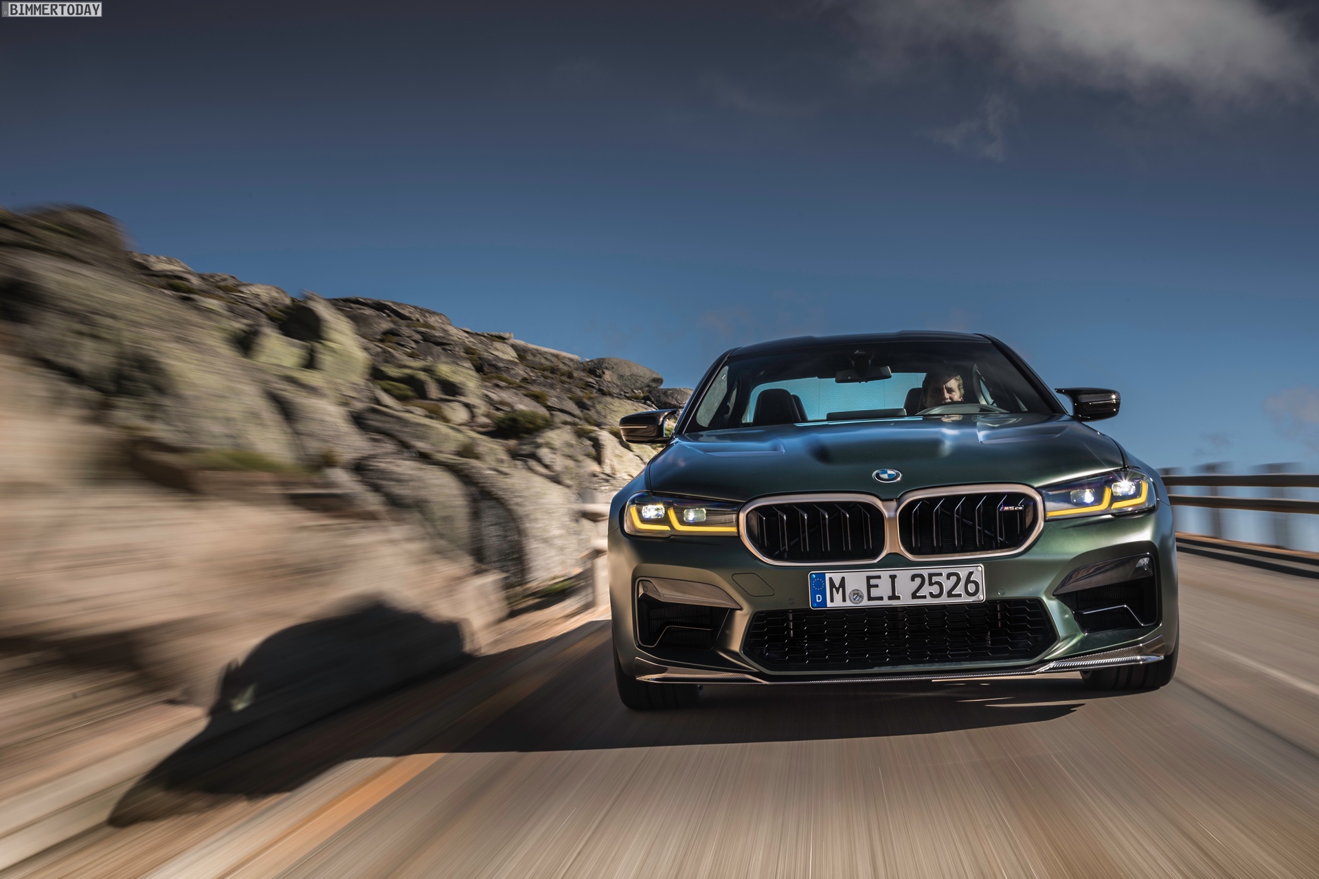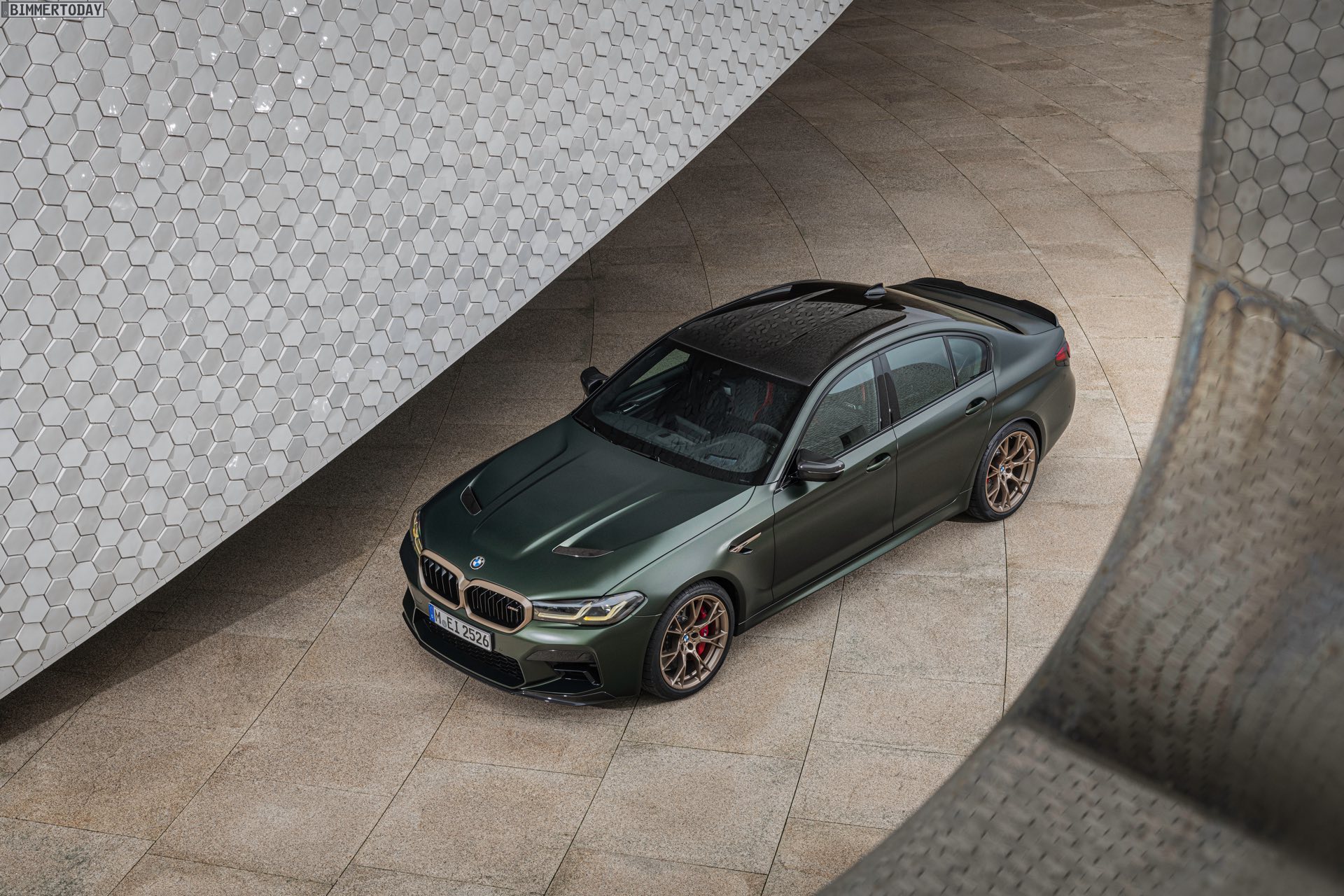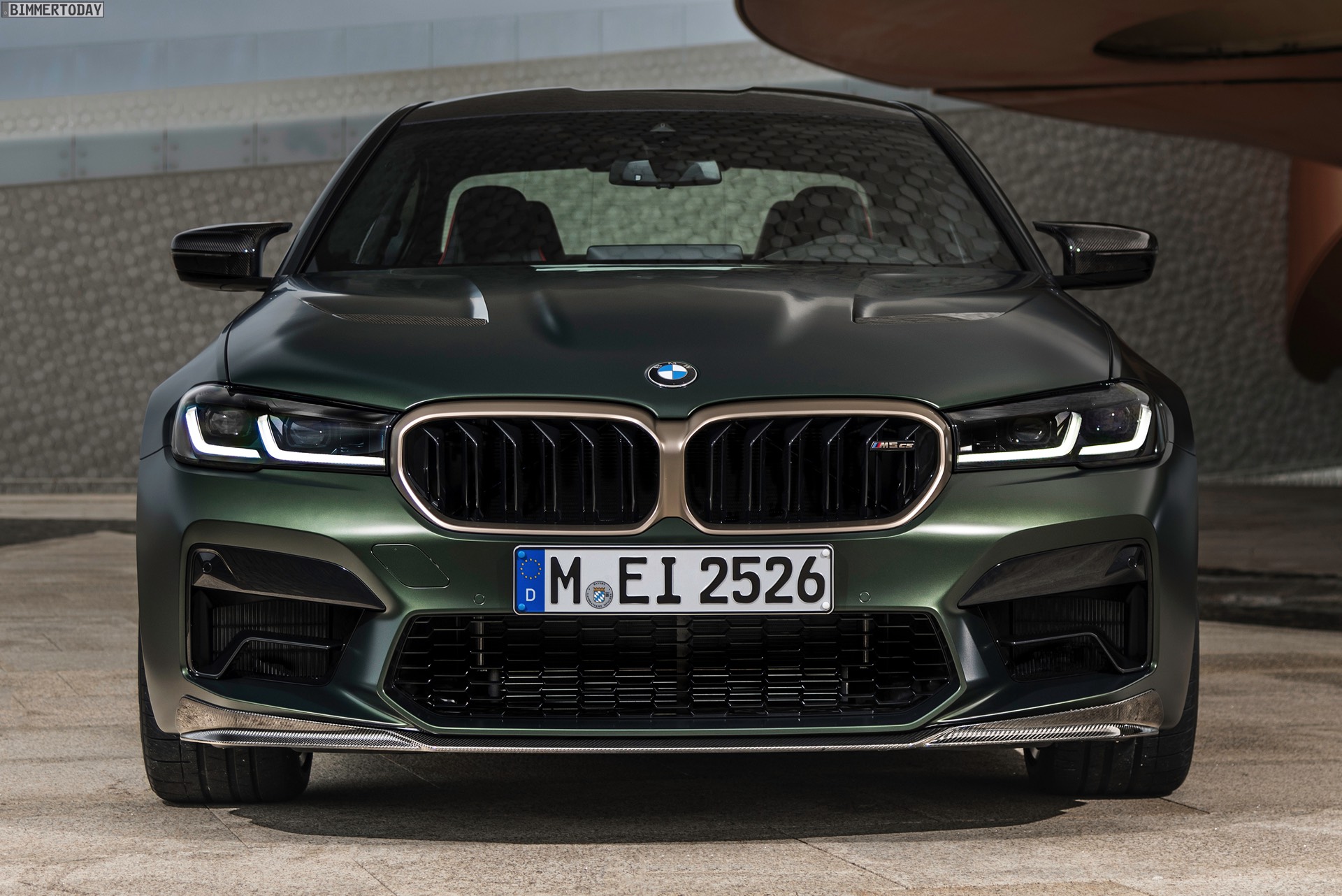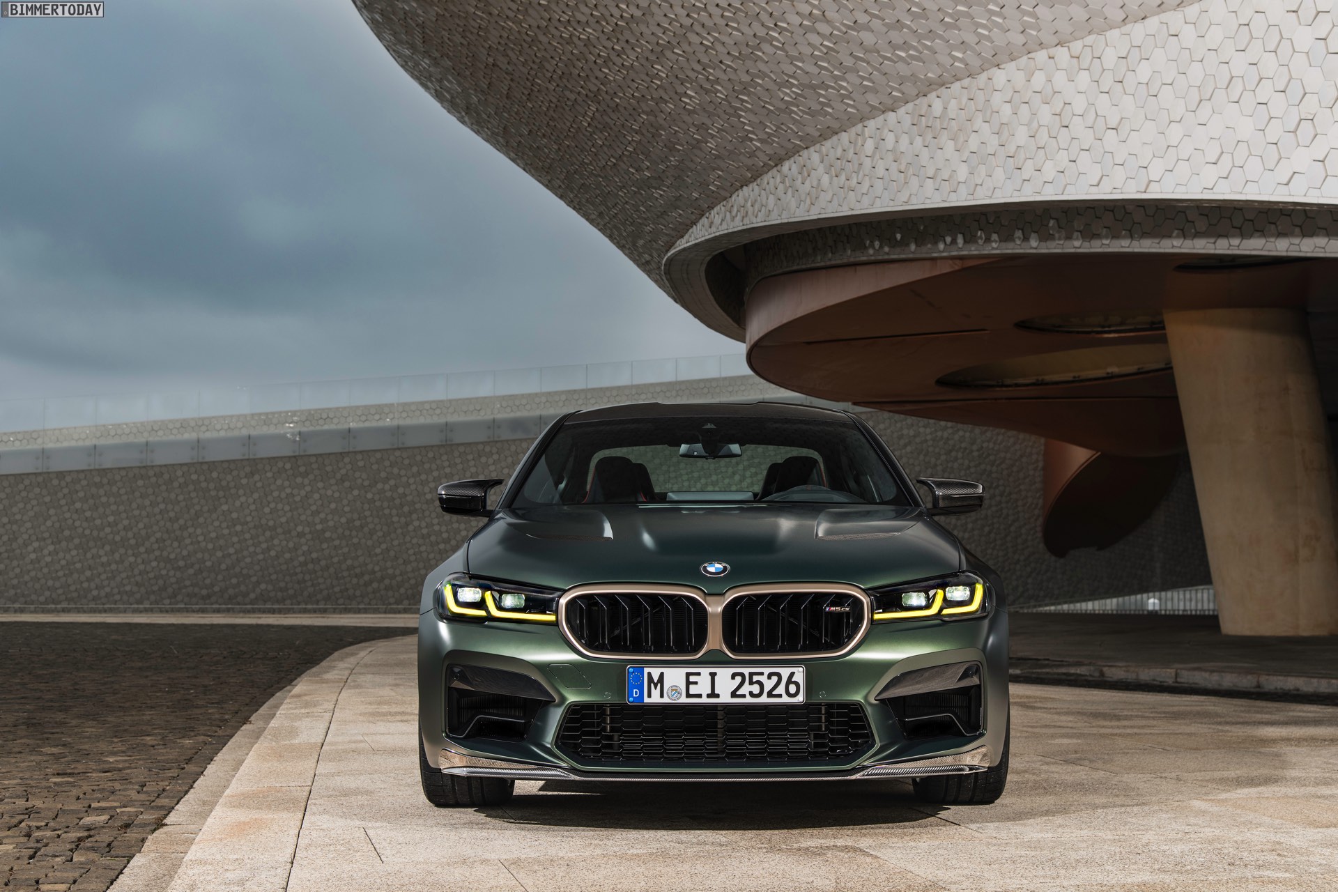Nur der Optik dienen die zahlreichen Akzente in Goldbronze, wobei selbst die 20 Zoll großen Schmiederäder den exklusiven Farbton tragen dürfen. Ein besonderer Hingucker sind die gelben Lichtelemente in den Laser-Scheinwerfern an der Front: Während das Tagfahrlicht unverändert weiß leuchtet, wechseln die L-förmigen Elemente bei aktiviertem Abblend- oder Fernlicht sowie beim Welcome Light in ein kräftiges Gelb. Exklusiv ist auch die Farbpalette für den BMW M5 CS, denn nur das Topmodell der Generation F90 kann in Frozen Brands Hatch Grau oder dem auf den ersten Fotos abgebildeten Frozen Deep Green bestellt werden: