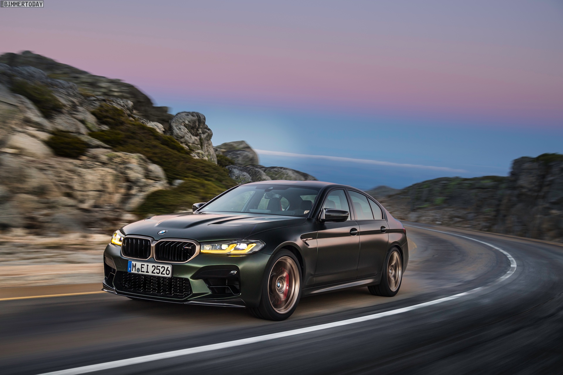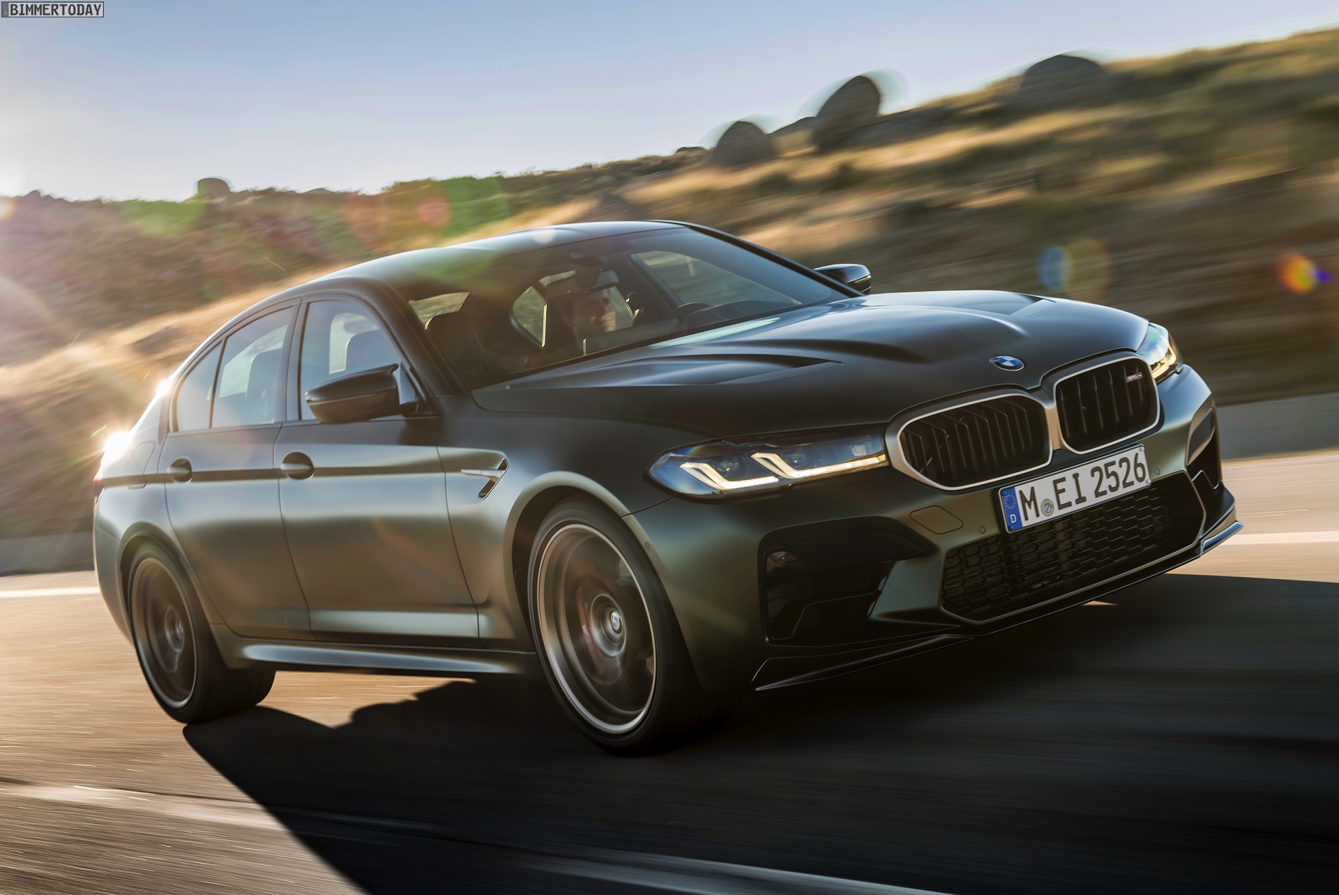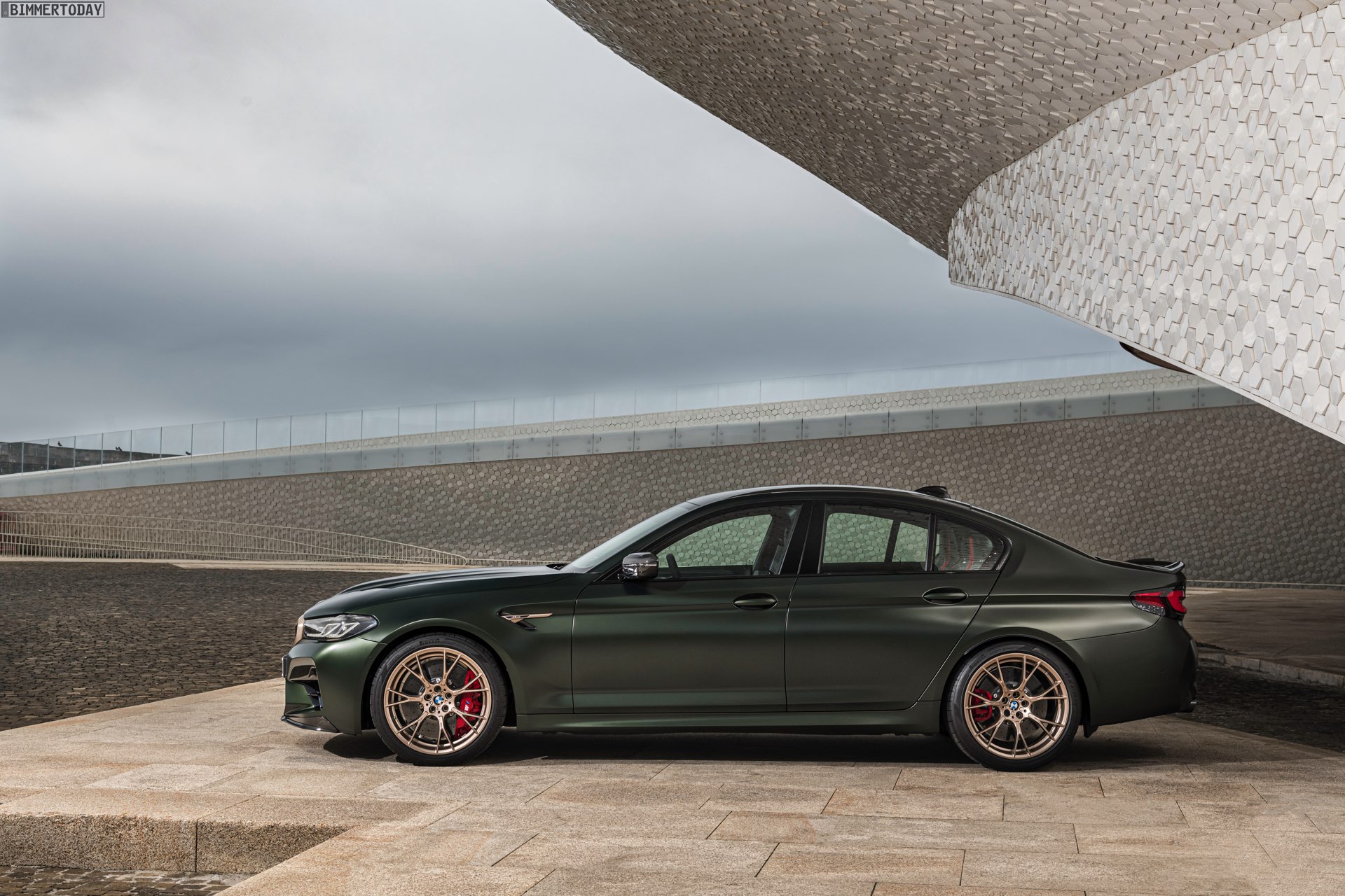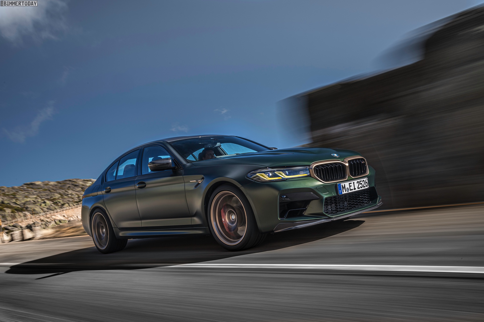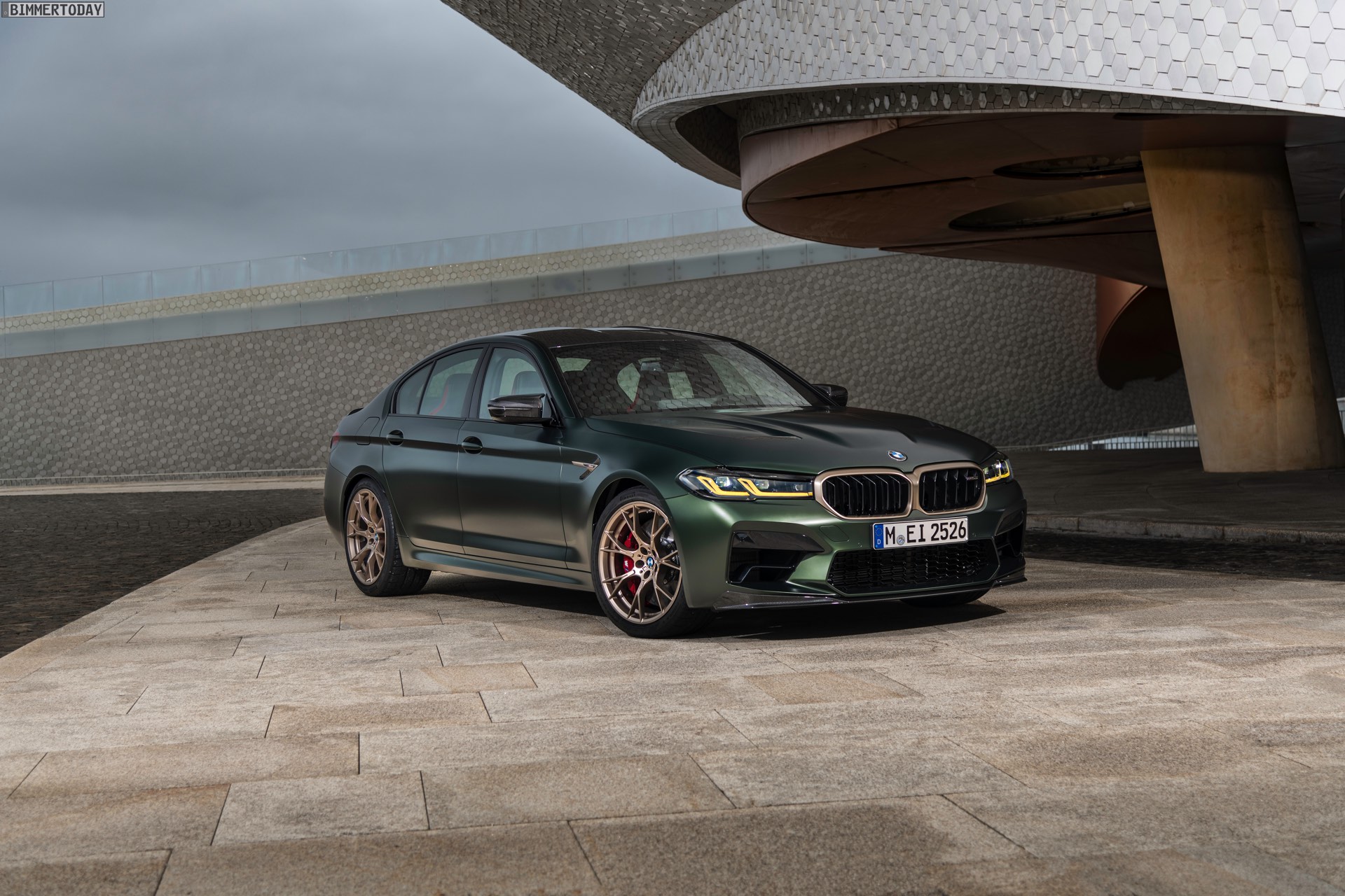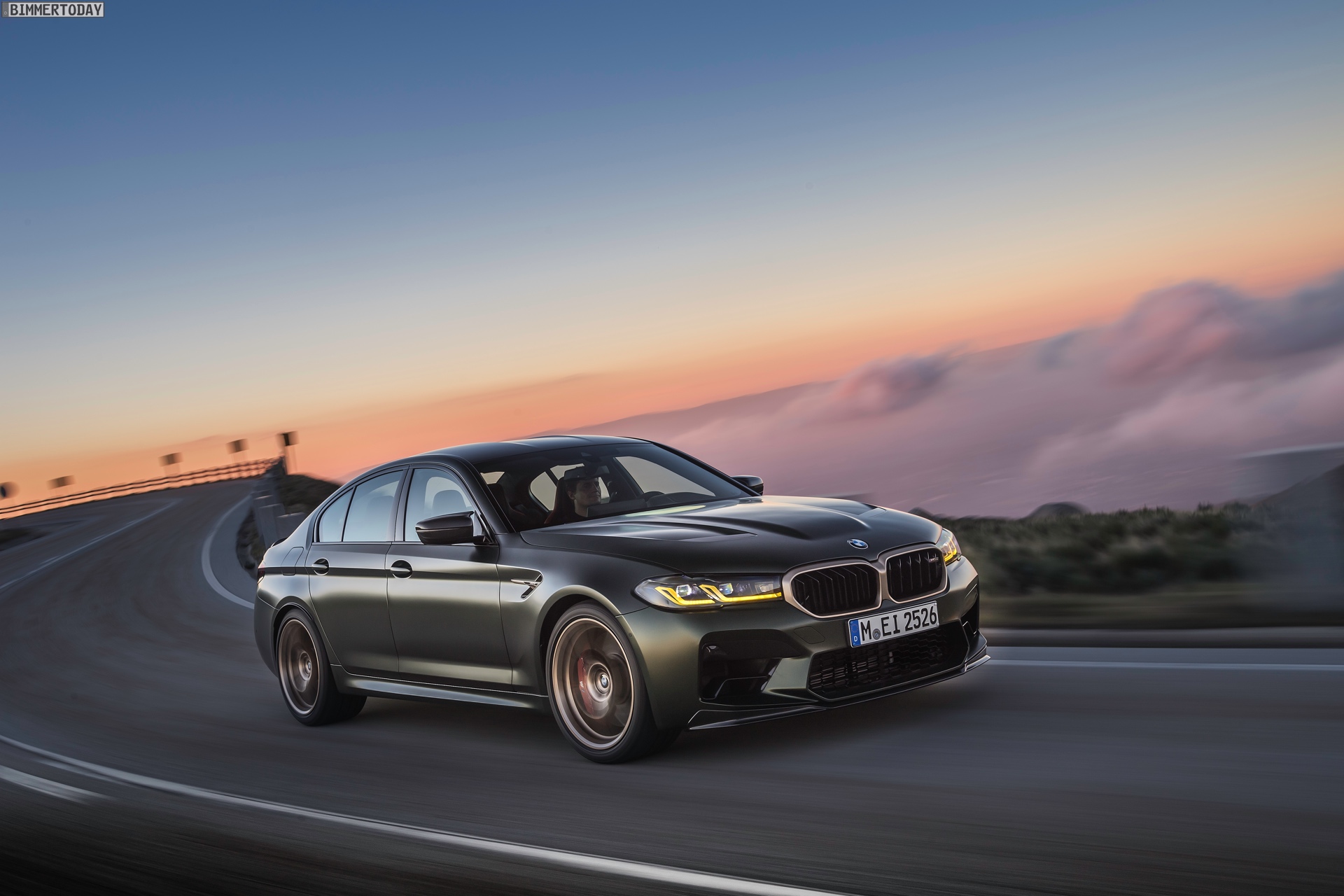 Nur der Optik dienen die zahlreichen Akzente in Goldbronze, wobei selbst die 20 Zoll großen Schmiederäder den exklusiven Farbton tragen dürfen. Ein besonderer Hingucker sind die gelben Lichtelemente in den Laser-Scheinwerfern an der Front: Während das Tagfahrlicht unverändert weiß leuchtet, wechseln die L-förmigen Elemente bei aktiviertem Abblend- oder Fernlicht sowie beim Welcome Light in ein kräftiges Gelb. Exklusiv ist auch die Farbpalette für den BMW M5 CS, denn nur das Topmodell der Generation F90 kann in Frozen Brands Hatch Grau oder dem auf den ersten Fotos abgebildeten Frozen Deep Green bestellt werden: