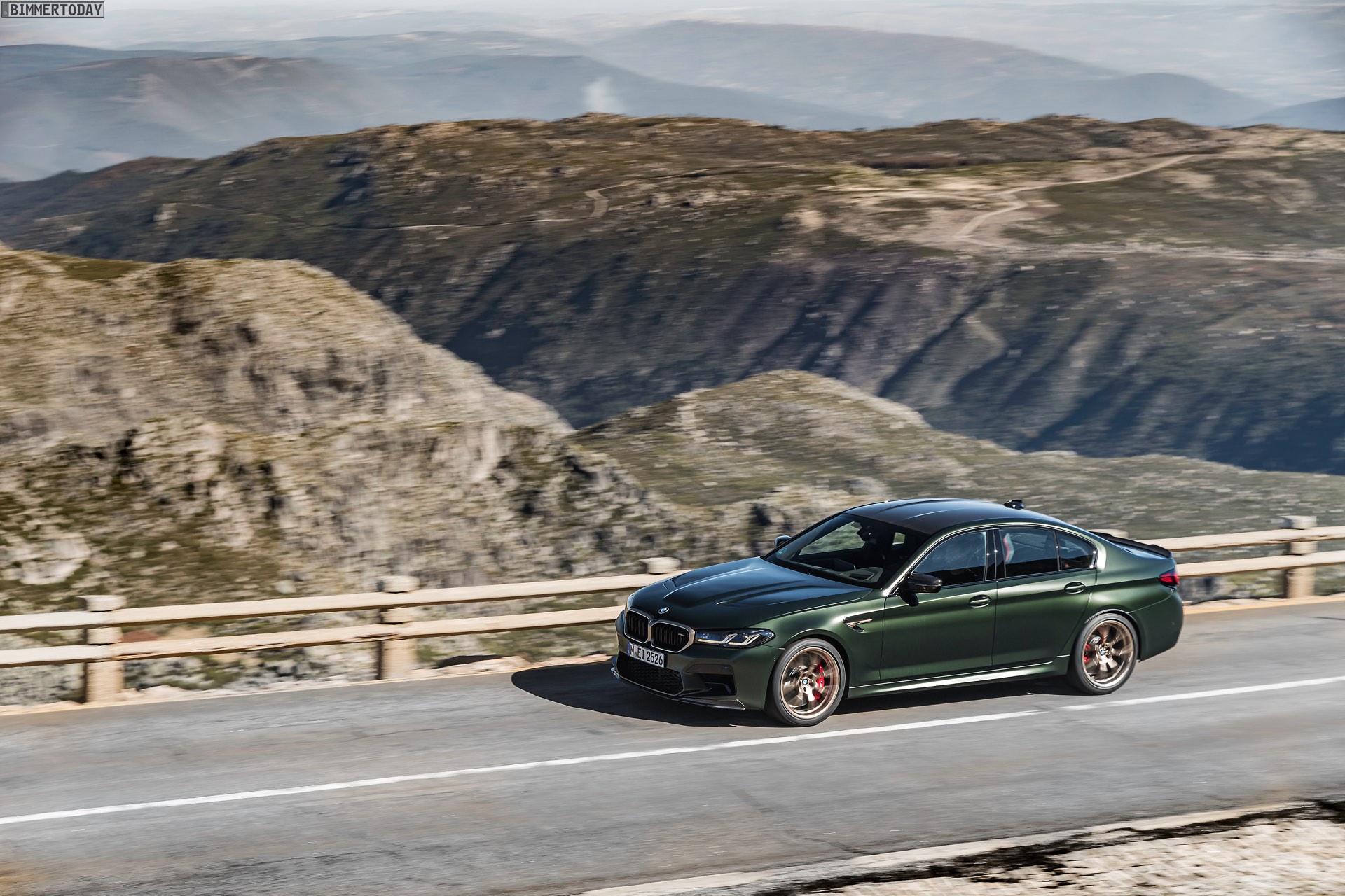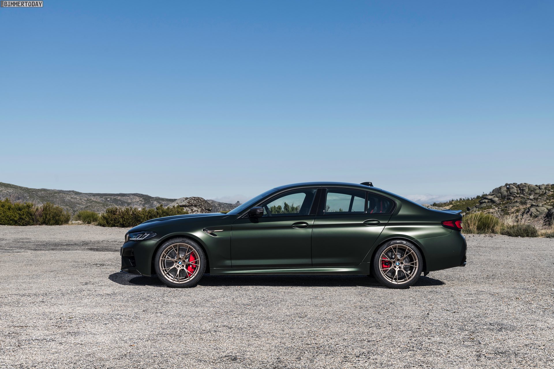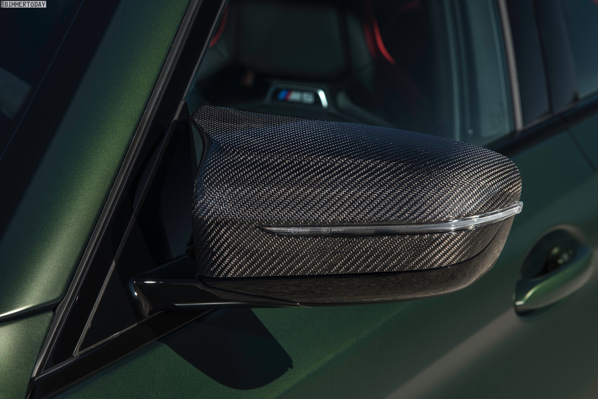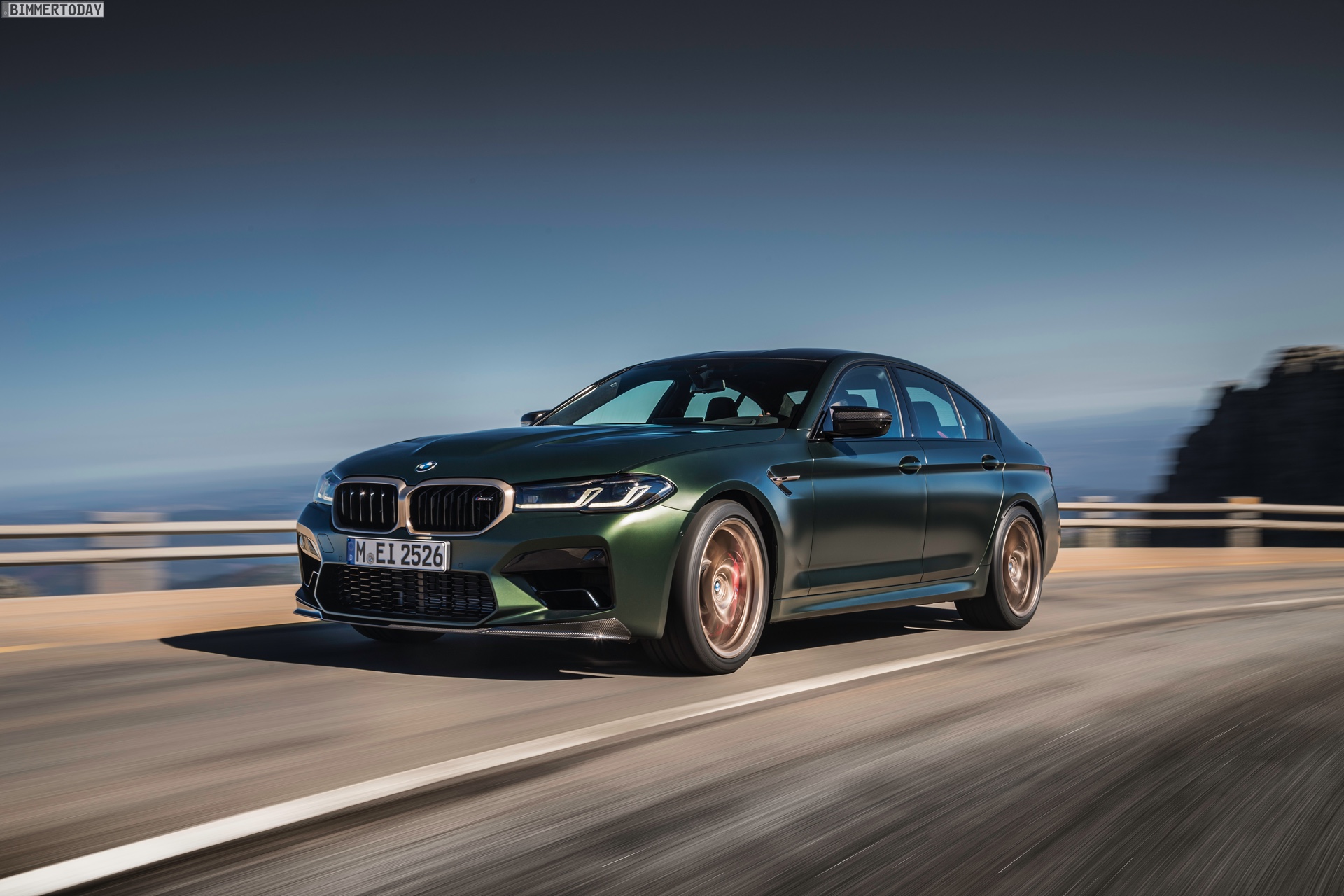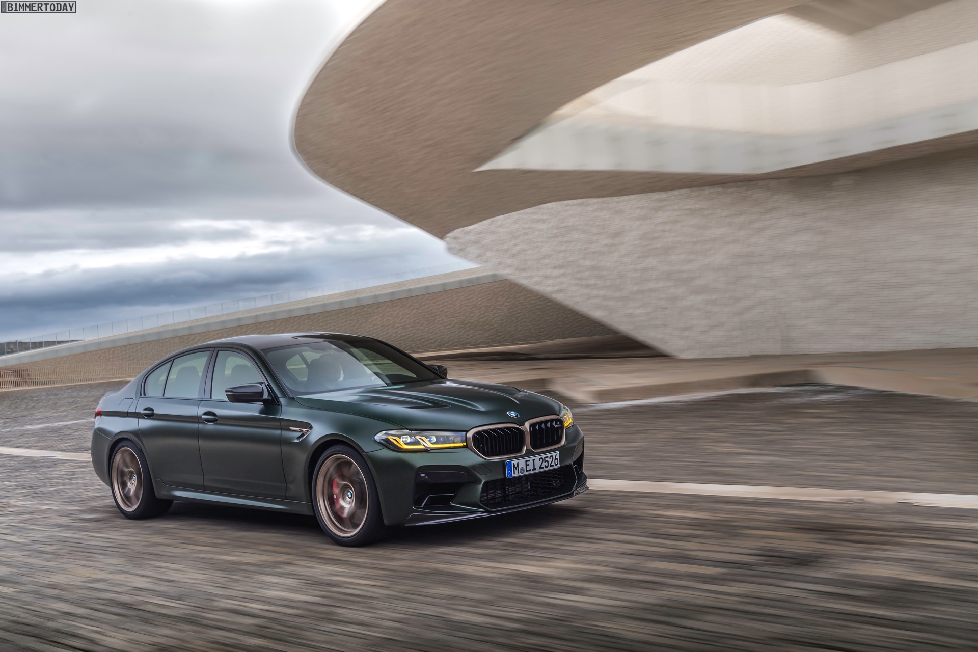 Nur der Optik dienen die zahlreichen Akzente in Goldbronze, wobei selbst die 20 Zoll großen Schmiederäder den exklusiven Farbton tragen dürfen. Ein besonderer Hingucker sind die gelben Lichtelemente in den Laser-Scheinwerfern an der Front: Während das Tagfahrlicht unverändert weiß leuchtet, wechseln die L-förmigen Elemente bei aktiviertem Abblend- oder Fernlicht sowie beim Welcome Light in ein kräftiges Gelb. Exklusiv ist auch die Farbpalette für den BMW M5 CS, denn nur das Topmodell der Generation F90 kann in Frozen Brands Hatch Grau oder dem auf den ersten Fotos abgebildeten Frozen Deep Green bestellt werden: