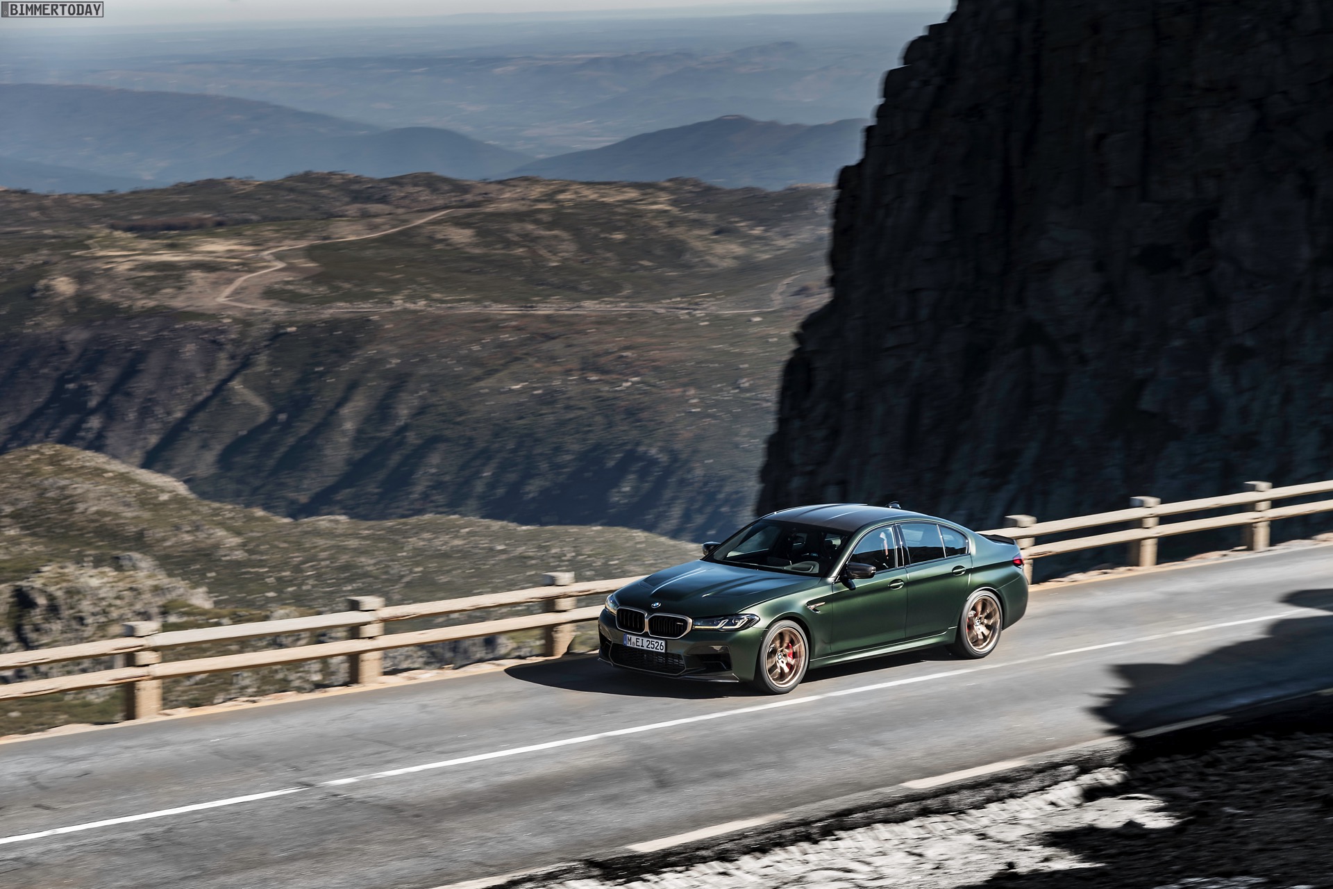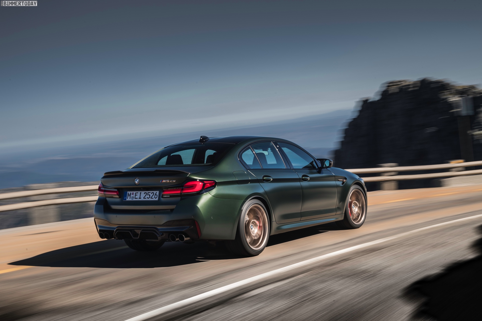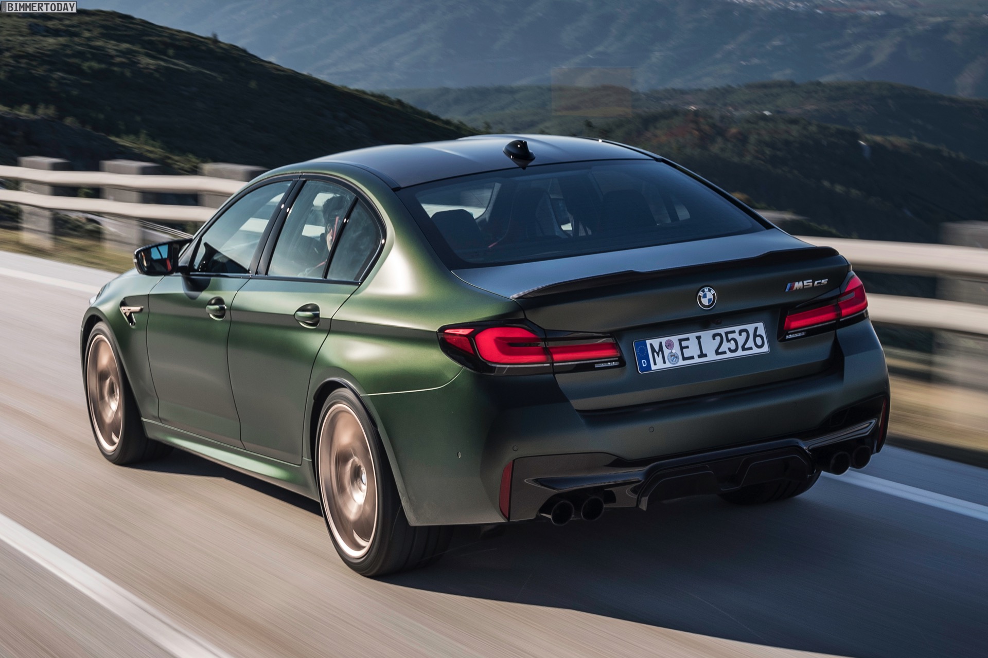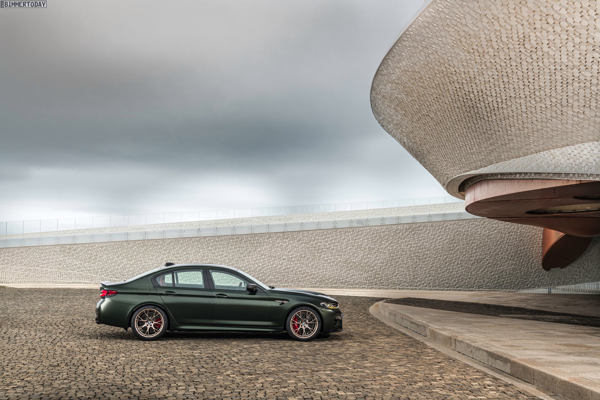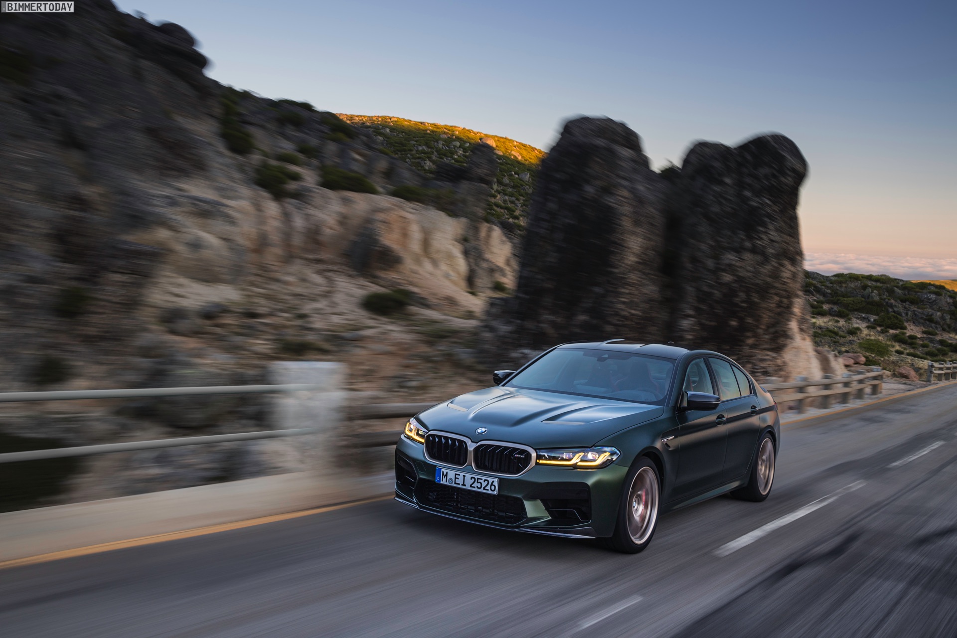 Nur der Optik dienen die zahlreichen Akzente in Goldbronze, wobei selbst die 20 Zoll großen Schmiederäder den exklusiven Farbton tragen dürfen. Ein besonderer Hingucker sind die gelben Lichtelemente in den Laser-Scheinwerfern an der Front: Während das Tagfahrlicht unverändert weiß leuchtet, wechseln die L-förmigen Elemente bei aktiviertem Abblend- oder Fernlicht sowie beim Welcome Light in ein kräftiges Gelb. Exklusiv ist auch die Farbpalette für den BMW M5 CS, denn nur das Topmodell der Generation F90 kann in Frozen Brands Hatch Grau oder dem auf den ersten Fotos abgebildeten Frozen Deep Green bestellt werden: