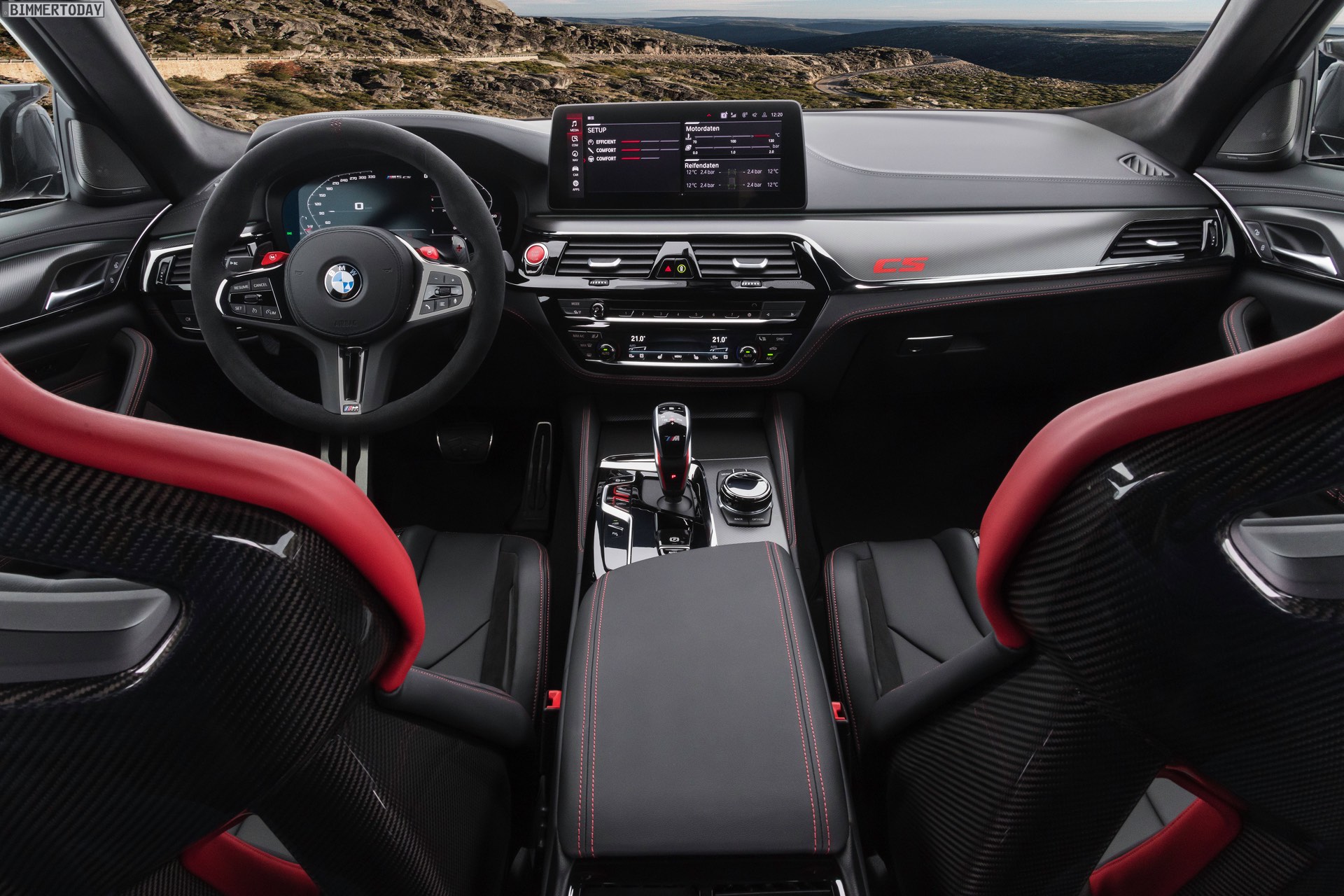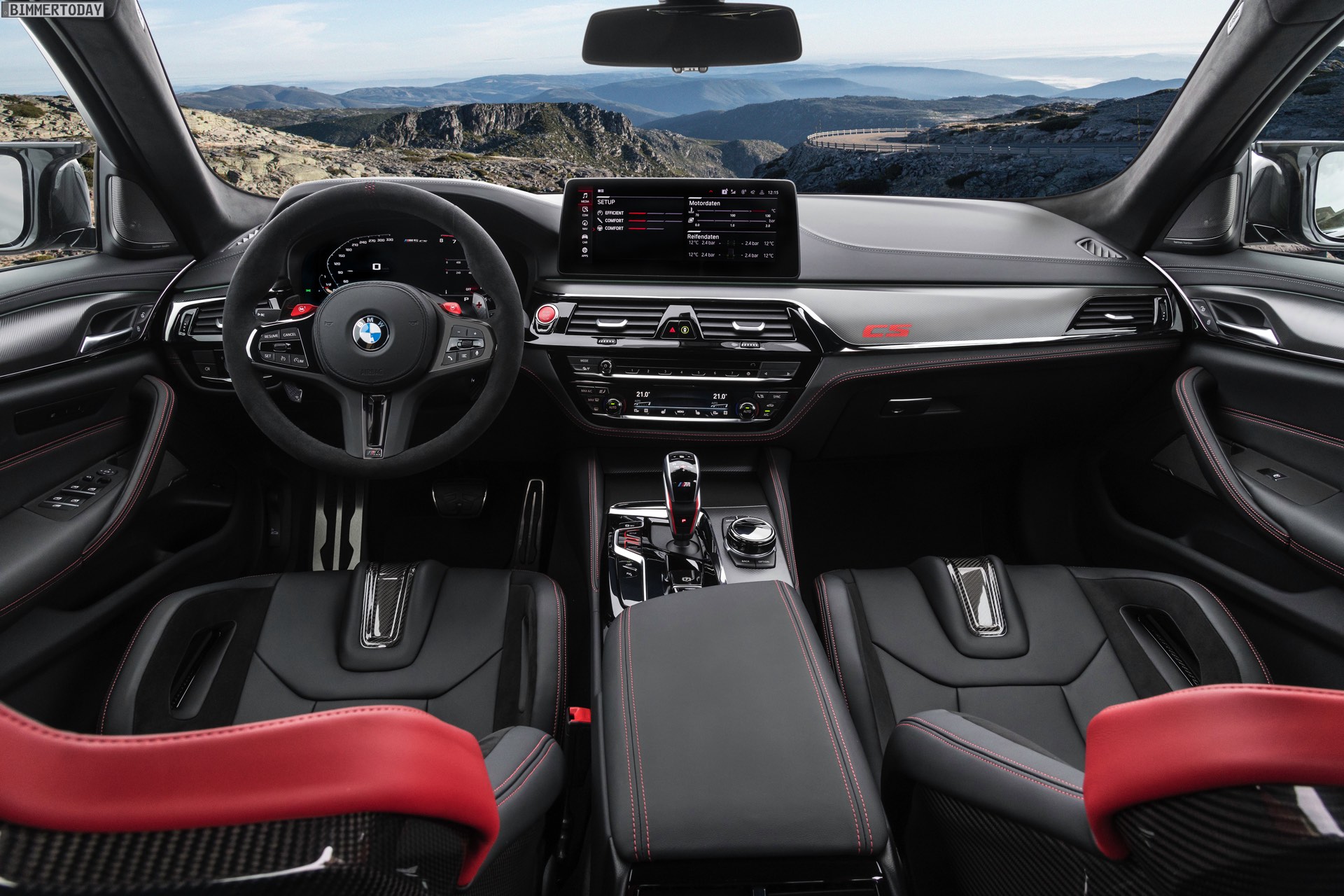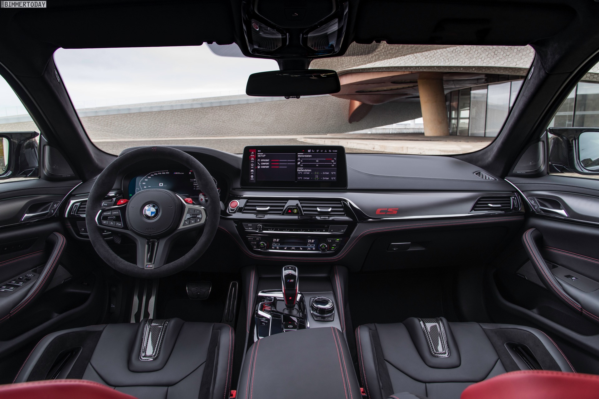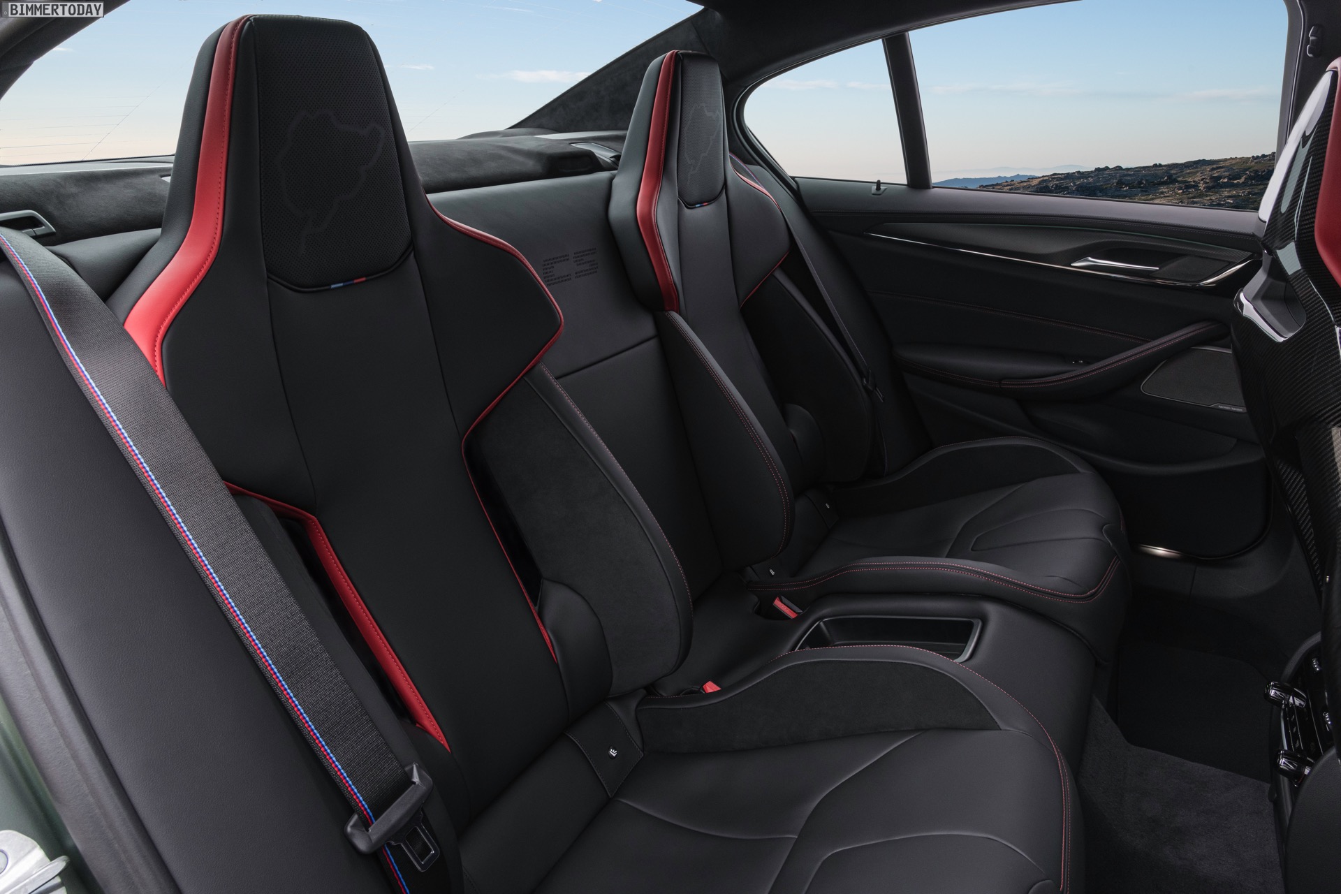 Wie ernst es den Machern des BMW M5 CS ist, zeigt sich spätestens beim Blick in den Innenraum: Hinter den vier Türen steckt nicht weniger als ein Cockpit für vier. Statt den komfortablen Sportsitzen des regulären M5 finden sich hier nicht nur für für Fahrer und Beifahrer leichte Carbon-Schalensitze, auch die Rückbank wurde durch zwei Schalensitze ersetzt. Weiteres Gewicht spart die Mittelkonsole, die nicht aufklappbar ist. Zahlreiche rote Details und CS-Badges weisen schließlich auch den letzten darauf hin, dass das Prinzip der Power-Limousine in diesem Fall wahrhaft auf die Spitze getrieben werden soll: