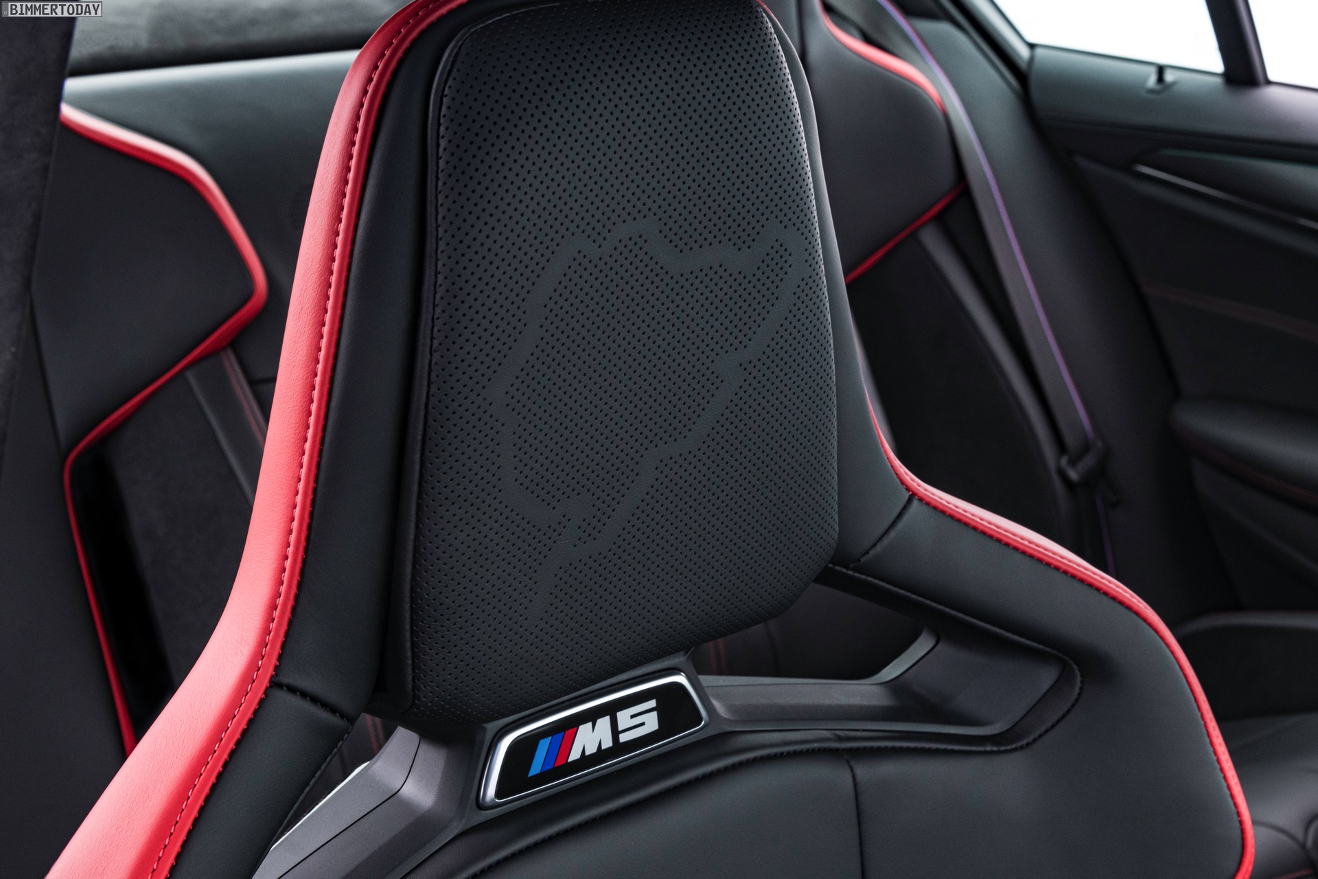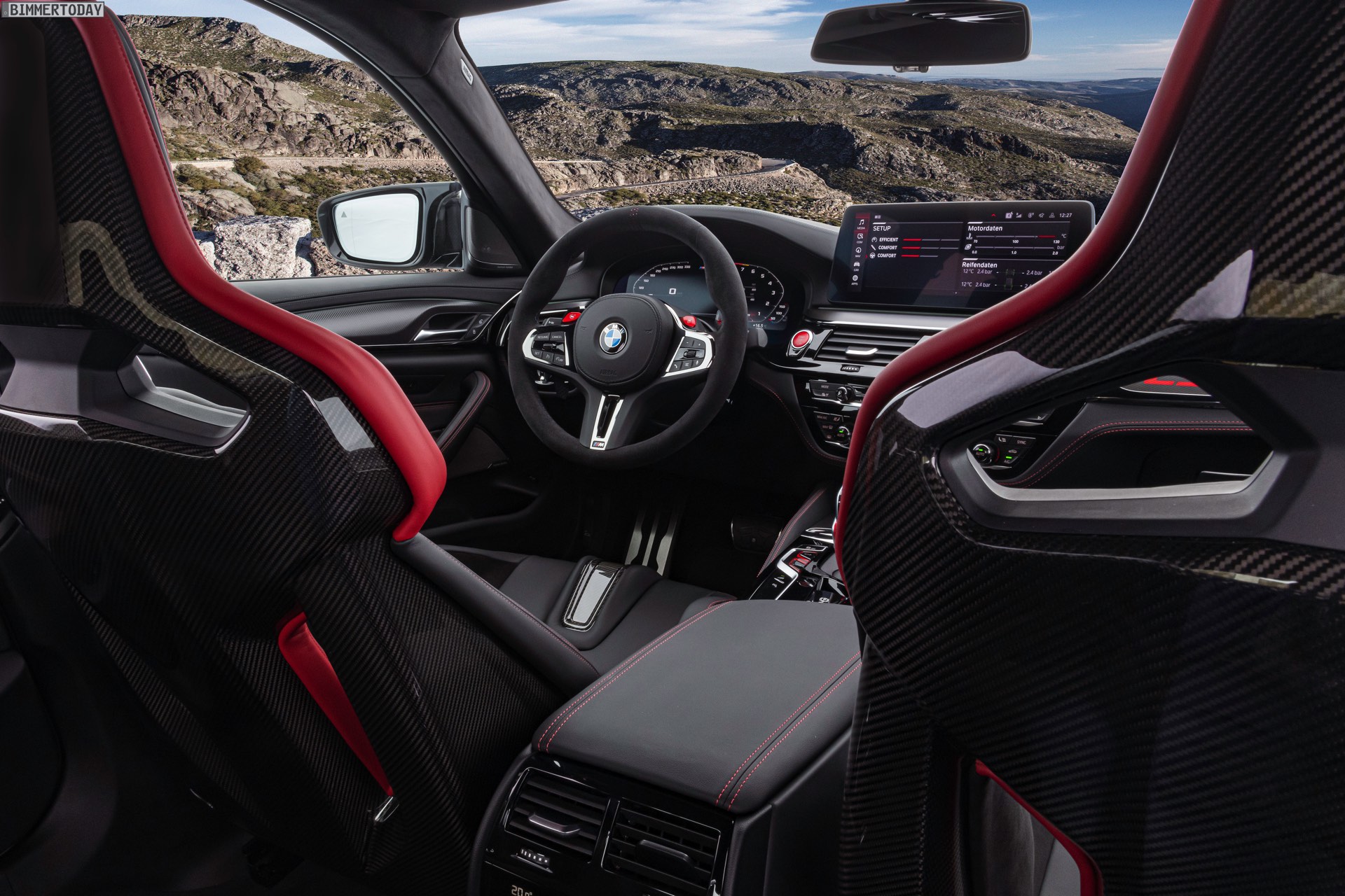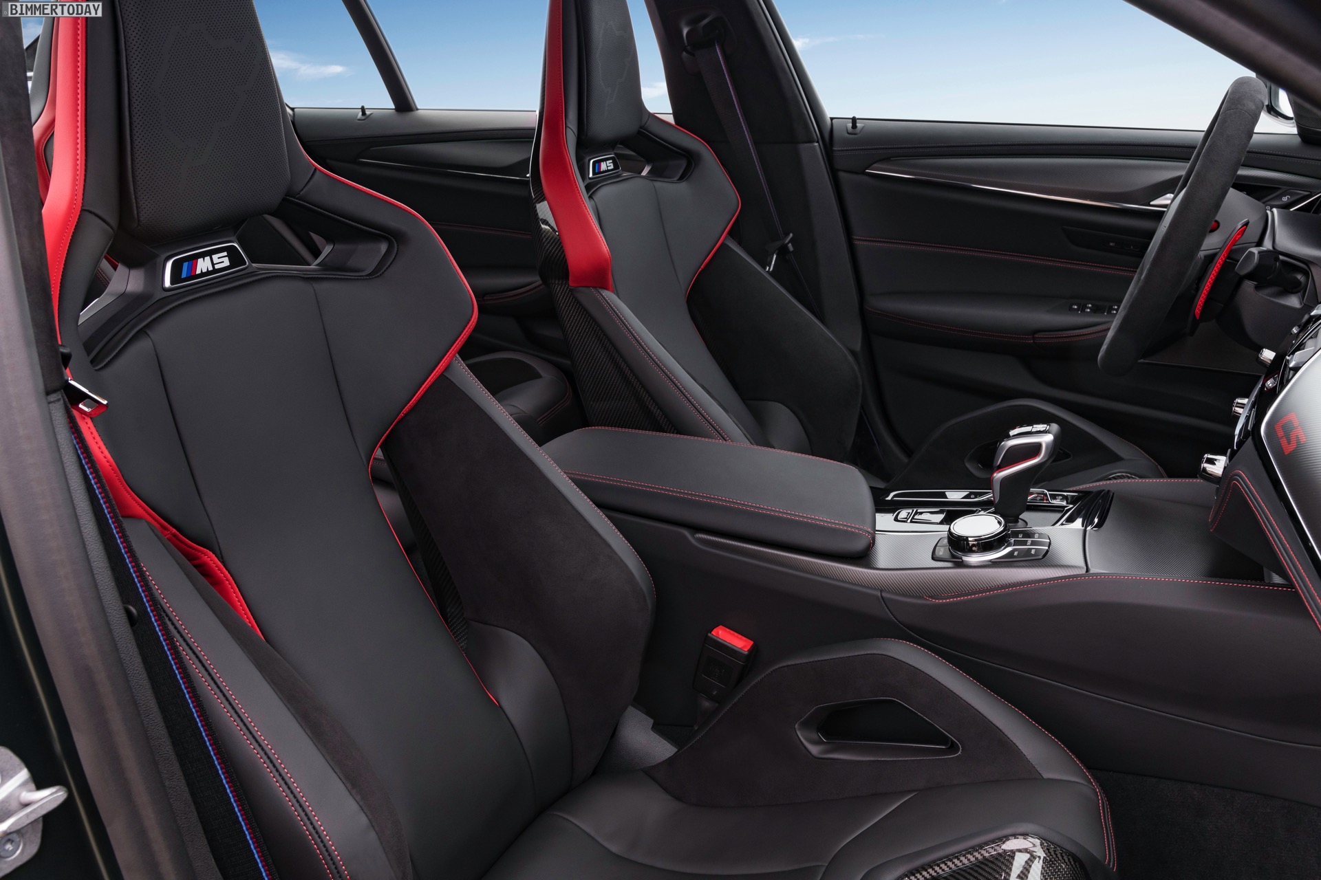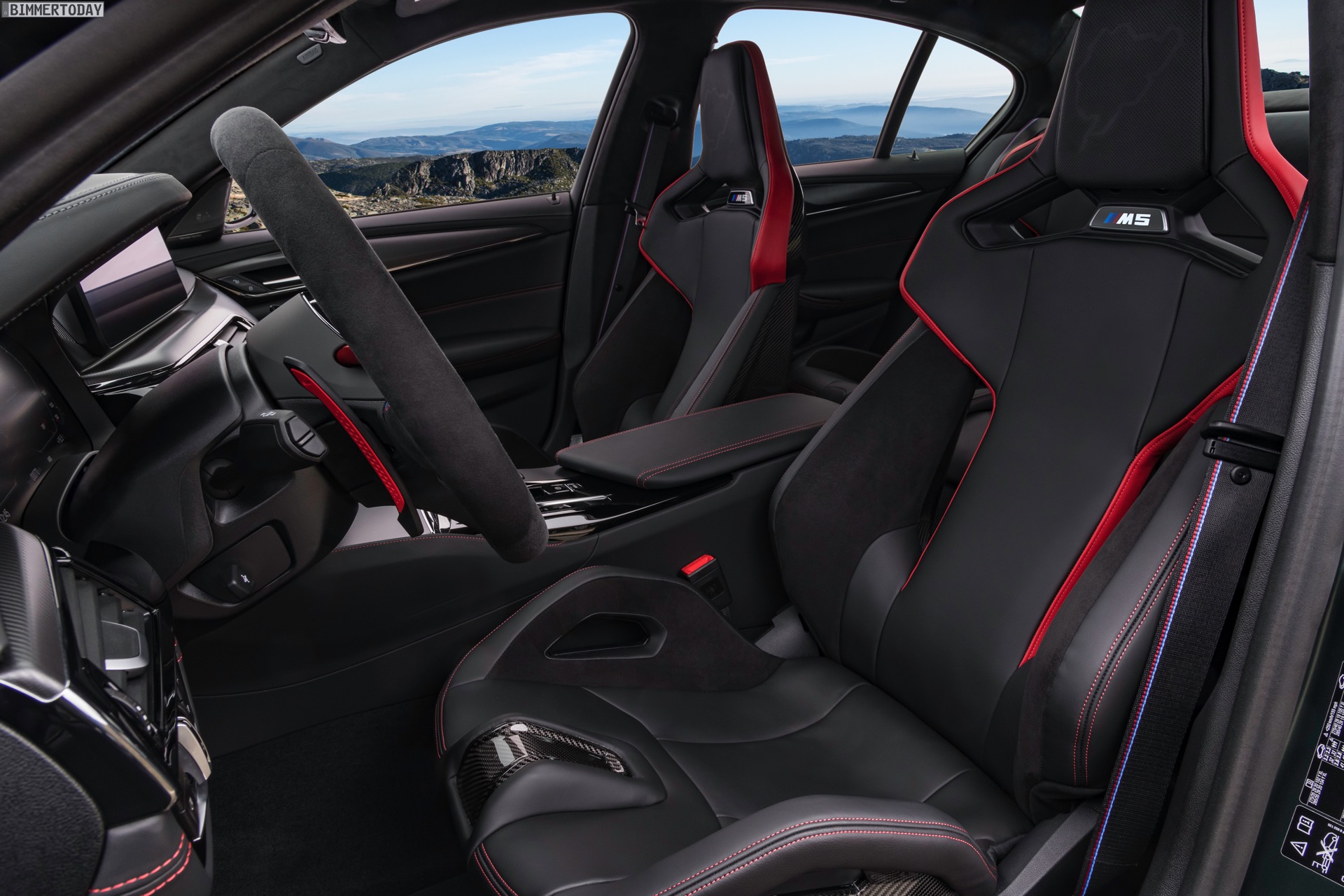 Wie ernst es den Machern des BMW M5 CS ist, zeigt sich spätestens beim Blick in den Innenraum: Hinter den vier Türen steckt nicht weniger als ein Cockpit für vier. Statt den komfortablen Sportsitzen des regulären M5 finden sich hier nicht nur für für Fahrer und Beifahrer leichte Carbon-Schalensitze, auch die Rückbank wurde durch zwei Schalensitze ersetzt. Weiteres Gewicht spart die Mittelkonsole, die nicht aufklappbar ist. Zahlreiche rote Details und CS-Badges weisen schließlich auch den letzten darauf hin, dass das Prinzip der Power-Limousine in diesem Fall wahrhaft auf die Spitze getrieben werden soll: