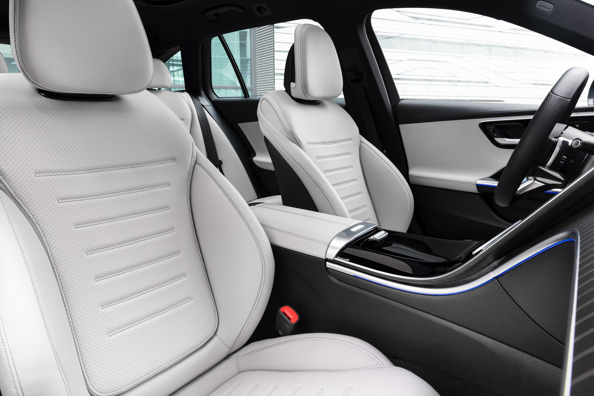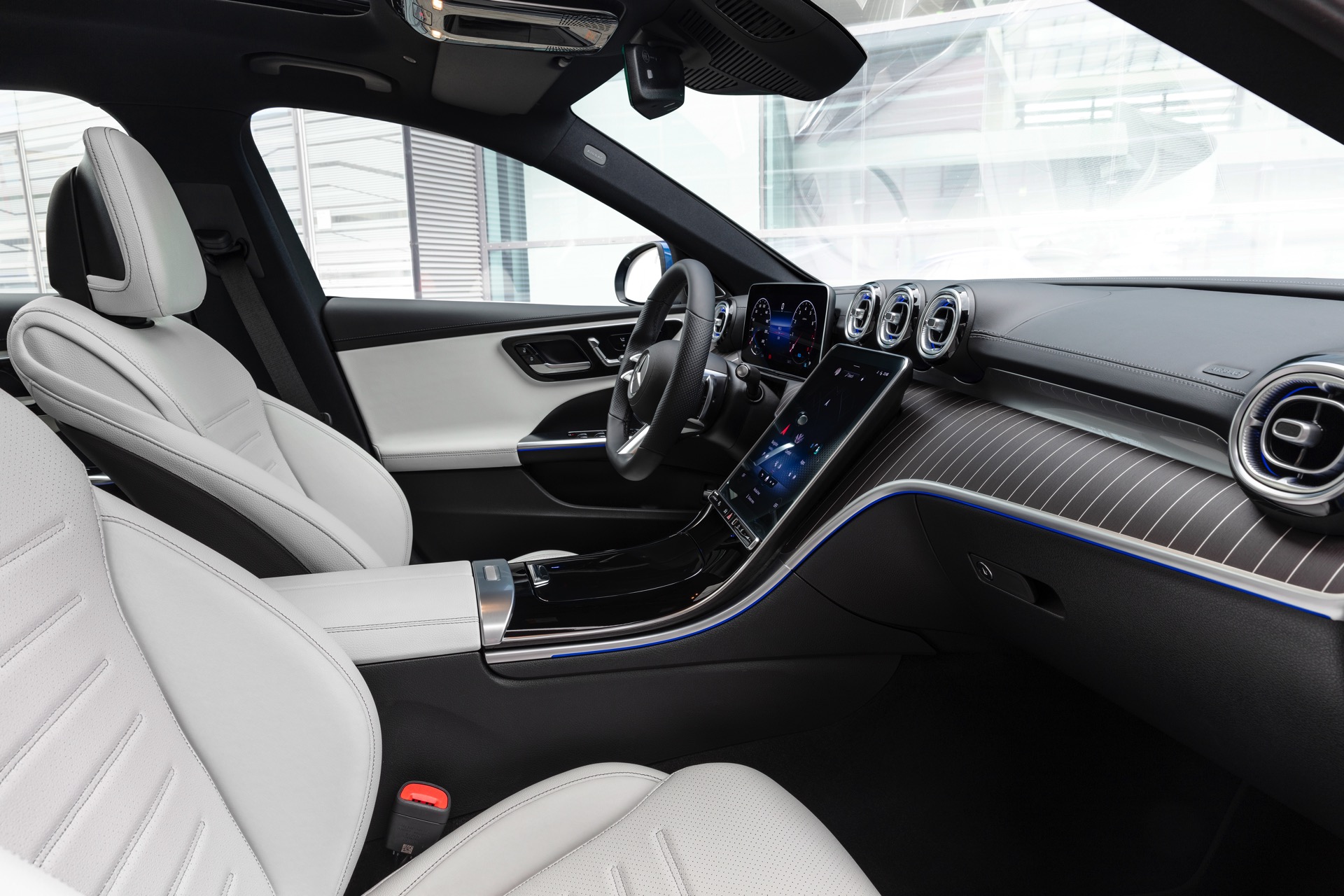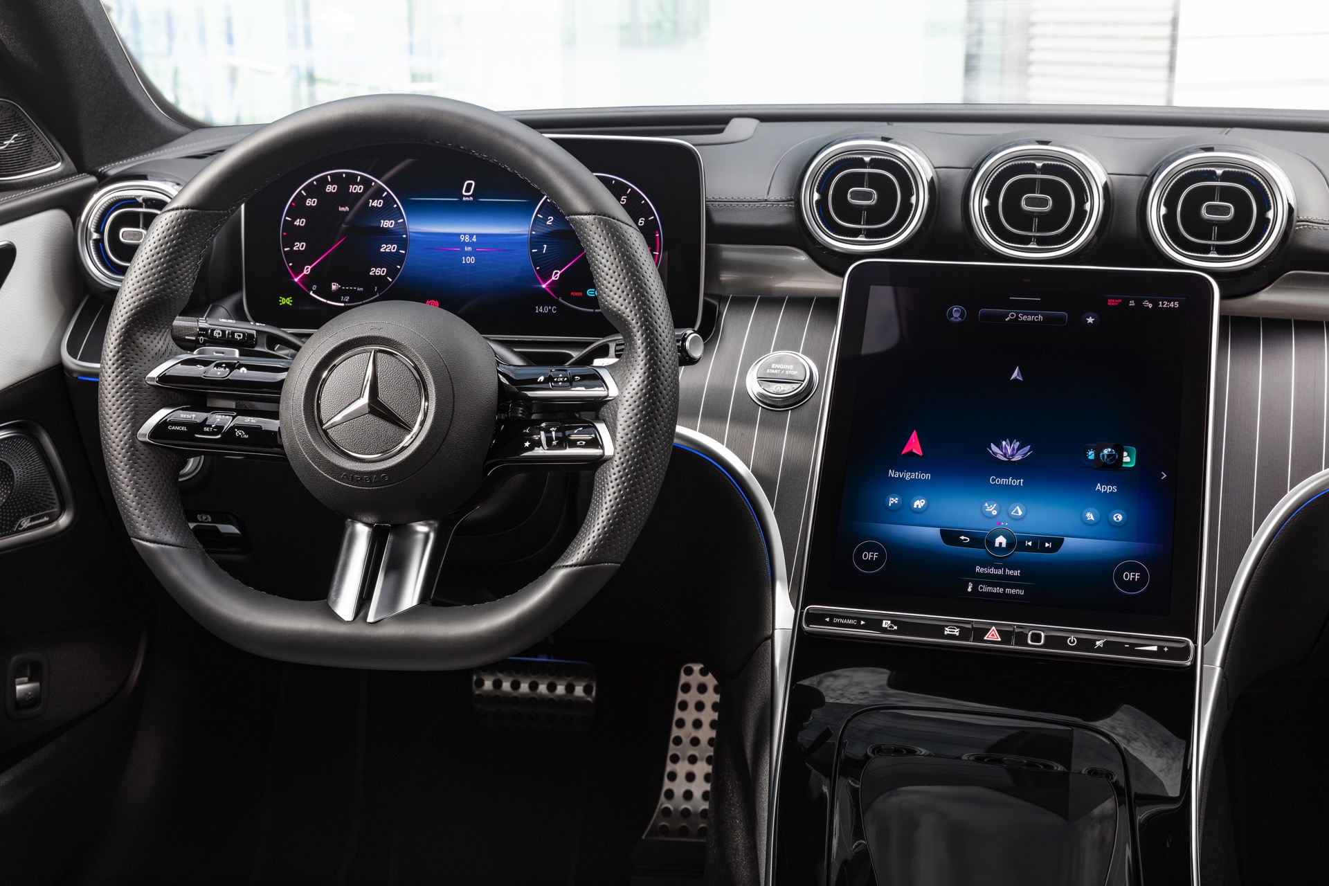 Der für alle Kunden gleichermaßen wichtige Fahrer-Arbeitsplatz im Cockpit unterscheidet sich ebenfalls deutlich: Genau wie die neue S-Klasse setzt auch das Mercedes C-Klasse T-Modell auf ein großes Infotainment-Display im Hochformat, das sich deutlich vom üblichen Standard der letzten Jahre abgrenzt und mit Sicherheit seine Freunde finden wird. Ob die Fokussierung auf eine Bedienung per relativ weit unten platziertem Touchscreen auch während der Fahrt überzeugen kann, müssen erste Fahrberichte und Vergleichstests klären.