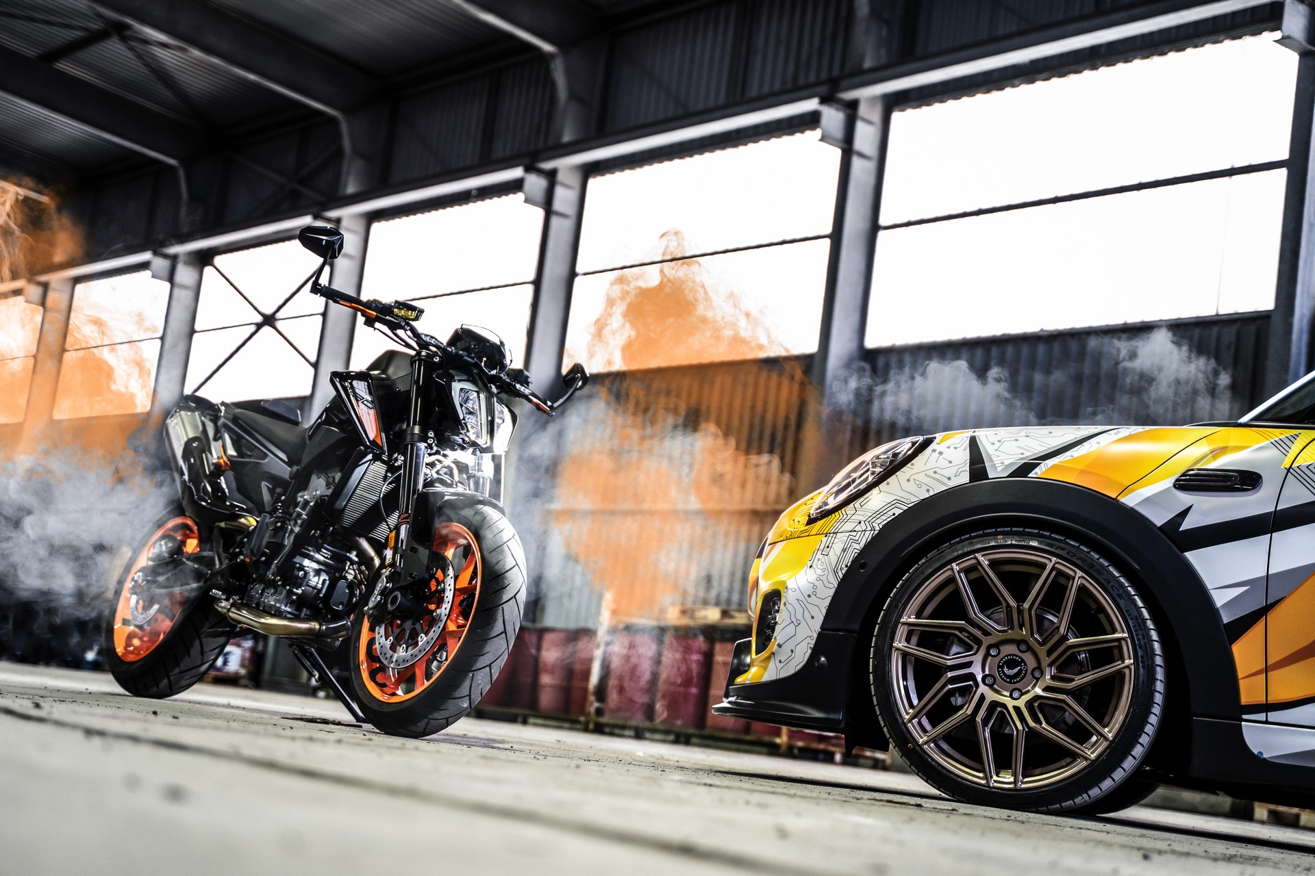 Neben der auffälligen Folierung trägt der gezeigte MINI Cooper SE einen Frontsplitter von 3D Design, einen Heckspoiler von RSIc6 und einen JCW Pro-Diffusor. In den Radhäusern kommen 19 Zoll große Leichtmetallräder von Barracuda Racing Wheels zum Einsatz, die auf den Namen Dragoon hören und der Flowforged Ultralight-Serie entstammen. Dank eines KW Gewindefahrwerks der Variante 3 und einer gewissen Tieferlegung kommen die großen Felgen noch besser zur Geltung.