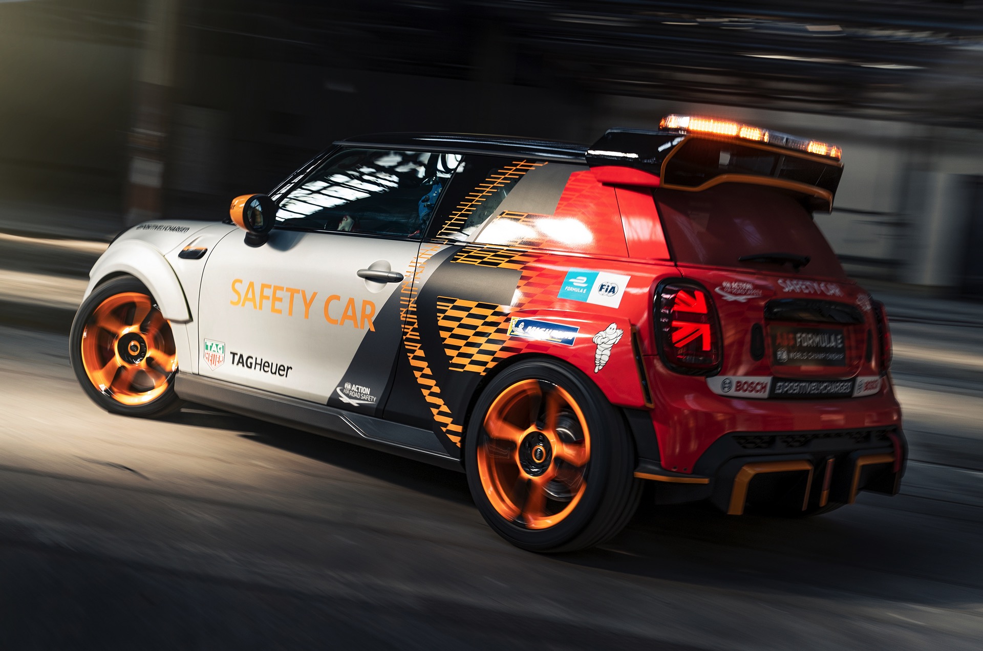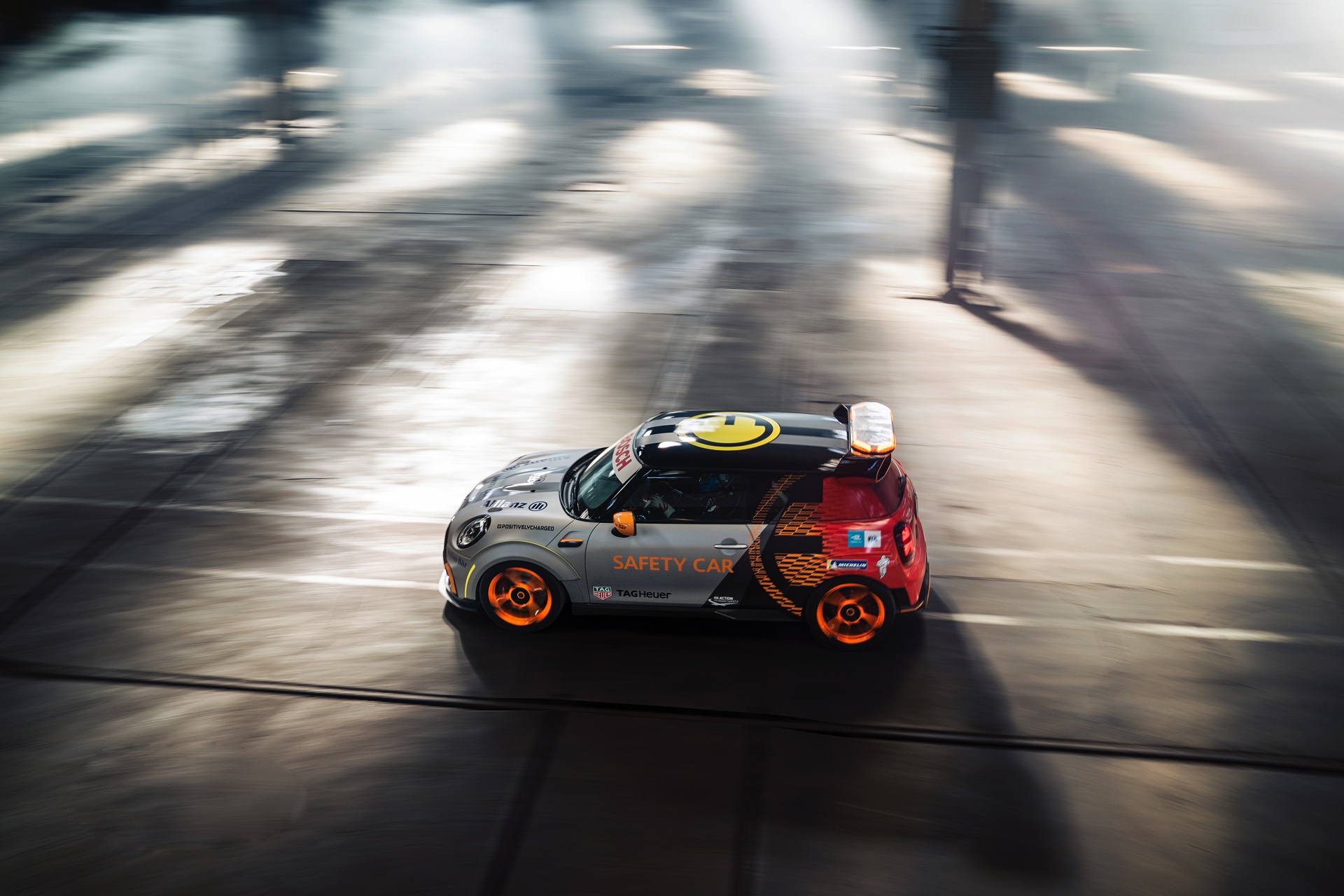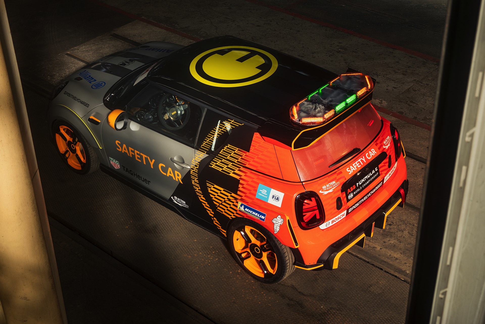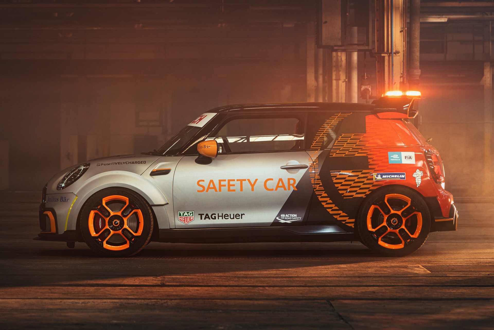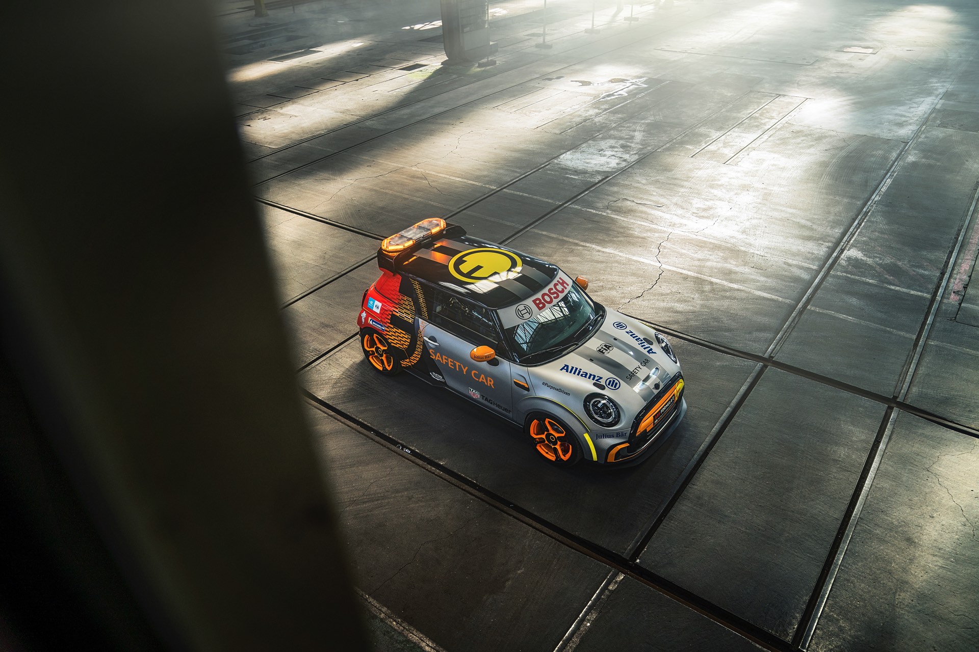 Hinter dem etwas sperrigen Namen verbirgt sich ein tiefgreifend für den Rennstrecken-Einsatz modifizierter MINI Cooper SE, der sich bekanntlich große Teile des Antriebsstrangs mit dem BMW i3s teilt. Für die rasanten Einsätze als Formel E Safety Car 2021 wurden nicht nur der Innenraum komplett ausgeräumt und viele Serien-Elemente durch Carbon-Komponenten ersetzt, auch ein Gewindefahrwerk und eine 4-Kolben-Bremsanlage wurden verbaut. Vor allem hat der Elektro-MINI aber eine an den John Cooper Works GP erinnernde und damit zweifellos Motorsport-taugliche Außenhaut erhalten – an einen braven Saubermann für den emissionsfreien Stadtverkehr erinnert bei diesem Look jedenfalls nichts mehr: