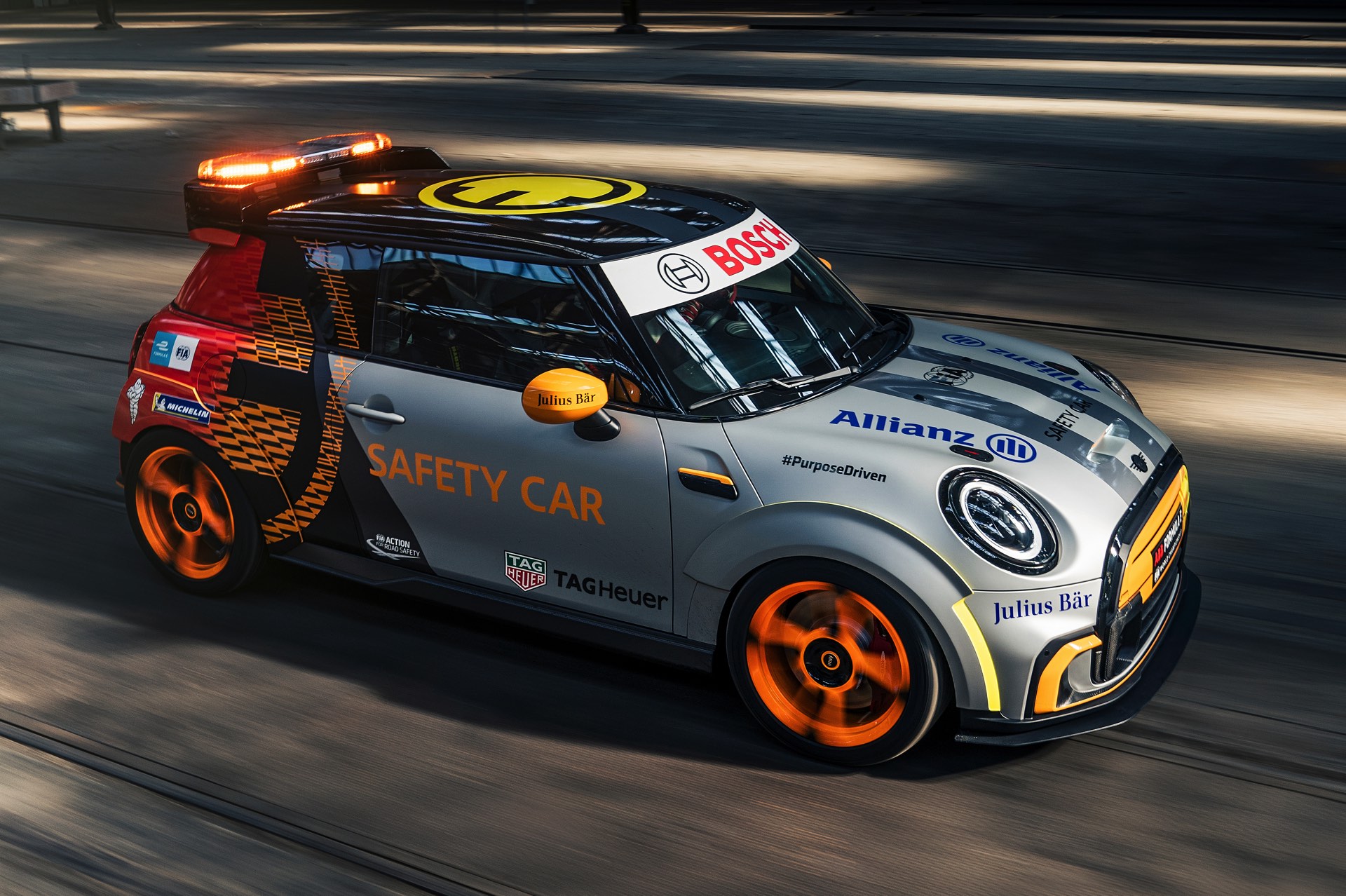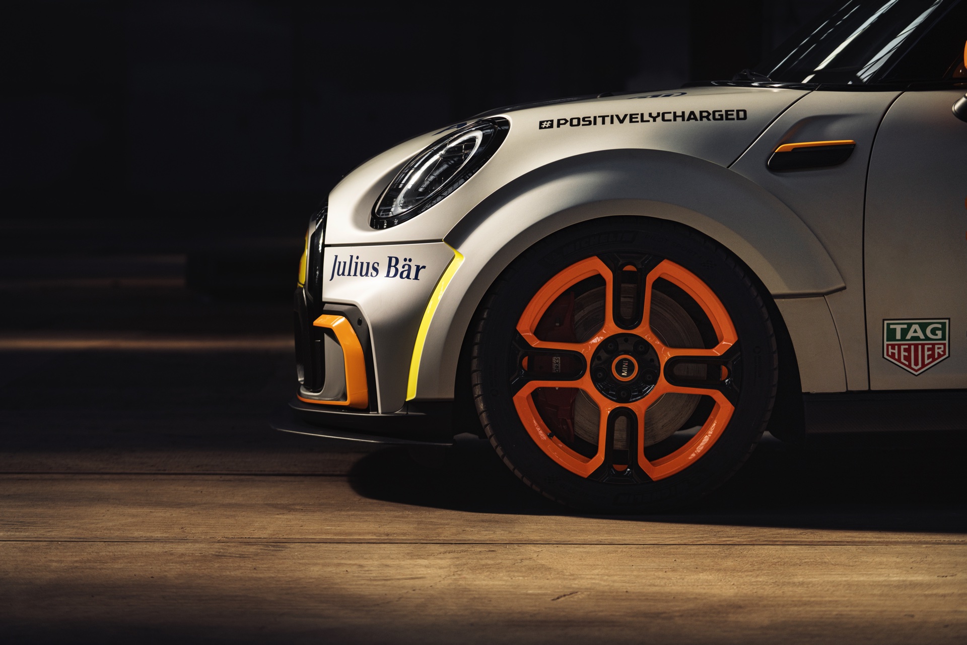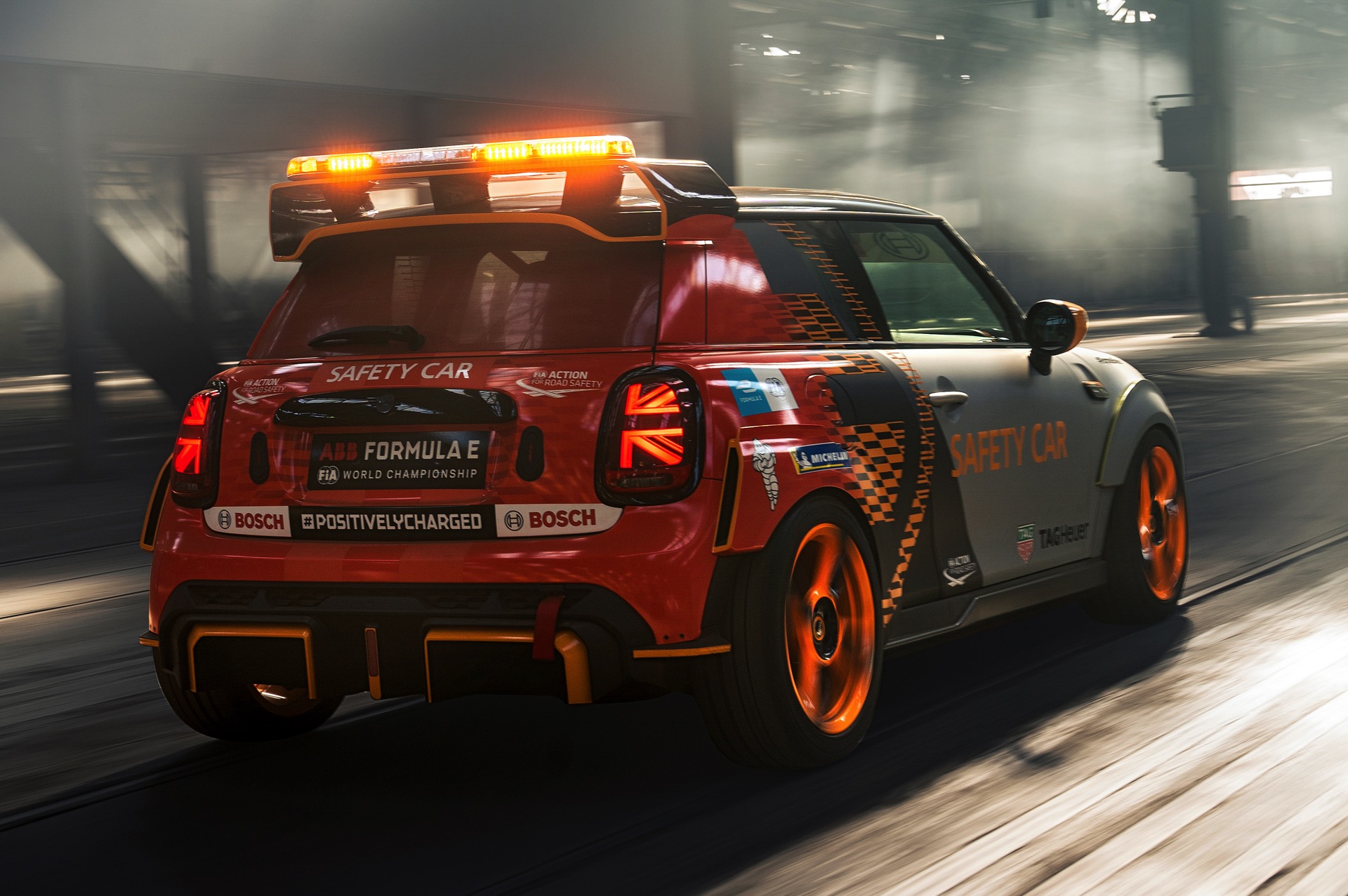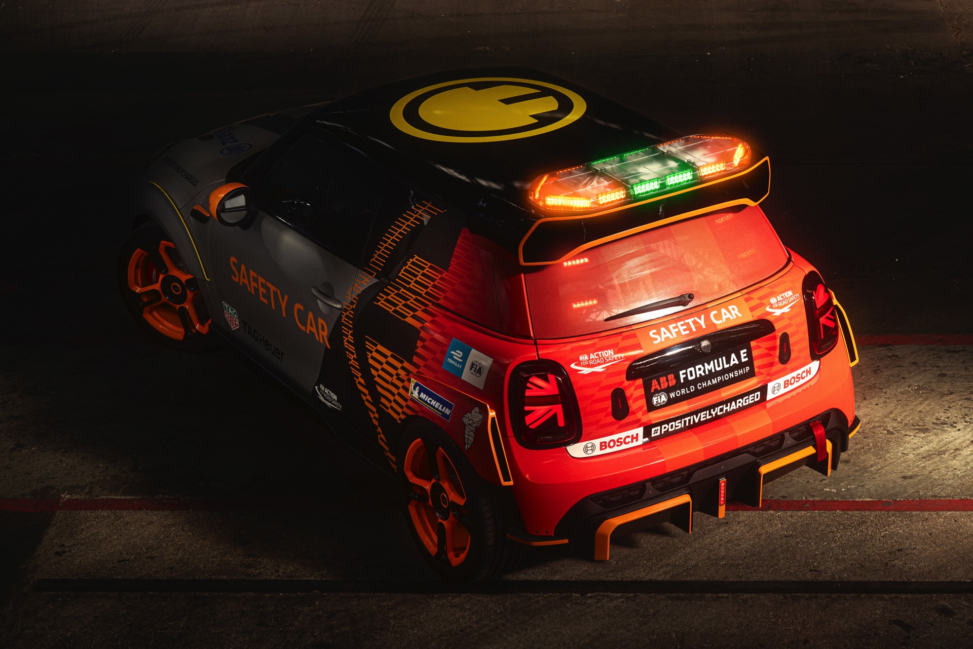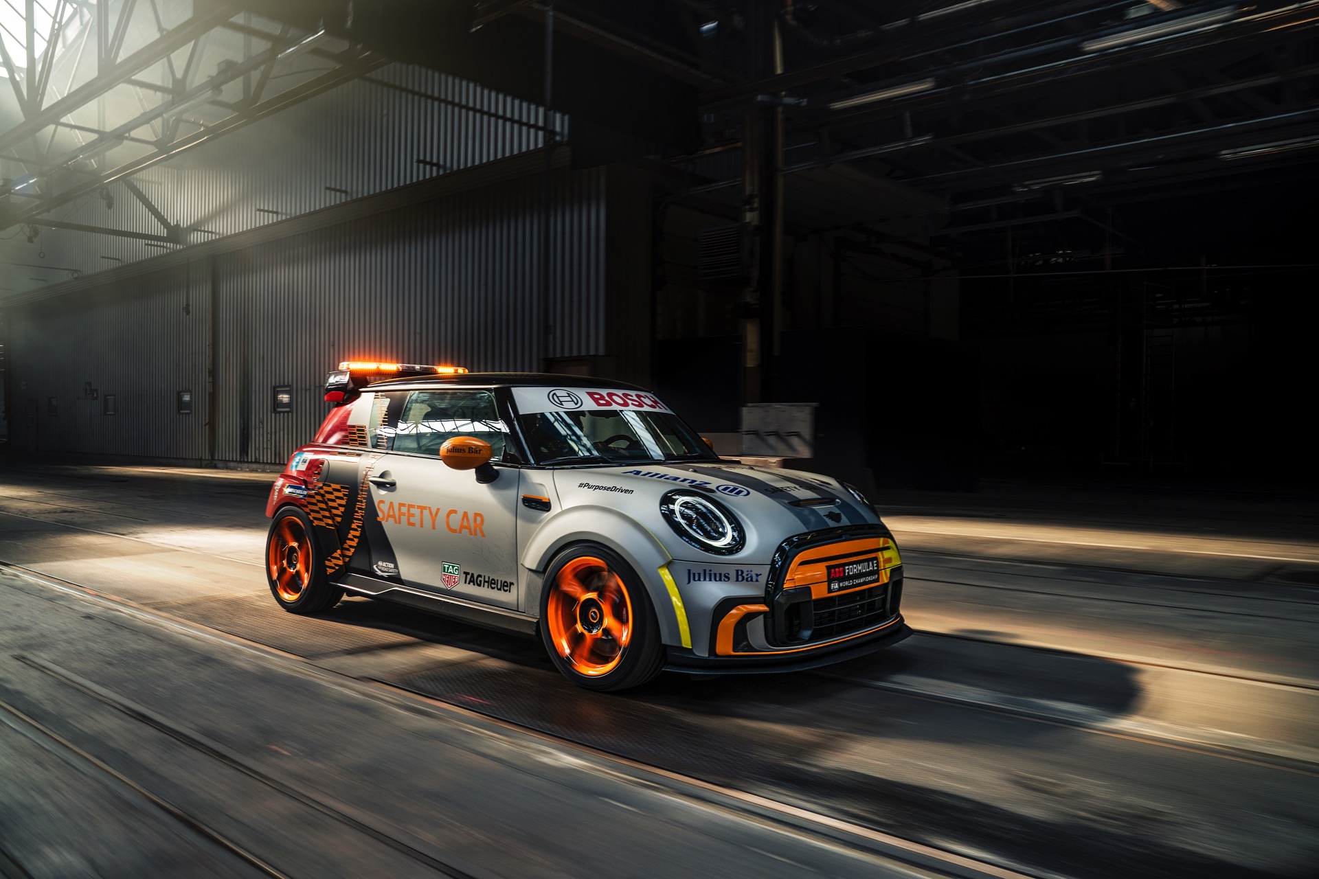 Hinter dem etwas sperrigen Namen verbirgt sich ein tiefgreifend für den Rennstrecken-Einsatz modifizierter MINI Cooper SE, der sich bekanntlich große Teile des Antriebsstrangs mit dem BMW i3s teilt. Für die rasanten Einsätze als Formel E Safety Car 2021 wurden nicht nur der Innenraum komplett ausgeräumt und viele Serien-Elemente durch Carbon-Komponenten ersetzt, auch ein Gewindefahrwerk und eine 4-Kolben-Bremsanlage wurden verbaut. Vor allem hat der Elektro-MINI aber eine an den John Cooper Works GP erinnernde und damit zweifellos Motorsport-taugliche Außenhaut erhalten – an einen braven Saubermann für den emissionsfreien Stadtverkehr erinnert bei diesem Look jedenfalls nichts mehr: