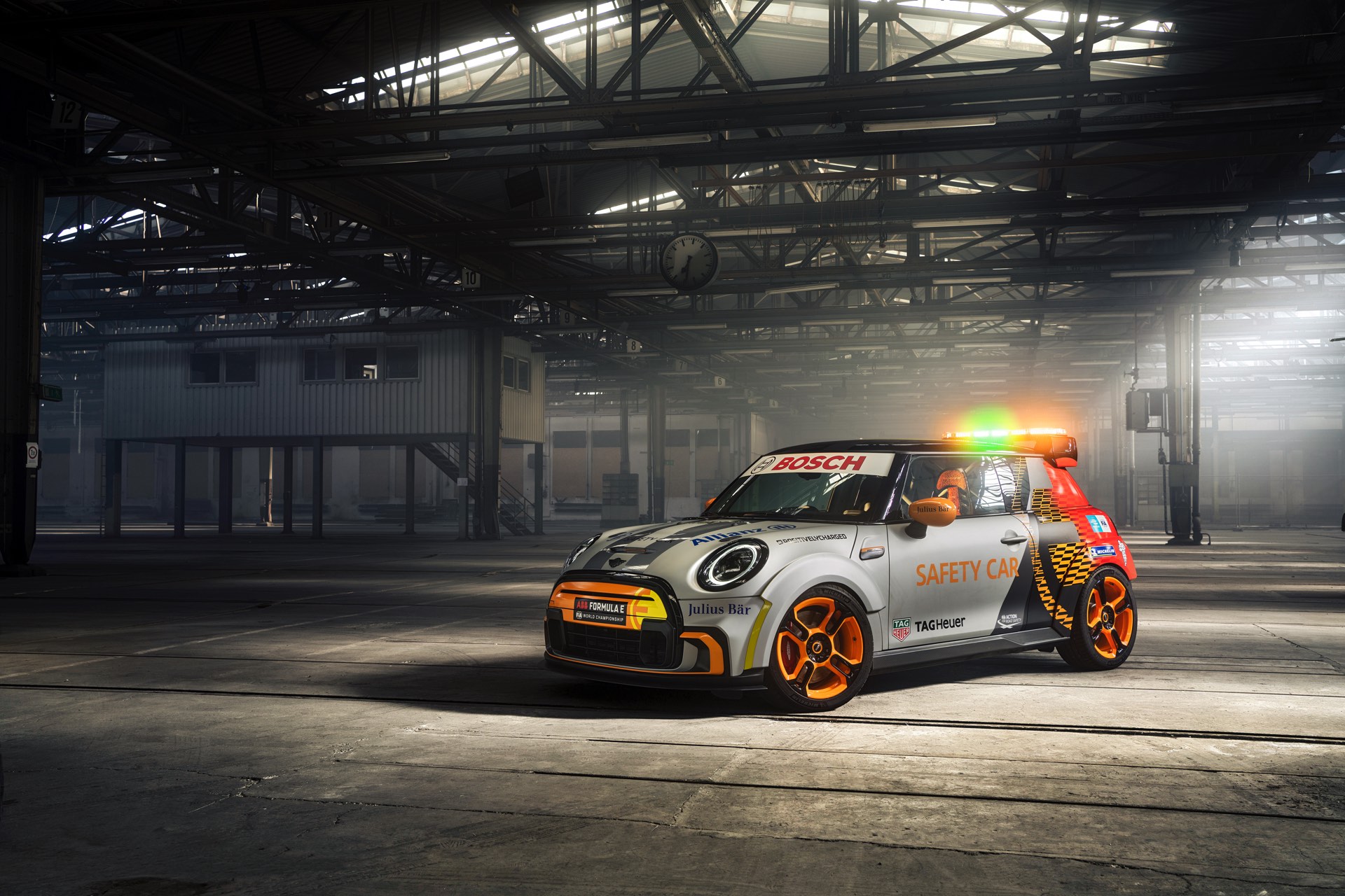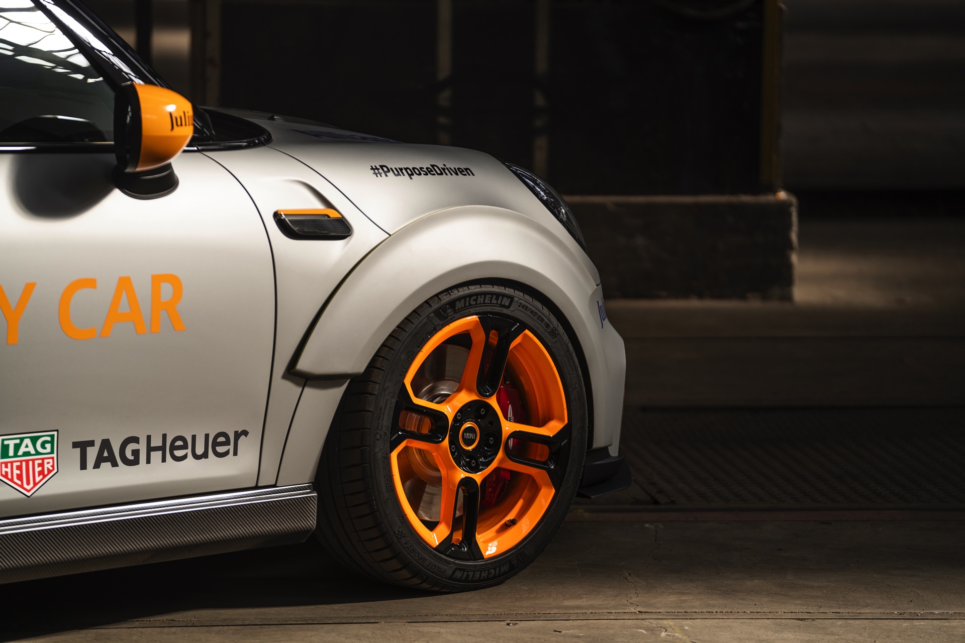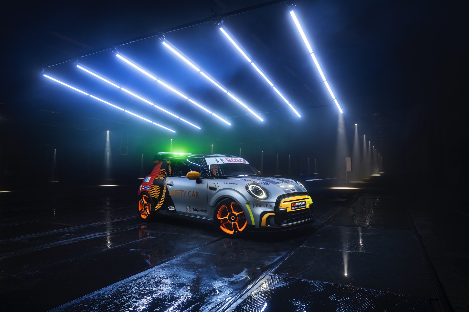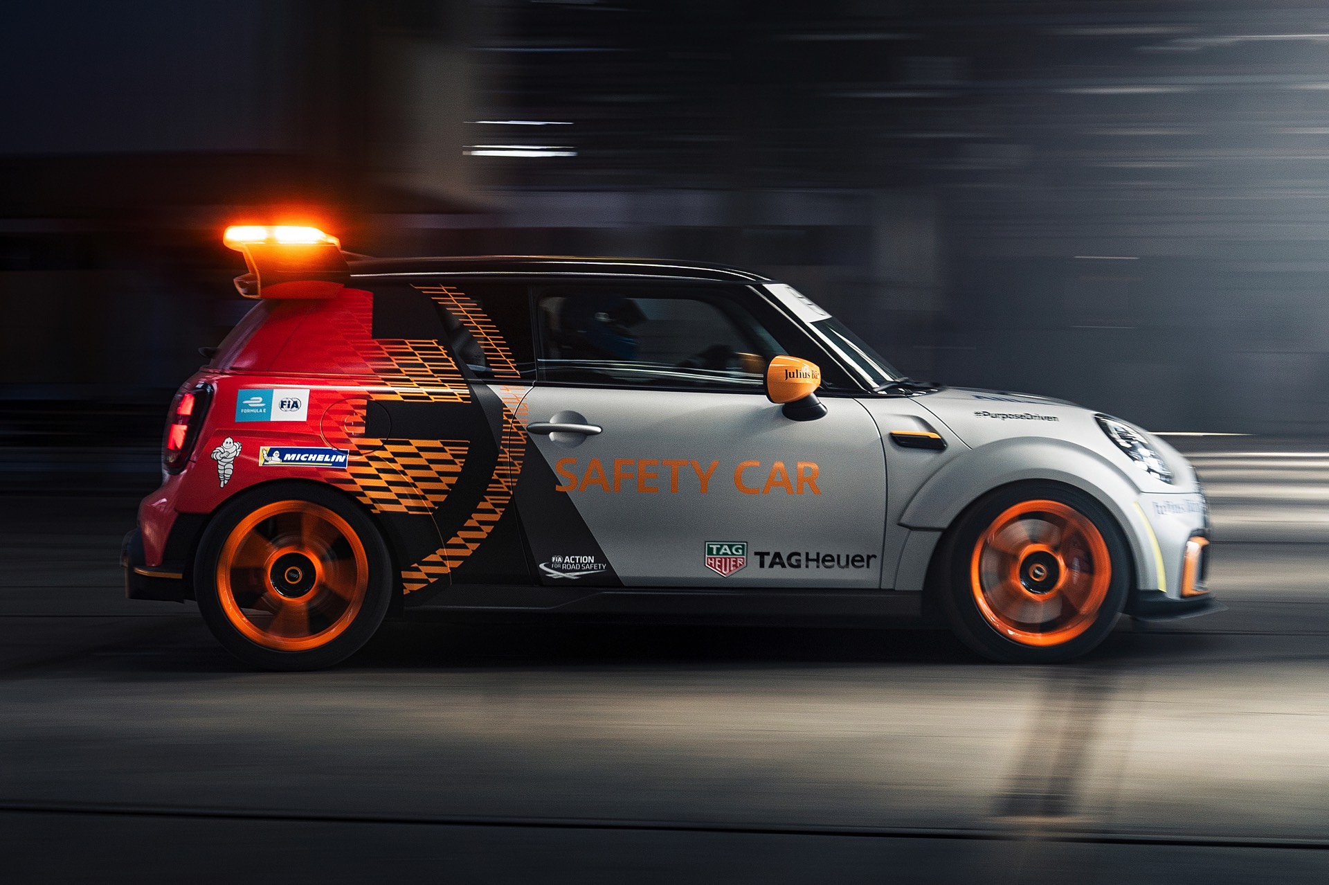 Hinter dem etwas sperrigen Namen verbirgt sich ein tiefgreifend für den Rennstrecken-Einsatz modifizierter MINI Cooper SE, der sich bekanntlich große Teile des Antriebsstrangs mit dem BMW i3s teilt. Für die rasanten Einsätze als Formel E Safety Car 2021 wurden nicht nur der Innenraum komplett ausgeräumt und viele Serien-Elemente durch Carbon-Komponenten ersetzt, auch ein Gewindefahrwerk und eine 4-Kolben-Bremsanlage wurden verbaut. Vor allem hat der Elektro-MINI aber eine an den John Cooper Works GP erinnernde und damit zweifellos Motorsport-taugliche Außenhaut erhalten – an einen braven Saubermann für den emissionsfreien Stadtverkehr erinnert bei diesem Look jedenfalls nichts mehr: