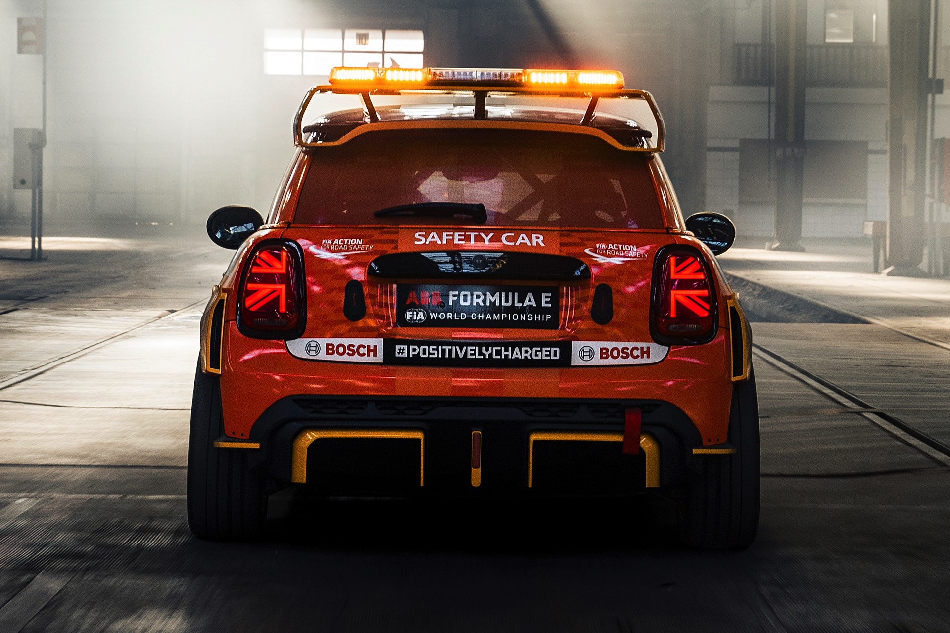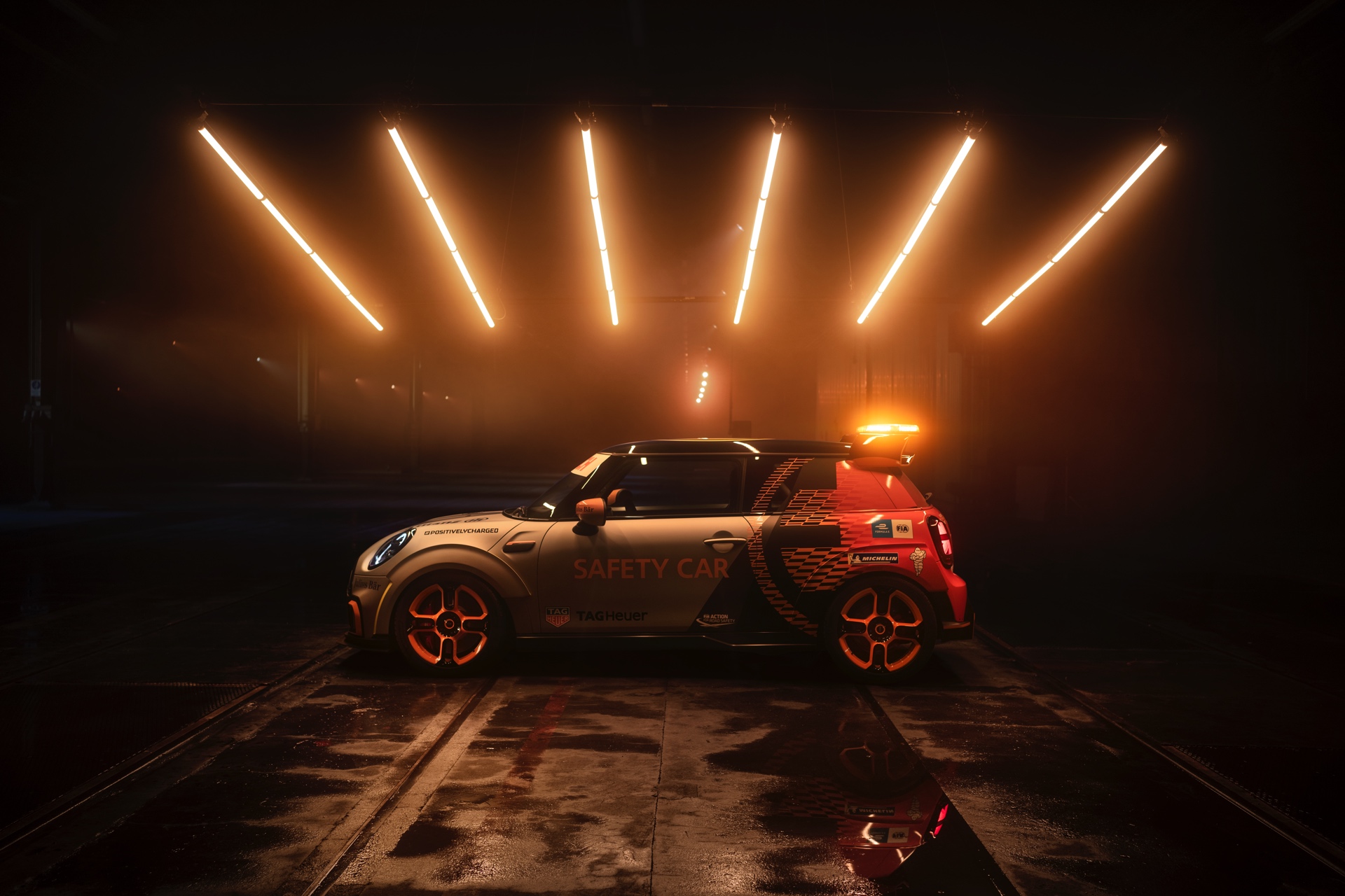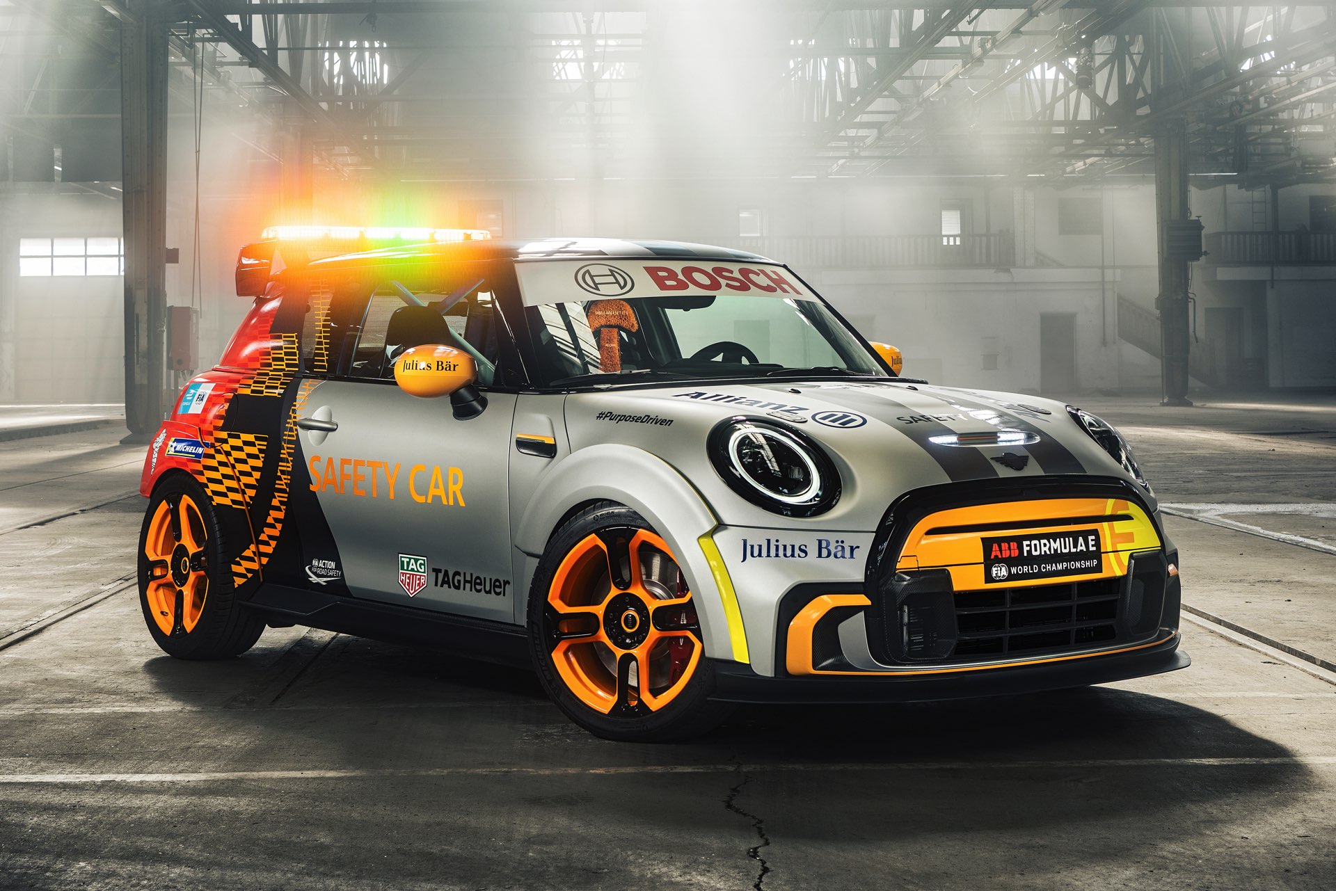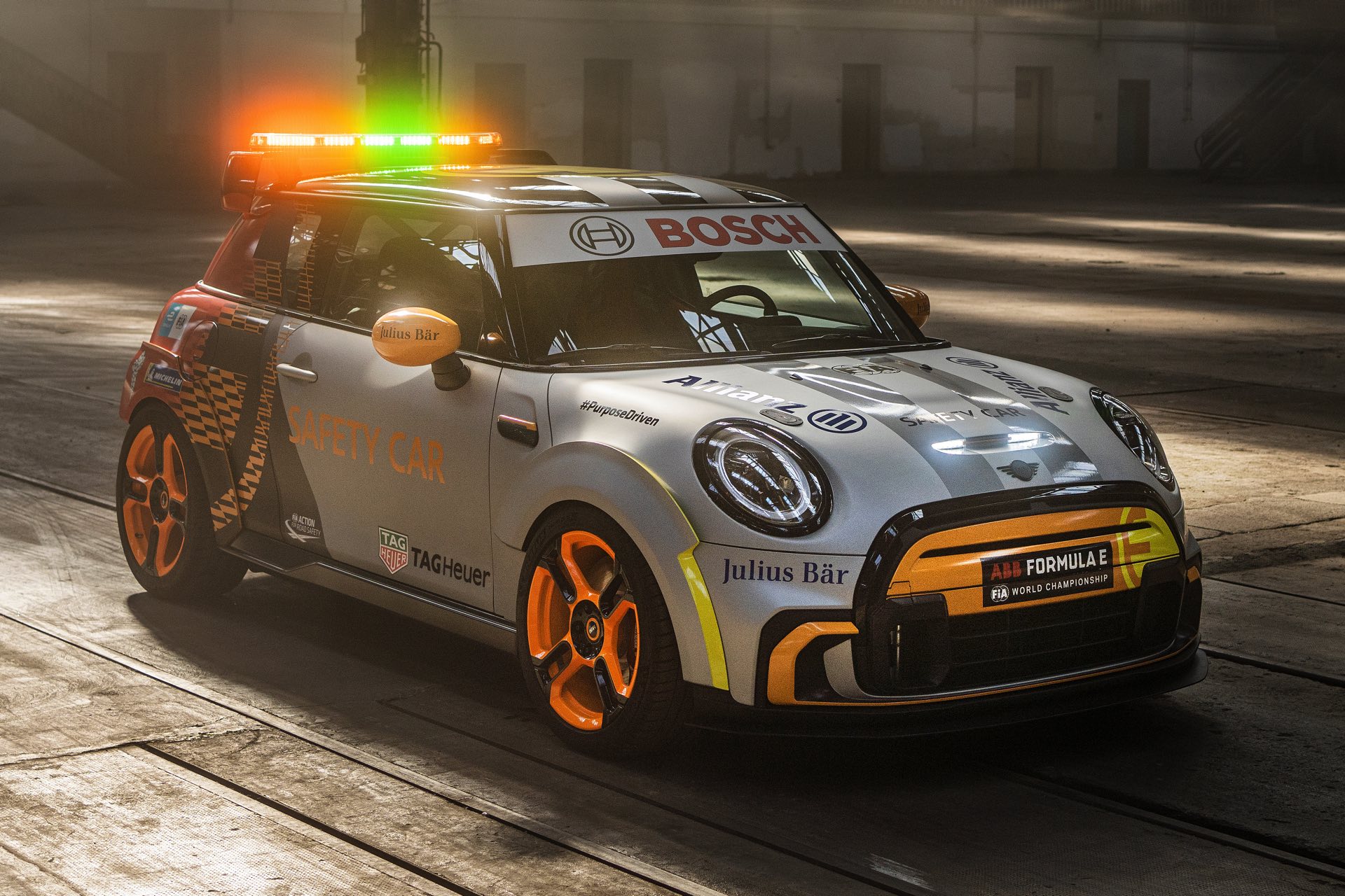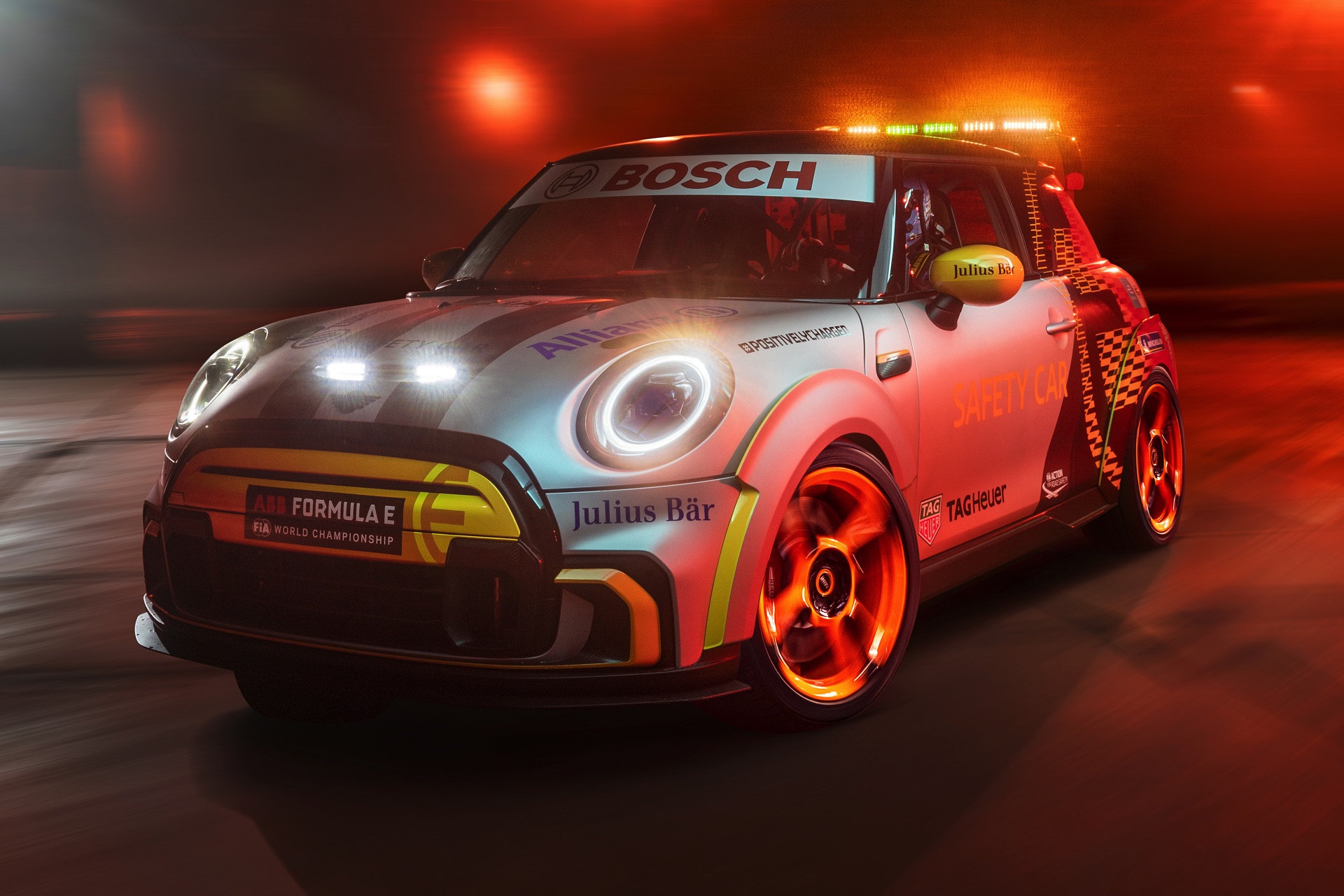 Hinter dem etwas sperrigen Namen verbirgt sich ein tiefgreifend für den Rennstrecken-Einsatz modifizierter MINI Cooper SE, der sich bekanntlich große Teile des Antriebsstrangs mit dem BMW i3s teilt. Für die rasanten Einsätze als Formel E Safety Car 2021 wurden nicht nur der Innenraum komplett ausgeräumt und viele Serien-Elemente durch Carbon-Komponenten ersetzt, auch ein Gewindefahrwerk und eine 4-Kolben-Bremsanlage wurden verbaut. Vor allem hat der Elektro-MINI aber eine an den John Cooper Works GP erinnernde und damit zweifellos Motorsport-taugliche Außenhaut erhalten – an einen braven Saubermann für den emissionsfreien Stadtverkehr erinnert bei diesem Look jedenfalls nichts mehr: