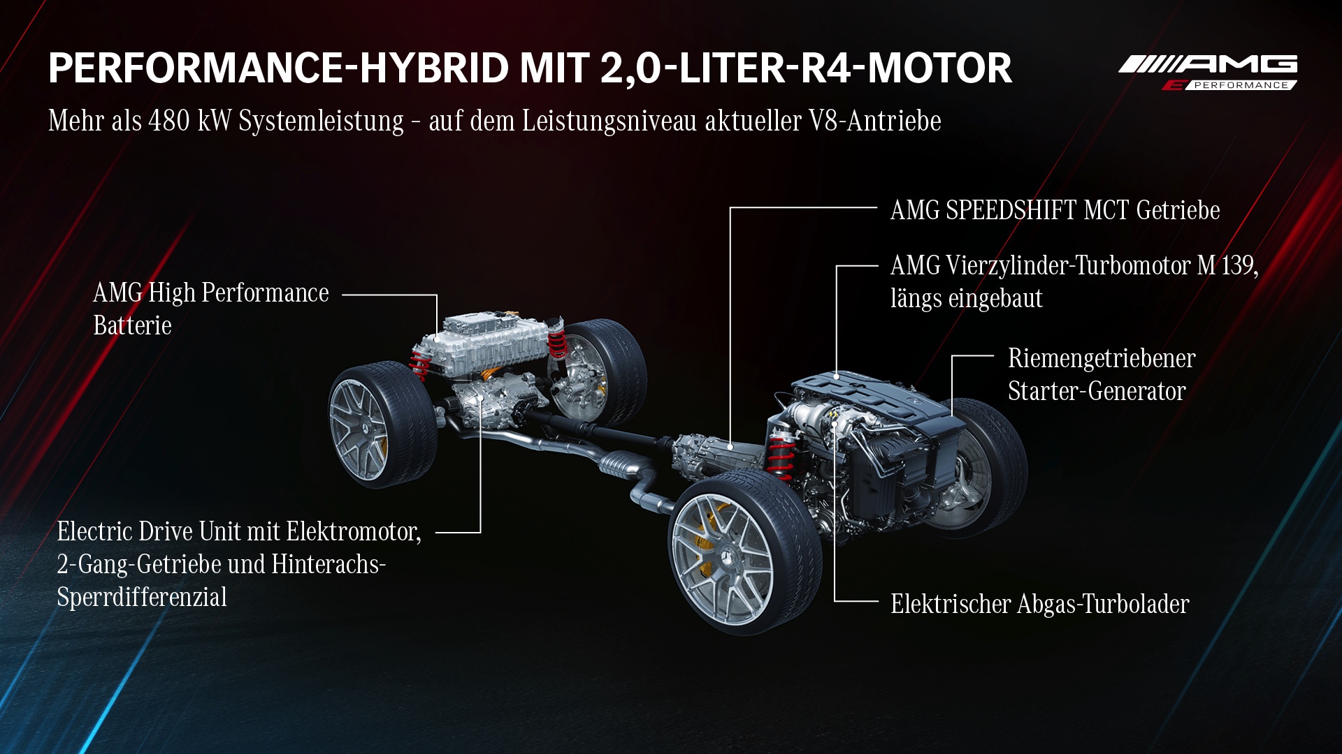 Jochen Hermann (Technischer Geschäftsführer der Mercedes-AMG GmbH): “Mercedes-AMG steht seit jeher für höchste Leistung und maximale Fahrdynamik. Bei der Entwicklung unserer neuen E PERFORMANCE Hybrid-Strategie stand daher von Anfang an fest, dass wir für AMG ein eigenständiges Konzept verfolgen werden. Das Layout mit Verbrennungsmotor vorn und Electric Drive Unit an der Hinterachse bietet zahlreiche Vorteile. Die dadurch optimierte Gewichtsverteilung, die bestmögliche Ausnutzung des Drehmoments oder auch die sehr spontane Leistungsabgabe versprechen Fahrdynamik auf höchstem Niveau. Hinzu kommt die von uns entwickelte High Performance Batterie, die eine doppelte Leistungsdichte im Vergleich zu herkömmlichen Antriebsakkus ausweist und wie viele andere Komponenten von der Technologie aus der Formel 1 inspiriert ist.”