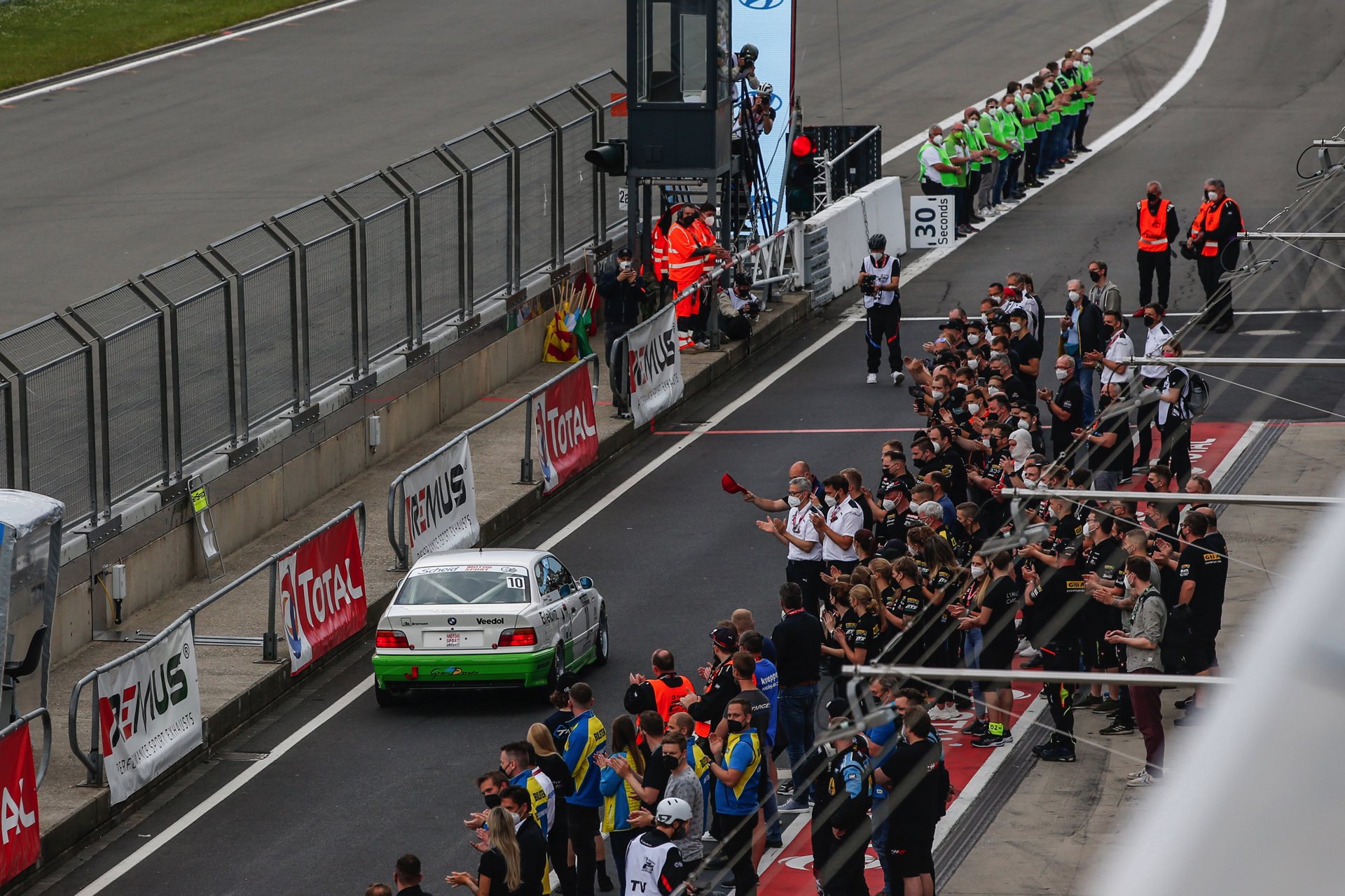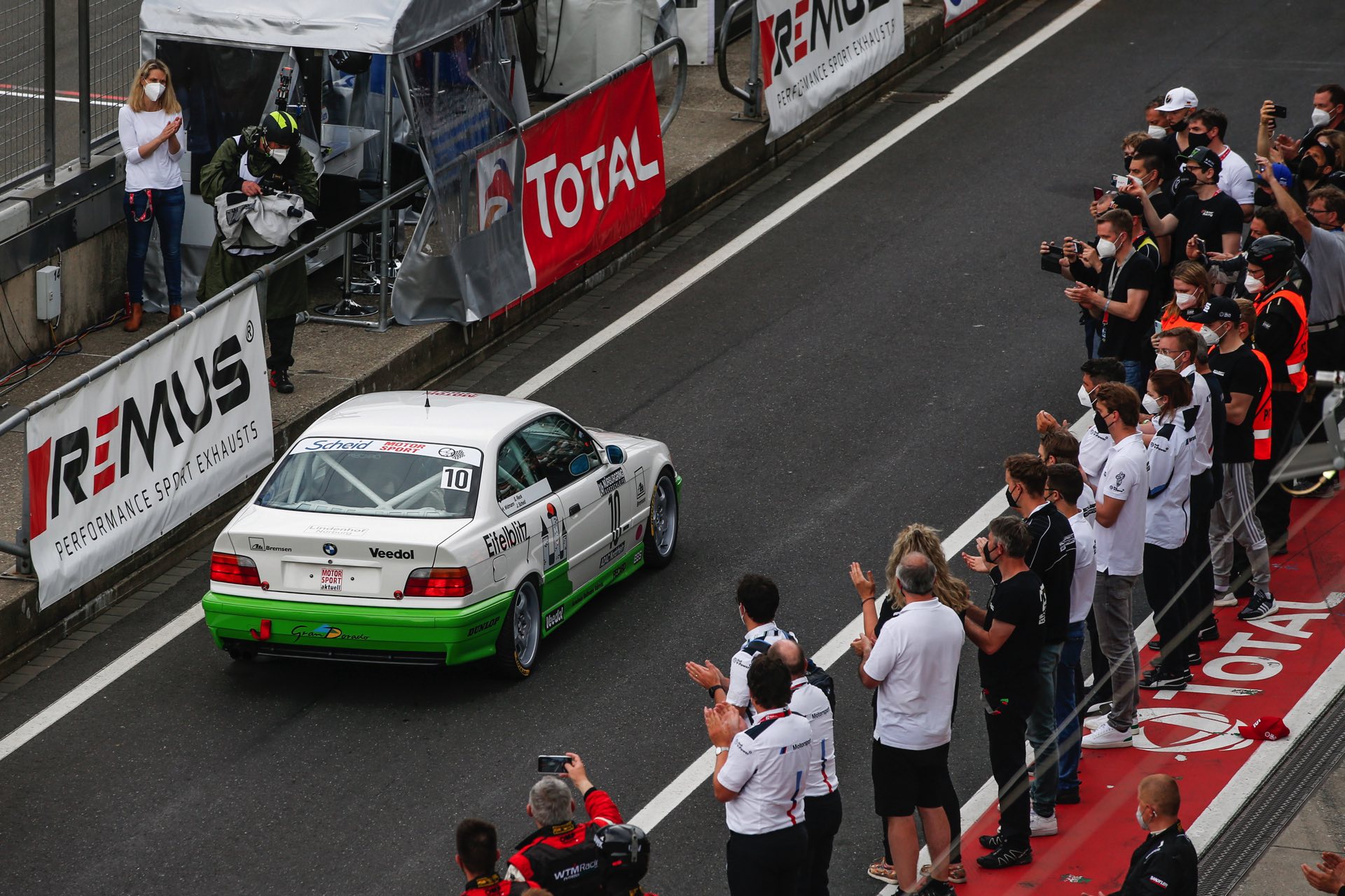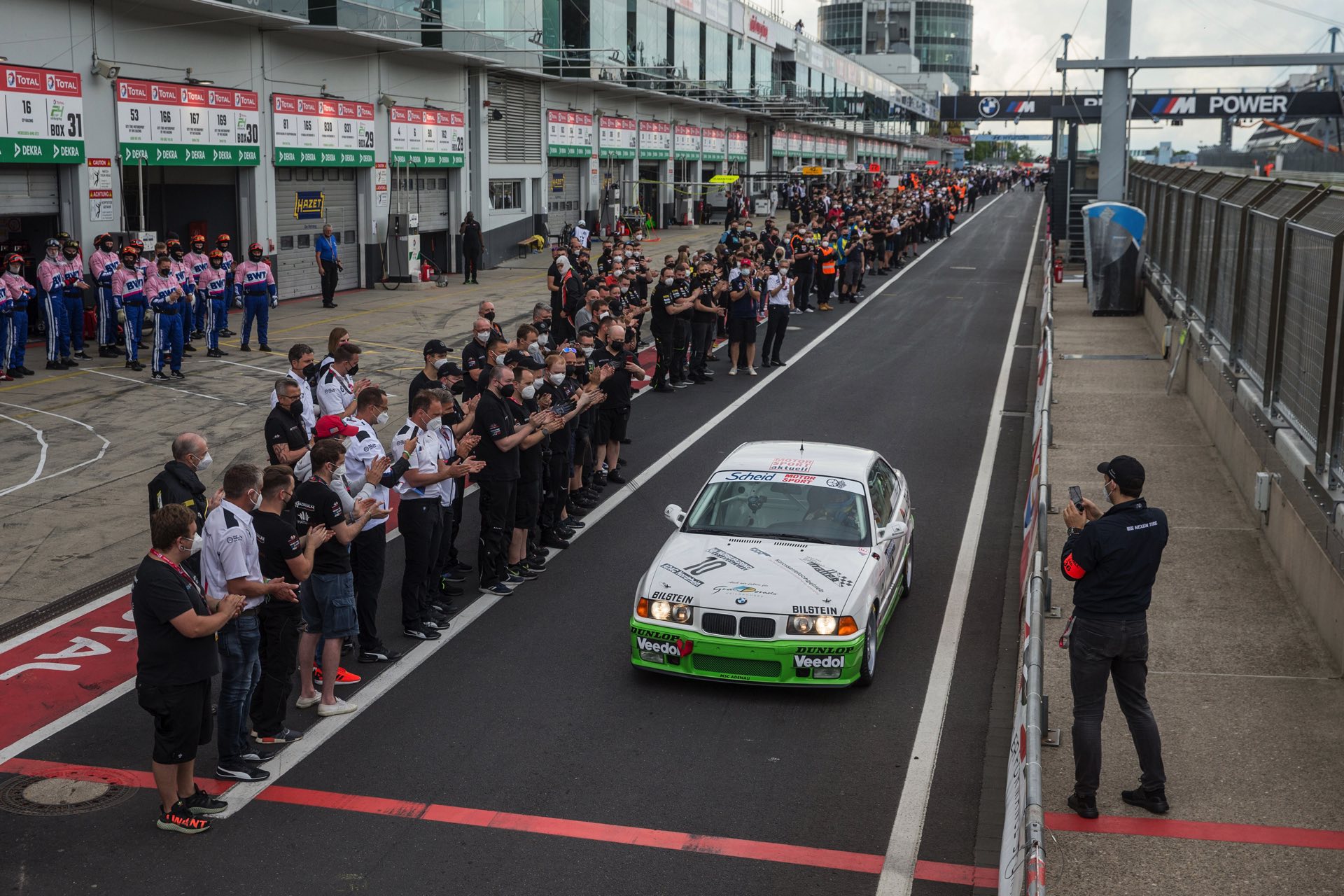 Noch wesentlich mehr Gänsehaut als die Pole Position löste bei unzähligen BMW- und Nürburgring-Fans die Ehrenrunde zum Gedenken an die vor kurzem verstorbene Nordschleifen-Legende Sabine Schmitz aus. Zur Erinnerung an die Gesamtsiegerin von 1996 fuhr ihr damaliger Teamkollege Johannes Scheid mit einer Replika des unvergessenen Eifelblitz eine letzte Abschiedsrunde für die Sympathieträgerin und äußerte sich im Anschluss tief bewegt: „Es war sehr emotional, erst die vielen Menschen in der Boxengasse, und dann überall entlang der Strecke die Streckenposten, die sogar selbst gemachte Transparente dabeihatten. Ich habe zu Sabine gesagt: ‚Die sind alle für dich da‘. Es war sehr berührend. Es läuft mir immer noch kalt den Rücken herunter. Das waren wir ihr schuldig, und ich finde es so klasse, dass BMW das möglich gemacht hat.“