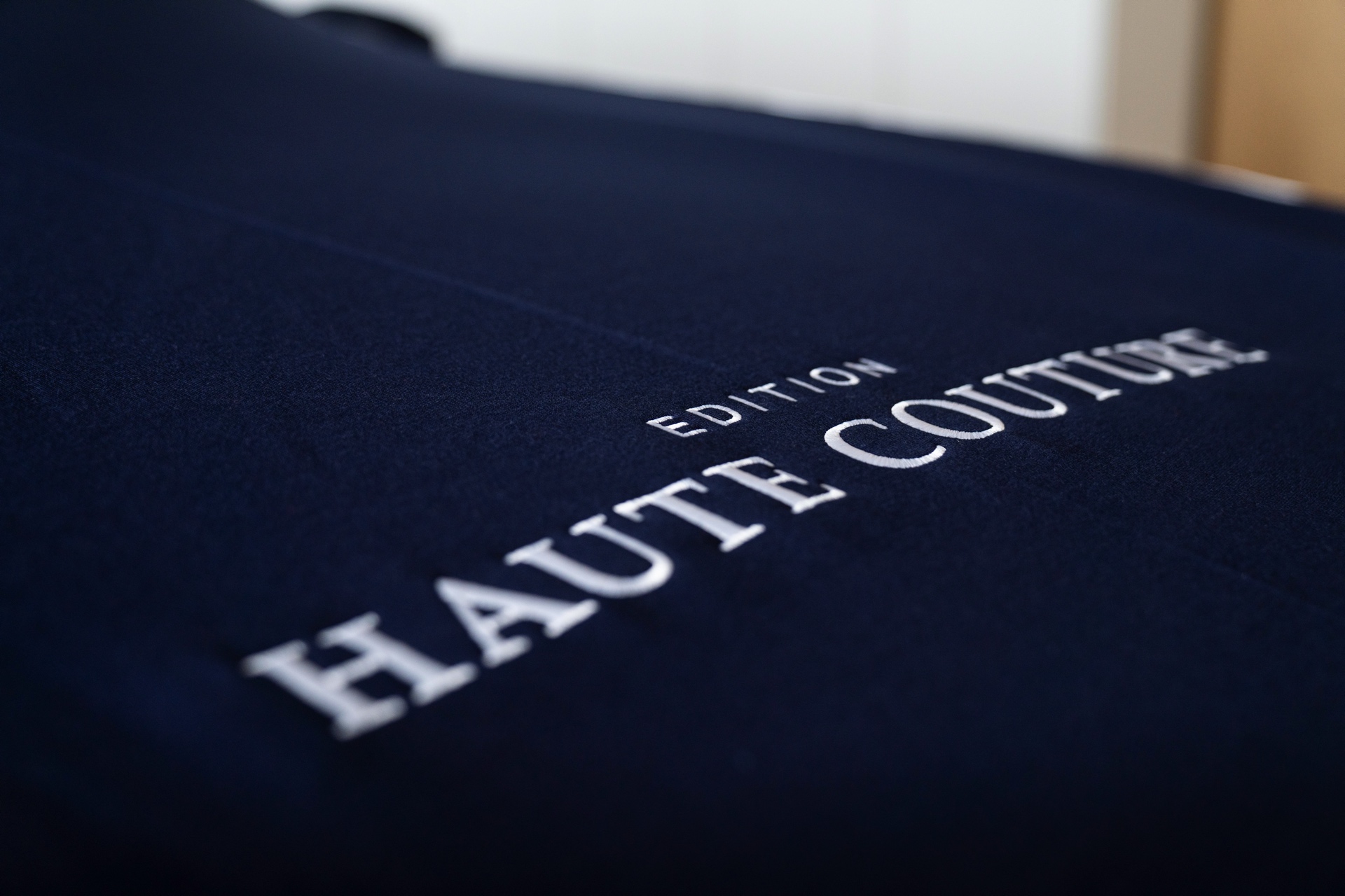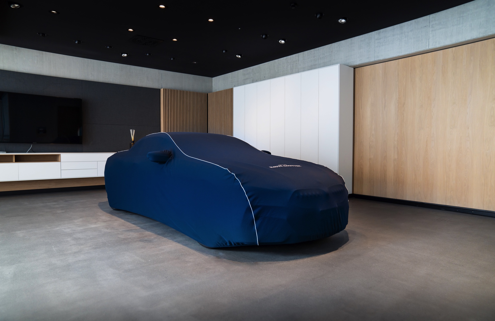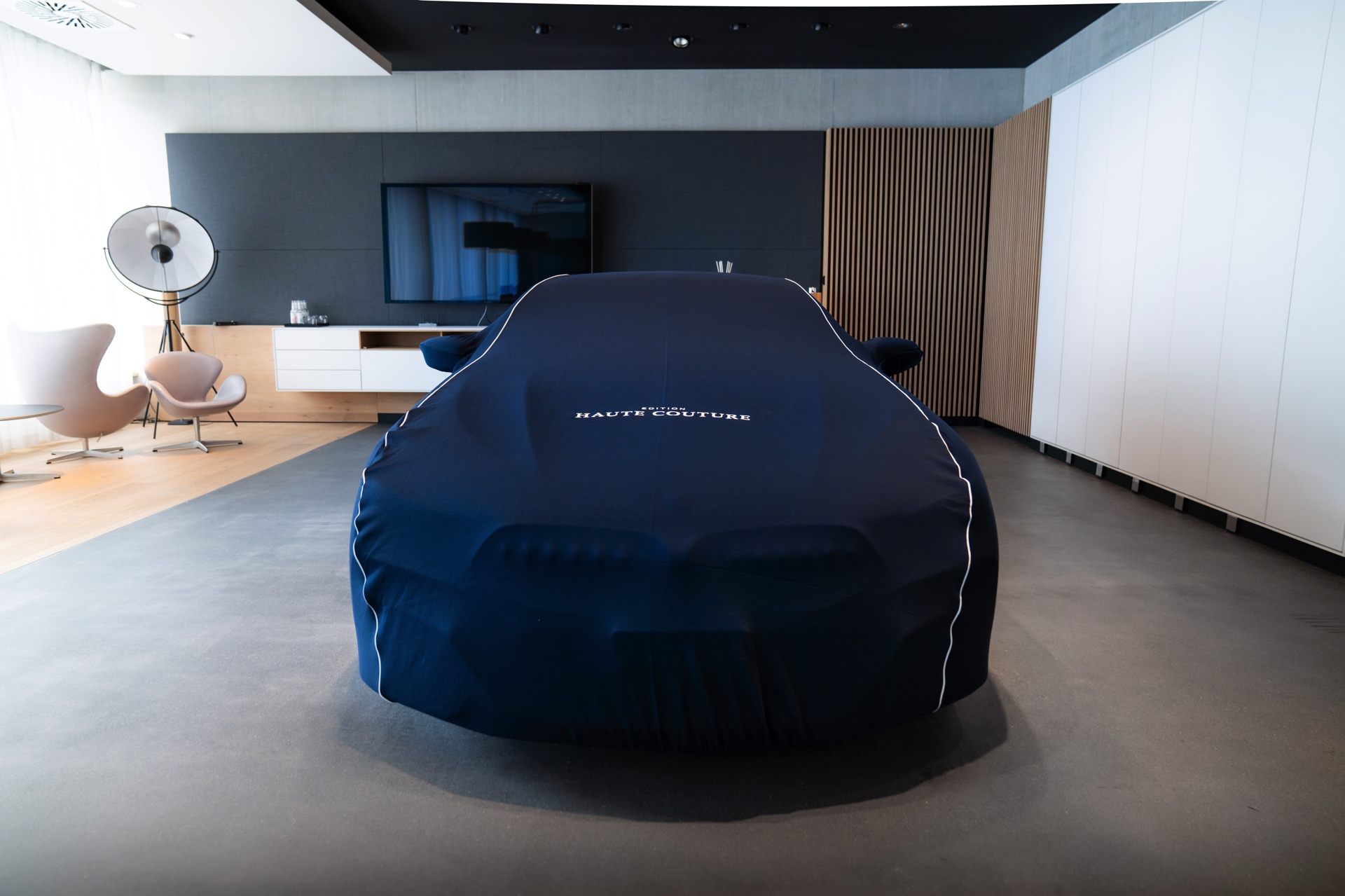 Nach der wahlweise ganz entspannten oder auch mal sehr rasanten Fahrt kann das BMW 8er Cabrio unter einer massgeschneiderten Fahrzeugabdeckung auf den nächsten Einsatz warten. Je nach Verdeckfarbe ist auch diese Abdeckung in Blau, Rot oder Braun gehalten. Eine eingestickte Sonderbeschriftung weist dabei ein letztes Mal auf die Edition «Haute Couture» hin.