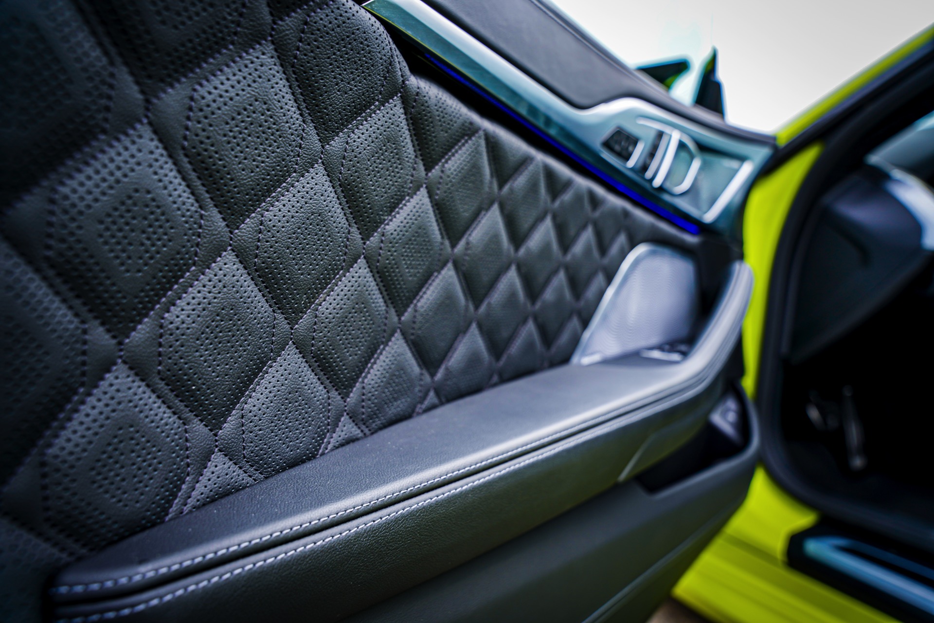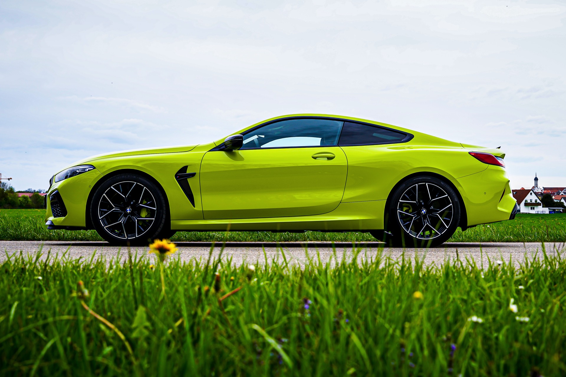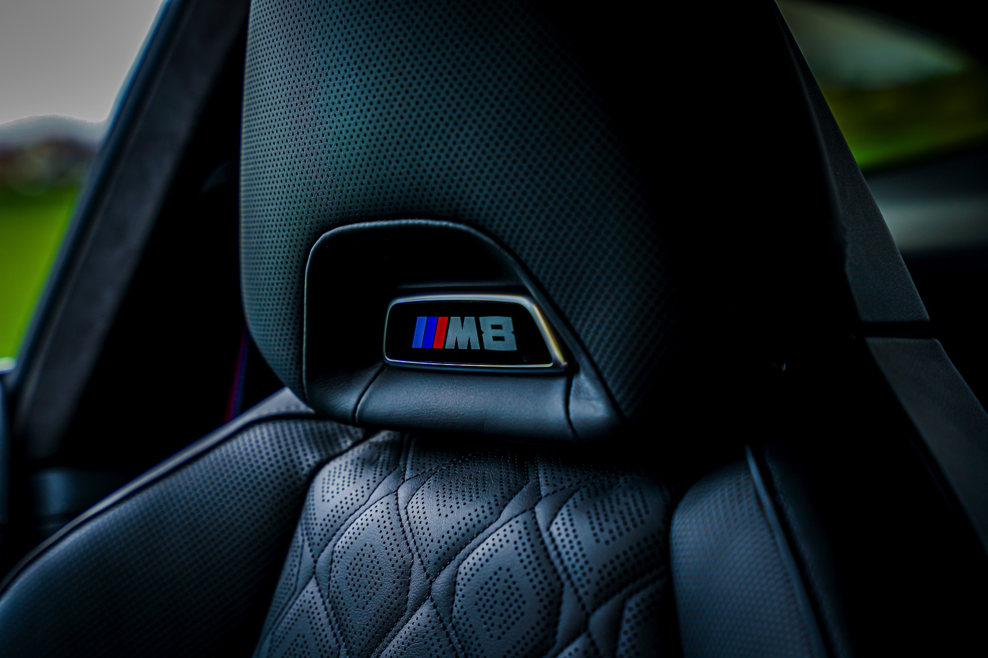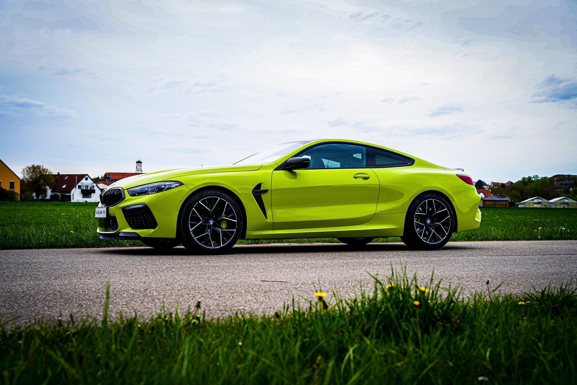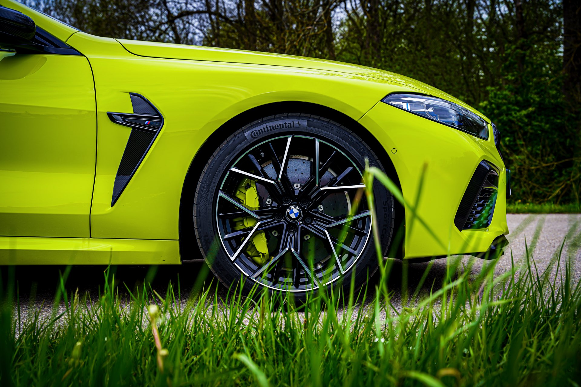 Starke Akzente zum auffälligen Lichtgrün setzen die serienmäßigen dunklen Details des BMW M8 Competititon: Angefangen von der Niere in Hochglanz-Schwarz über die Außenspiegel und Kiemen bis hin zu Carbon-Dach und Heckspoiler-Lippe gibt es aus praktisch jedem Blickwinkel auch etwas dunkle Abwechslung zur hellen Lackierung. Komplettiert wird der Bicolor-Auftritt mit den 20 Zoll großen Leichtmetallrädern im Design Sternspeiche 811M schwarz glanzgedreht.
