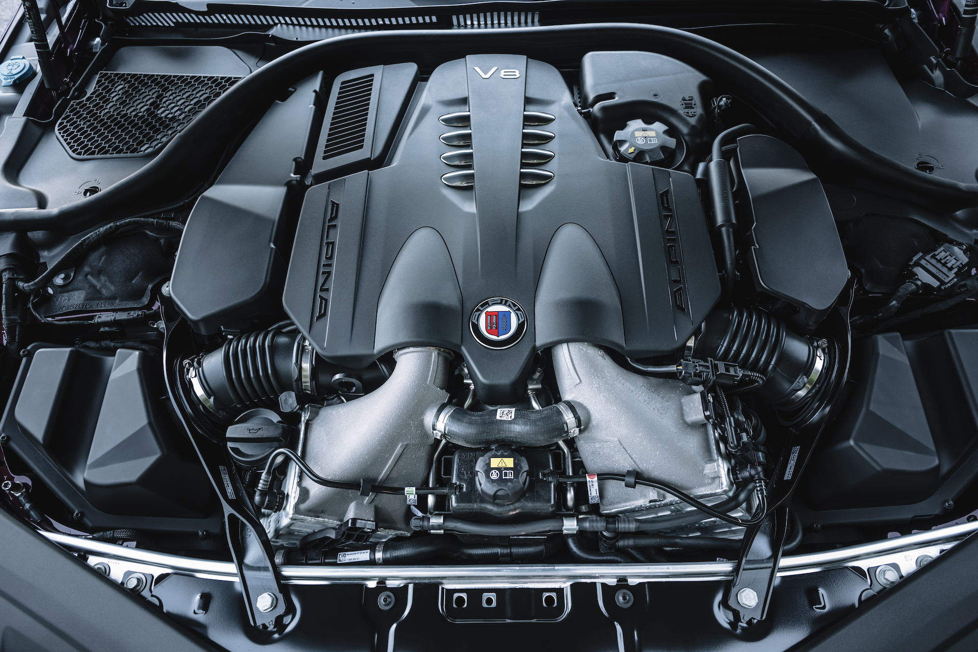Nach 3,4 Sekunden fällt Tempo 100, die 200 km/h sind nach 11,6 Sekunden Vergangenheit. Der beachtlichen Belastung wird das aus Alpina B5 und Co. bekannte Triebwerk durch angepasste Ladeluftkühler mit gut 50 Prozent zusätzlicher Kühlfläche im Vergleich zum BMW gerecht. Der modifizierte Allradantrieb mit verstärkter Gelenkwelle und die angepasste Achtgang-Sport-Automatik von ZF tun ihr Übriges für die fulminante Leistungsentfaltung. Je nach Fahrmodus wechselt das gewohnt brillante Getriebe die Gänge in 100 Millisekunden – und je nach Zeitplan des Fahrers beschleunigt der B8 unbegrenzt bis auf 324 km/h.