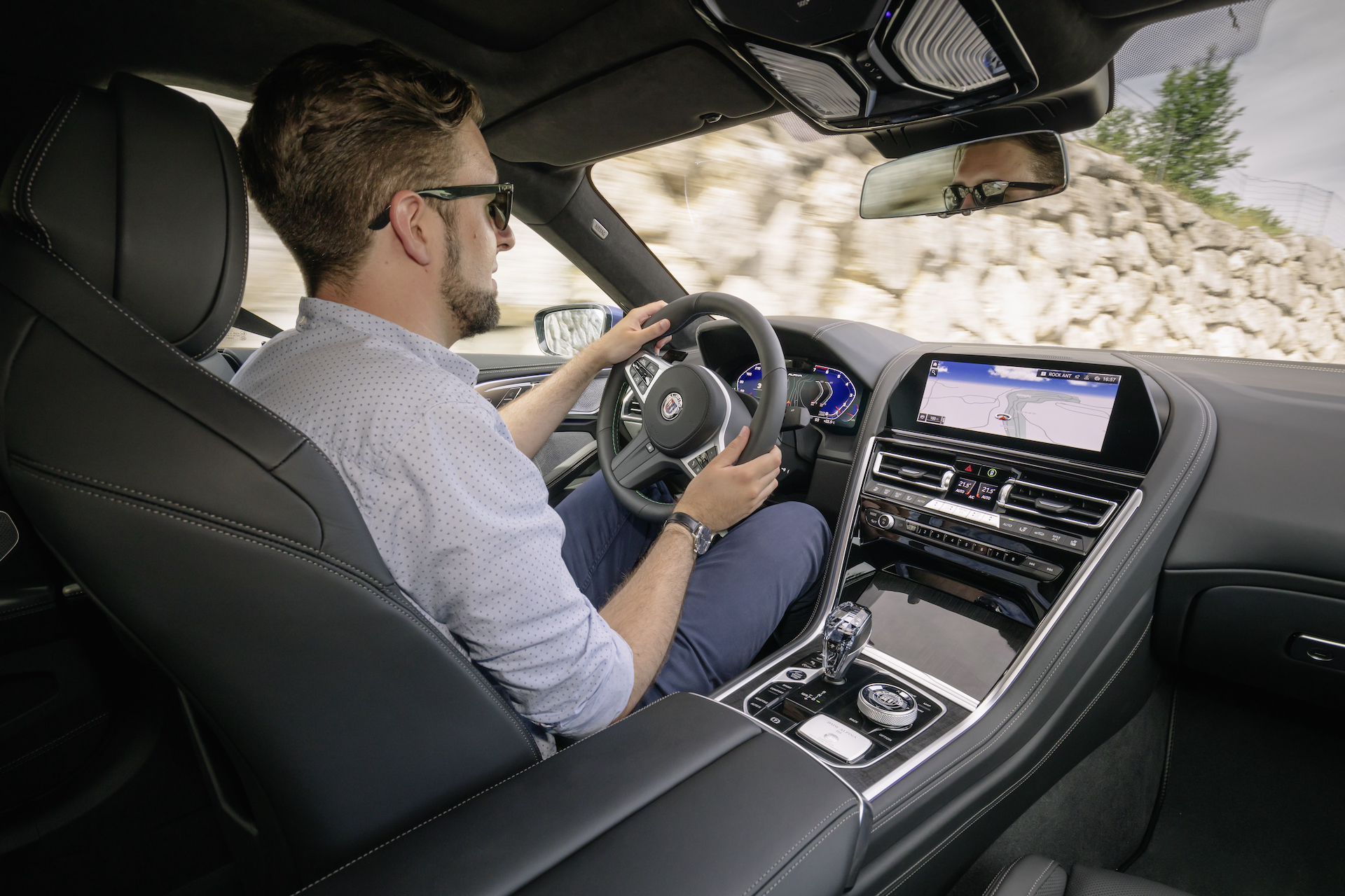 Während wir noch das mit Alpina Edelleder Lavalina bezogene Lenkrad in die passende Position bringen, setzt sich das Pacecar vor uns in Bewegung. Nur Augenblicke später überlassen wir dem mächtigen 4,4-Liter-V8-Biturbo und seinen 621 PS die Definition von Zeit und Raum. Sport Plus: Energisch schnellt die digitale Nadel in Richtung Drehmomentplateau, volle 800 Newtonmeter zerren zwischen 2.000 und 5.000 Umdrehungen an den vier Rädern.