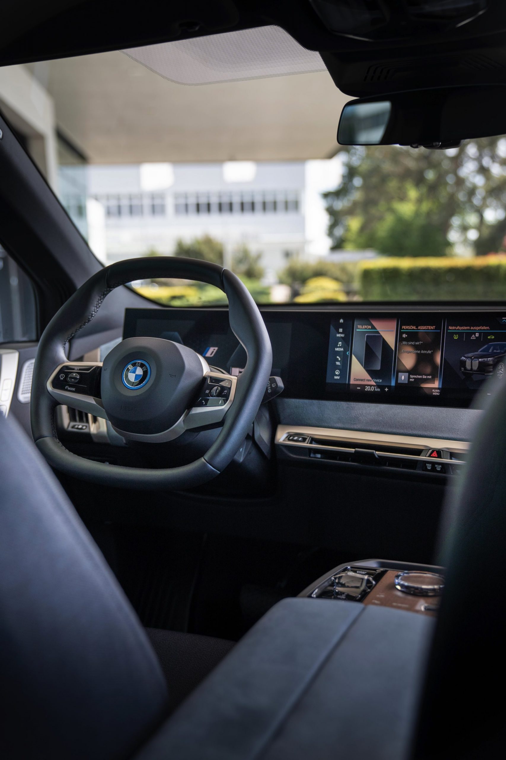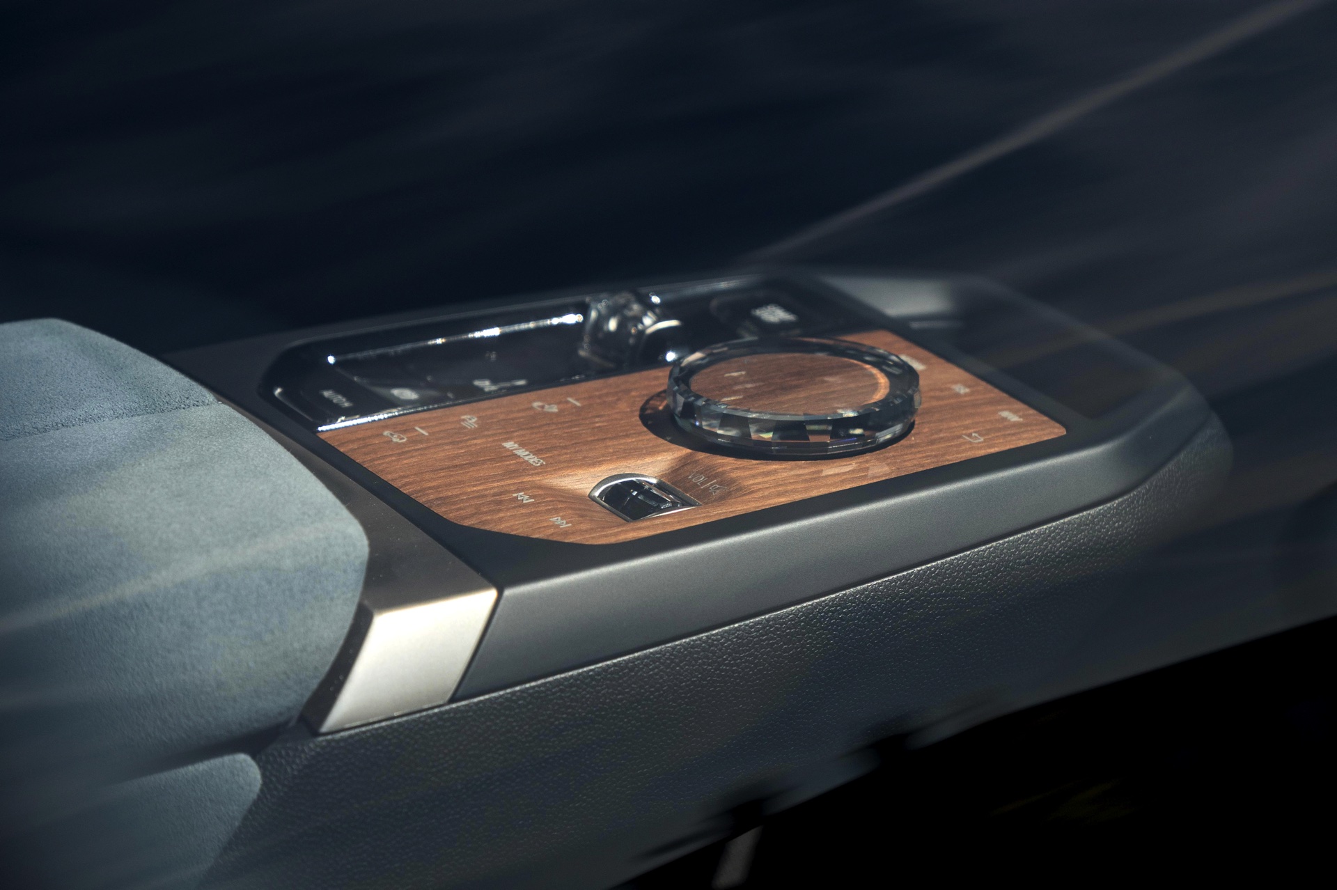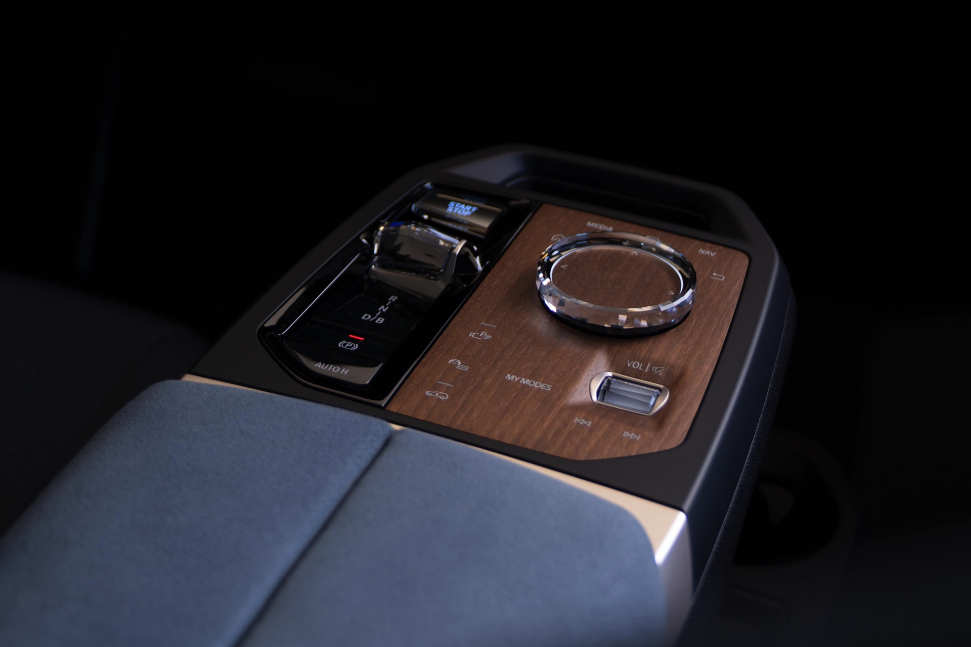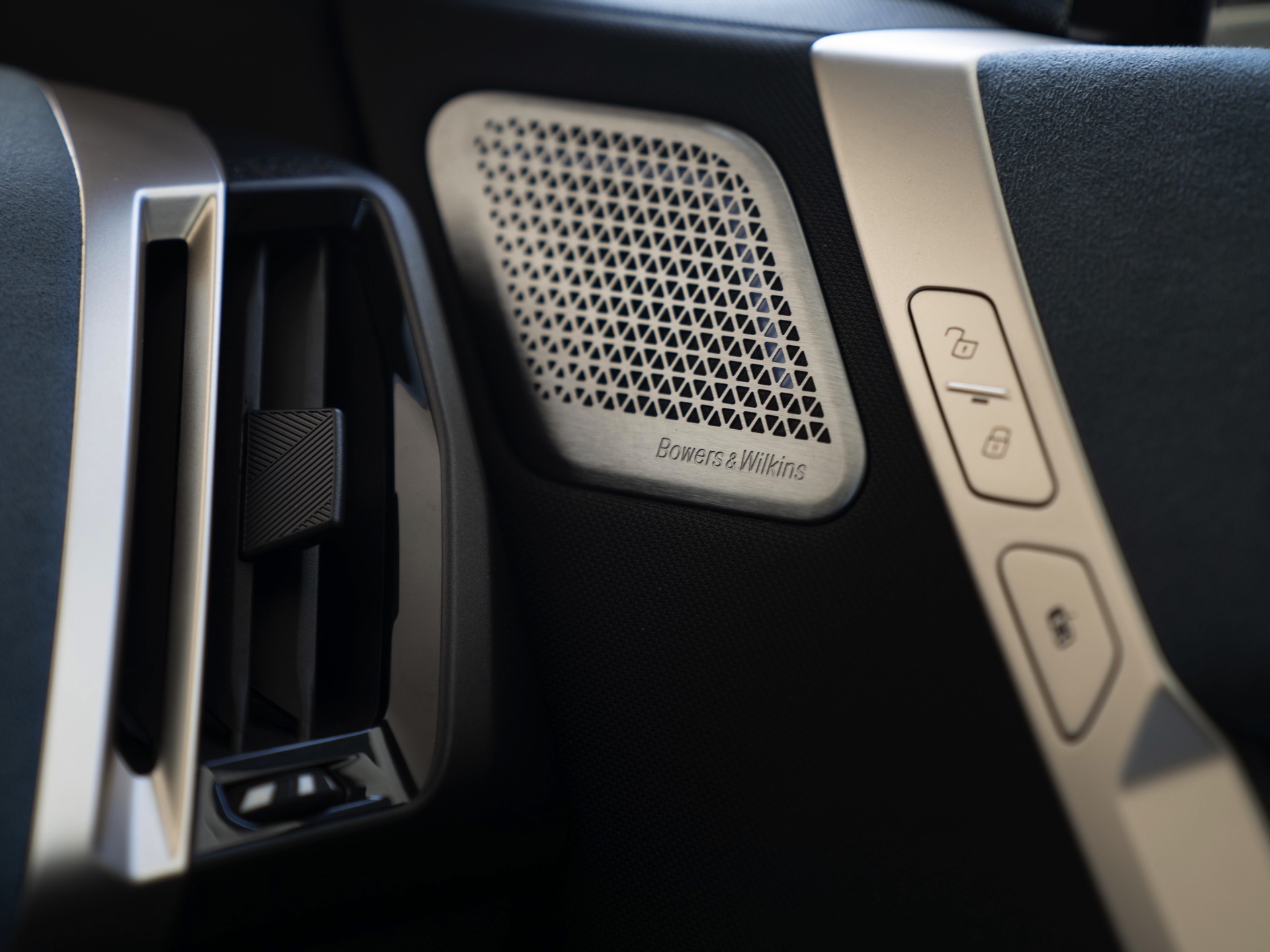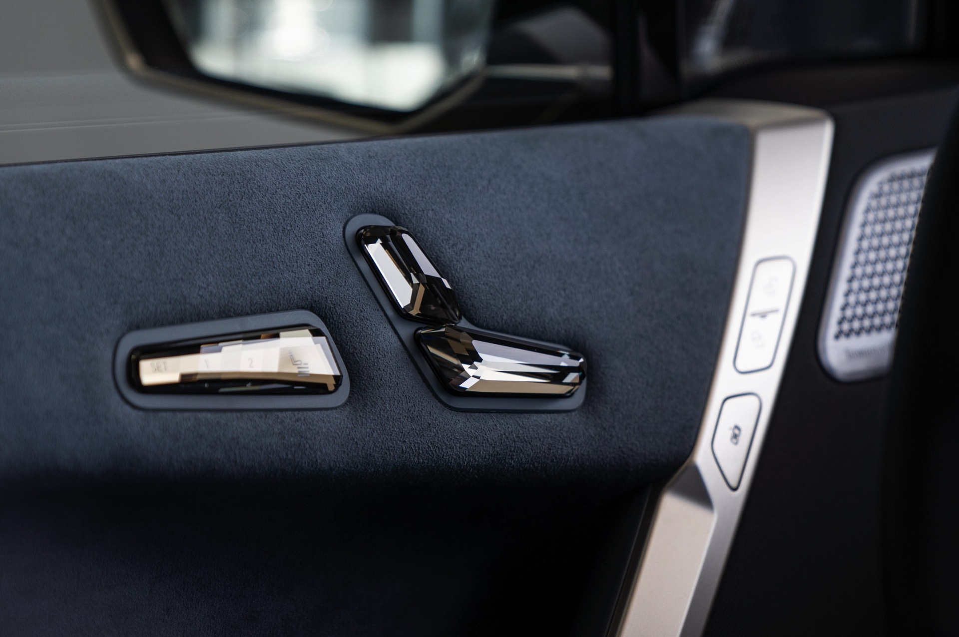 Wesentlich freundlicher und heller zeigt sich die Farbgestaltung im Innenraum des BMW iX: Das Interieurdesign Loft Stonegrey und die Interieur-Applikationen Clear&Bold sorgen gemeinsam für eine edle und hochwertige Atmosphäre. Mit dem Clear & Bold-Paket erhält der BMW iX Schalter und Bedienelemente aus echtem Kristallglas, Zierelemente aus offenporigem, FSC-zertifizierten Holz sowie Filigrane Rahmen in Goldbronze. Weitgehend unsichtbar bleiben hingegen die zusammen 1.615 Watt leistenden 30 Lautsprecher des Bowers & Wilkins Diamond Surround Sound Systems, denn sie sind hinter dem Stoff der Verkleidungen verborgen und drängen sich nur akustisch in den Vordergrund.