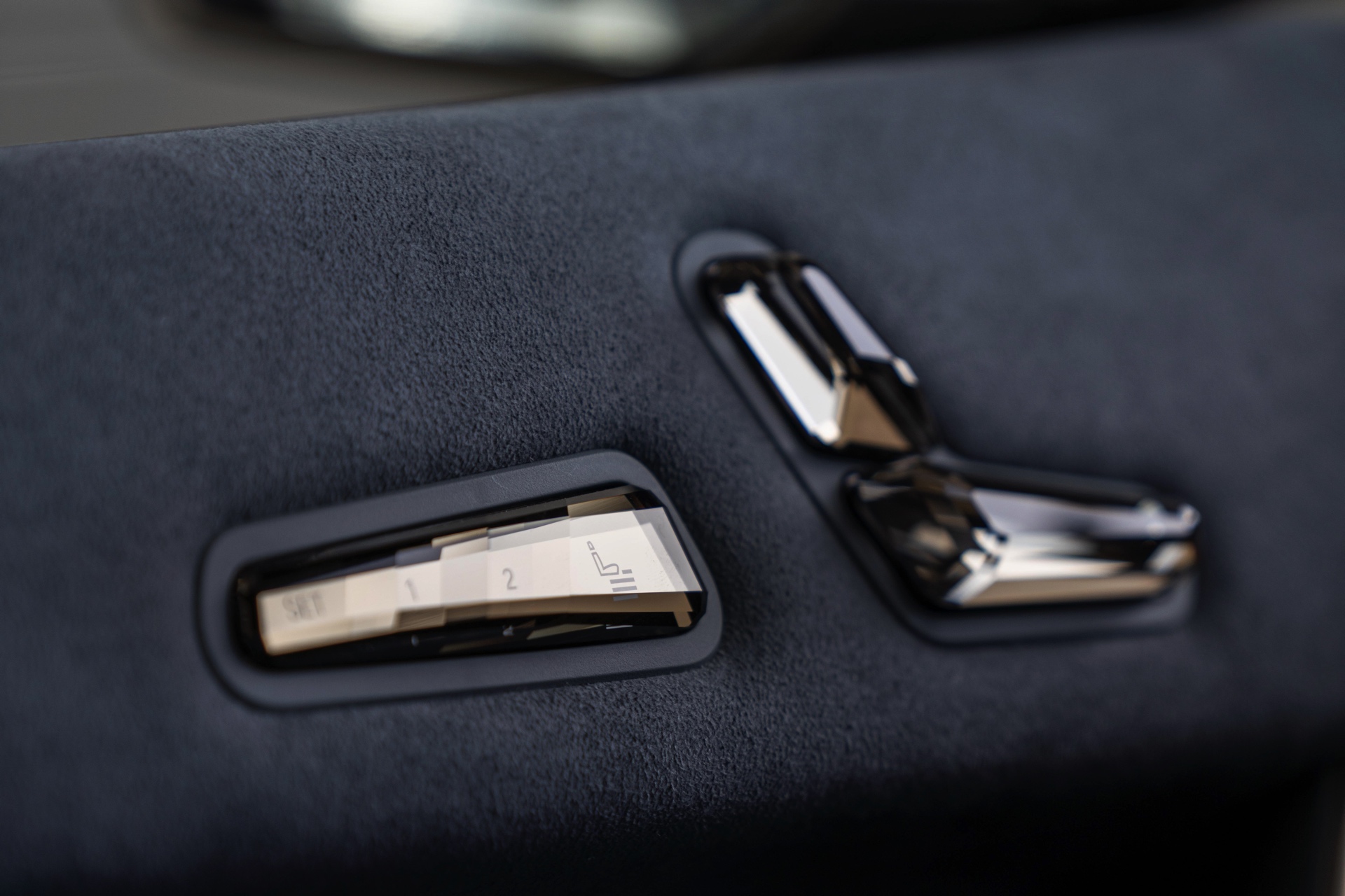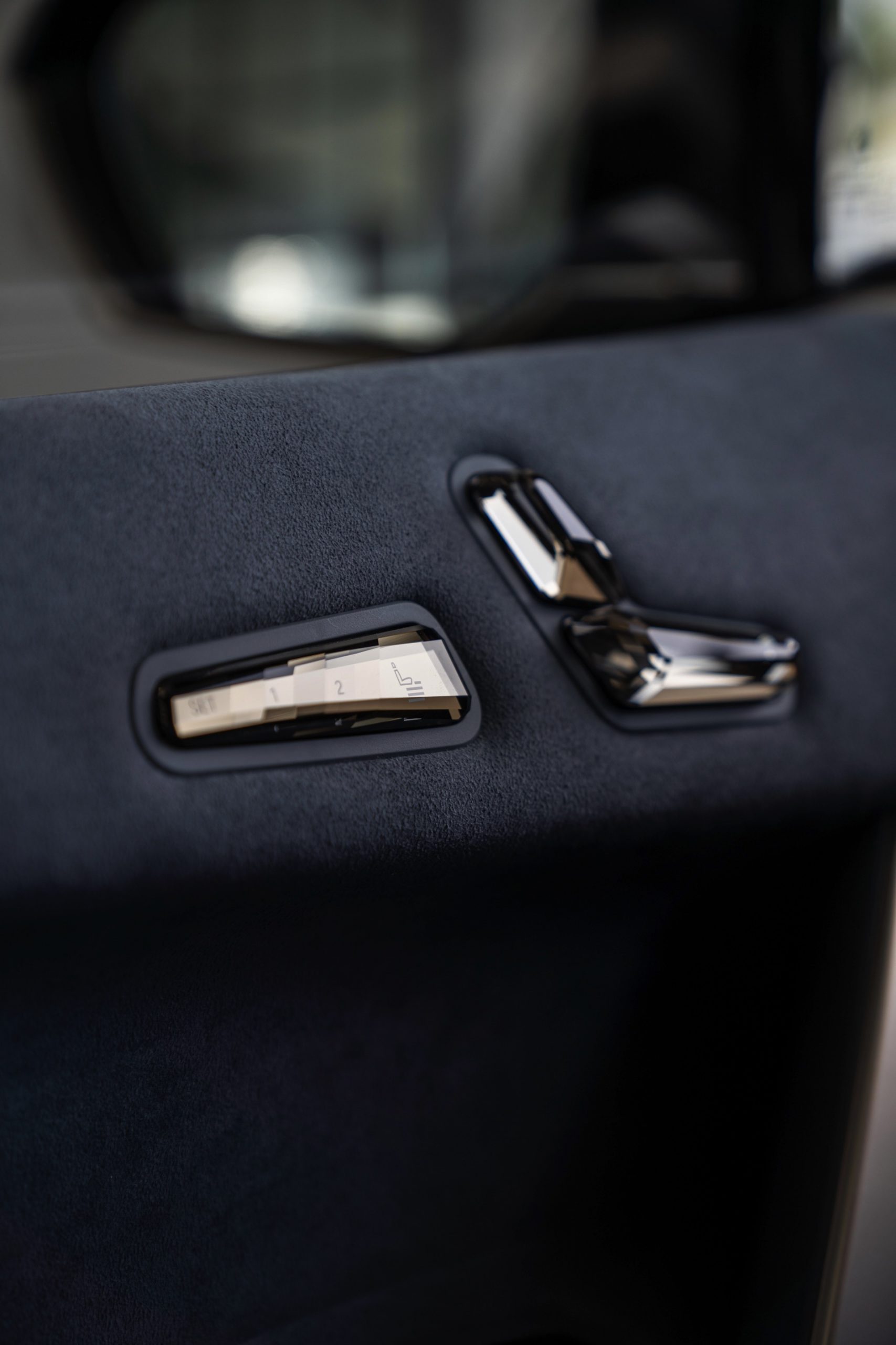 Ab der B-Säule komplettieren die abgedunkelten Scheiben der Sonnenschutzverglasung den düsteren Look. Für die wenigen farbigen Akzente am beinahe komplett schwarzen BMW iX ist die BMW Individual Exterieur Line Titanbronze praktisch im Alleingang verantwortlich: Die Design-Linie sorgt nicht nur für einen eleganten Bronze-Akzent am unteren Rand der Fensterlinie, auch die Einfassungen der flächenbündigen Türgriffe, das Muster der mit Sensoren vollgepackten BMW Niere und der Modellschriftzug xDrive50 am Heck sind in Titanbronze gehalten.