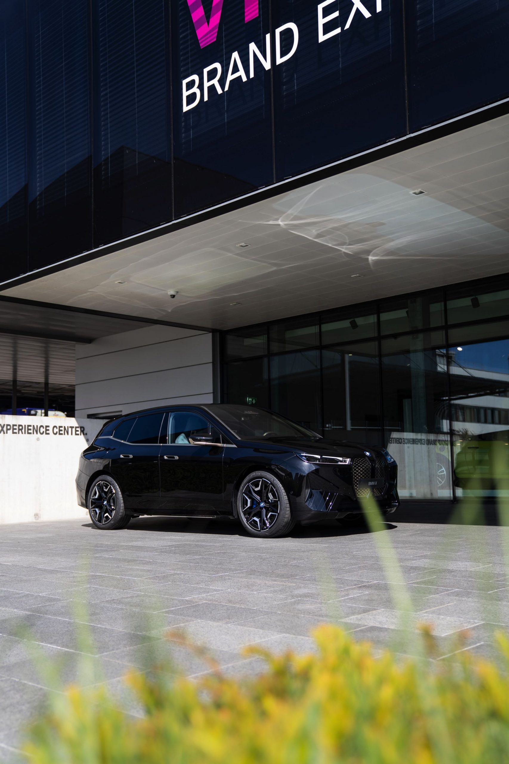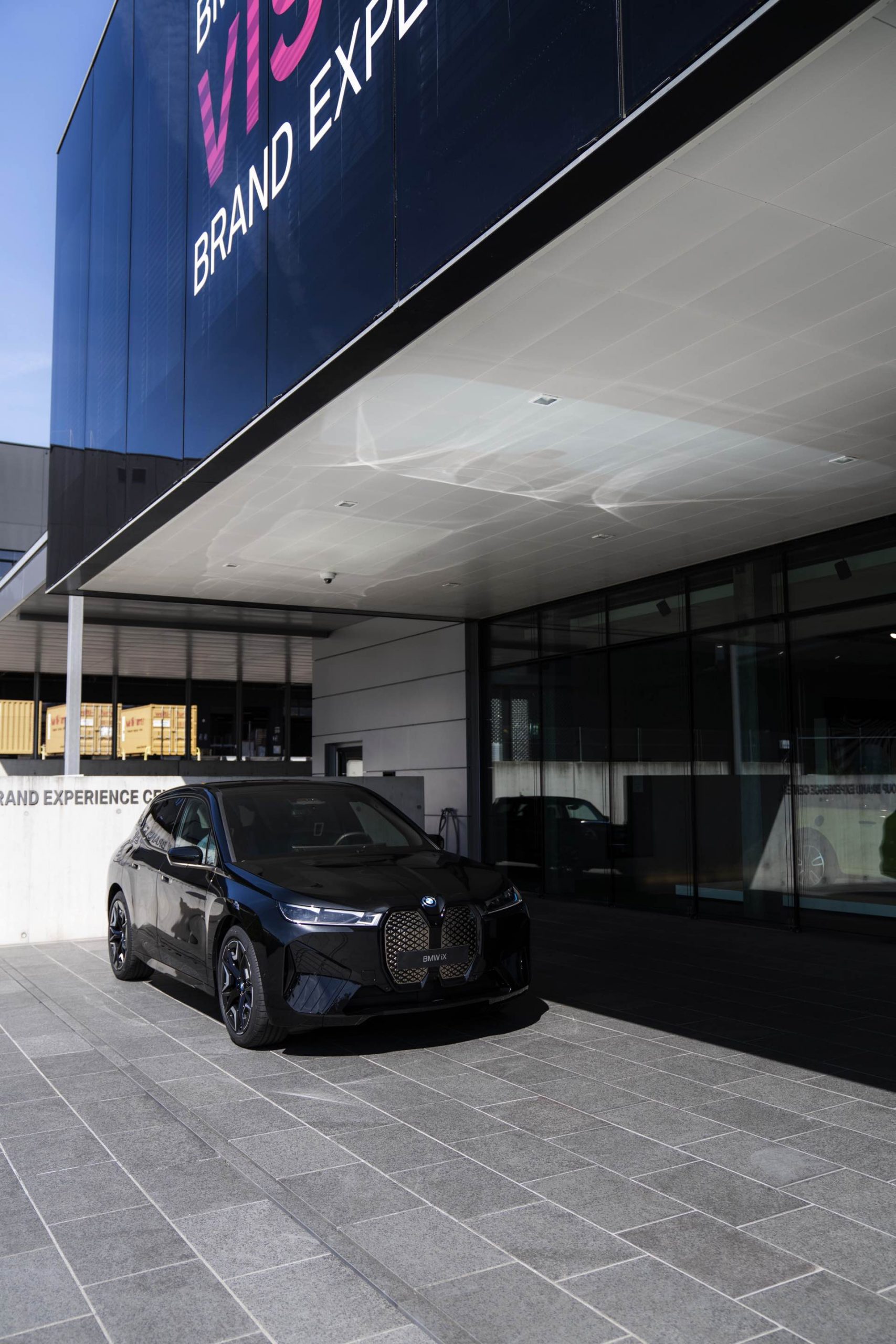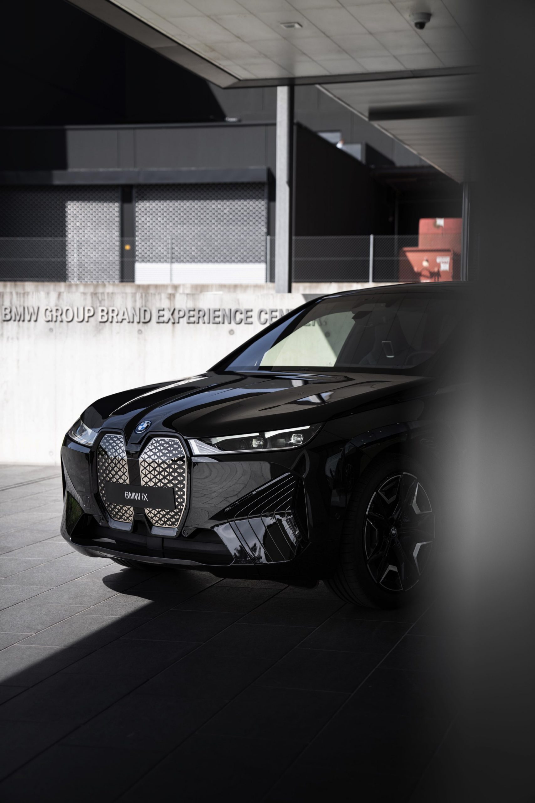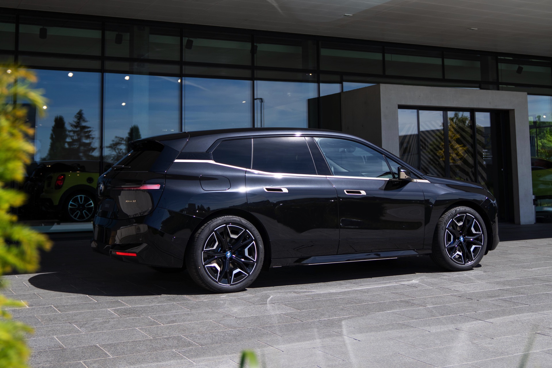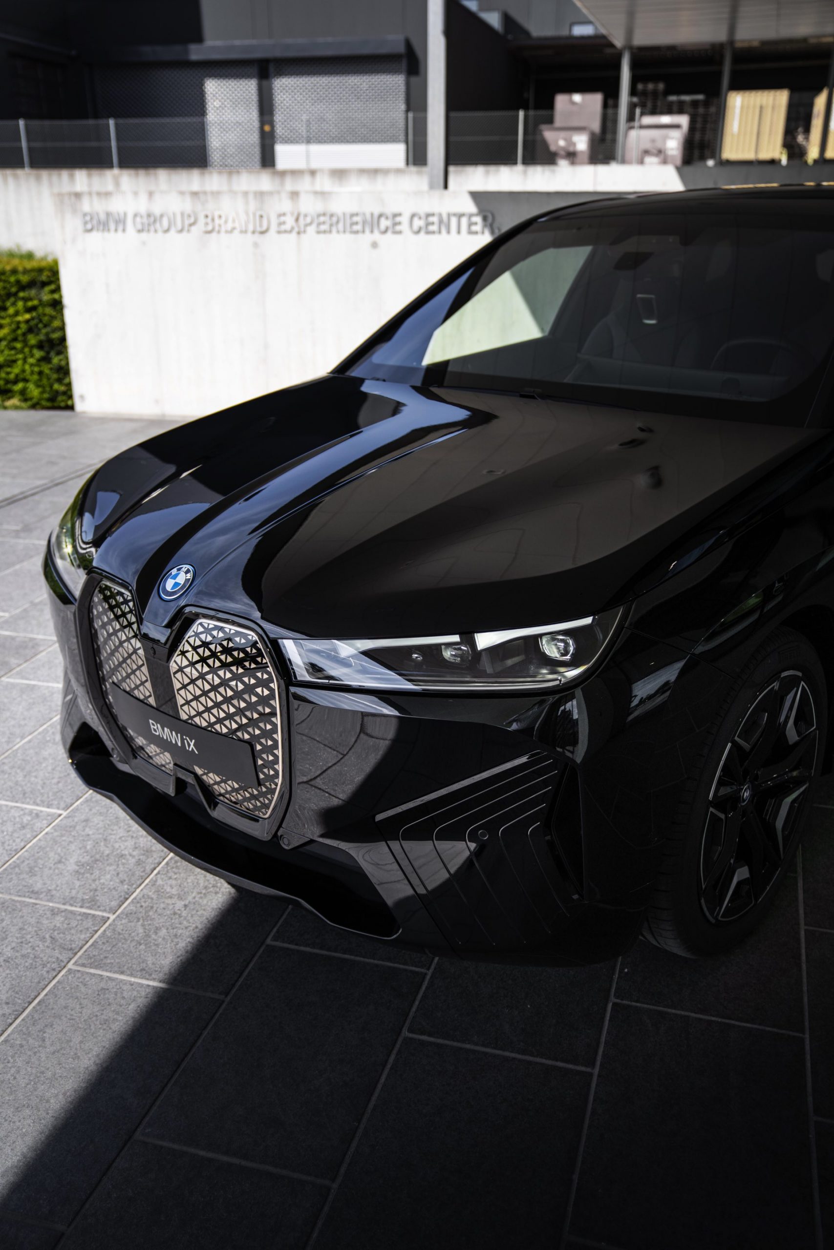 Bei seinen offiziellen Auftritten war der neue BMW iX bisher stets in relativ hellen oder kräftigen Farben zu sehen, aber das Elektro-SUV gibt offenbar auch in Schwarz eine gute Figur ab. Sichtbar wird das auf den aktuellen Fotos aus dem BMW Group Brand Experience Center in der Schweiz, denn dort ist der iX in einer sportlich-eleganten Konfiguration zu sehen: Wir sehen das vorläufige Topmodell BMW iX xDrive50 mit Sportpaket und Lackierung in Saphirschwarz Metallic sowie den 22 Zoll großen Aerodynamikräder 1020 Bicolor 3D-Glanzschliff.
