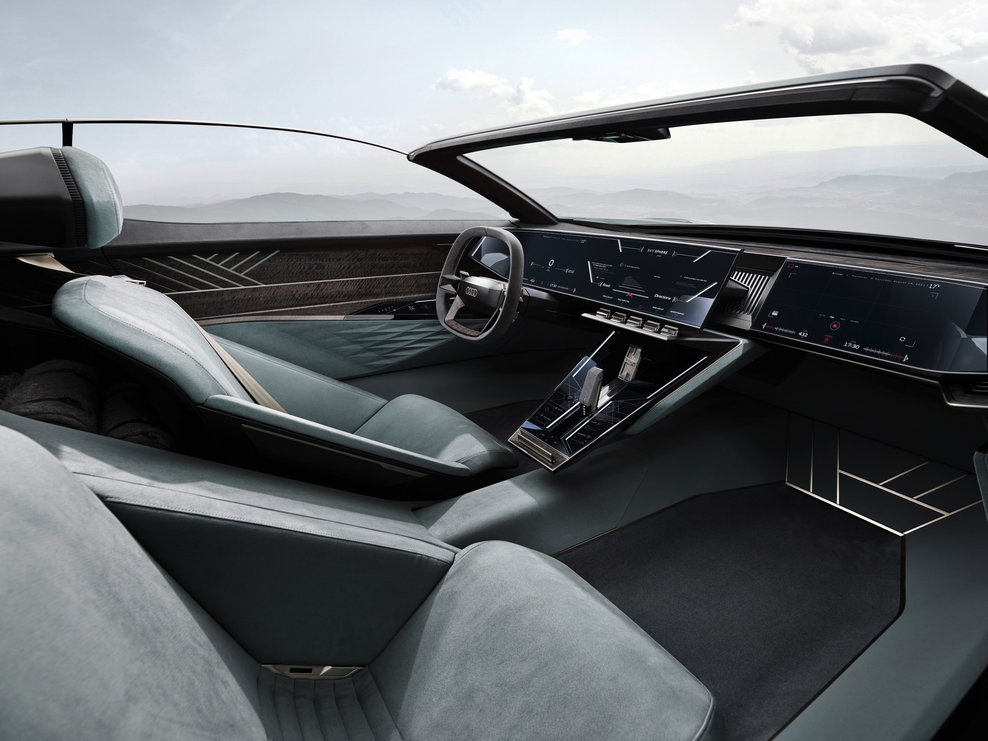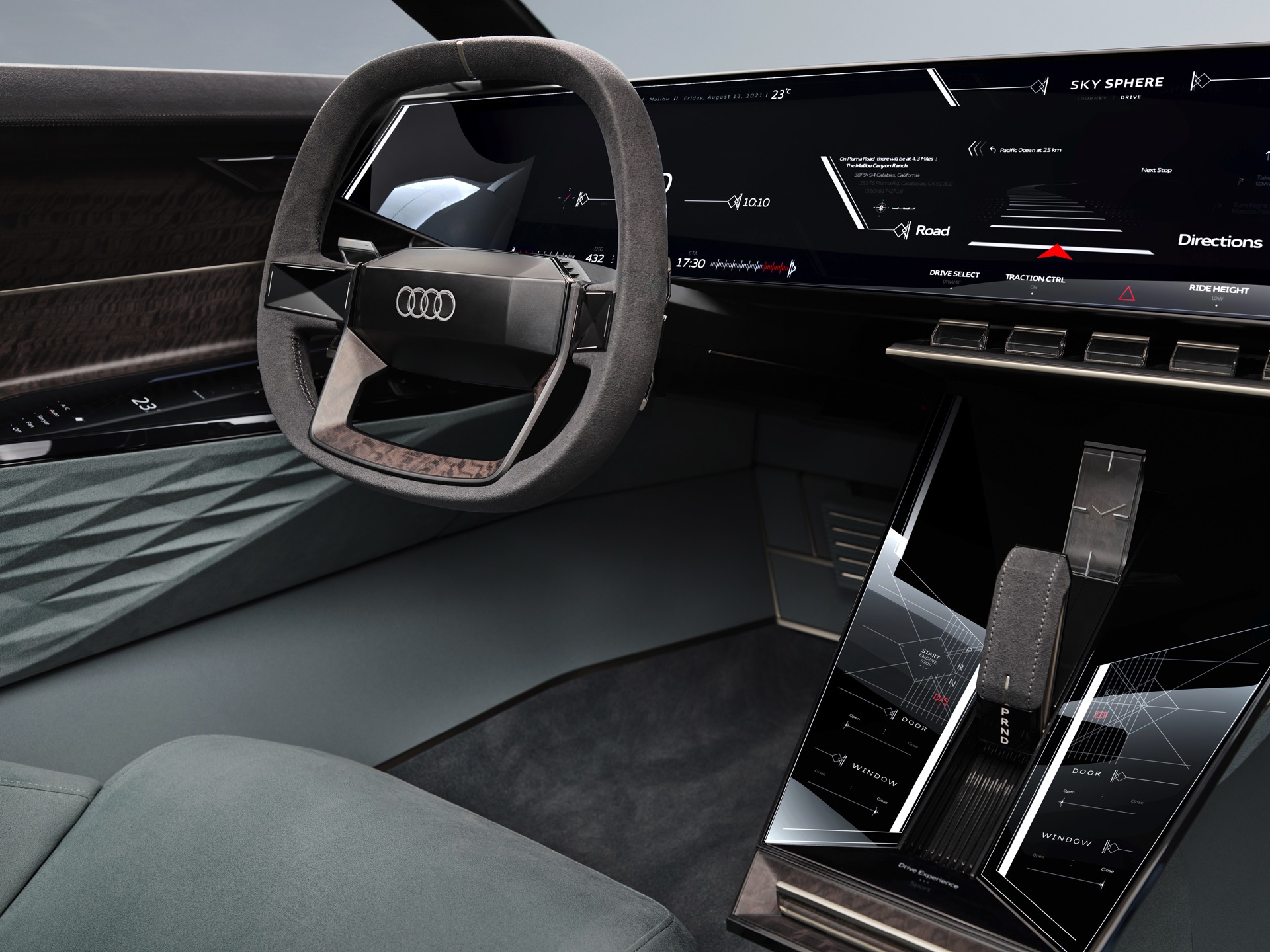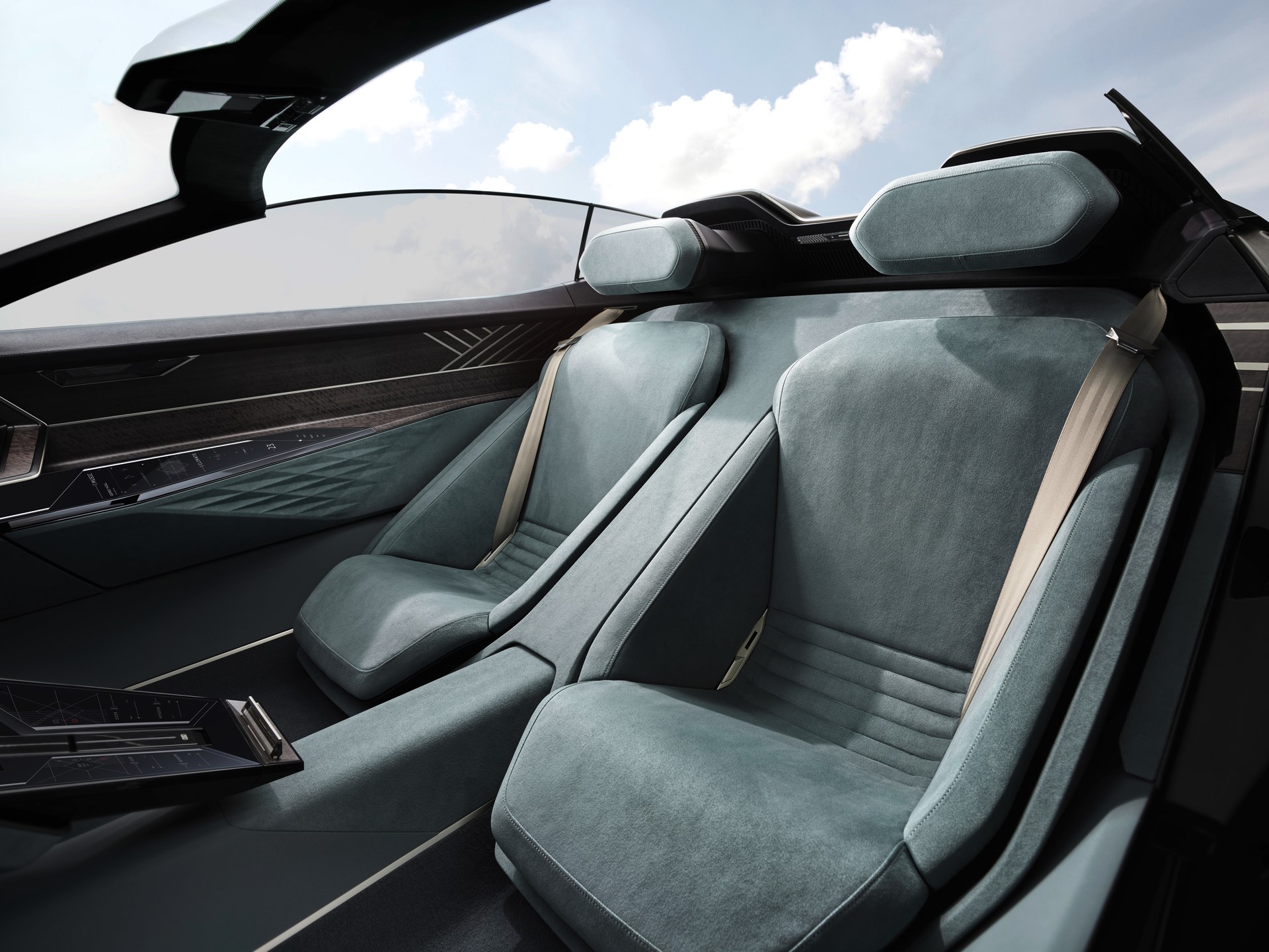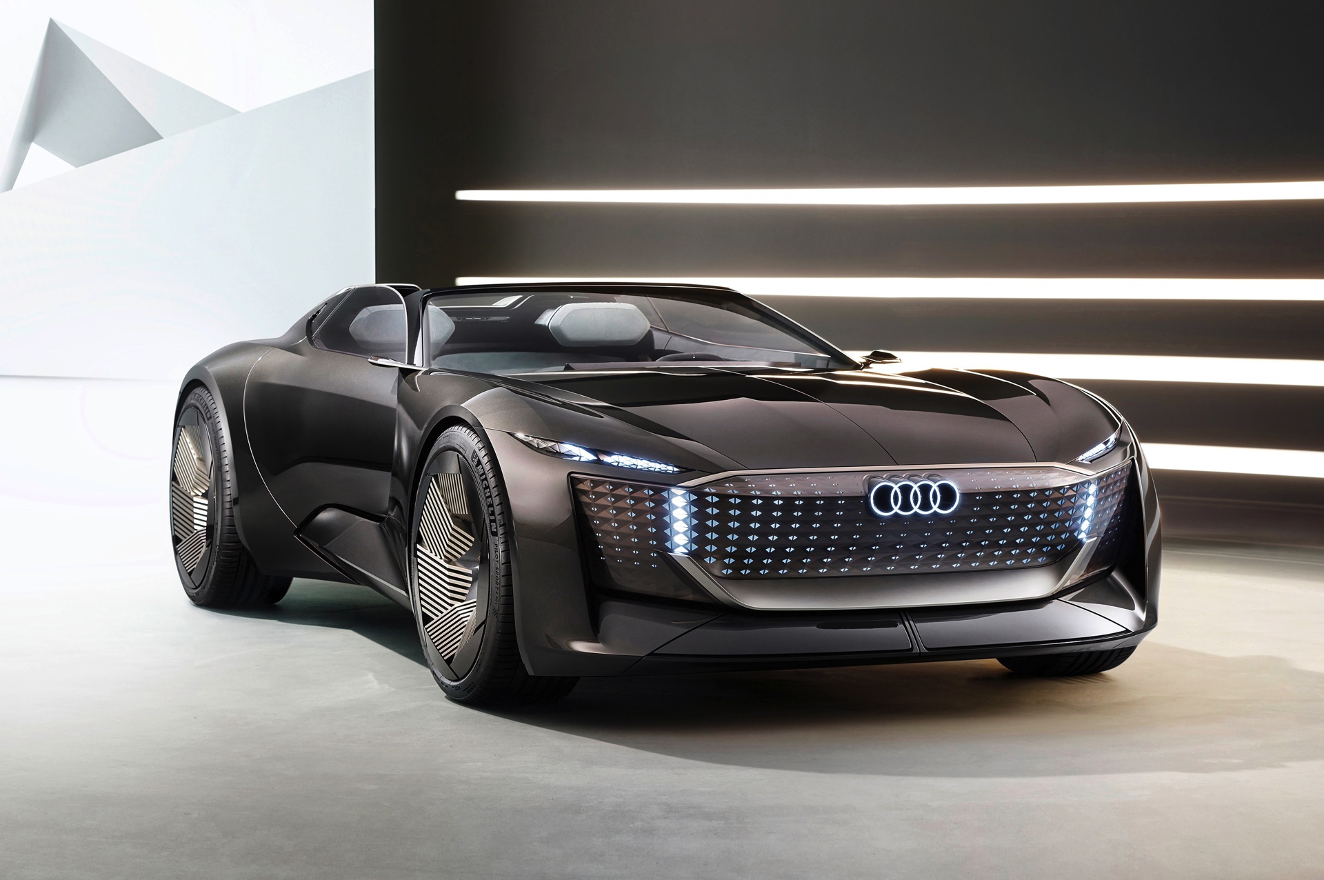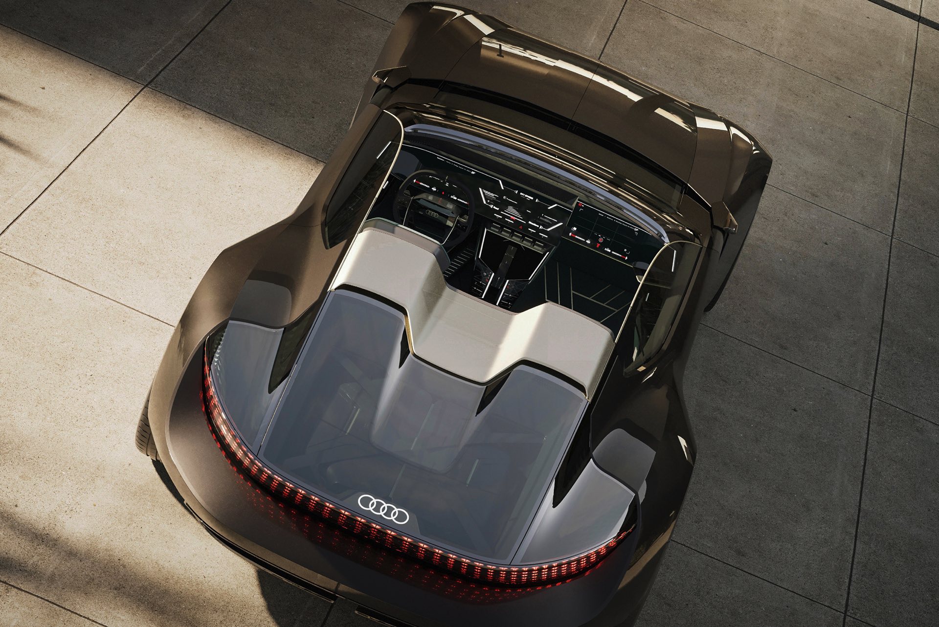 Schon die kurze Ausgangsvariante ist mit 4,94 Meter Länge nicht gerade kompakt, was in Kombination mit der niedrigen Gesamthöhe für faszinierende Proportionen sorgt. Im Fokus steht dann ein intensives Fahrvergnügen unter freiem Himmel. Sollen hingegen große Distanzen möglichst komfortabel überwunden werden, empfiehlt sich der Grand Touring-Modus mit geschlossenem Verdeck und einem dank 25 Zentimetern zusätzlicher Länge deutlich großzügigeren Platzangebot im Innenraum. In diesem Modus werden die Insassen des Audi Skysphere ohne weiteres Zutun chauffiert und ganz bequem an ihr Ziel gebracht. Die gesamte Front- und Heckpartie sind mit LED-Elementen ausgestattet, deren Look sich ebenfalls an den gerade aktiven Fahrmodus anpasst.