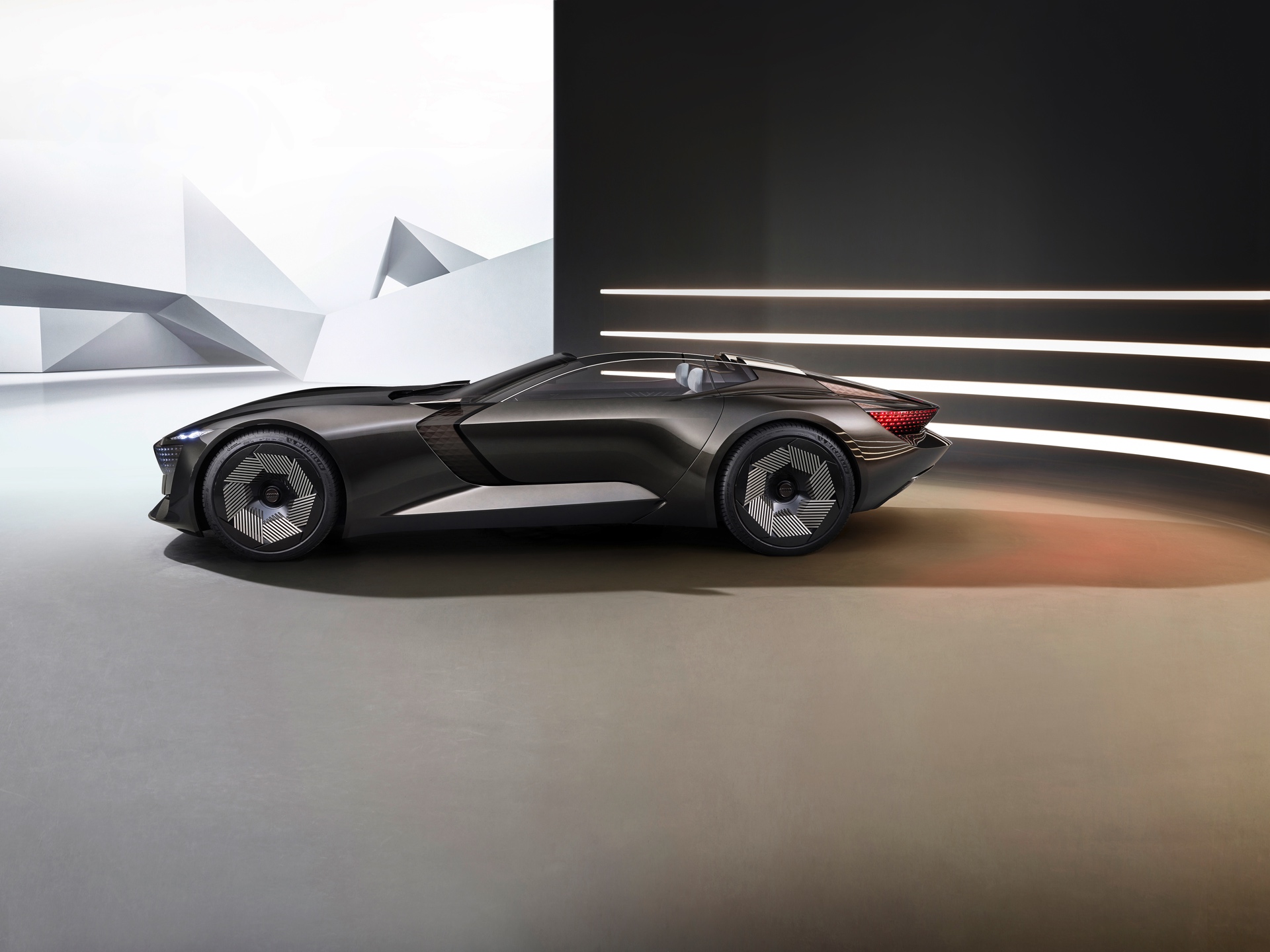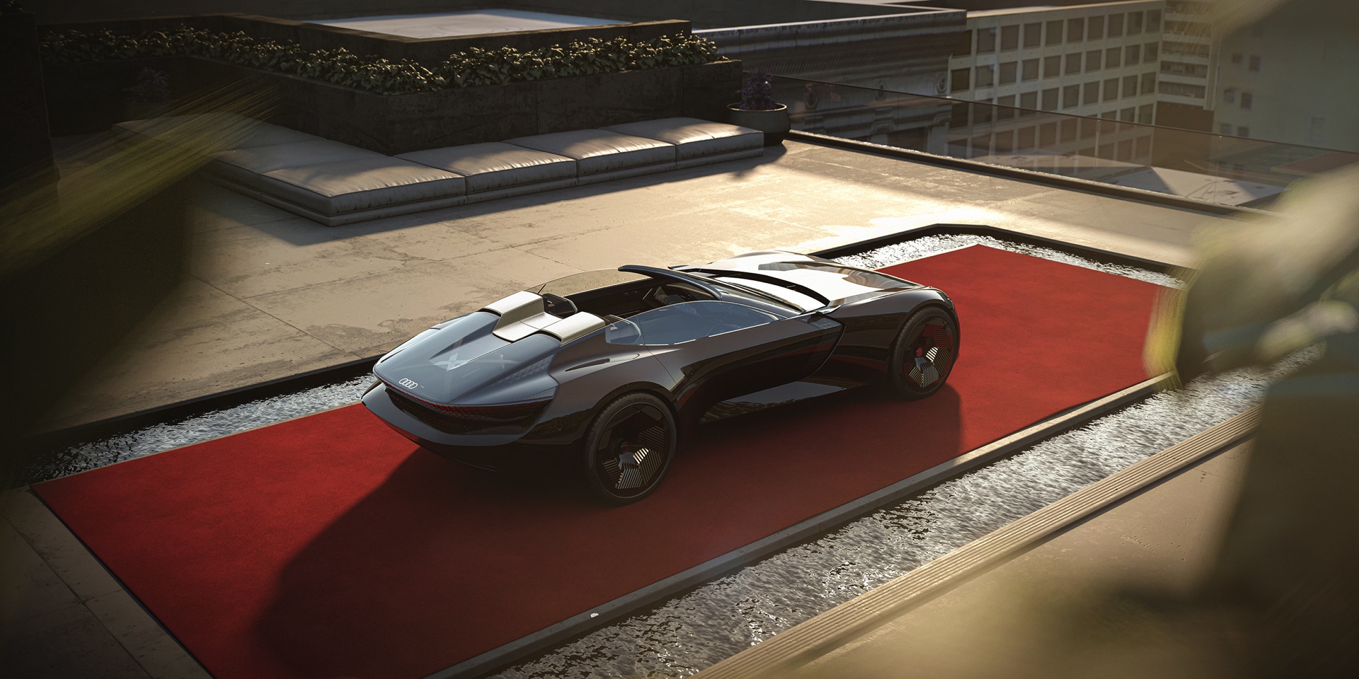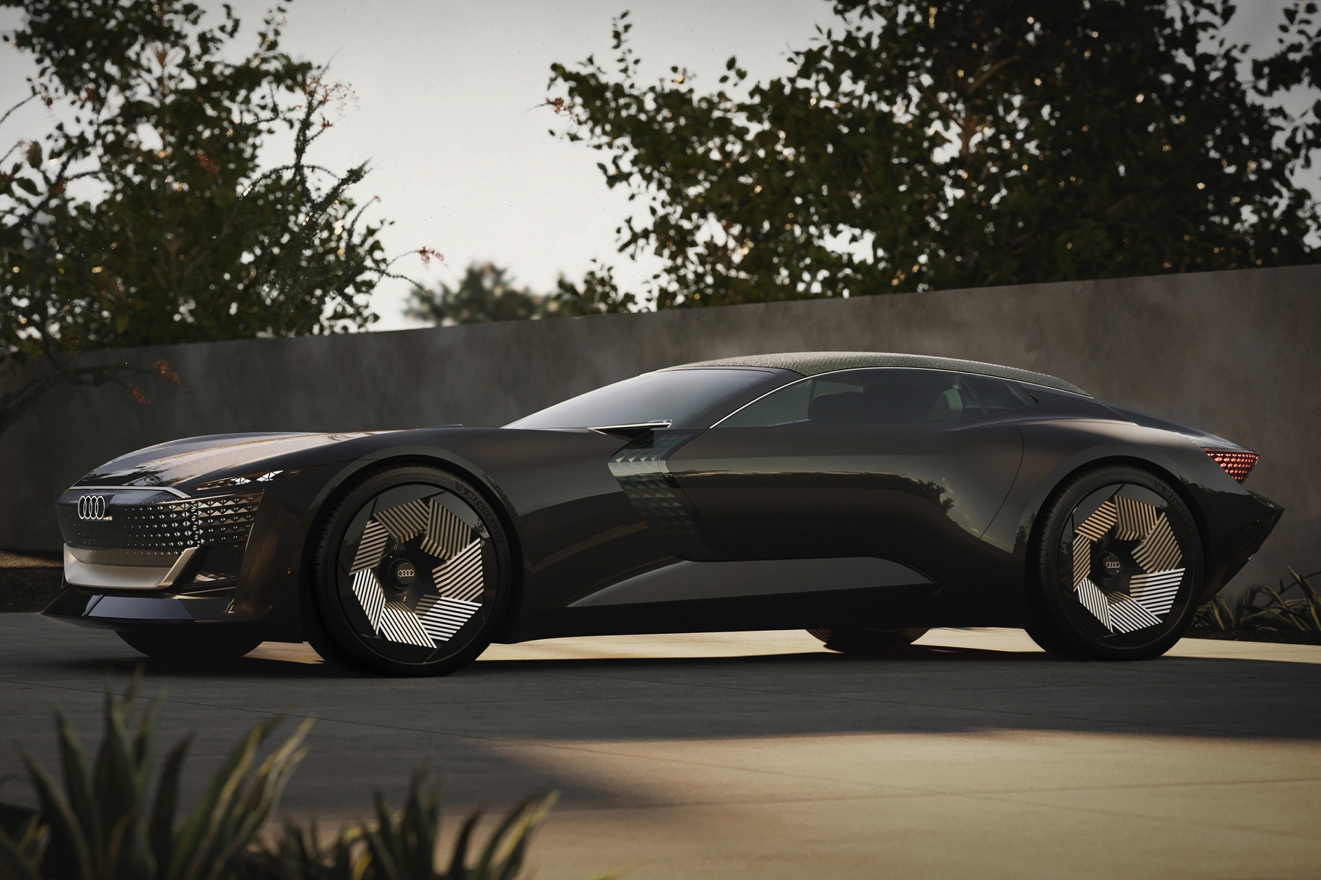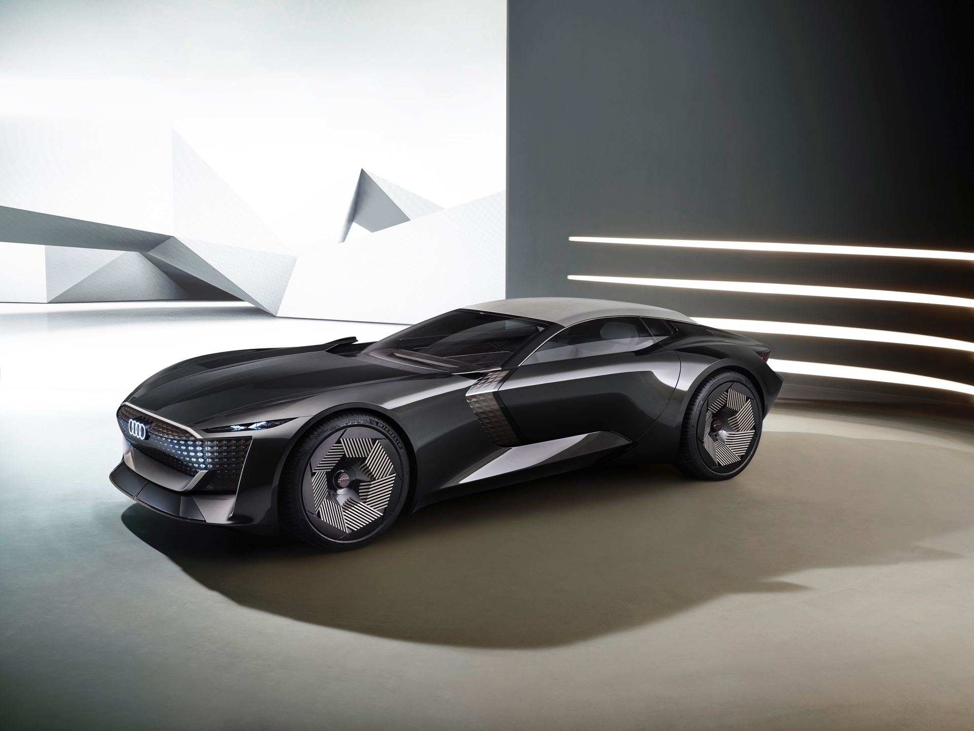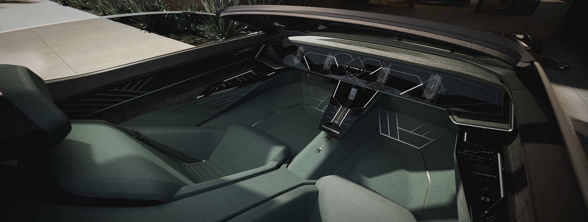 Schon die kurze Ausgangsvariante ist mit 4,94 Meter Länge nicht gerade kompakt, was in Kombination mit der niedrigen Gesamthöhe für faszinierende Proportionen sorgt. Im Fokus steht dann ein intensives Fahrvergnügen unter freiem Himmel. Sollen hingegen große Distanzen möglichst komfortabel überwunden werden, empfiehlt sich der Grand Touring-Modus mit geschlossenem Verdeck und einem dank 25 Zentimetern zusätzlicher Länge deutlich großzügigeren Platzangebot im Innenraum. In diesem Modus werden die Insassen des Audi Skysphere ohne weiteres Zutun chauffiert und ganz bequem an ihr Ziel gebracht. Die gesamte Front- und Heckpartie sind mit LED-Elementen ausgestattet, deren Look sich ebenfalls an den gerade aktiven Fahrmodus anpasst.