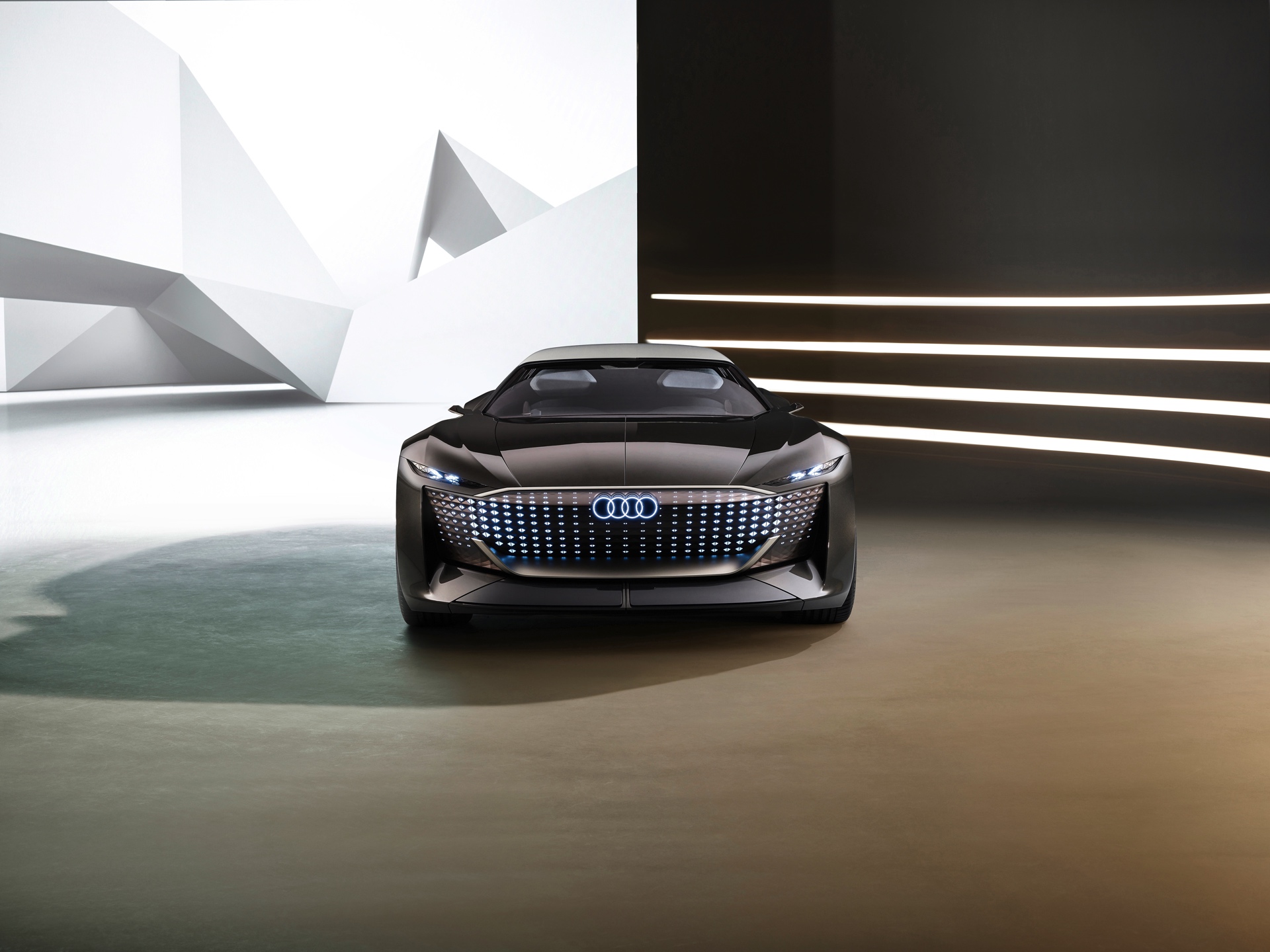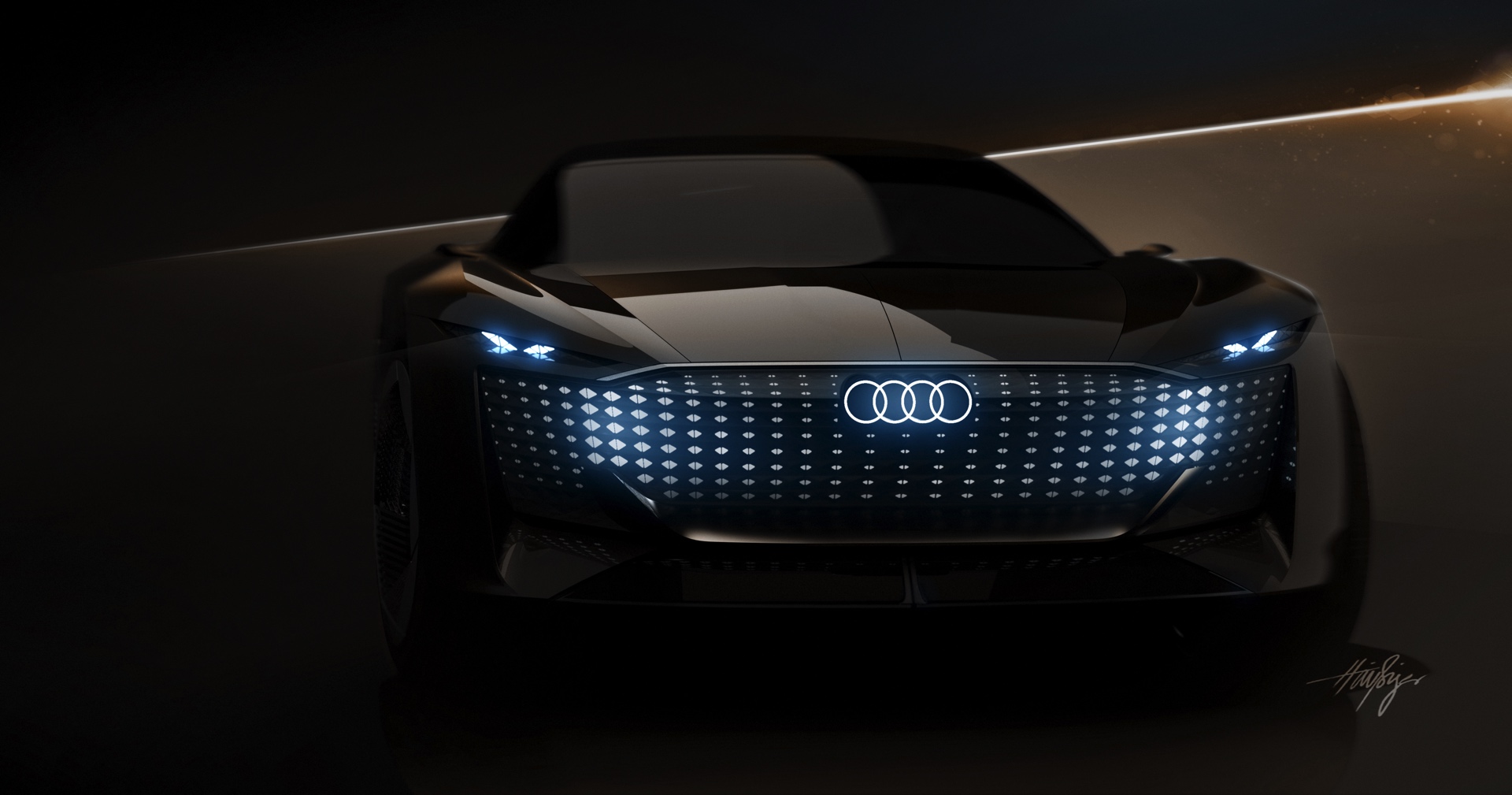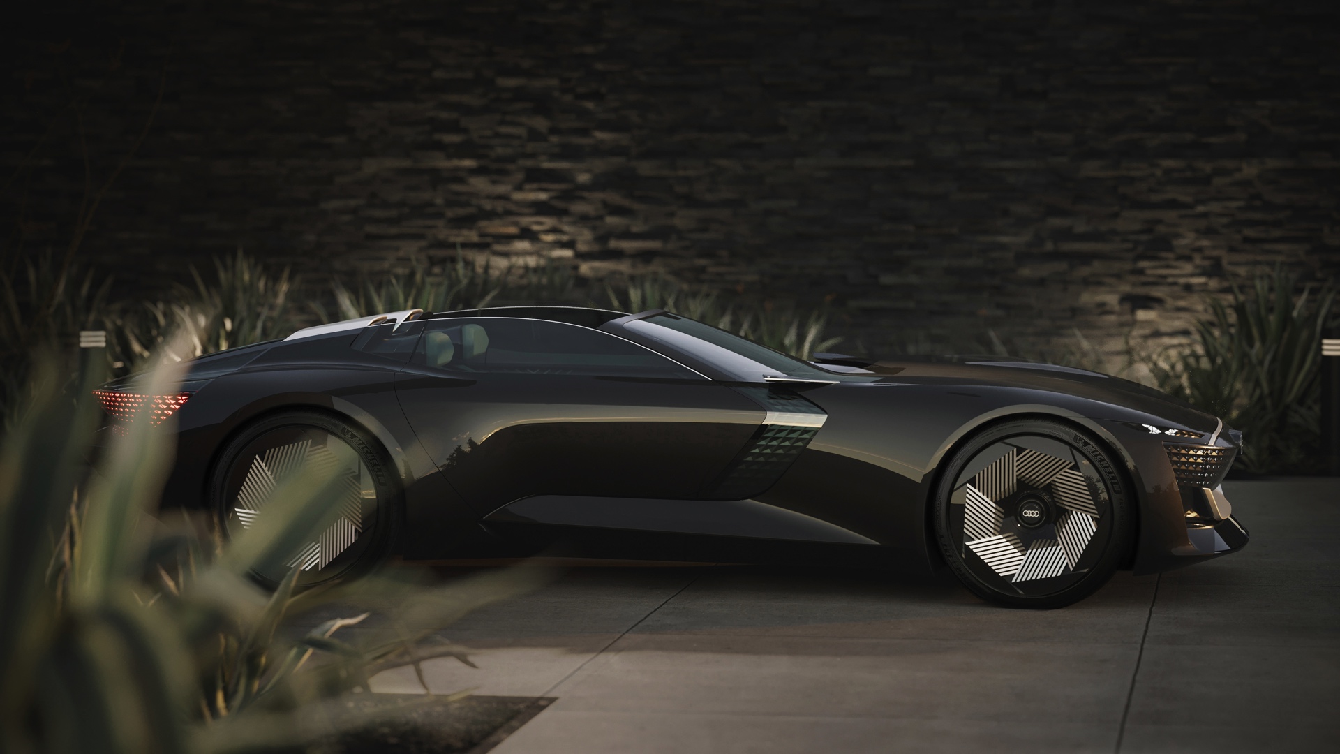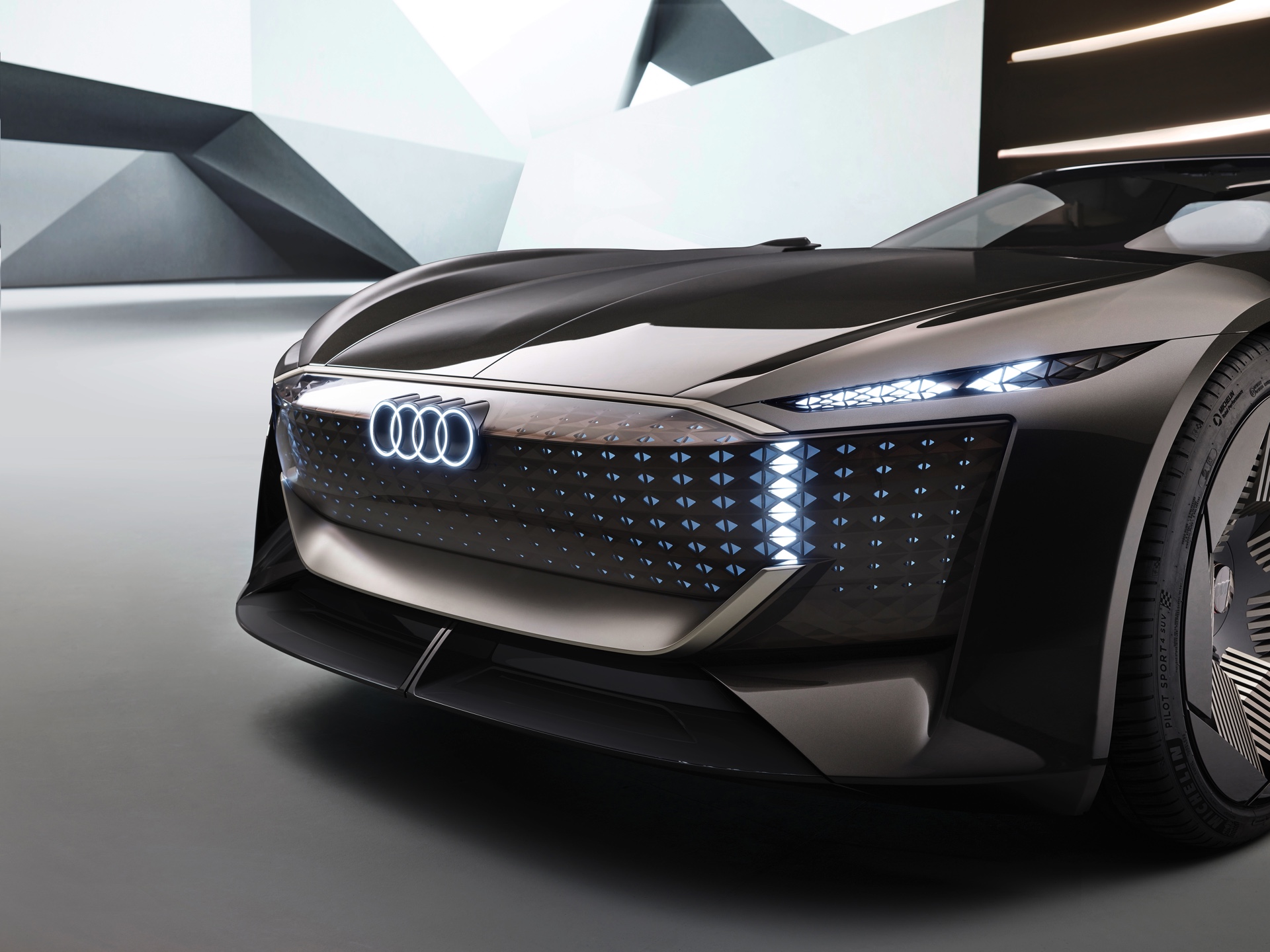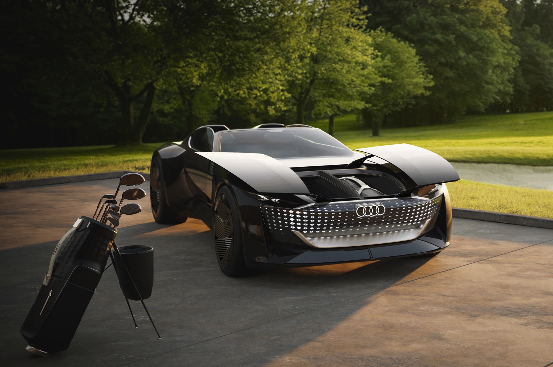Schon die kurze Ausgangsvariante ist mit 4,94 Meter Länge nicht gerade kompakt, was in Kombination mit der niedrigen Gesamthöhe für faszinierende Proportionen sorgt. Im Fokus steht dann ein intensives Fahrvergnügen unter freiem Himmel. Sollen hingegen große Distanzen möglichst komfortabel überwunden werden, empfiehlt sich der Grand Touring-Modus mit geschlossenem Verdeck und einem dank 25 Zentimetern zusätzlicher Länge deutlich großzügigeren Platzangebot im Innenraum. In diesem Modus werden die Insassen des Audi Skysphere ohne weiteres Zutun chauffiert und ganz bequem an ihr Ziel gebracht. Die gesamte Front- und Heckpartie sind mit LED-Elementen ausgestattet, deren Look sich ebenfalls an den gerade aktiven Fahrmodus anpasst.