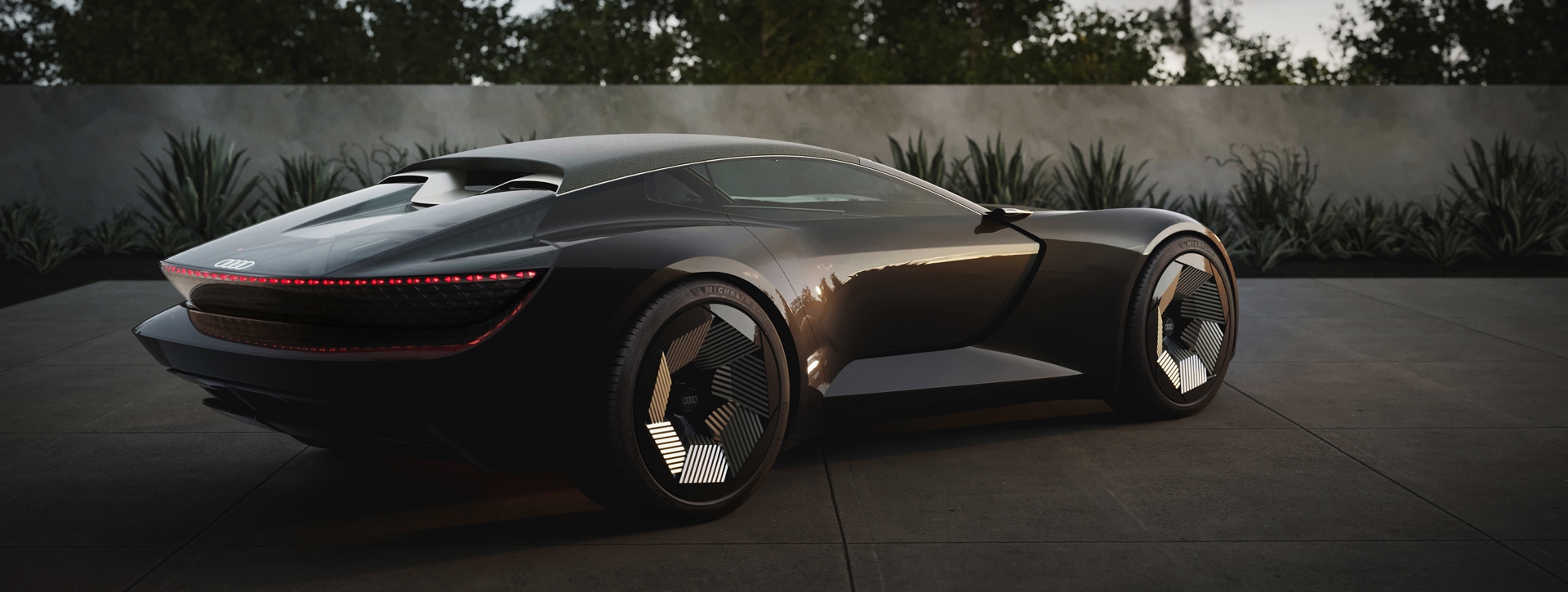 Sowohl optisch als auch technisch spielt die Musik im Heck des Audi Skysphere, denn hier lasten 60 Prozent des Gesamtgewichts von rund 1,8 Tonnen, hier sind die Batterien für den Elektro-Antrieb platziert und hier befindet sich auch der E-Motor. 465 kW oder 632 PS sowie 750 Newtonmeter Drehmoment sollen den Hecktriebler bei Bedarf in 4,0 Sekunden von 0 auf 100 km/h beschleunigen, die hecklastige Gewichtsverteilung verspricht außerdem ein sehr agiles Fahrverhalten.