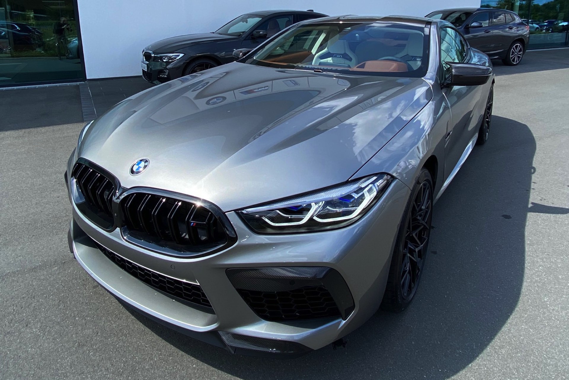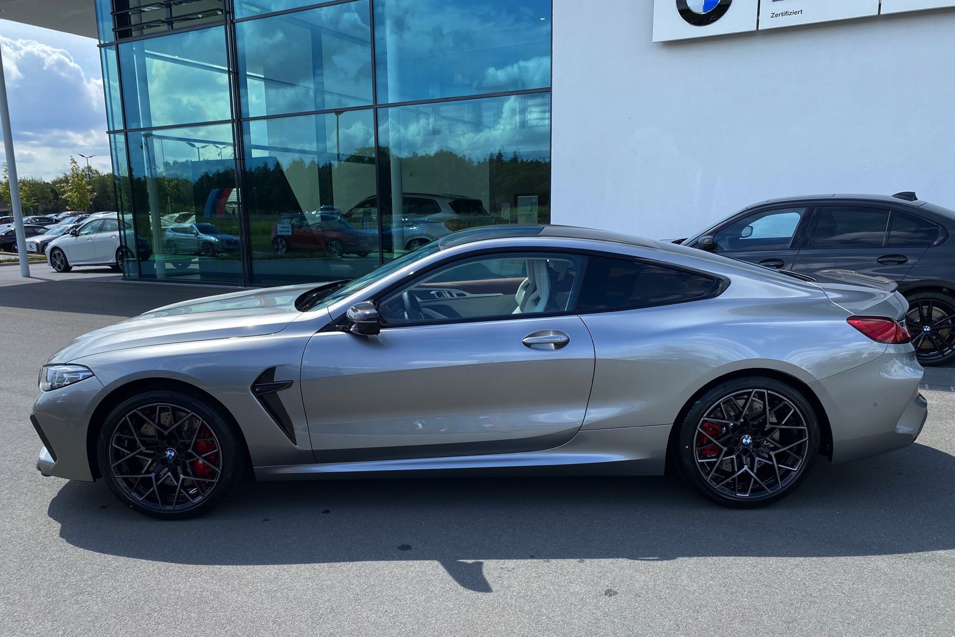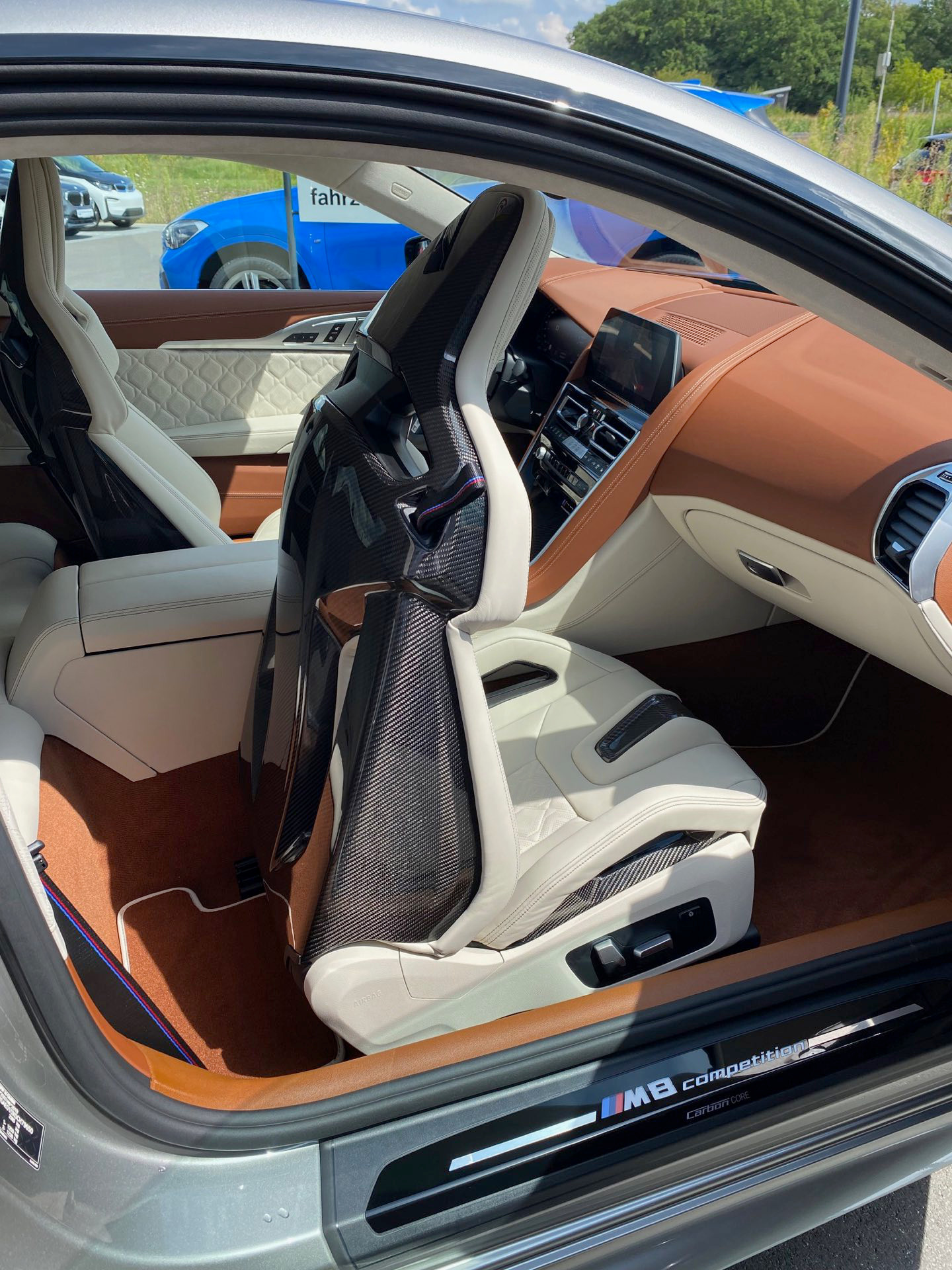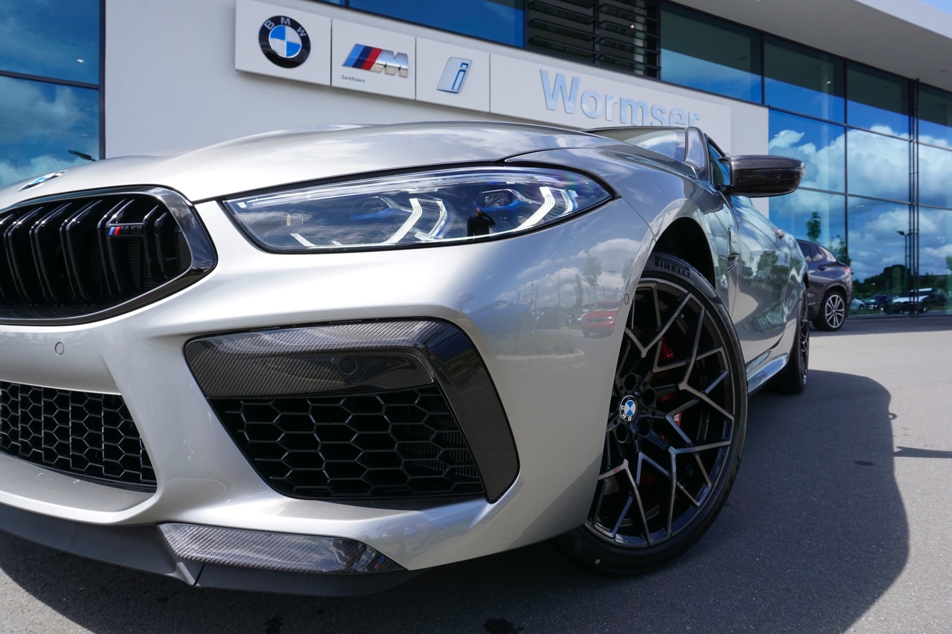 Auch wenn im aktuellen Fall der Innenraum im Vordergrund steht, muss sich auch das Exterieur nicht verstecken: Der gezeigte BMW M8 F92 trägt eine Lackierung in Donington Grey Metallic und das optionale M-Carbon Exterieur-Paket, außerdem sehen wir die 20 Zoll großen Leichtmetallräder im Design Sternspeiche 813 M Bicolor.