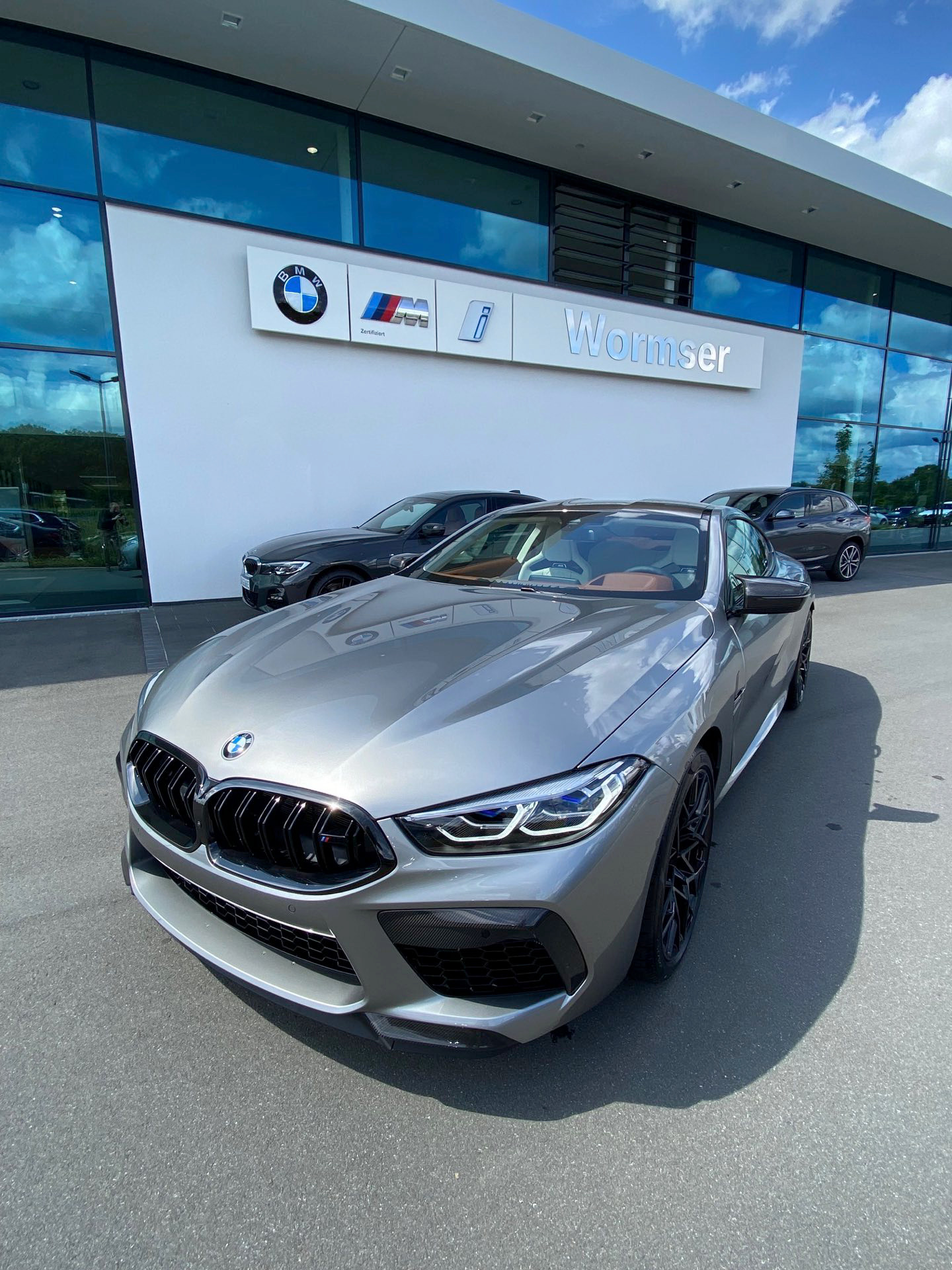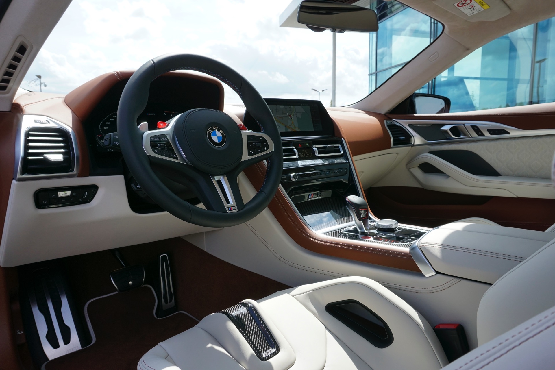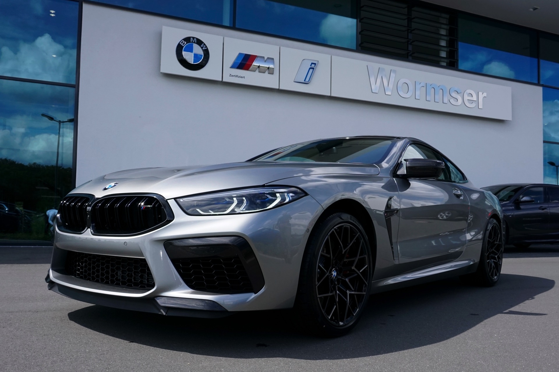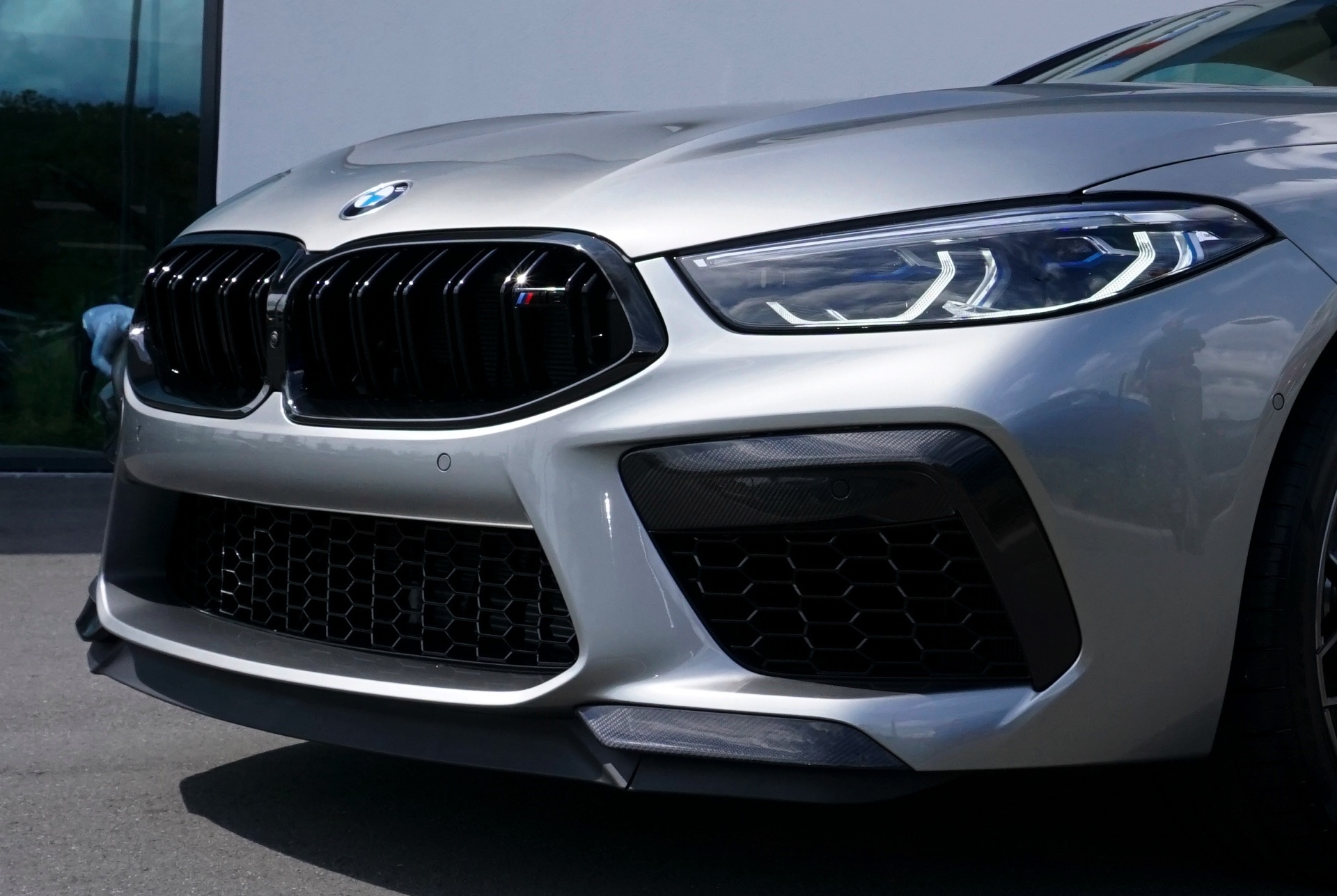 Auch wenn im aktuellen Fall der Innenraum im Vordergrund steht, muss sich auch das Exterieur nicht verstecken: Der gezeigte BMW M8 F92 trägt eine Lackierung in Donington Grey Metallic und das optionale M-Carbon Exterieur-Paket, außerdem sehen wir die 20 Zoll großen Leichtmetallräder im Design Sternspeiche 813 M Bicolor.