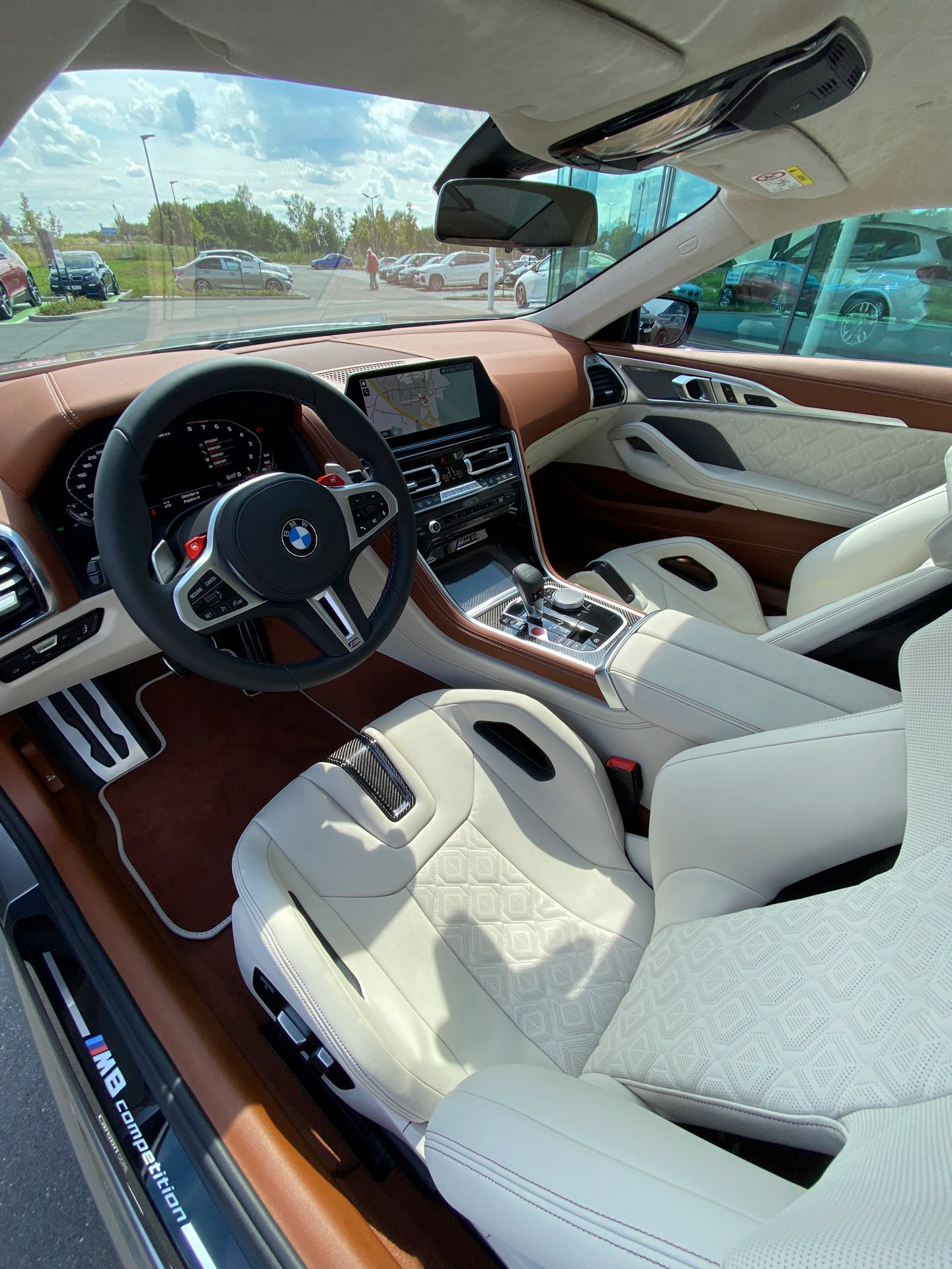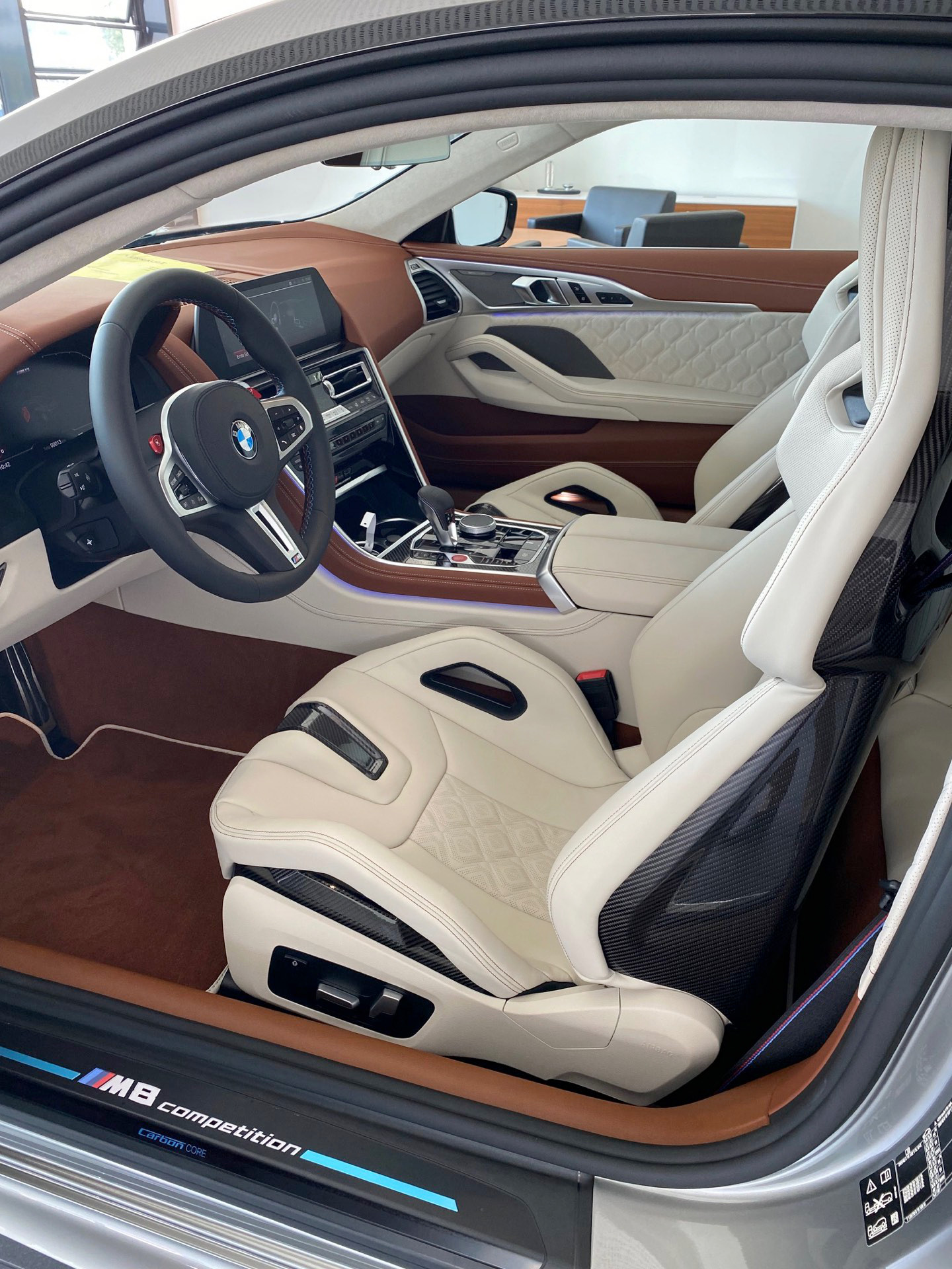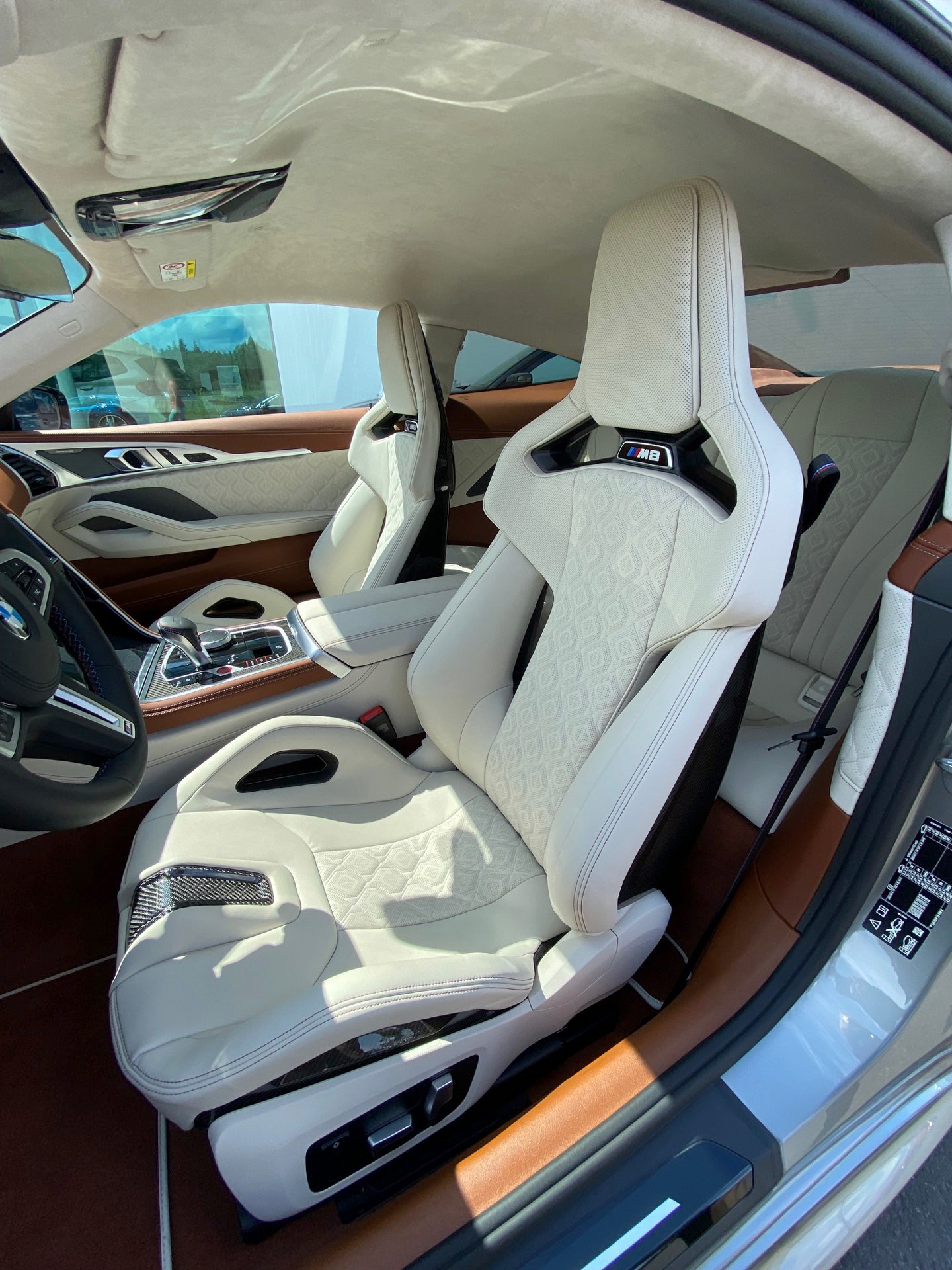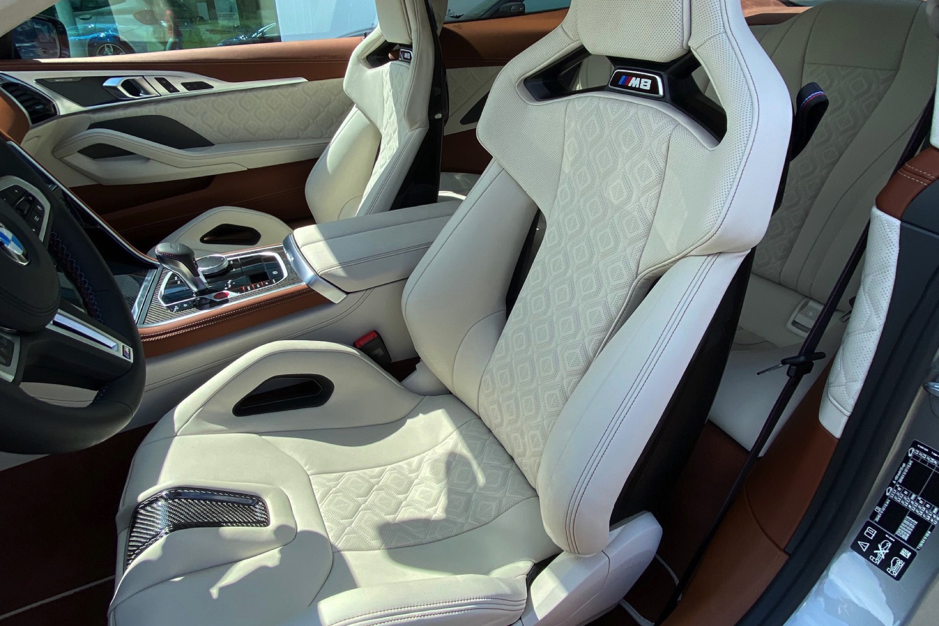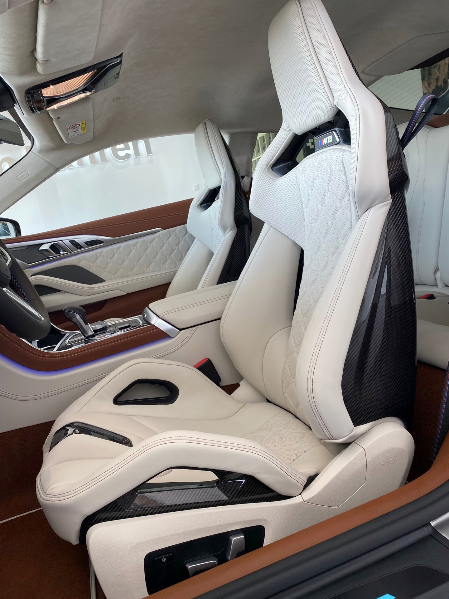 BMW-Verkäufer und BimmerToday-Leser Fabian Poss hat uns nun einige Fotos geschickt, auf denen die neuen Sitze ihre volle Wirkung in einem BMW M8 F92 entfalten dürfen. In Kombination mit der BMW Individual-Lederausstattung Merino in Elfenbeinweiß und Tartufo kommt dabei auch der Luxus-Gedanke des großen Coupés nicht zu kurz. Auf diesen Aspekt zahlen auch die zahlreichen elektrischen Verstellmöglichkeiten bei: Klar, anders als bei einem Renn-Schalensitz wollen die meisten Kunden eines BMW M8 Coupé im Alltag nicht auf die gewohnten Annehmlichkeiten von Sitzverstellung, Sitzheizung & Co. oder feine Details wie beleuchtete M8-Schriftzüge unterhalb der integrierten Kopfstützen verzichten.
