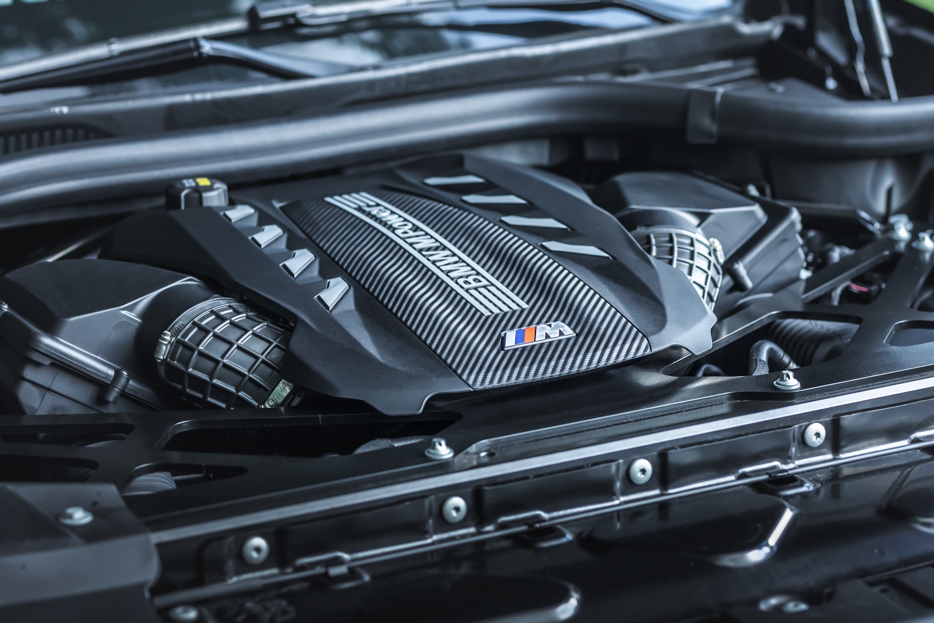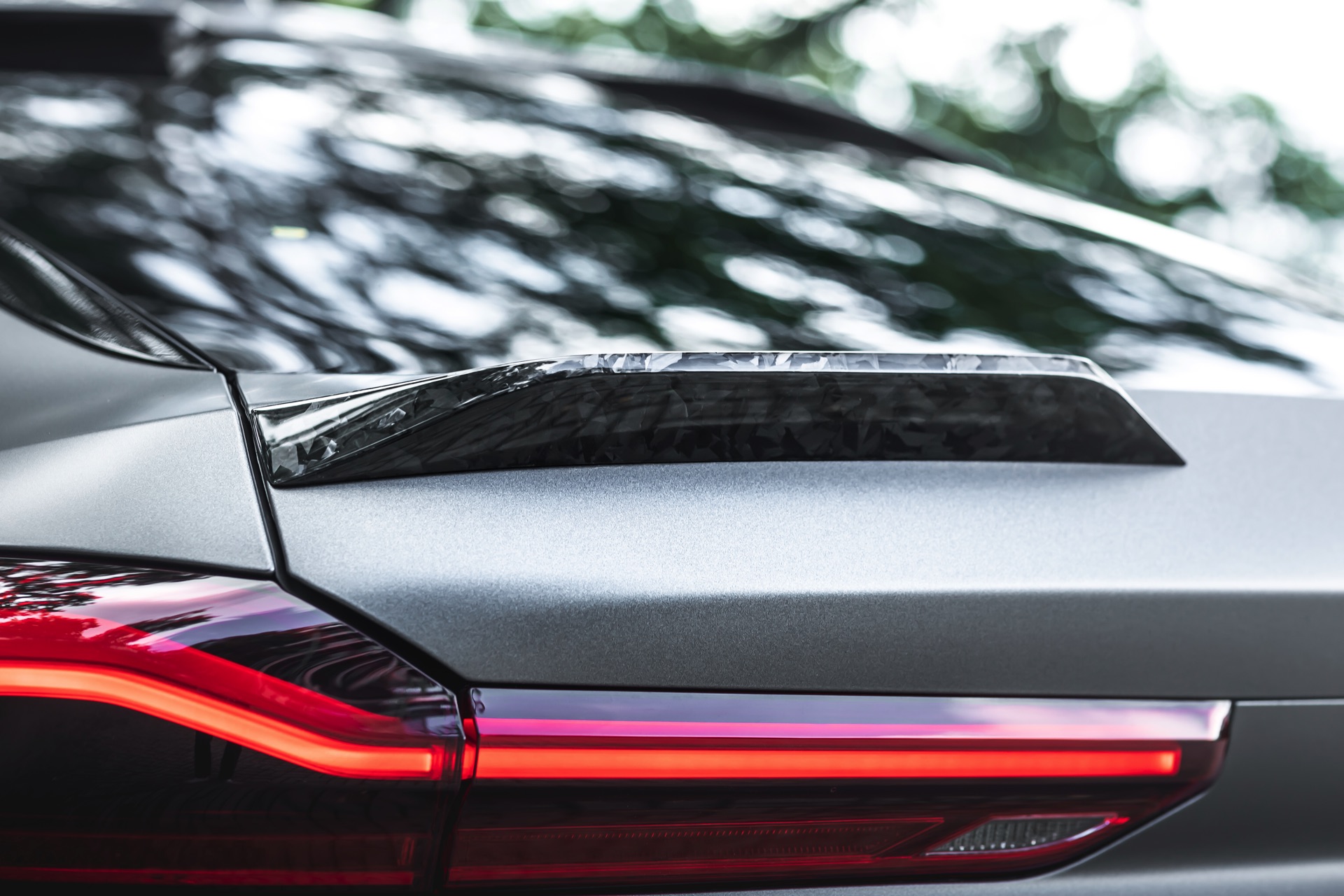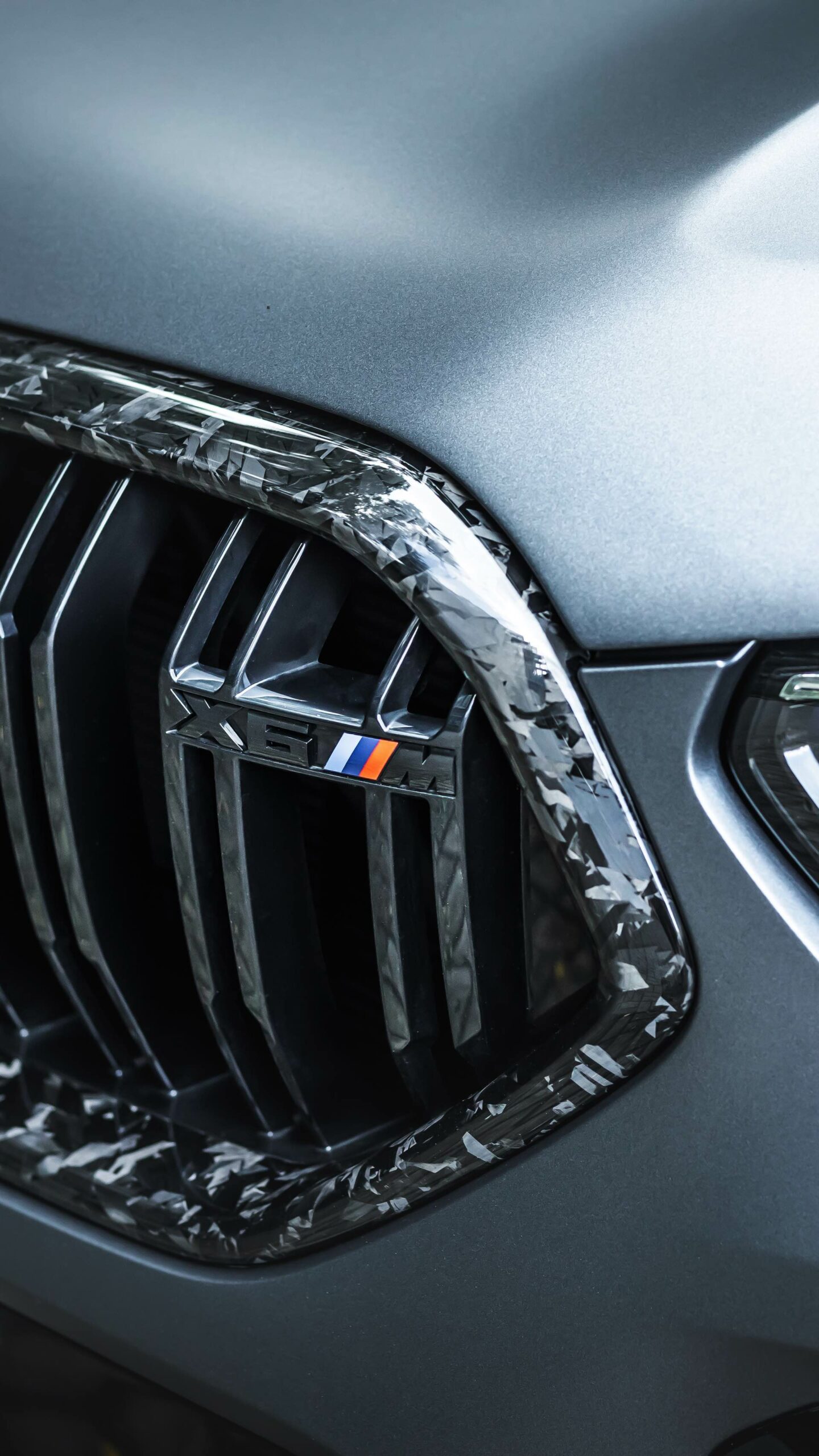 Im Kontext des fast 2,4 Tonnen schweren BMW X6 M F96 spielt Leichtbau aber tatsächlich die kleinere Rolle als die unverwechselbare Optik, die den Brutalo-Auftritt des Power-SUV aufs nächste Level heben. Frontspoiler, Nieren, Kotflügel-Verbreiterungen, Seitenschweller, Außenspiegel-Gehäuse, Heckspoiler, Diffusor-Einsatz und selbst die Motorhaube sind sichtbar aus Forged Carbon gefertigt, auch wenn sich im Fall der Motorhaube ein Großteil des Materials unter der matten Voll-Folierung in “Matte Charcoal Metallic” verbirgt.