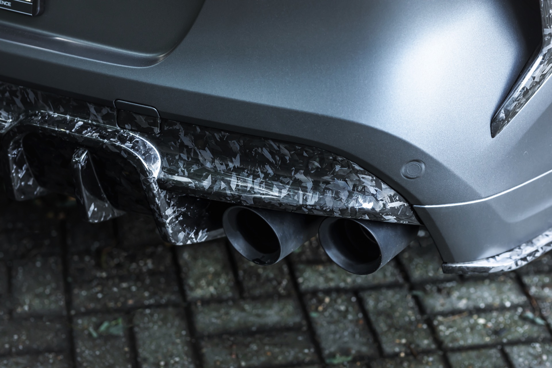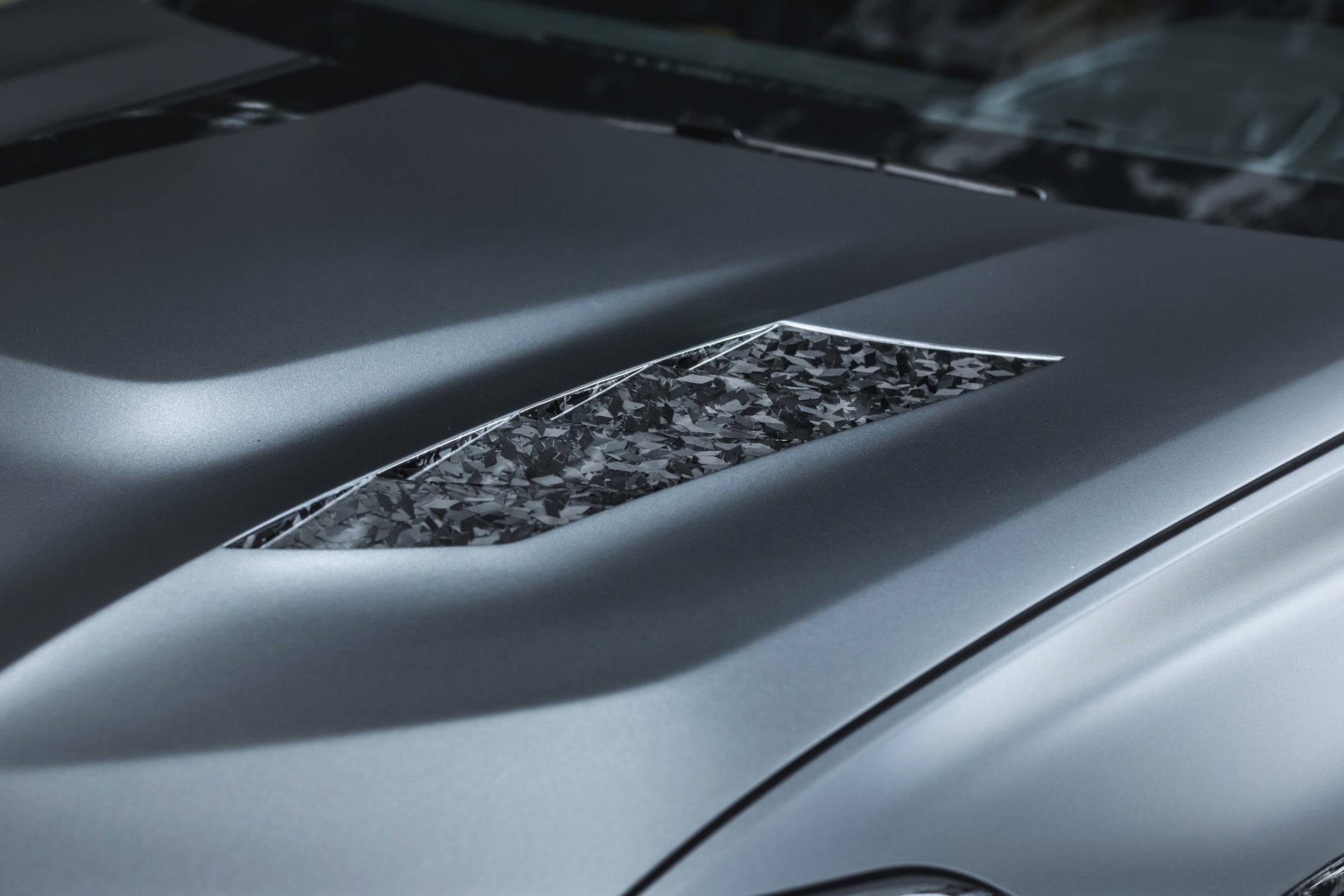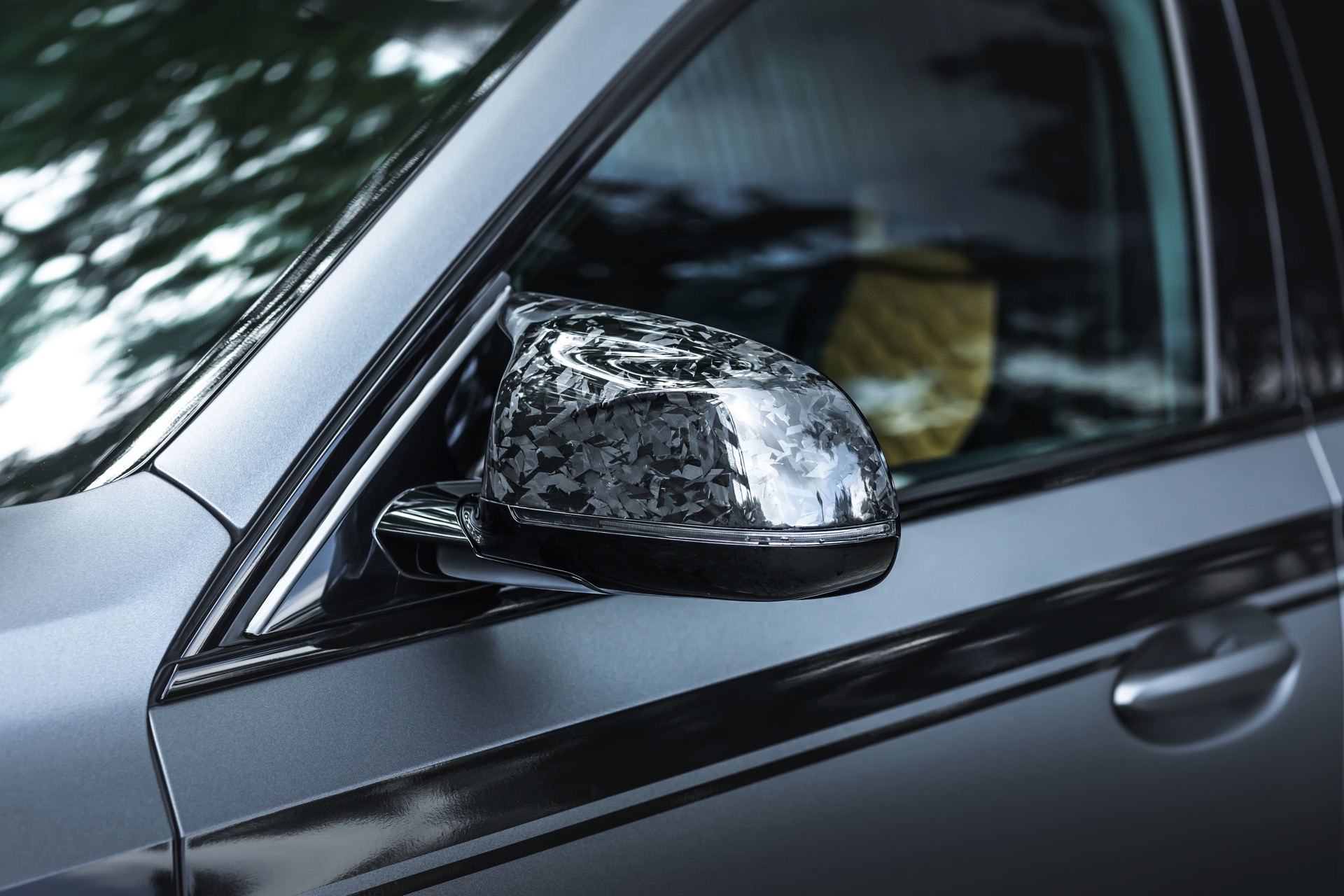 Im Kontext des fast 2,4 Tonnen schweren BMW X6 M F96 spielt Leichtbau aber tatsächlich die kleinere Rolle als die unverwechselbare Optik, die den Brutalo-Auftritt des Power-SUV aufs nächste Level heben. Frontspoiler, Nieren, Kotflügel-Verbreiterungen, Seitenschweller, Außenspiegel-Gehäuse, Heckspoiler, Diffusor-Einsatz und selbst die Motorhaube sind sichtbar aus Forged Carbon gefertigt, auch wenn sich im Fall der Motorhaube ein Großteil des Materials unter der matten Voll-Folierung in “Matte Charcoal Metallic” verbirgt.
