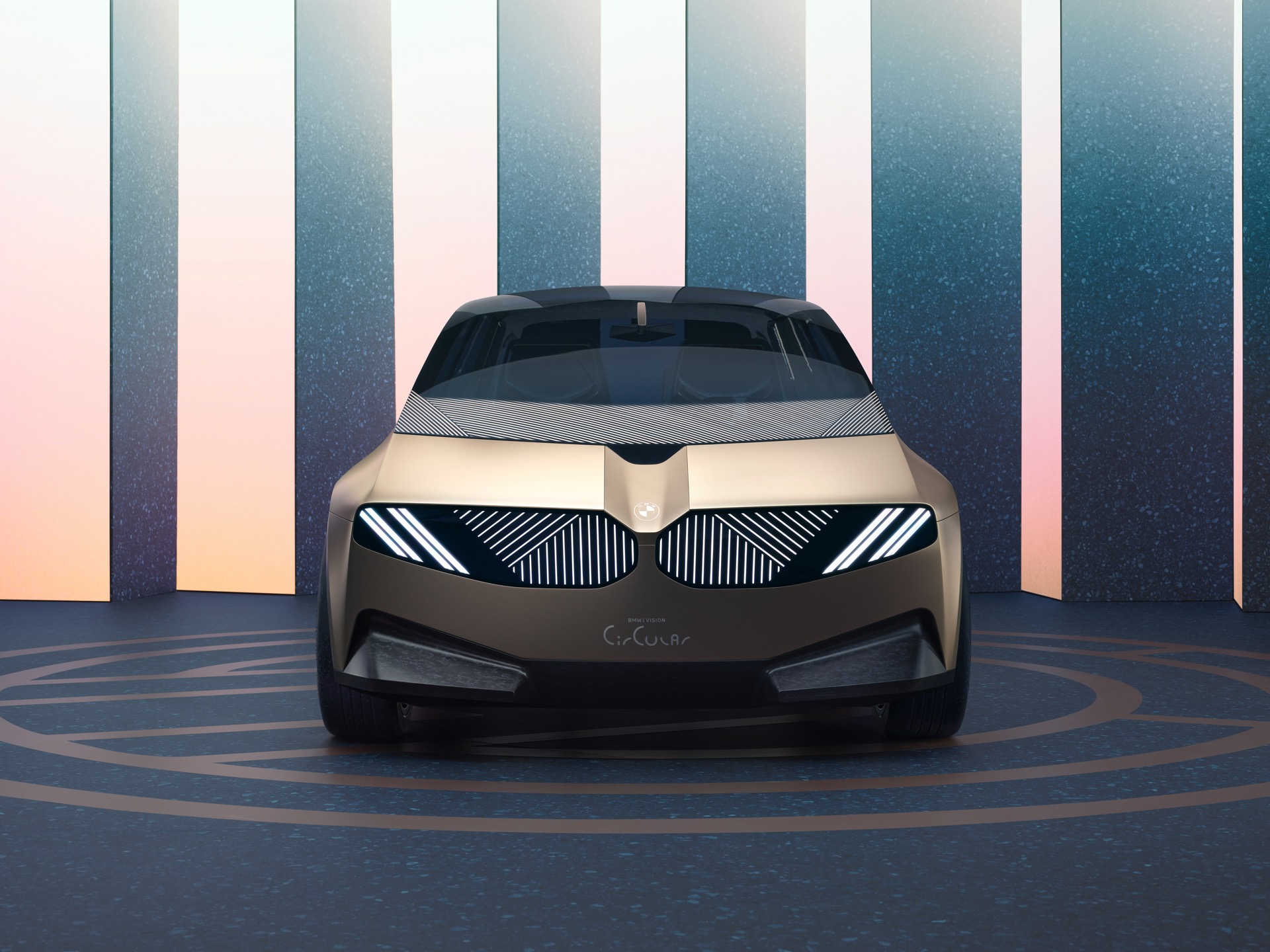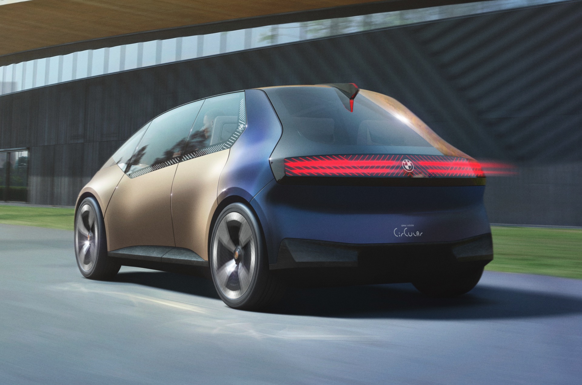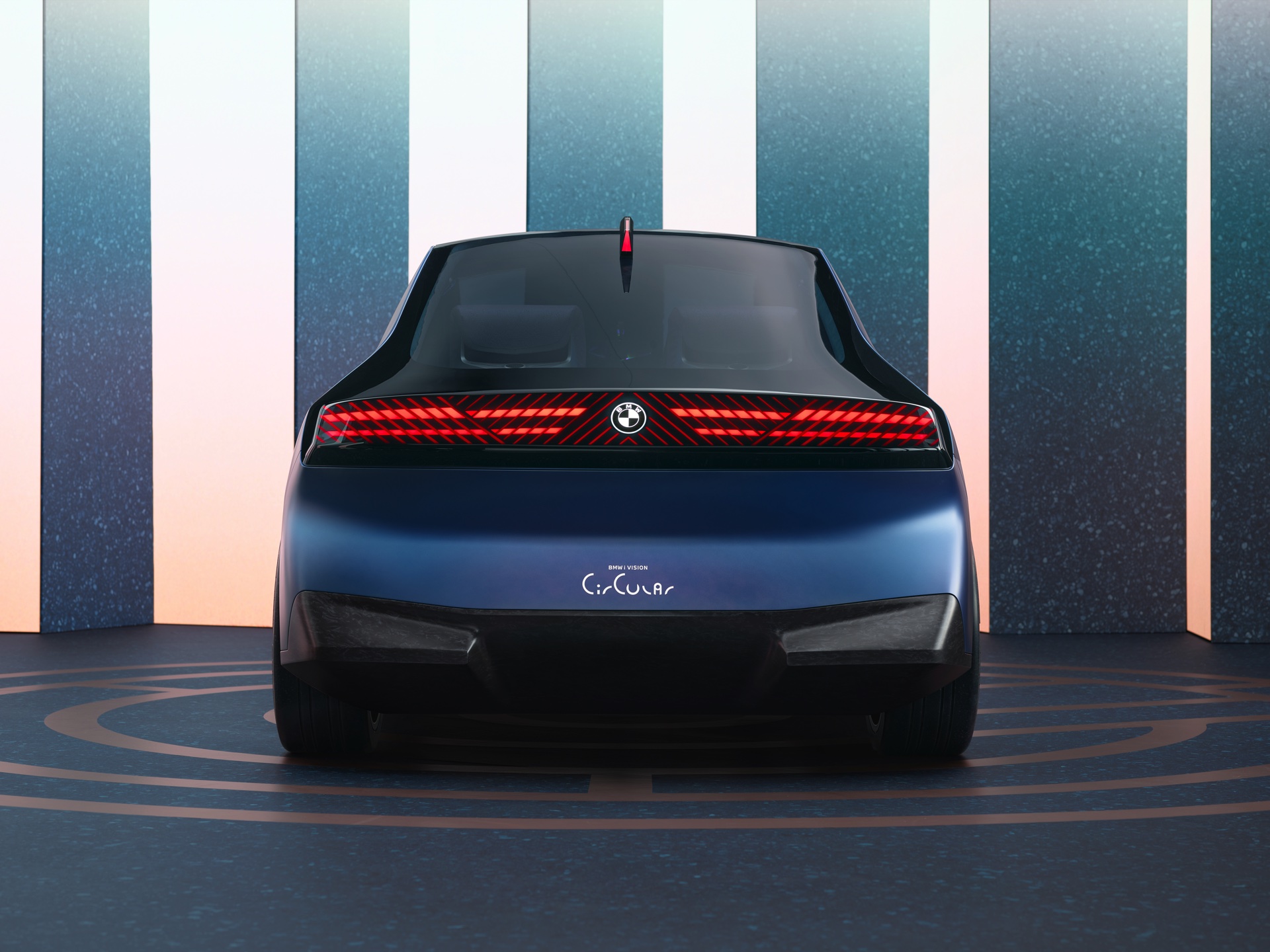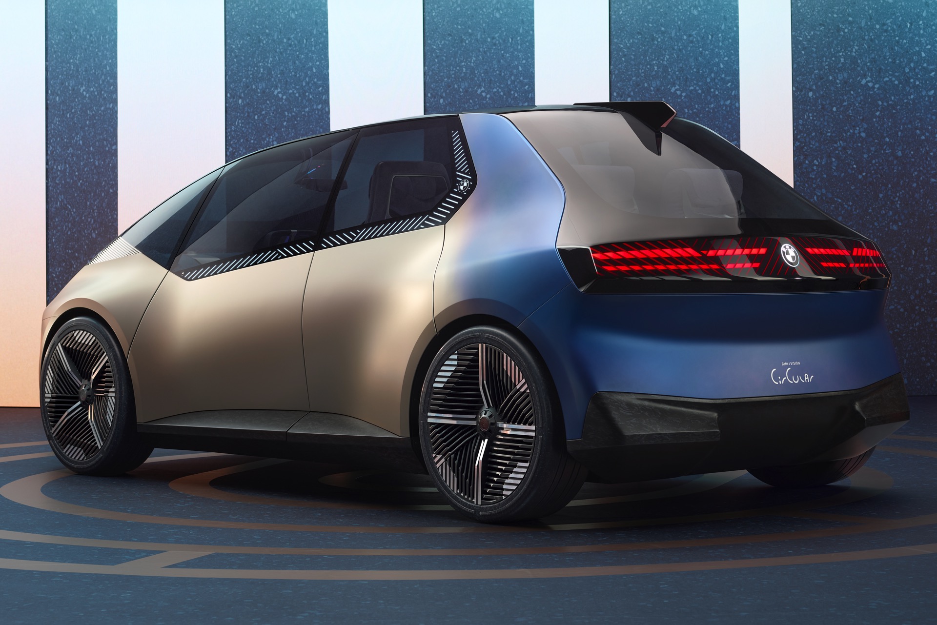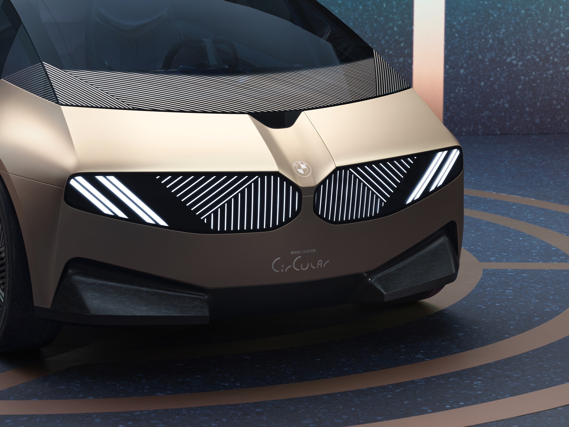 Design-Elemente wie die vollkommen neuartige Front mit einer digitalen Fläche, die zur Darstellung von Scheinwerfern und Doppel-Niere genutzt wird, zeigen ebenfalls vollkommen neue Wege auf. Auch die Rückleuchten sind in die gesamte Breite des Hecks integriert und können für verschiedene Anzeigeszenarien genutzt werden. Um unnötigen Materialverbrauch zu vermeiden, verzichtet der BMW i Vision Circular sogar auf klassische Logos und Schriftzüge: Ein eingraviertes Logo und ein gelaserter Modellschriftzug erfüllen den gleichen Zweck, sind aber viel nachhaltiger.