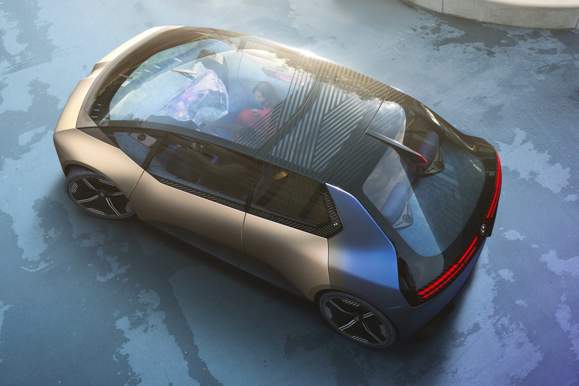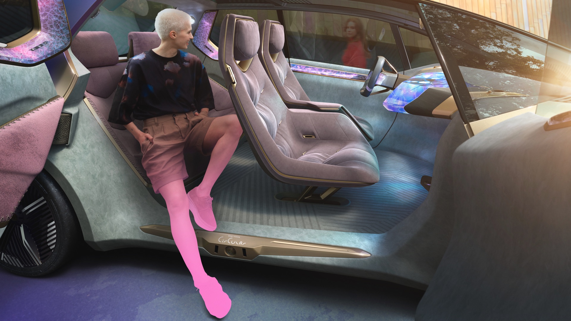 Seinen kompakten Abmessungen zum Trotz soll der Innenraum des BMW i Vision Circular an das Platzangebot heutiger Luxusklasse-Fahrzeuge erinnern. Möglich wird das natürlich auch durch den Elektroantrieb, der wesentlich weniger Platz in Anspruch nimmt als ein konventioneller Antrieb. Untypisch und innovativ ist der Ansatz, im Innenraum praktisch vollständig auf Klebstoffe zu verzichten: Wenn verschiedene Materialien verbunden werden sollen, kommen smarte und wieder lösbare Verbindungen zum Einsatz. Dieser Ansatz macht eine spätere Demontage und ein Recycling der Einzelmaterialien wesentlich einfacher.