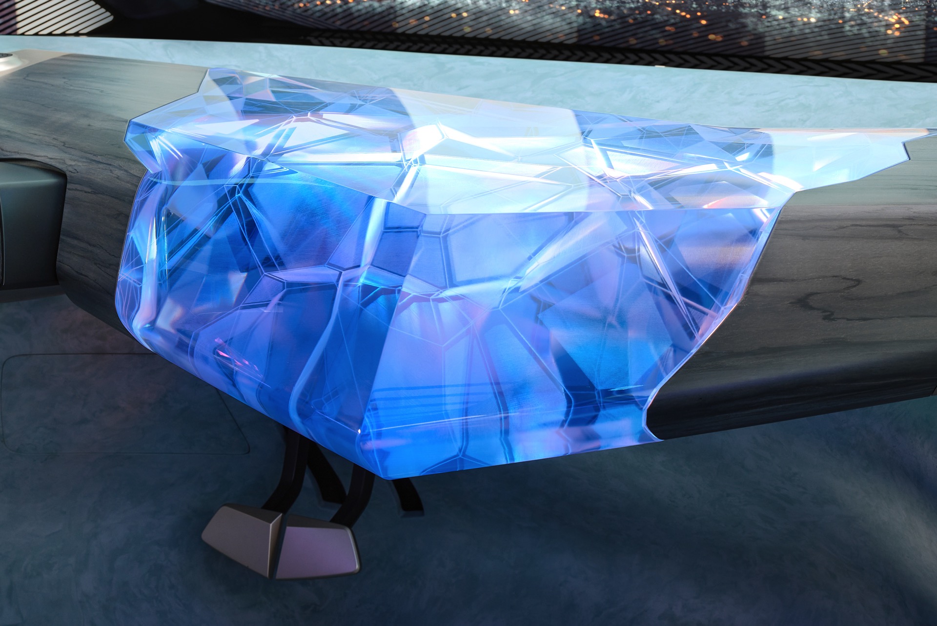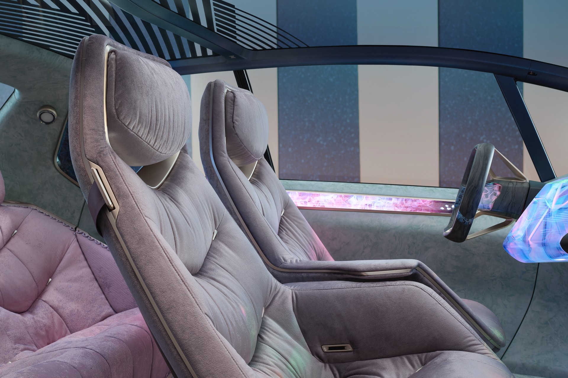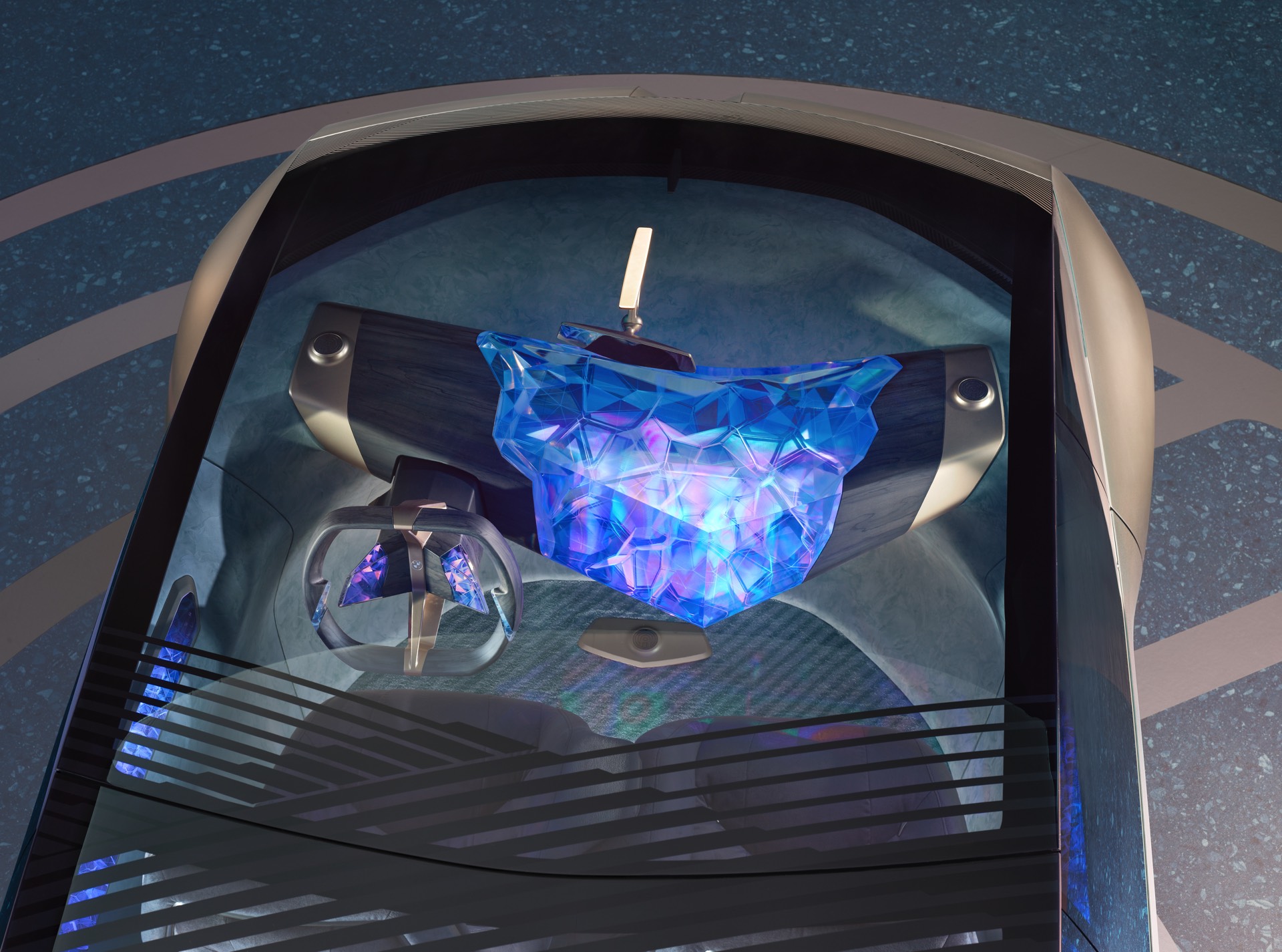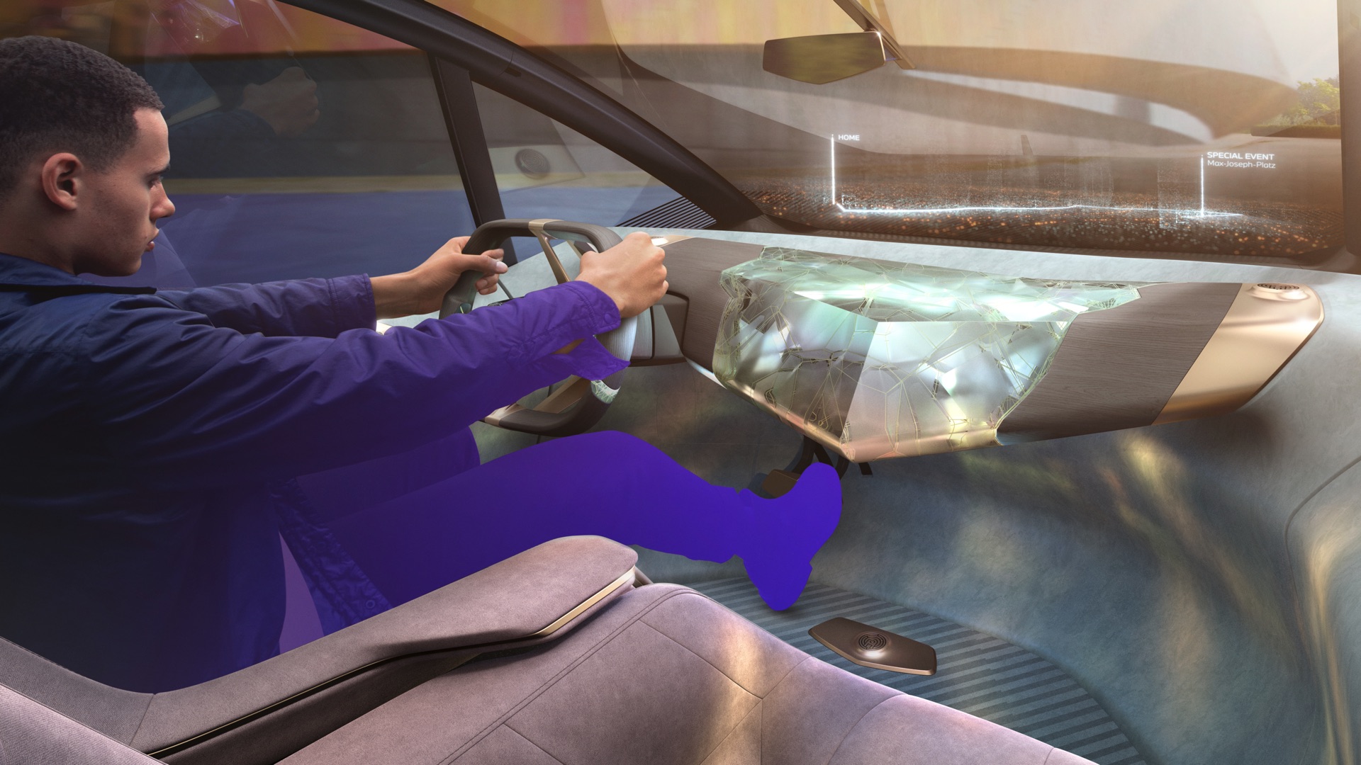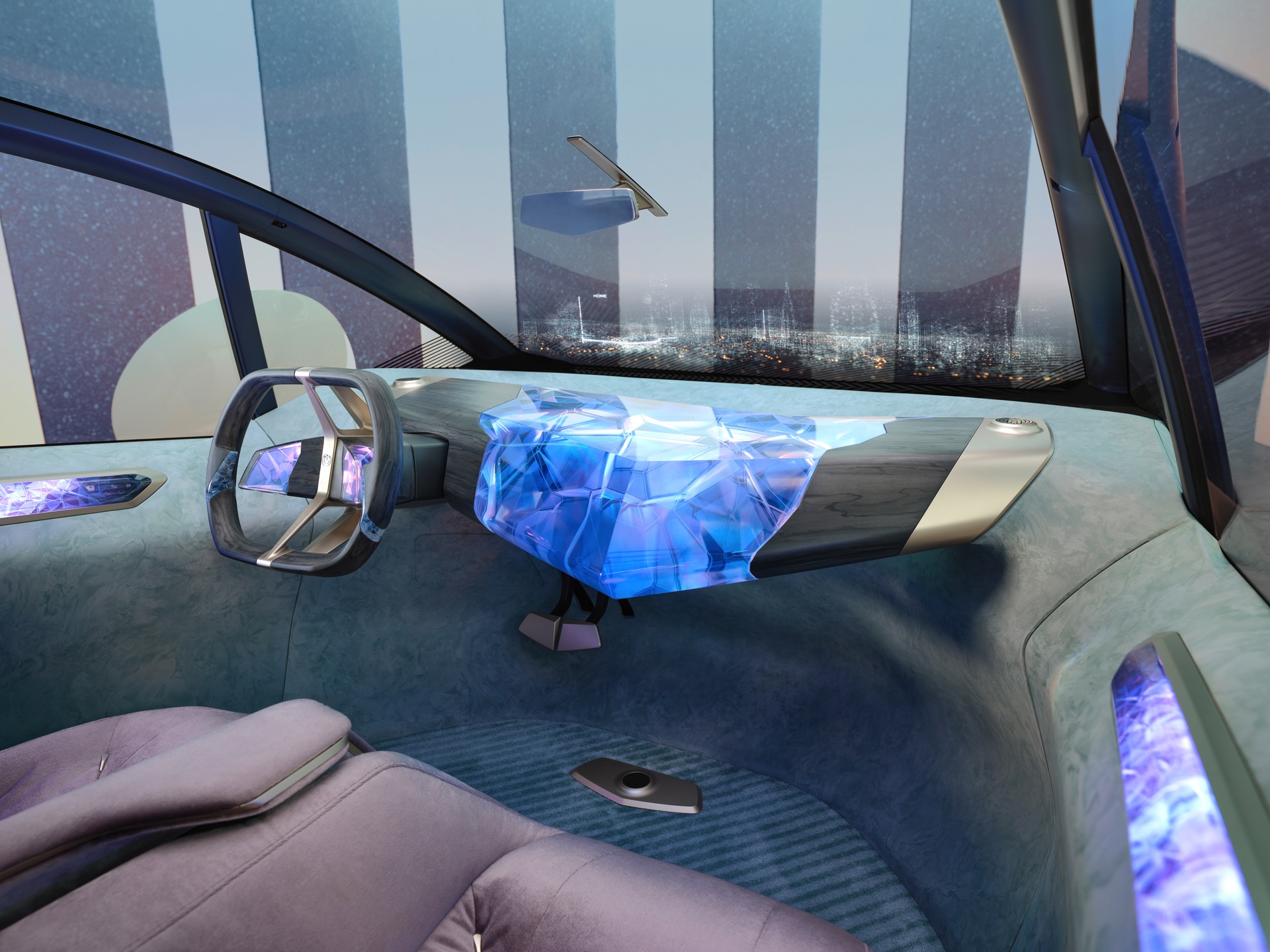Bemerkenswert ist aber auch, worauf der BMW i Vision Circular nicht verzichtet: Auch im Jahr 2040 sehen die BMW-Designer noch Bedarf für ein relativ konventionelles Lenkrad und eine Pedalerie mit Brems- und Fahrpedal, das autonome Fahren hat den Fahrer also noch nicht vollkommen überflüssig gemacht. Das Head-up-Display erstreckt sich über den gesamten unteren Bereich der Frontscheibe und das Infotainment-System lässt sich ohne eine heute gewohnte Form von Controller bedienen, stattdessen gibt es einen großen zentralen Körper zur Bedienung der Fahrzeug-Systeme.