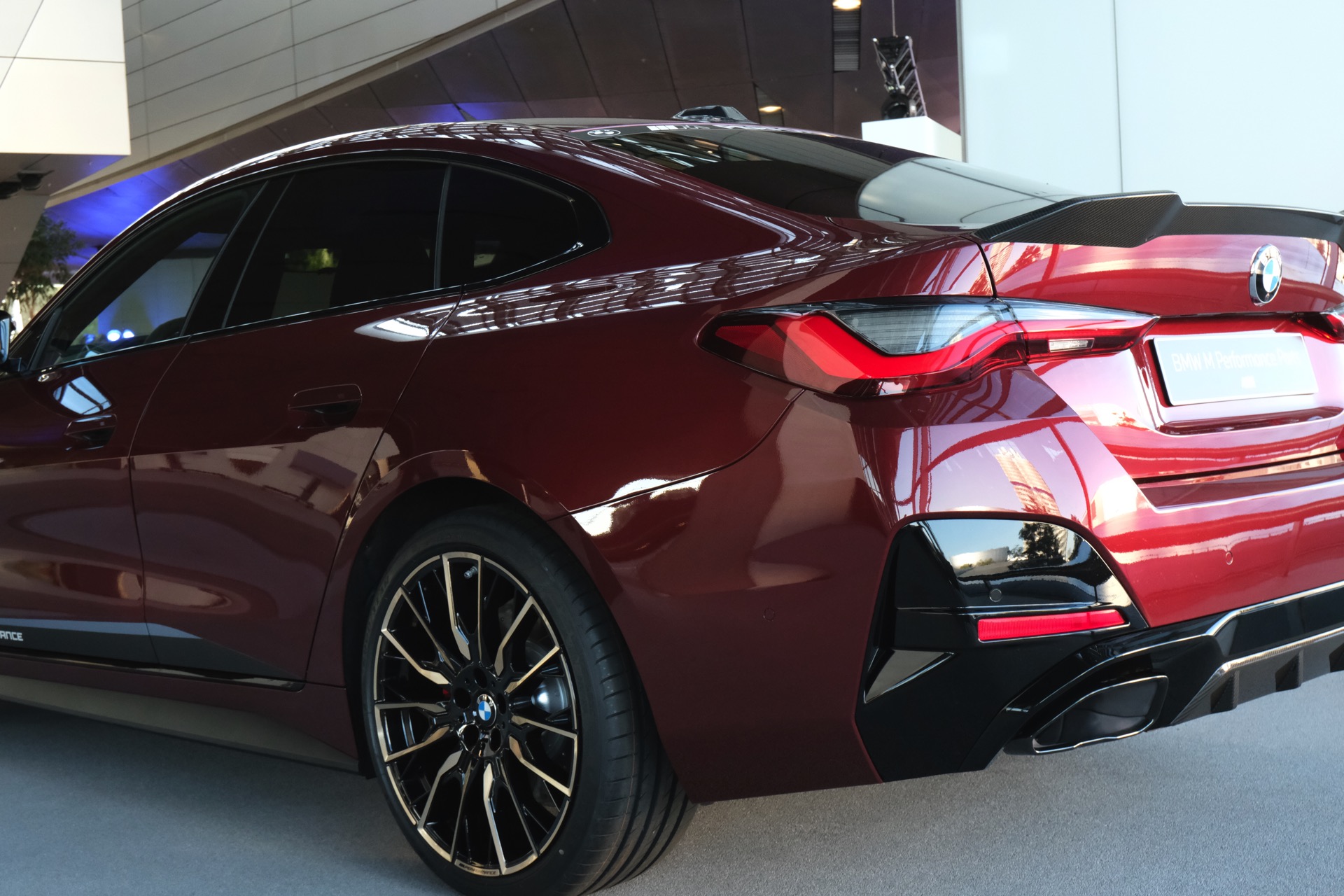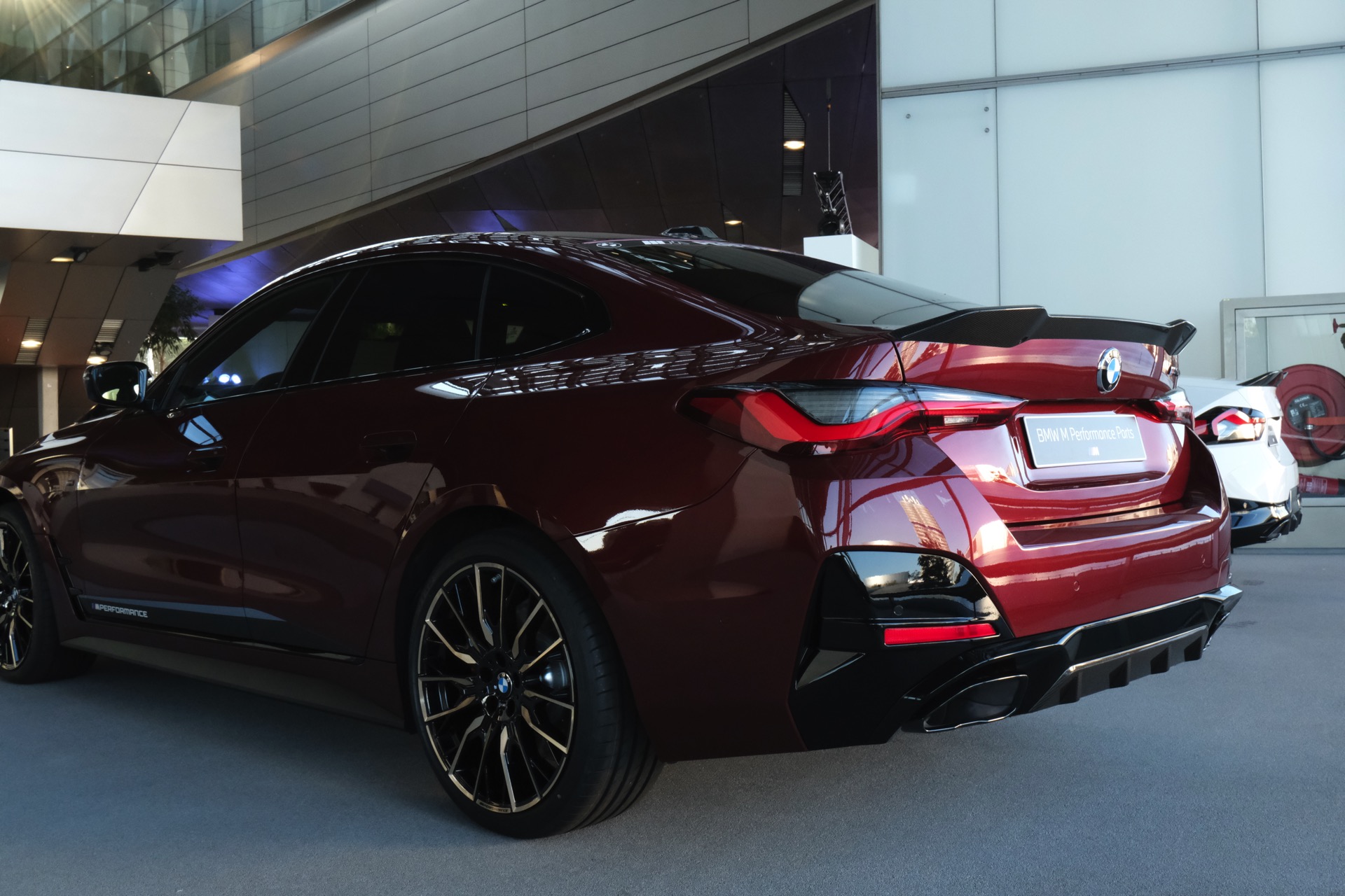 Bei beiden Konfigurationen wird das Aventurinrot des BMW 4er Gran Coupé G26 mit dunklen Akzenten kombiniert, wobei sich einige davon im Fall des M Performance Tuning-Zubehörs bei genauerer Betrachtung als Carbon-Bauteile entpuppen. Neben der seitlichen Beklebung umfasst das Programm auch einen Frontsplitter-Aufsatz, eine stark ausgeformte Spoilerlippe und einen aus Carbon gefertigten Diffusor-Einsatz für die Heckschürze. Außerdem sind über das Tuning-Zubehör auch Carbon-Außenspiegel-Gehäuse und weitere Felgen-Designs erhältlich, mit denen sich der sportliche Look abrunden lässt.