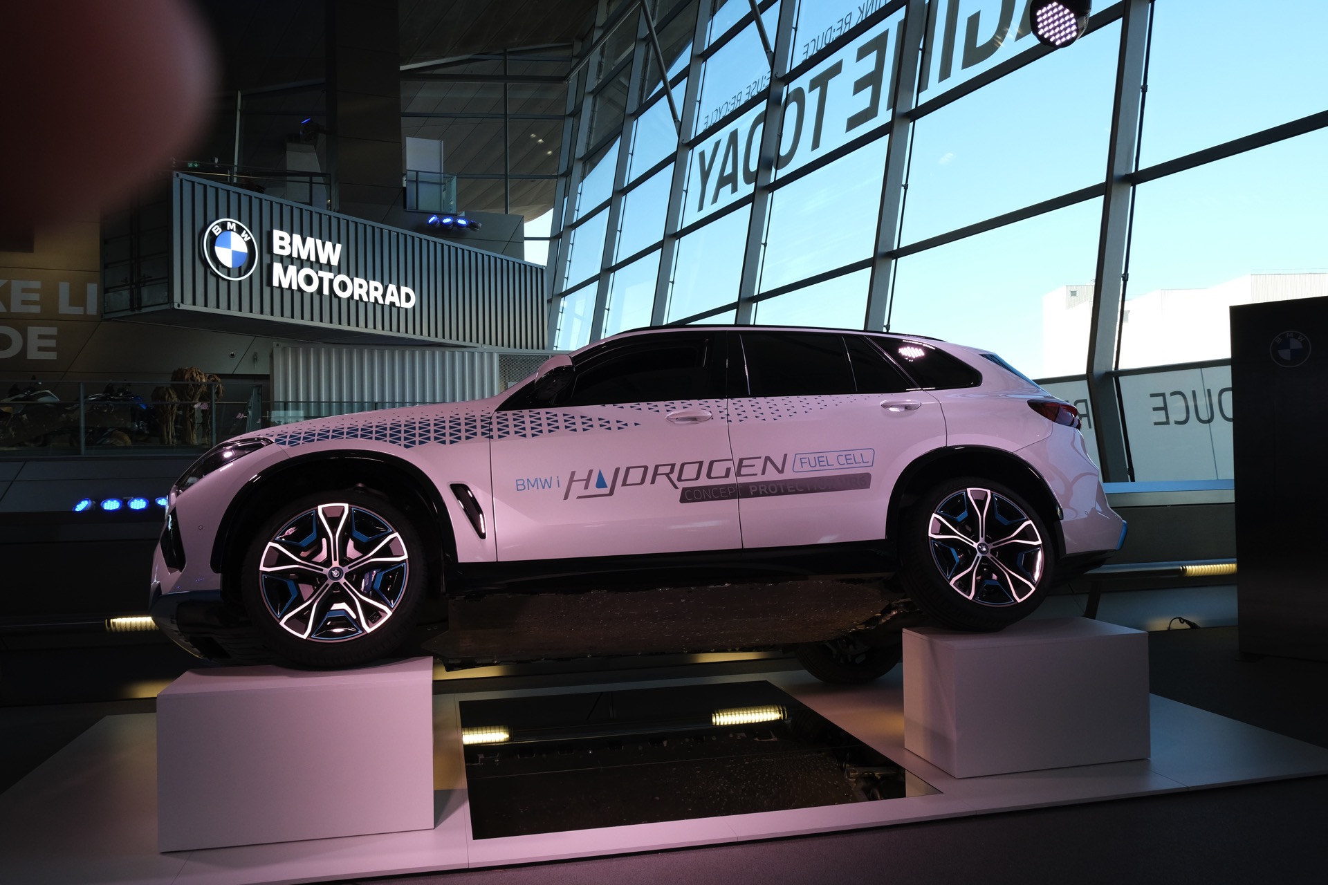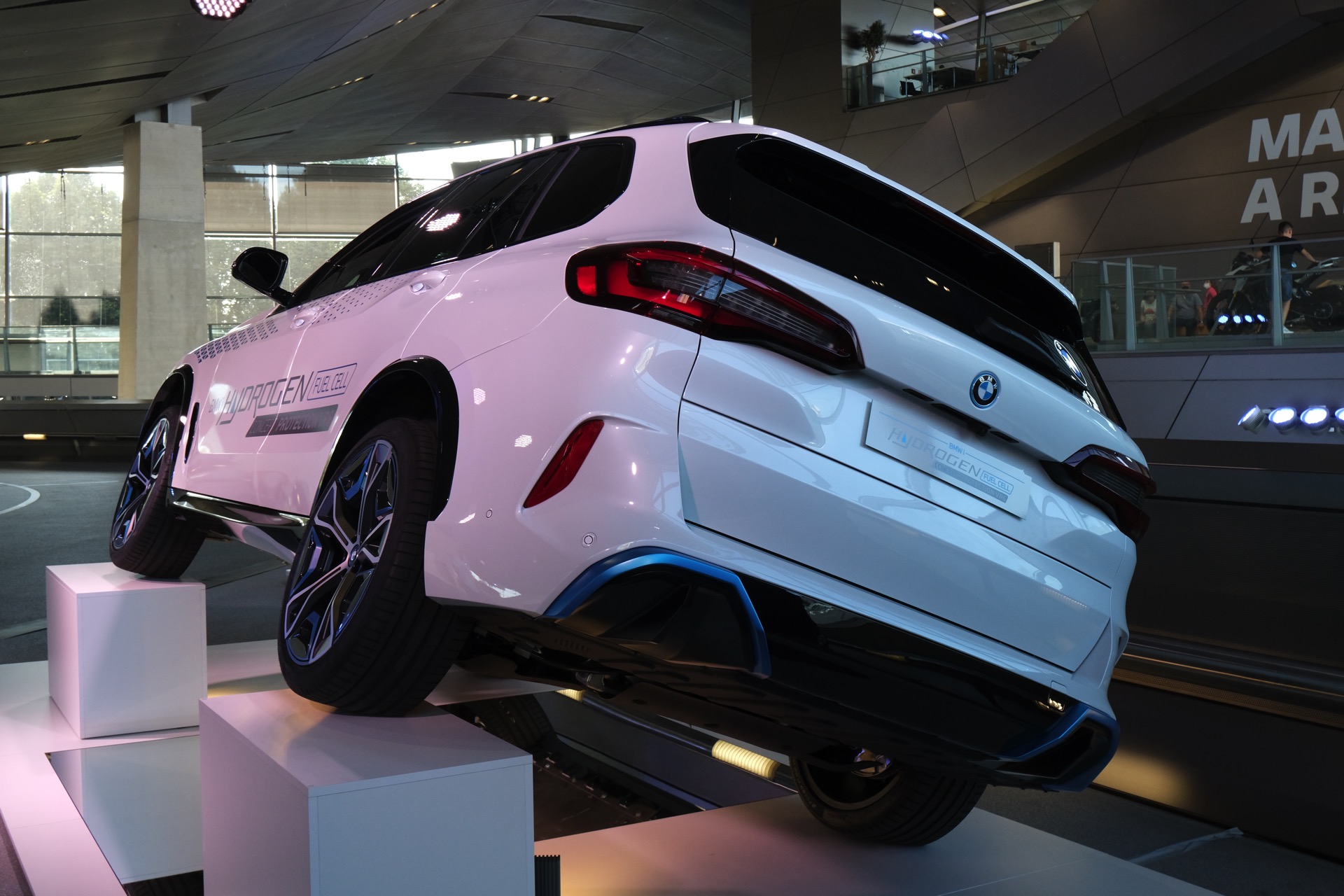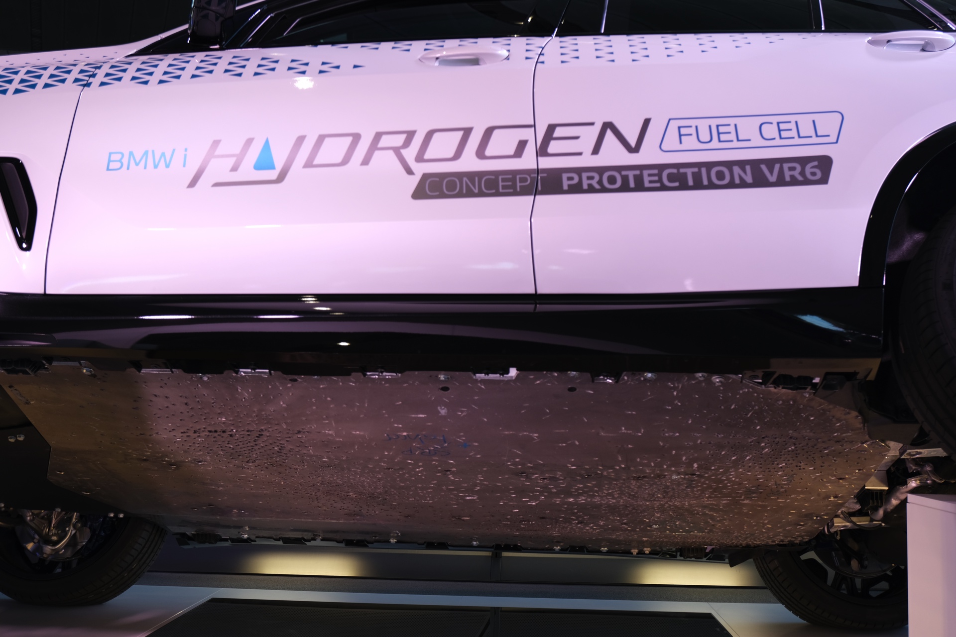 Der BMW iX5 Hydrogen Protection ist dafür mit Formteilen aus hochfestem Stahl und einer rund 30 Millimeter starken Sicherheits-Verglasung ausgestattet. Wesentlicher Bestandteil des Sicherheits-Ansatzes ist aber auch in diesem Fall, dass die Panzerung möglichst unsichtbar sein soll, denn ein offensichtlich geschütztes Fahrzeug würde nur unnötige Aufmerksamkeit auf das Auto und seine Insassen lenken. Auch der in der BMW Welt ausgestellte BMW iX5 Hydrogen Protection zeigt seine Panzerung deshalb nicht auf den ersten Blick, sondern erst bei genauerem Hinsehen – etwa am Unterboden.