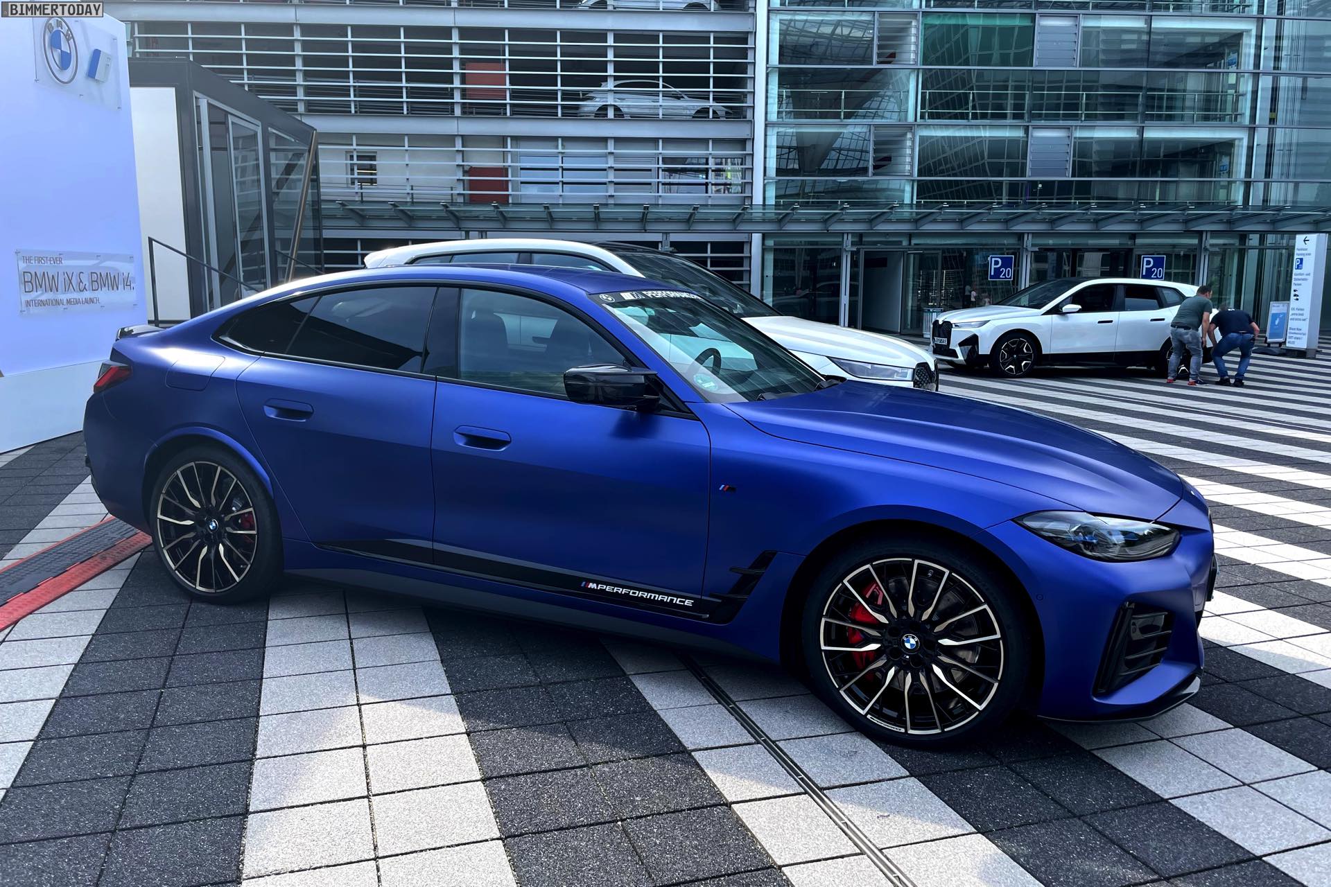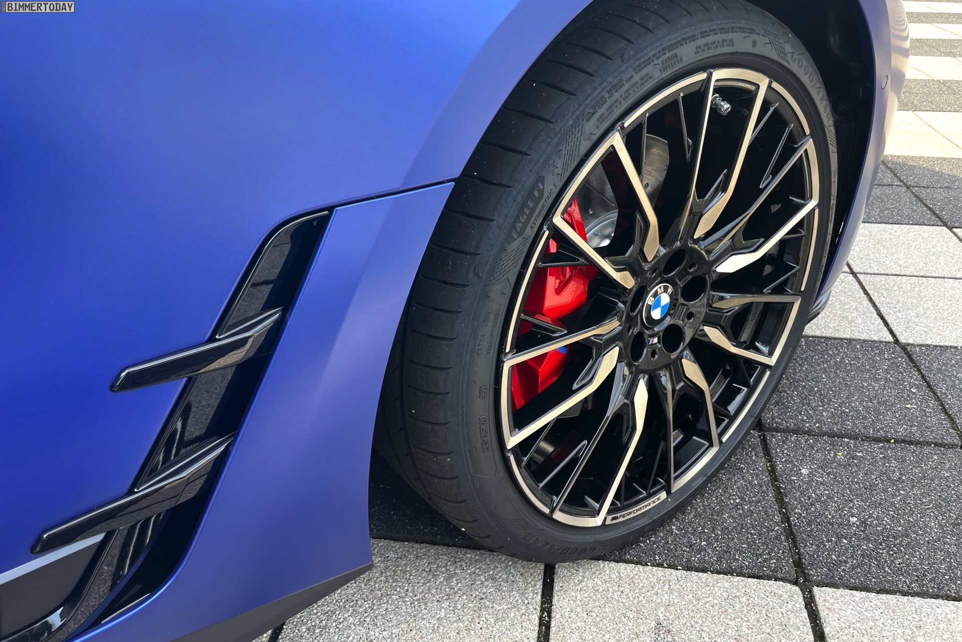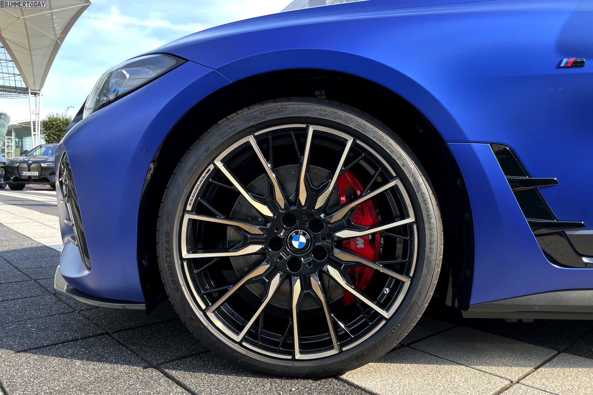 Einen genaueren Blick verdienen auch die Felgen, denn der gezeigte BMW i4 M50 trägt die M Performance-Ausprägung der 20 Zoll großen Leichtmetallräder Doppelspeiche 868 M Bicolor. Während die gleichen Räder als reguläre Sonderausstattung über glanzgedrehte Oberflächen verfügen, sind sie als M Performance-Felge mit einer dezent schimmernden Lackierung in Night Gold versehen. Für eine noch sportlichere Seitenansicht kommen außerdem die M Performance-Beklebung im unteren Bereich der Türen und die Sonnenschutzverglasung ab der B-Säule zum Einsatz.