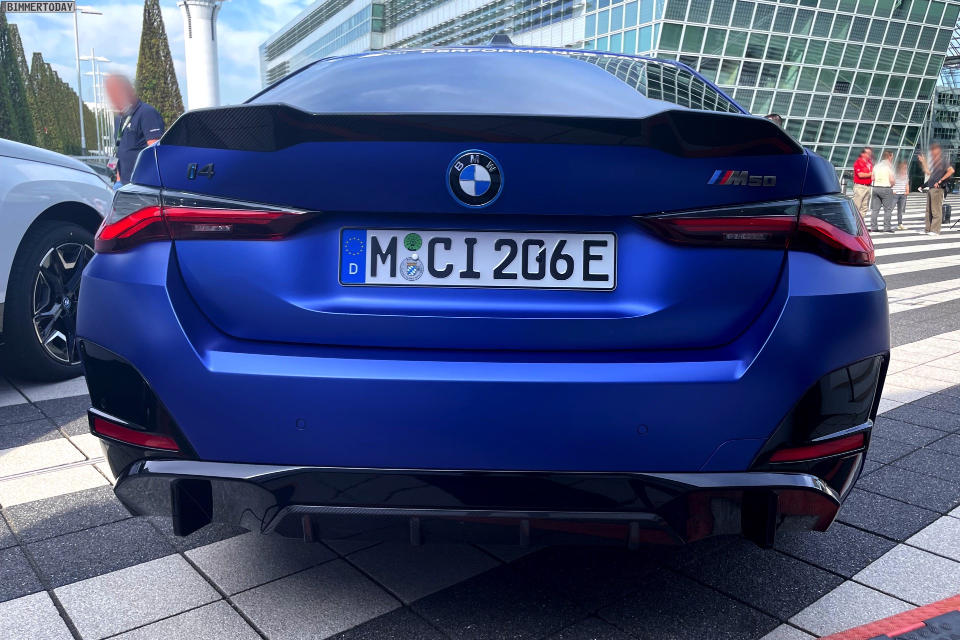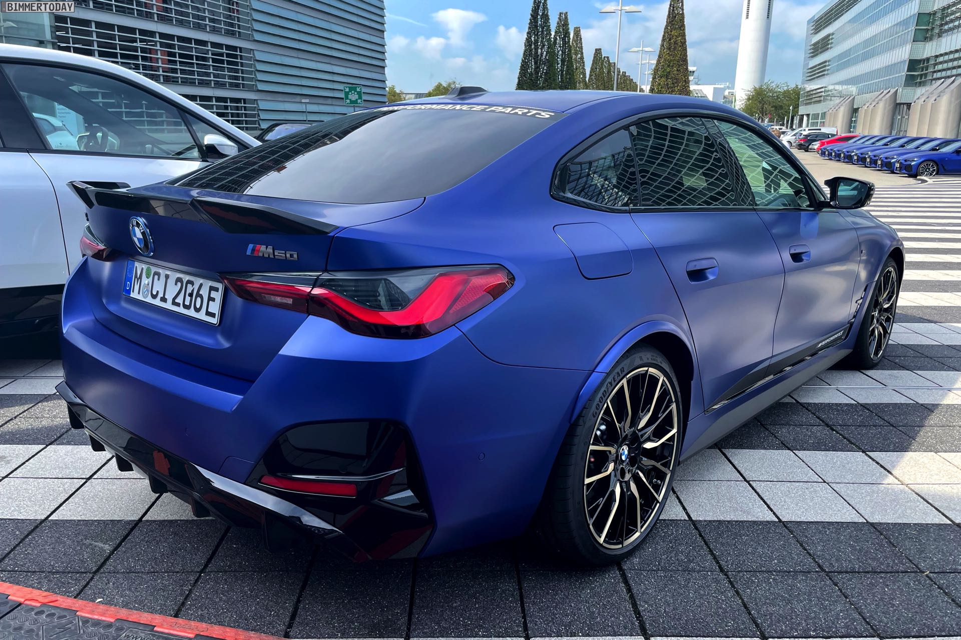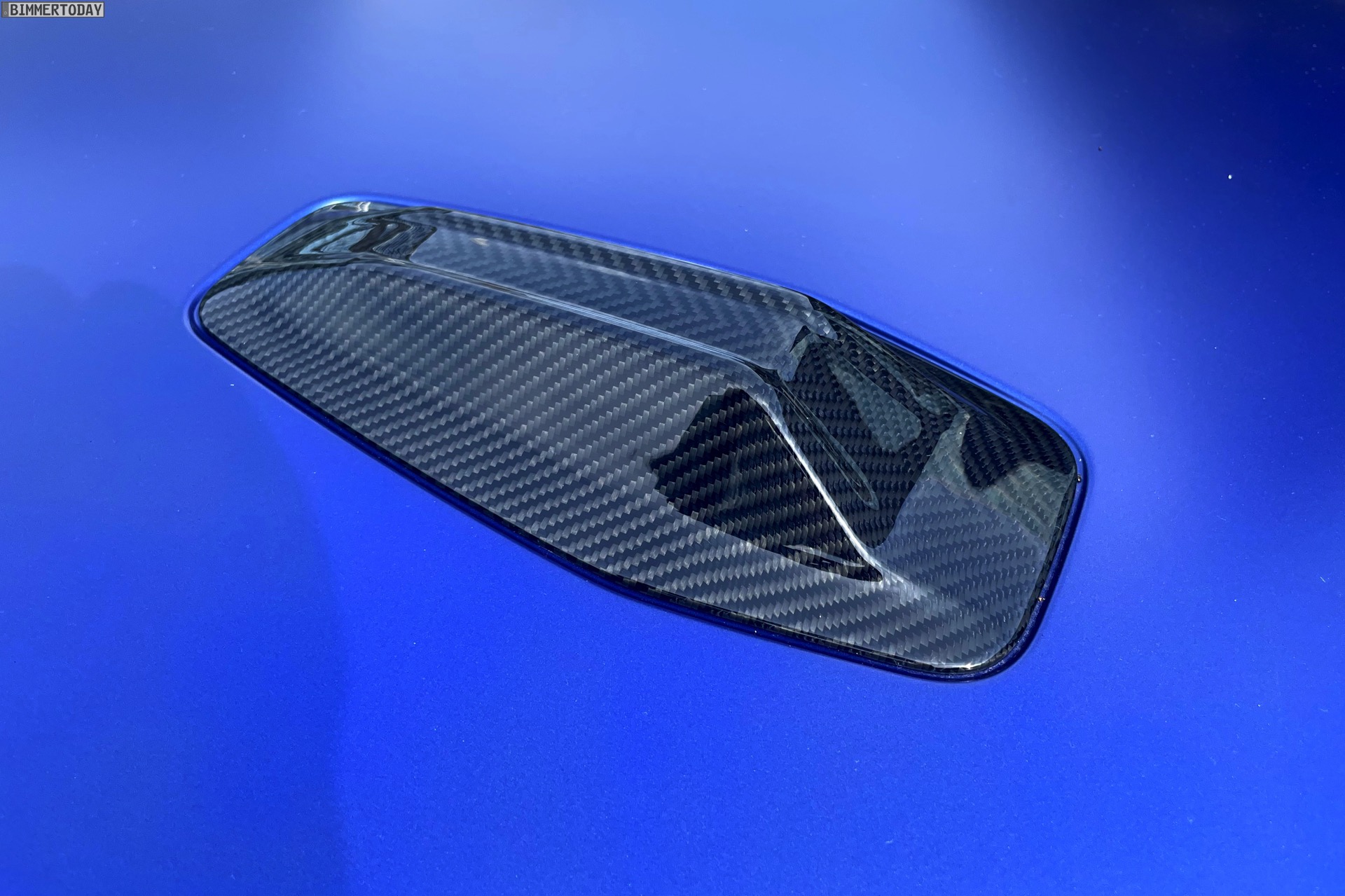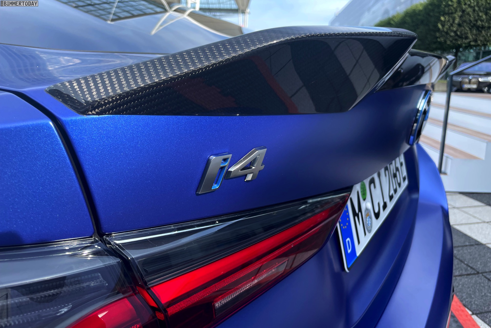 Mit vielen Carbon-Teilen aus dem BMW M Performance Tuning-Programm kommt die sportliche Seite des BMW i4 M50 noch besser zur Geltung. Auf unseren Fotos ist der 544 PS starke Elektro-Sportler in seiner Launch-Farbe Frozen Portimao Blue zu sehen, die das Fahrzeug auch ohne M Performance Parts zu einem absoluten Hingucker macht. Durch die Kombination des ab Werk erhältlichen Carbon-Pakets Exterieur mit den hauseigenen Tuning-Teilen sind beim gezeigten Fahrzeug der Frontsplitter, die Außenspiegel-Kappen, der Diffusor-Einsatz und eine unübersehbare Heckspoiler-Lippe aus dem Hightech-Werkstoff verbaut. Ein weiterer besonderer Hingucker ist die aus Carbon gefertigte Dach-Finne, unter der sich diverse Antennen für Infotainment und Kommunikation verbergen. Im Vergleich mit früheren Modellen ist die Finne des i4 generell wesentlich flacher ausgeführt.