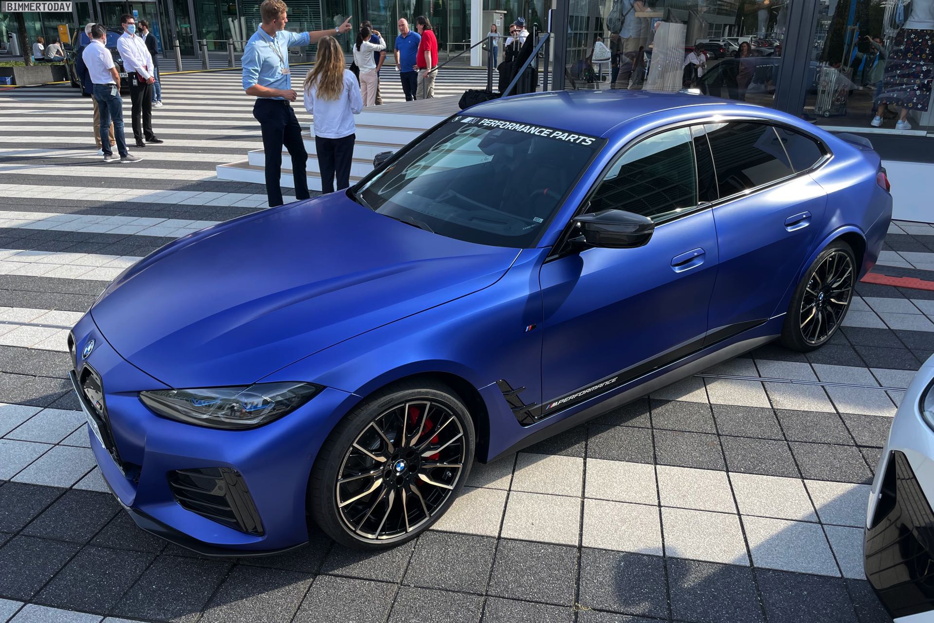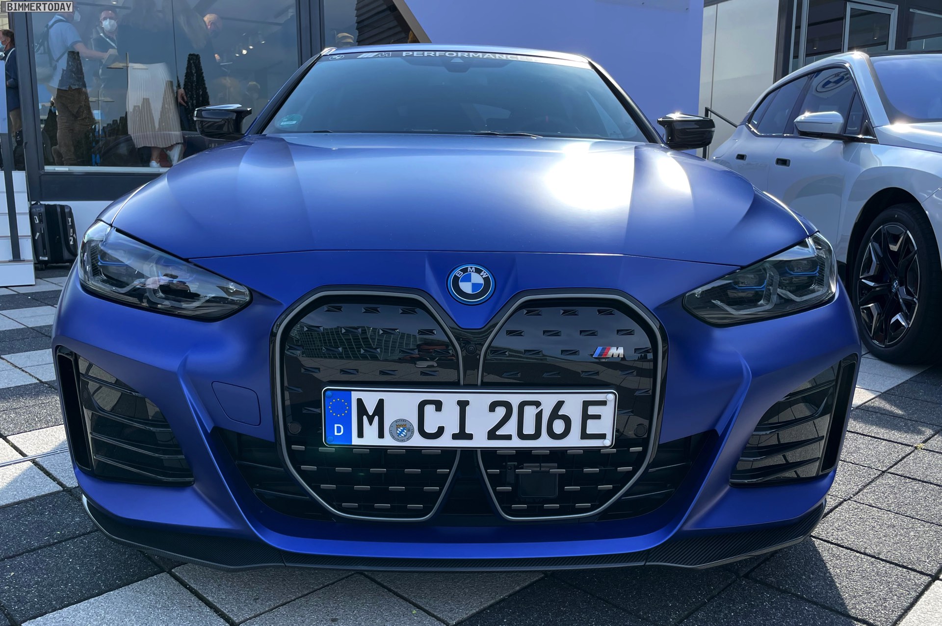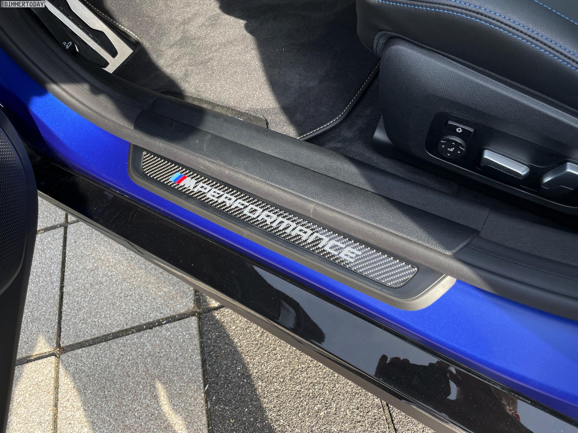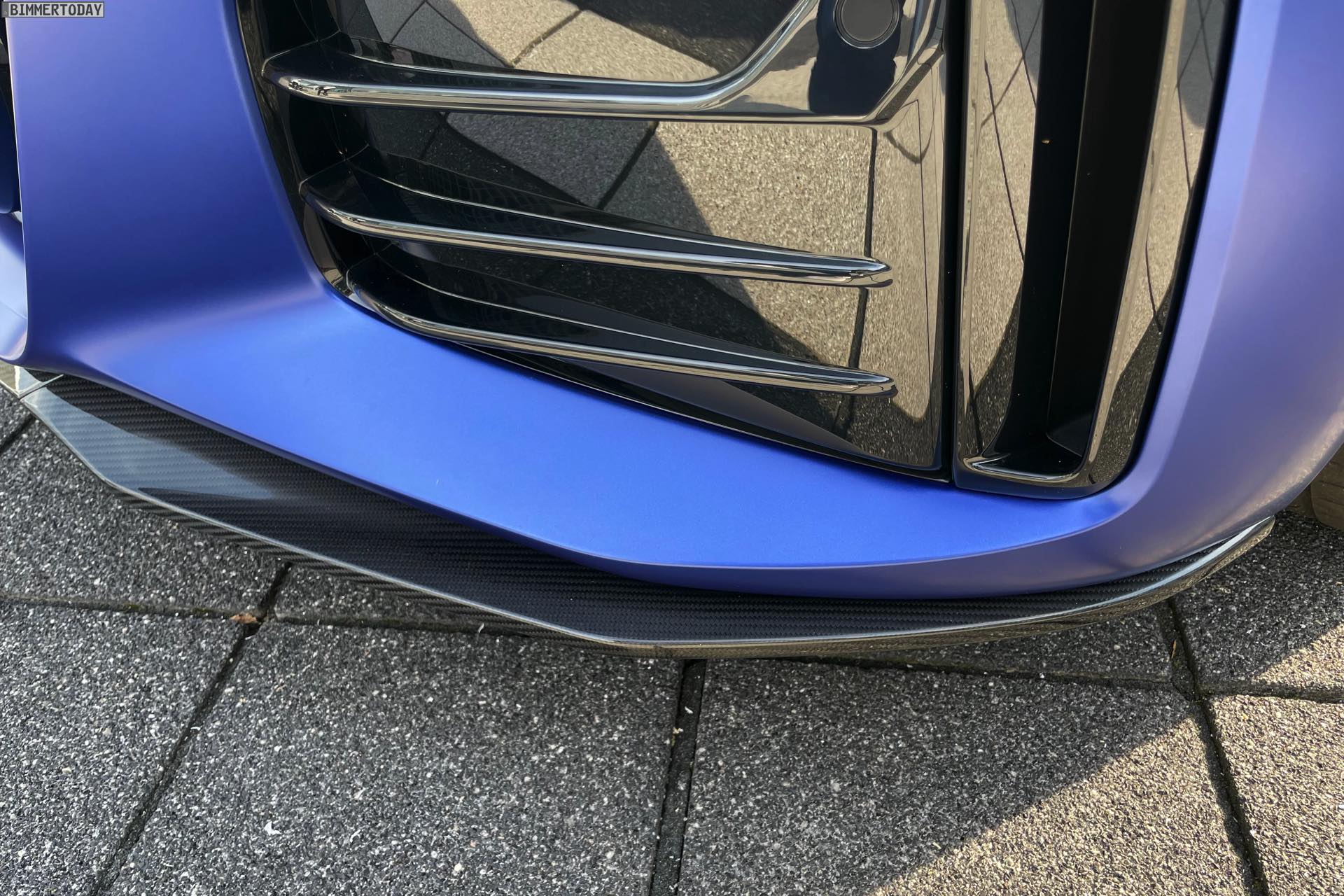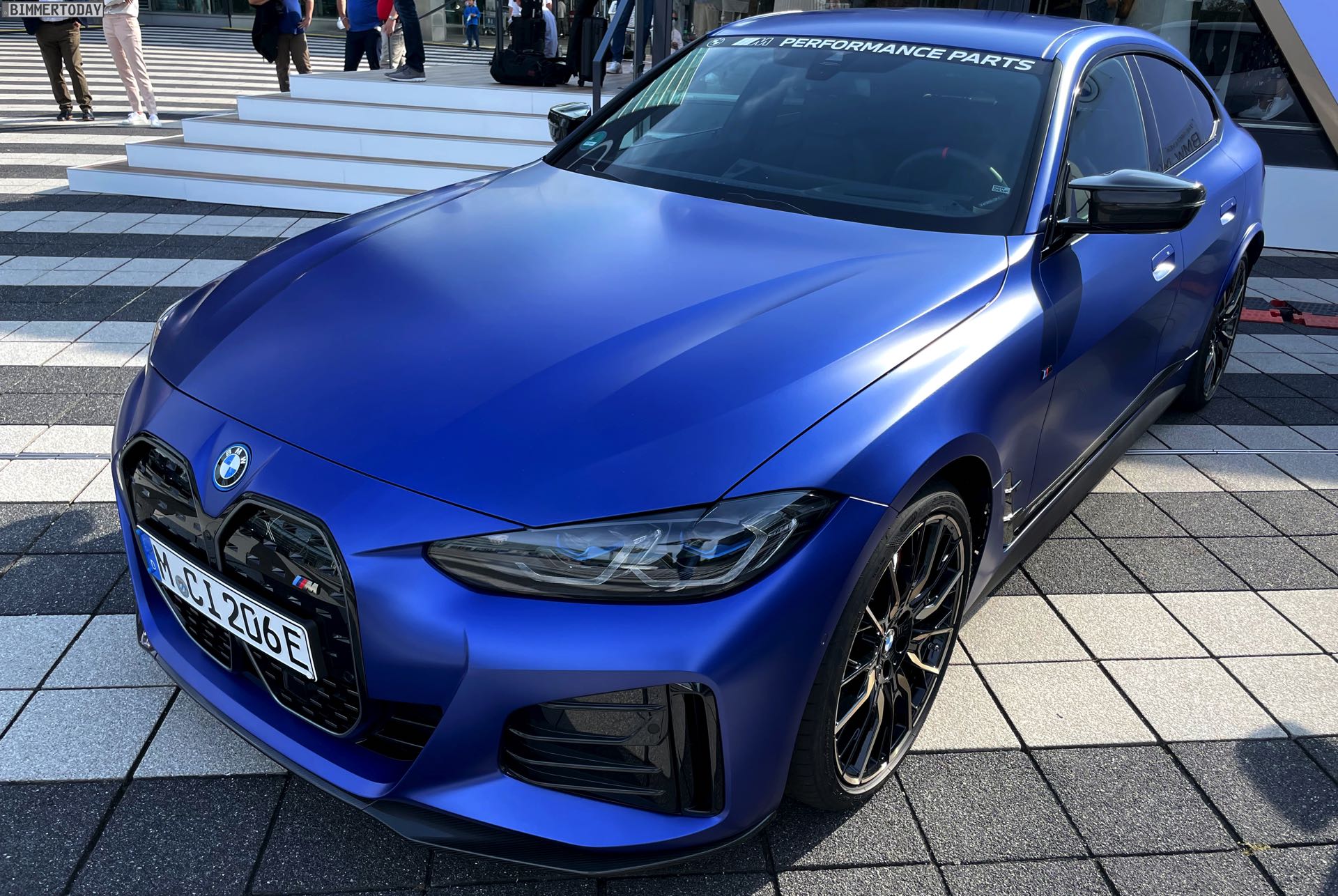 Mit vielen Carbon-Teilen aus dem BMW M Performance Tuning-Programm kommt die sportliche Seite des BMW i4 M50 noch besser zur Geltung. Auf unseren Fotos ist der 544 PS starke Elektro-Sportler in seiner Launch-Farbe Frozen Portimao Blue zu sehen, die das Fahrzeug auch ohne M Performance Parts zu einem absoluten Hingucker macht. Durch die Kombination des ab Werk erhältlichen Carbon-Pakets Exterieur mit den hauseigenen Tuning-Teilen sind beim gezeigten Fahrzeug der Frontsplitter, die Außenspiegel-Kappen, der Diffusor-Einsatz und eine unübersehbare Heckspoiler-Lippe aus dem Hightech-Werkstoff verbaut. Ein weiterer besonderer Hingucker ist die aus Carbon gefertigte Dach-Finne, unter der sich diverse Antennen für Infotainment und Kommunikation verbergen. Im Vergleich mit früheren Modellen ist die Finne des i4 generell wesentlich flacher ausgeführt.