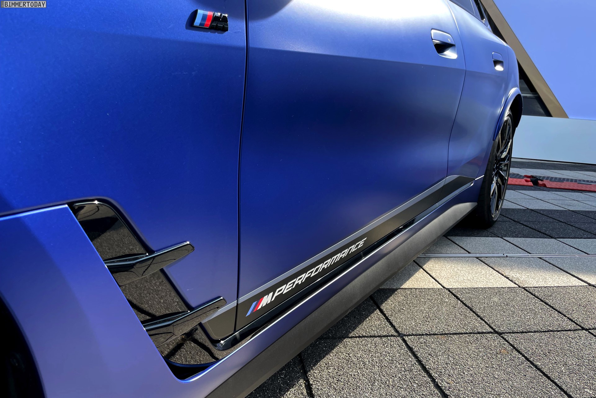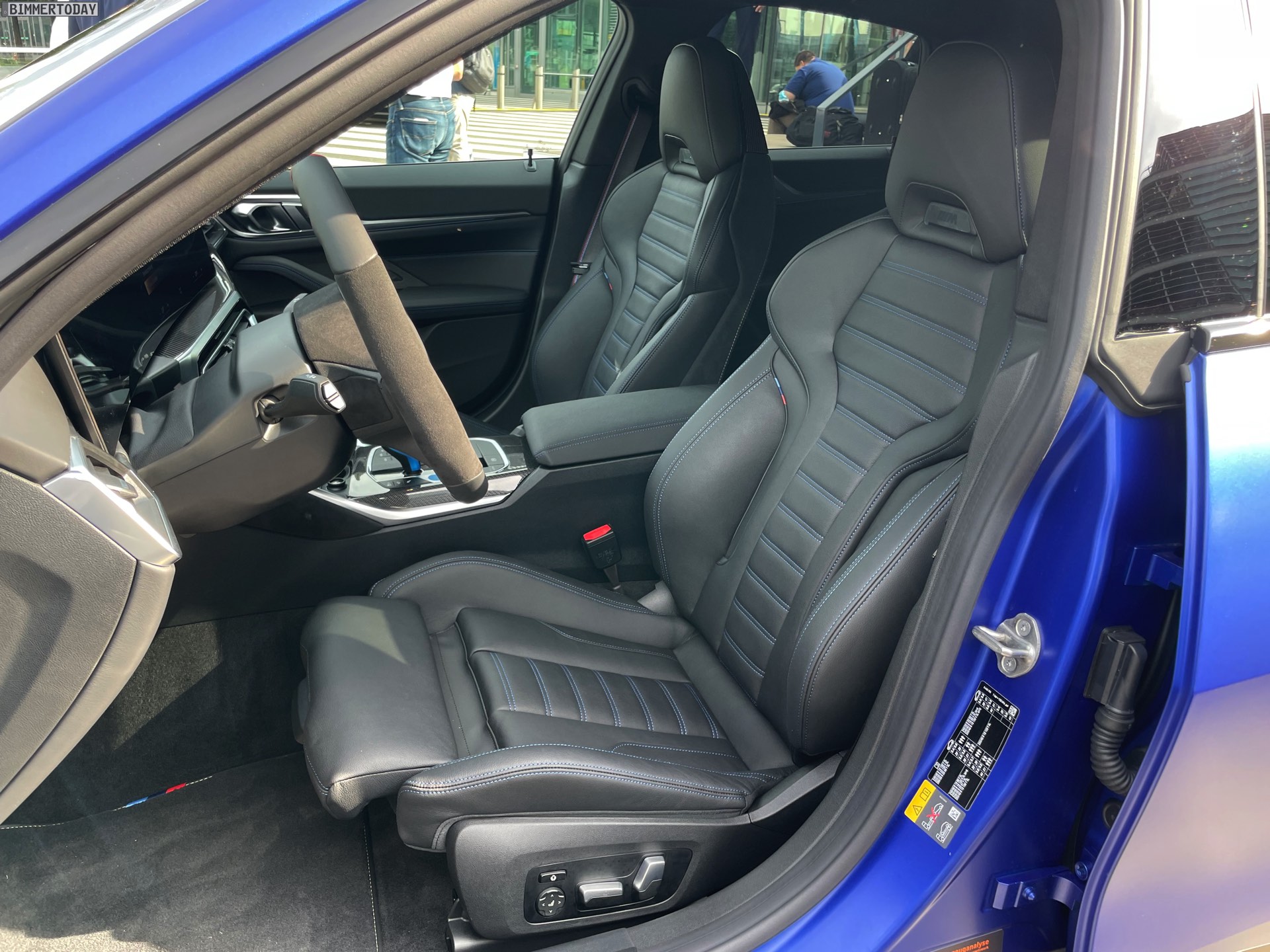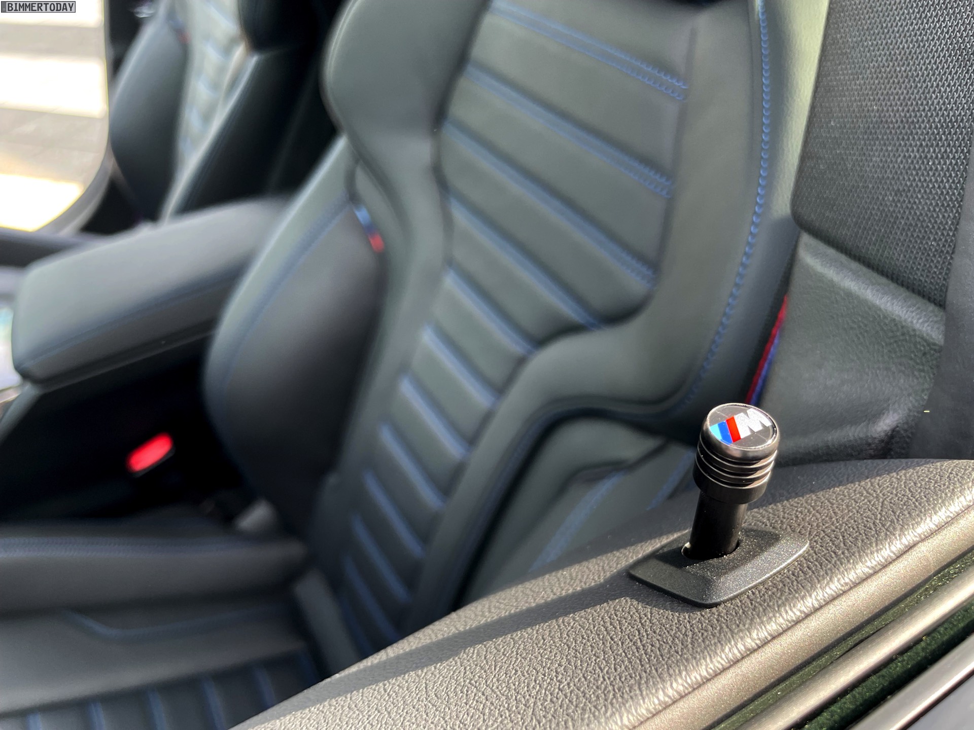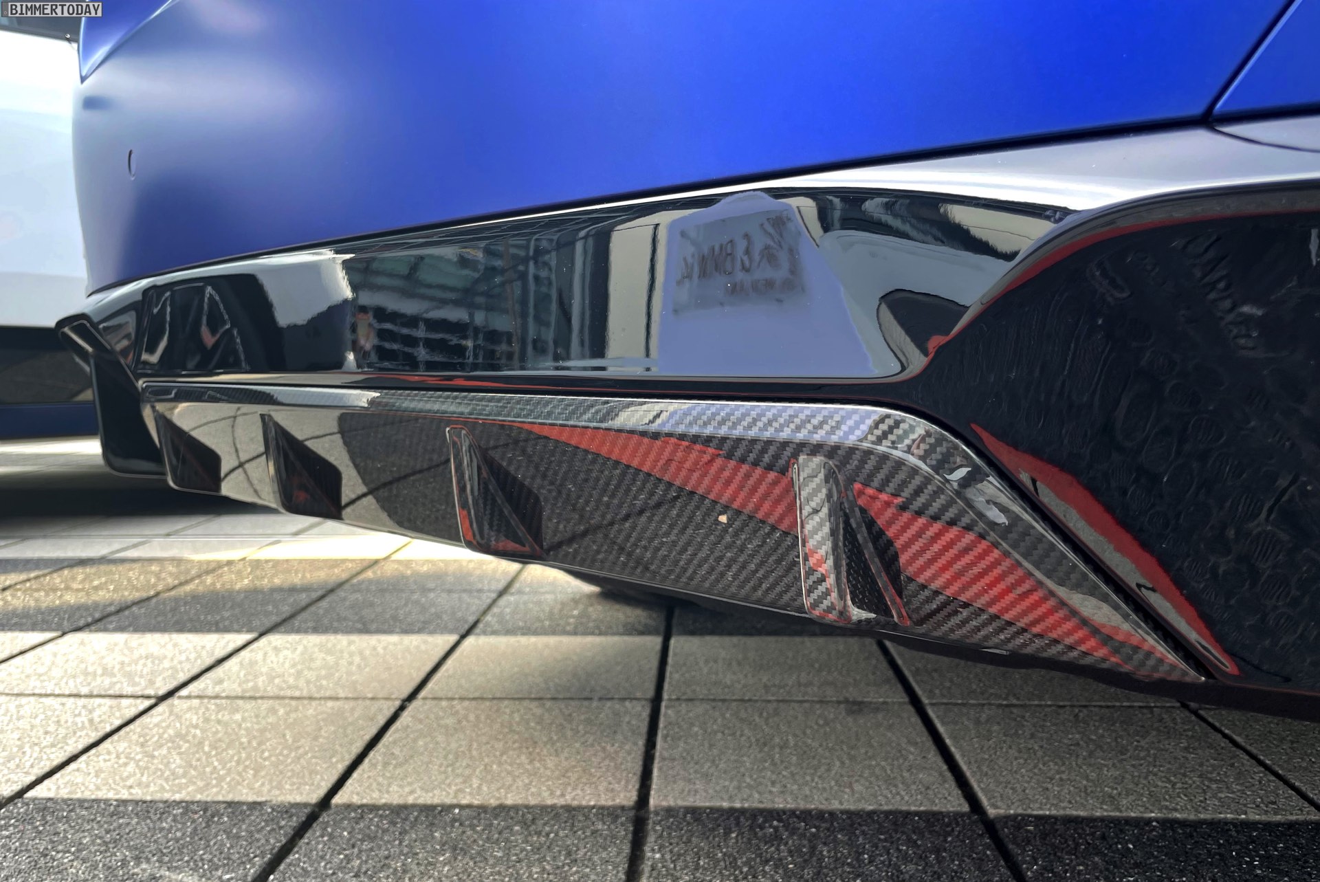 Mit vielen Carbon-Teilen aus dem BMW M Performance Tuning-Programm kommt die sportliche Seite des BMW i4 M50 noch besser zur Geltung. Auf unseren Fotos ist der 544 PS starke Elektro-Sportler in seiner Launch-Farbe Frozen Portimao Blue zu sehen, die das Fahrzeug auch ohne M Performance Parts zu einem absoluten Hingucker macht. Durch die Kombination des ab Werk erhältlichen Carbon-Pakets Exterieur mit den hauseigenen Tuning-Teilen sind beim gezeigten Fahrzeug der Frontsplitter, die Außenspiegel-Kappen, der Diffusor-Einsatz und eine unübersehbare Heckspoiler-Lippe aus dem Hightech-Werkstoff verbaut. Ein weiterer besonderer Hingucker ist die aus Carbon gefertigte Dach-Finne, unter der sich diverse Antennen für Infotainment und Kommunikation verbergen. Im Vergleich mit früheren Modellen ist die Finne des i4 generell wesentlich flacher ausgeführt.