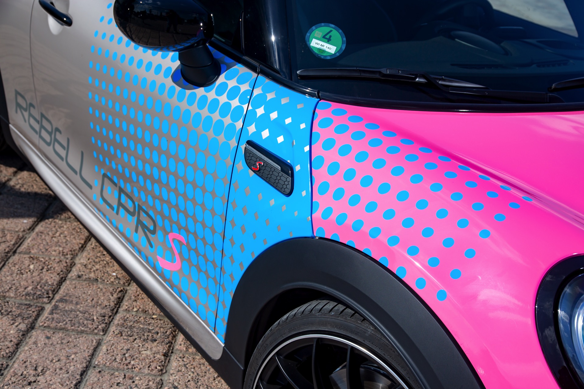 Als erstes fällt die auffällige Folierung auf: Neben der Grundfarbe Rooftop Grey, die es so auch ab Werk für den MINI gibt, wurde die Front in pink foliert. Im Bereich der Türen geht die Farbe über in ein gepunktetes Hellblau. Vom Türgriff bis zum Heck bleibt der originale Look erhalten, sodass die vielen Details der Piano Black Exterieur Werksoption, darunter der schwarze Tankdeckel, gut zur Geltung kommen. Das schwarze Panoramadach wurde um eine Folierung im gepunkteten Union Jack Design ergänzt. Zum Abschluss gibt es noch einen üppigen Heckspoiler mit “Rebell CPR S”-Schriftzug. Für Export-MINIs gibt es den Flügel auch in verstellbarer Ausführung, dann aber ohne deutscher TÜV-Genehmigung.