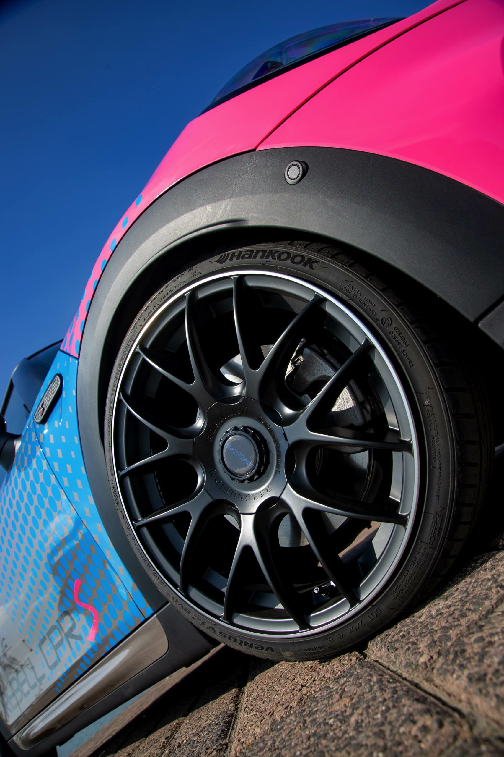 Auch aus fahrdynamischer Sicht wurde am MINI einiges verändert. So steht der Maxi-Tuner MINI Cooper S rundum auf 18-Zoll-Felgen mit Hankook-Bereifung im Format 215/35 R18. Vorne sind die Felgen schwarz, hinten blaugrau lackiert. Außerdem wurde das Fahrzeug mit dem hauseigenen Conquistador-Gewindefahrwerk „sport plus“ tiefergelegt, das auch in zwei weiteren Versionen (komfort & sport) erhältlichlich und in 20 Zugstufen eine exakte Anpassung an den persönlichen Geschmack erlaubt.