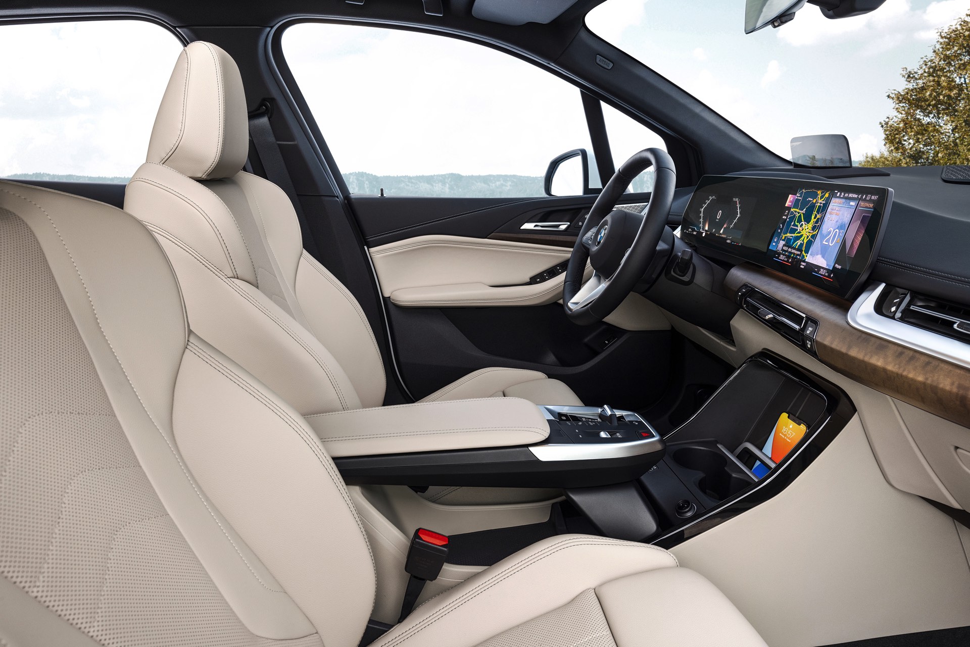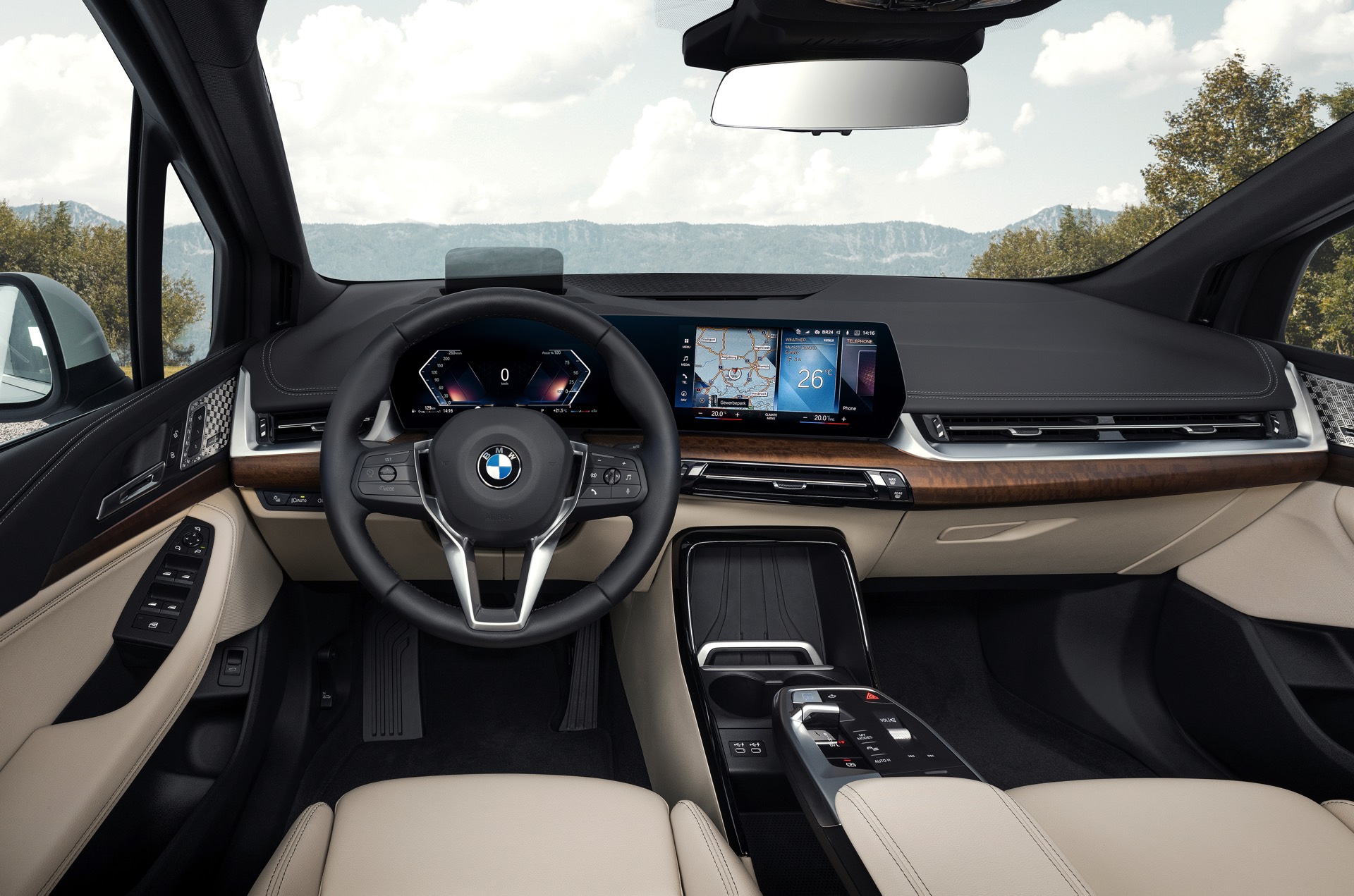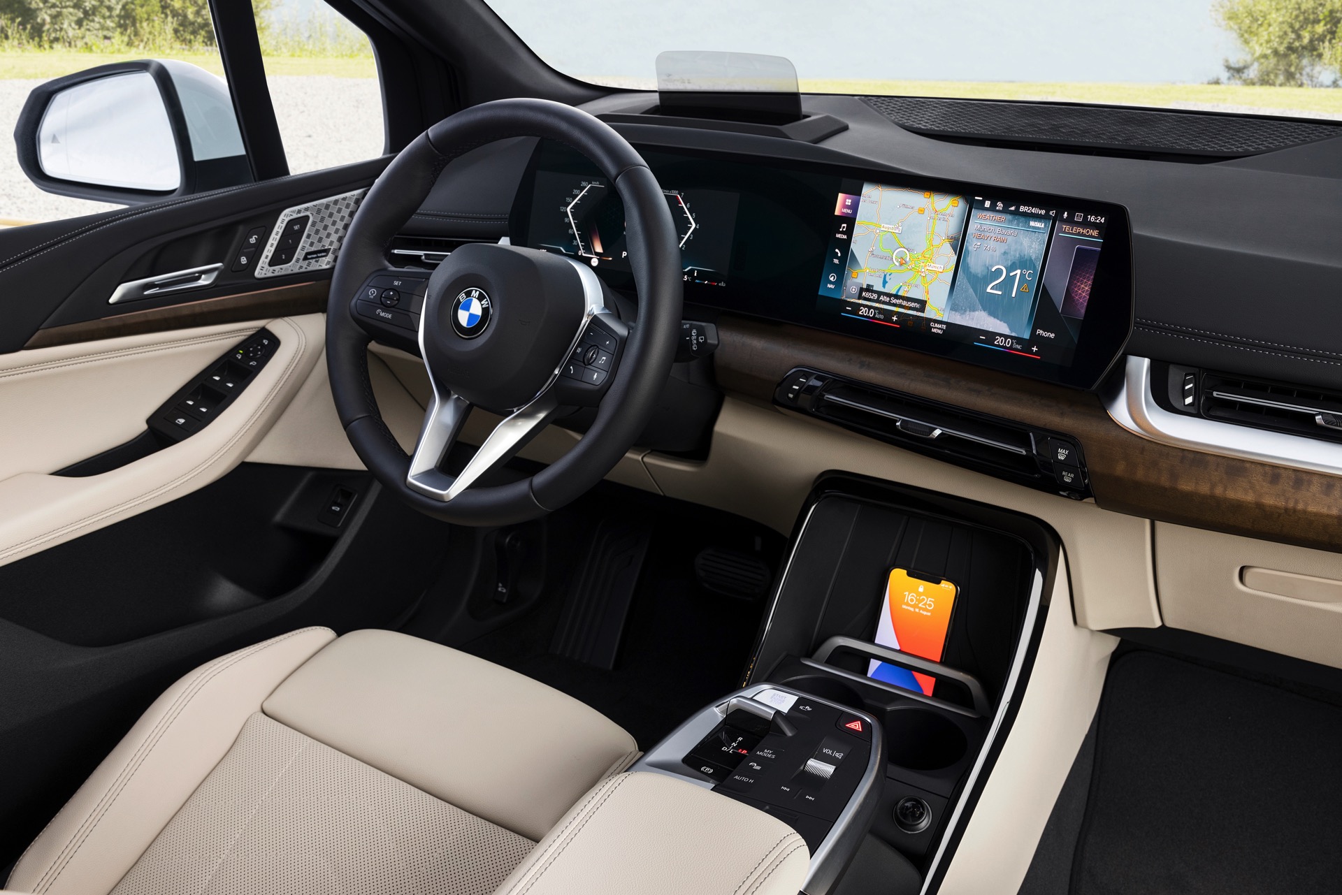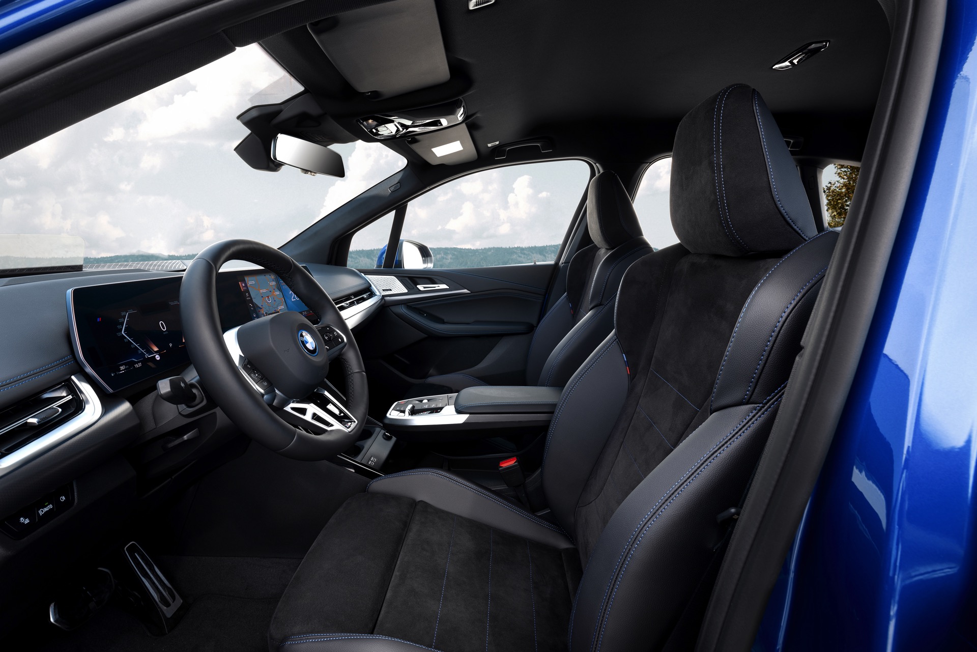 Der völlig neue Anspruch des BMW 2er Active Tourer wird auch im Innenraum auf den ersten Blick deutlich, denn der Van kommt serienmäßig mit Curved-Display und zahlreichen hochwertigen Assistenzsystemen. Hinter dem elegant in Richtung Fahrer geschwungenen Deckglas stecken ein 10,25 und ein 10,7 Zoll großes Display, auf denen die vielfältigen Inhalte der neuen Infotainment-Generation iDrive 8 ausgespielt werden können. Eine neue Generation von Lenkrädern und schicke Details wie die neuen Lautsprecher-Abdeckungen werten das Interieur zusätzlich auf. Als Kritikpunkt bleibt bestehen, dass die Platzverhältnisse kein Head-up-Display ohne zusätzliche kleine Scheibe ermöglichen. Außerdem bleibt abzuwarten, wie gut die Bedienung von BMW iDrive 8 ohne Controller gelingt, denn der Active Tourer verzichtet auf den etablierten Dreh-Drück-Steller und fokussiert sich stattdessen auf die Nutzung von Touch- und Sprachsteuerung.