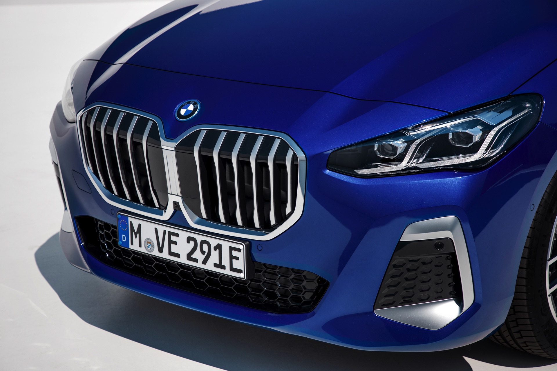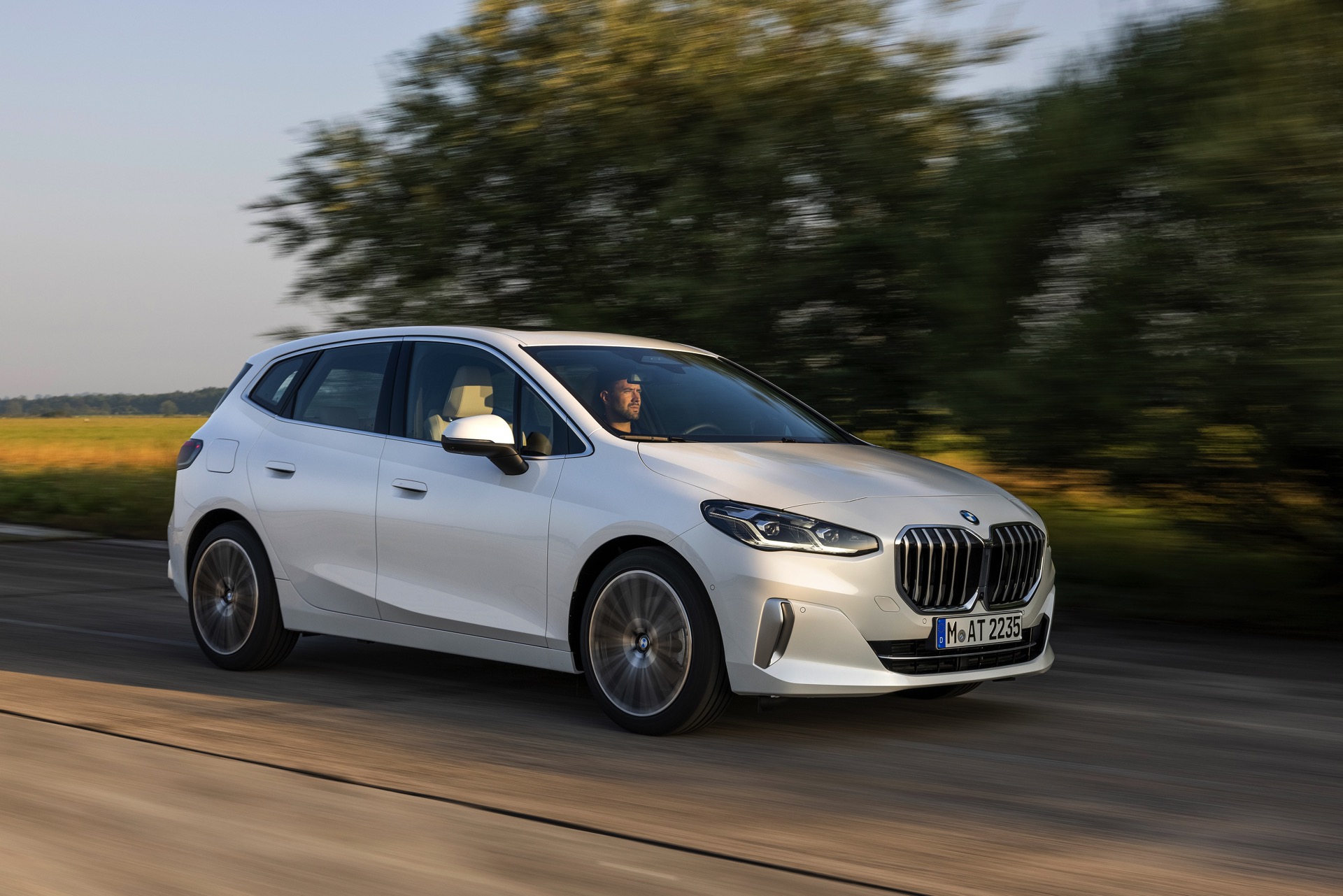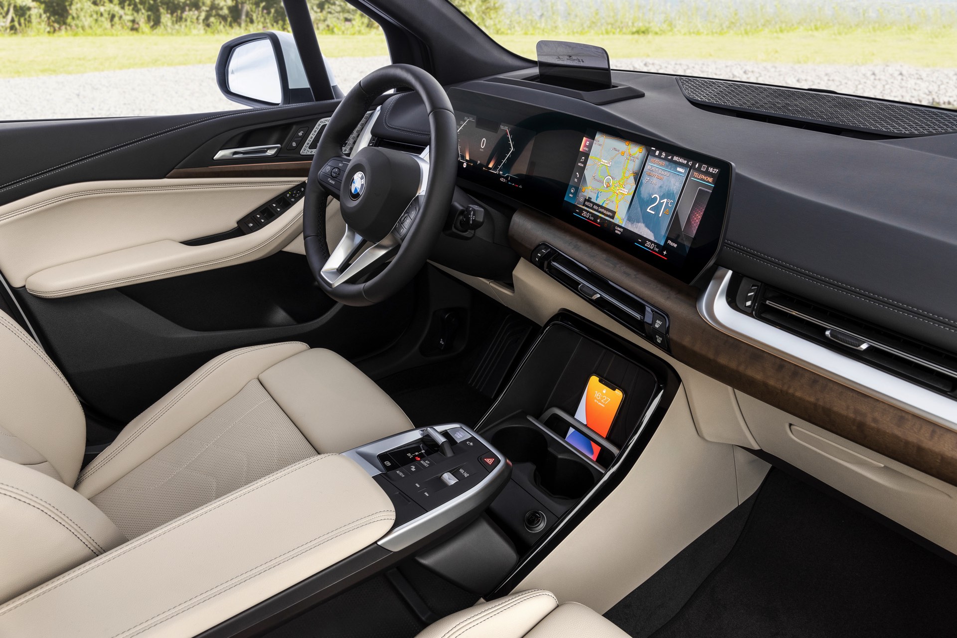 Der völlig neue Anspruch des BMW 2er Active Tourer wird auch im Innenraum auf den ersten Blick deutlich, denn der Van kommt serienmäßig mit Curved-Display und zahlreichen hochwertigen Assistenzsystemen. Hinter dem elegant in Richtung Fahrer geschwungenen Deckglas stecken ein 10,25 und ein 10,7 Zoll großes Display, auf denen die vielfältigen Inhalte der neuen Infotainment-Generation iDrive 8 ausgespielt werden können. Eine neue Generation von Lenkrädern und schicke Details wie die neuen Lautsprecher-Abdeckungen werten das Interieur zusätzlich auf. Als Kritikpunkt bleibt bestehen, dass die Platzverhältnisse kein Head-up-Display ohne zusätzliche kleine Scheibe ermöglichen. Außerdem bleibt abzuwarten, wie gut die Bedienung von BMW iDrive 8 ohne Controller gelingt, denn der Active Tourer verzichtet auf den etablierten Dreh-Drück-Steller und fokussiert sich stattdessen auf die Nutzung von Touch- und Sprachsteuerung.