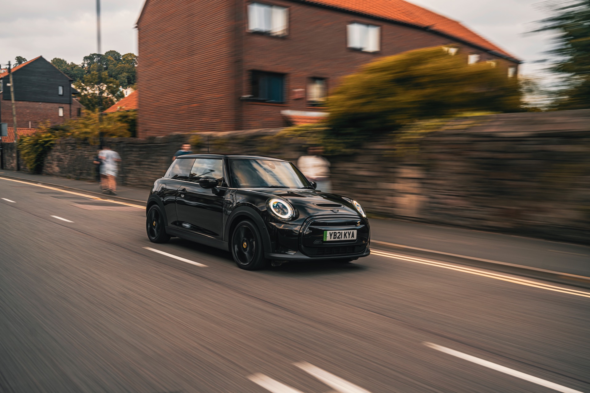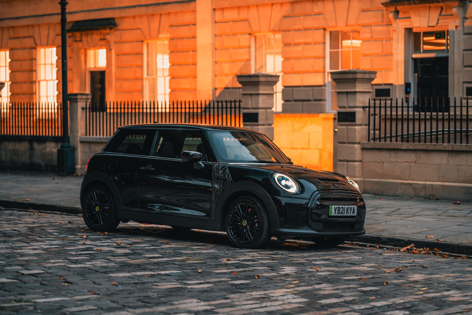 Der MINI Cooper SE Electric Shadow Edition basiert im Gegensatz zu den anderen Schwestermodellen auf dem MINI Electric Trim, er kommt daher ohne John Cooper Works Aerodynamikpaket. 17 Zoll Tentacle Spoke-Felgen in schwarz mit gelbem Ring um das MINI-Logo und rundum Midnight Black metallic – auch auf dem Dach – sorgen trotzdem für eine nicht minder düstere Optik.